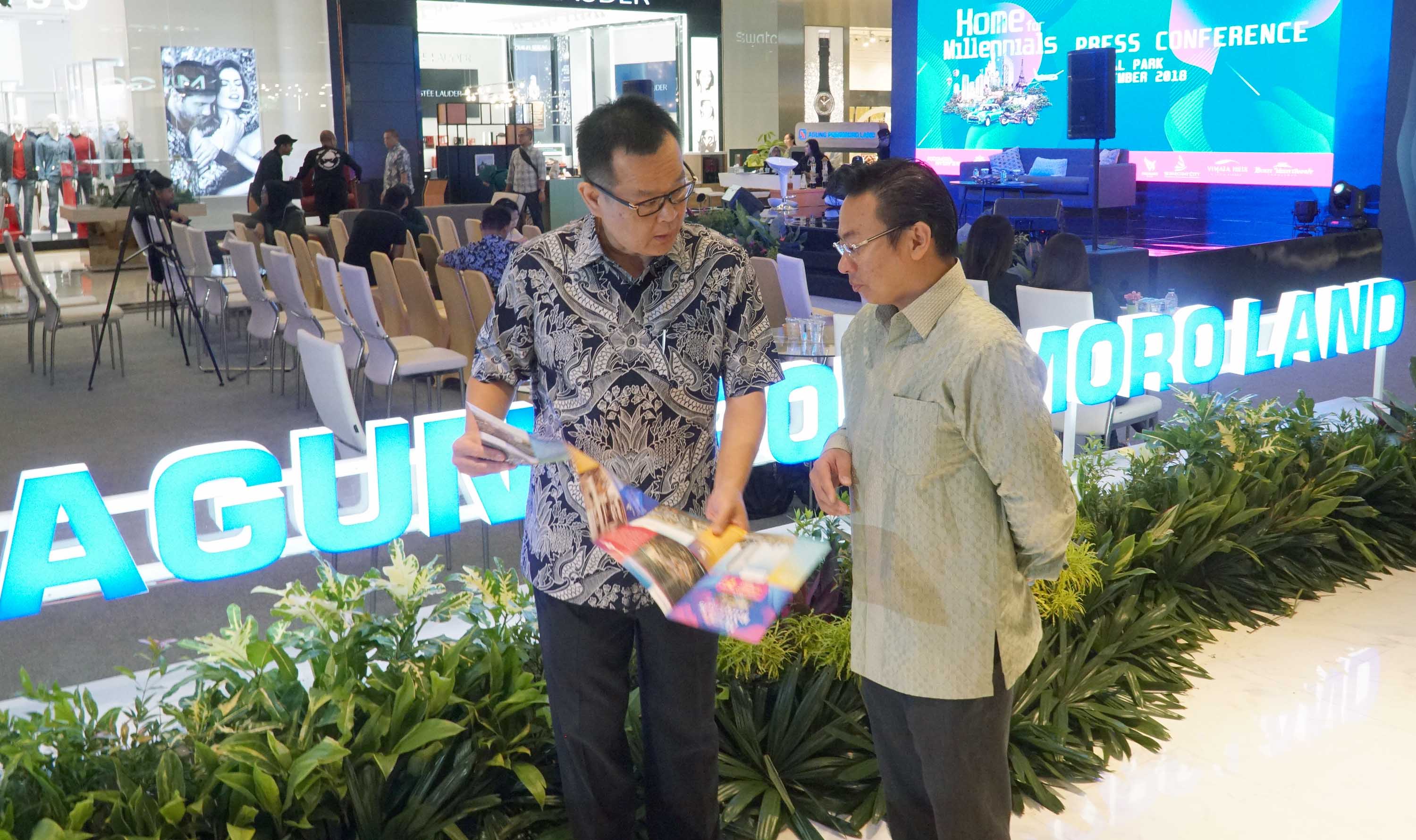 VIce President Corporate Marketing Agung Podomoro Land, Indra Widjaya Antono (kiri) berbincang dengan AVP Strategic Residential Marketing, Zaldy Wihardja disela kegiatan bertajuk "Home For Millenials" di Mall Central Park, Jakarta, Kamis (6/12). Program ini didasarkan pada temuan Riset BPS mengenai adanya peralihan konsumsi di masyarakat, bahwa kalangan usia produktif kini lebih senang membelanjakan uangnya untuk mencari pengalaman ketimbang memiliki barang. Program khusus yang di rancang oleh Agung Podomoro land ini yakni berupa hunian dengan Angsuran hanya Rp 2 jutaan per bulan yang berlaku untuk beberapa proyek antara lain Podomoro Golf View, Taruma City Karawang, Orchard View Batam, Borneo Bay City Balikpapan, Podomoro City Deli Medan, Grand Madison Jakarta, Vimala Hills Villa& Resort, dan Soho Pancoran. Home For Millenials digelar hingga 9 Desember 2018 mendatang. AKTUAL/Eko S Hilman
