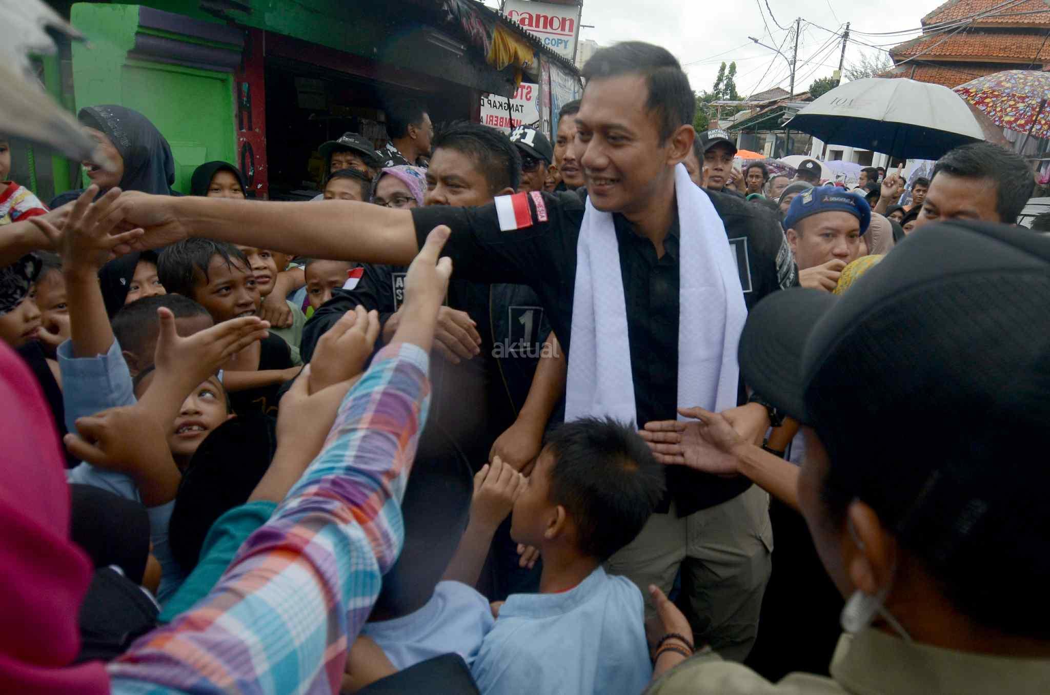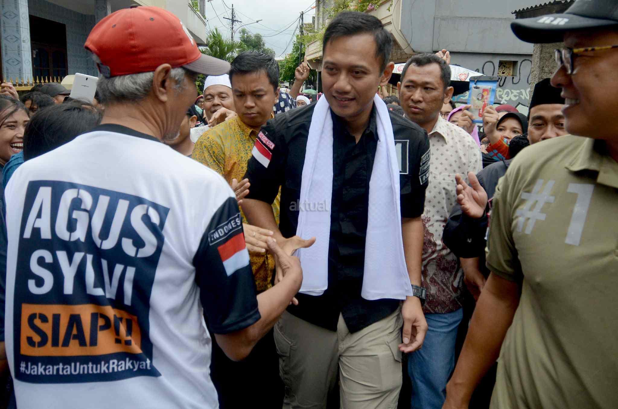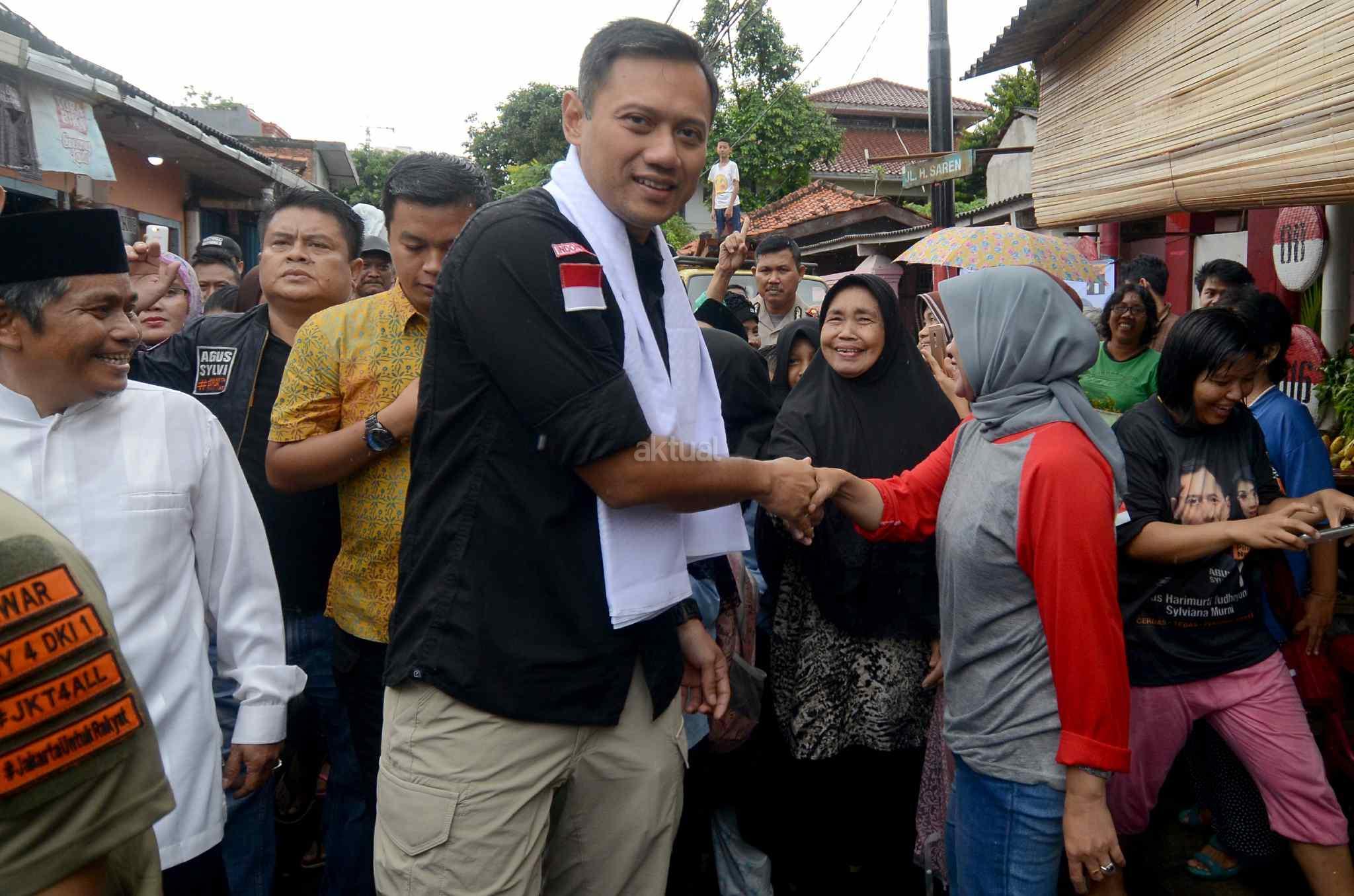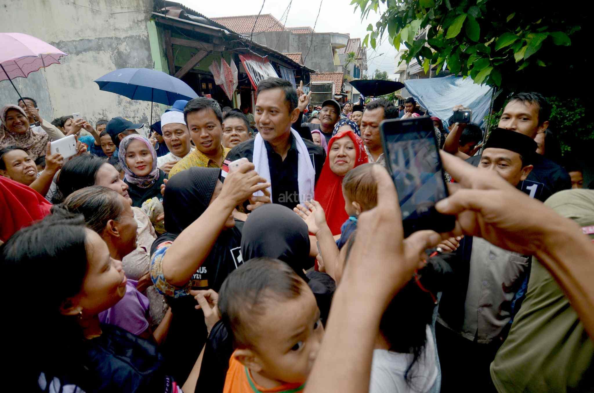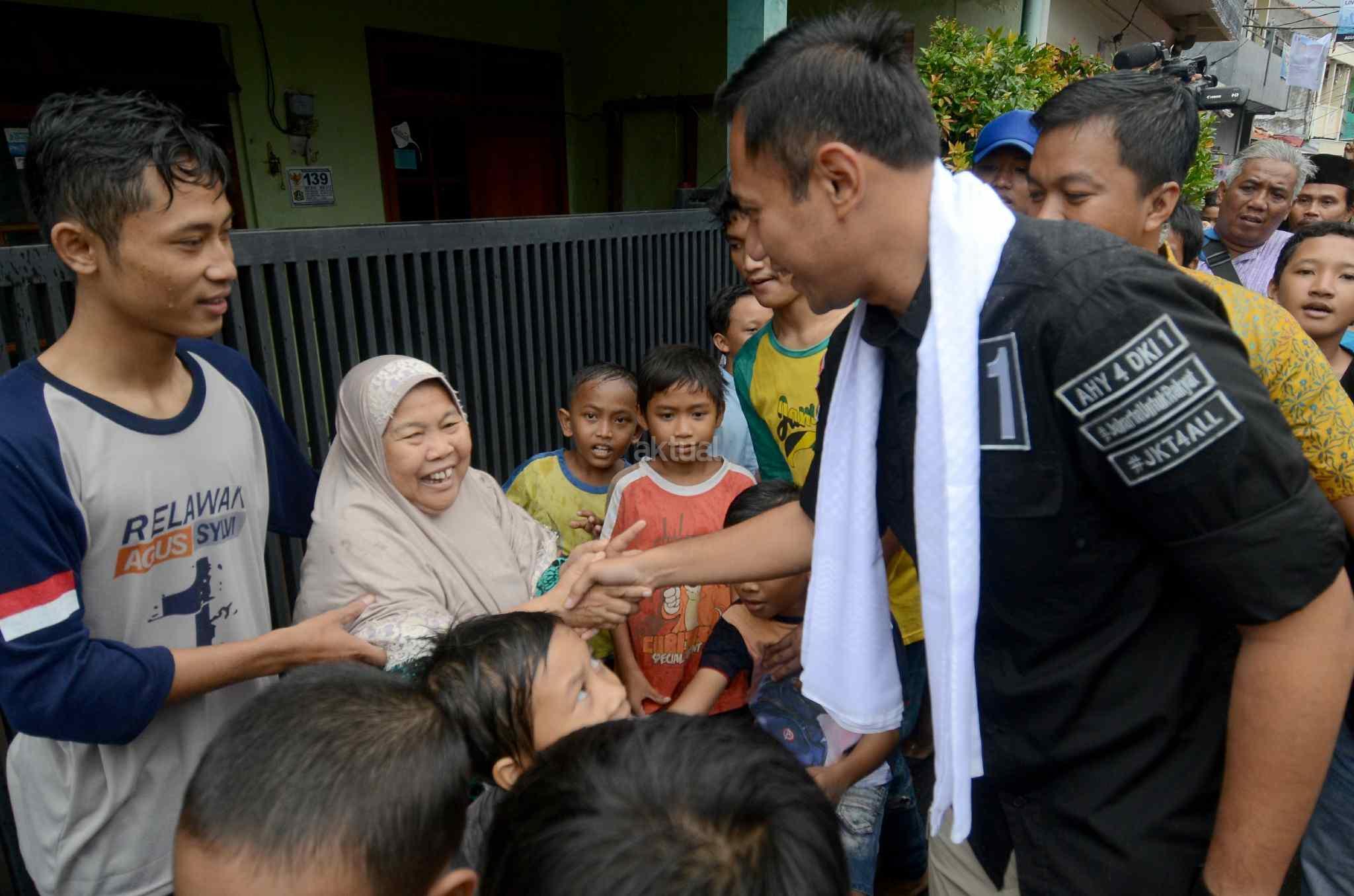 Calon Gubernur DKI nomor urut 1 Agus Harimurti Yudhoyono (AHY), menyapa warga saat blusukan di Kawasan Cidodol, Kebayoran Lama, Jakarta Selatan, Jumat (3/2/2017). AHY berkesempatan mensosialisasikan program andalannya seperti bantuan langsung sementara, bantuan dana bergulir, dan dana pemberdayaan komunitas. AKTUAL/Tino Oktaviano
