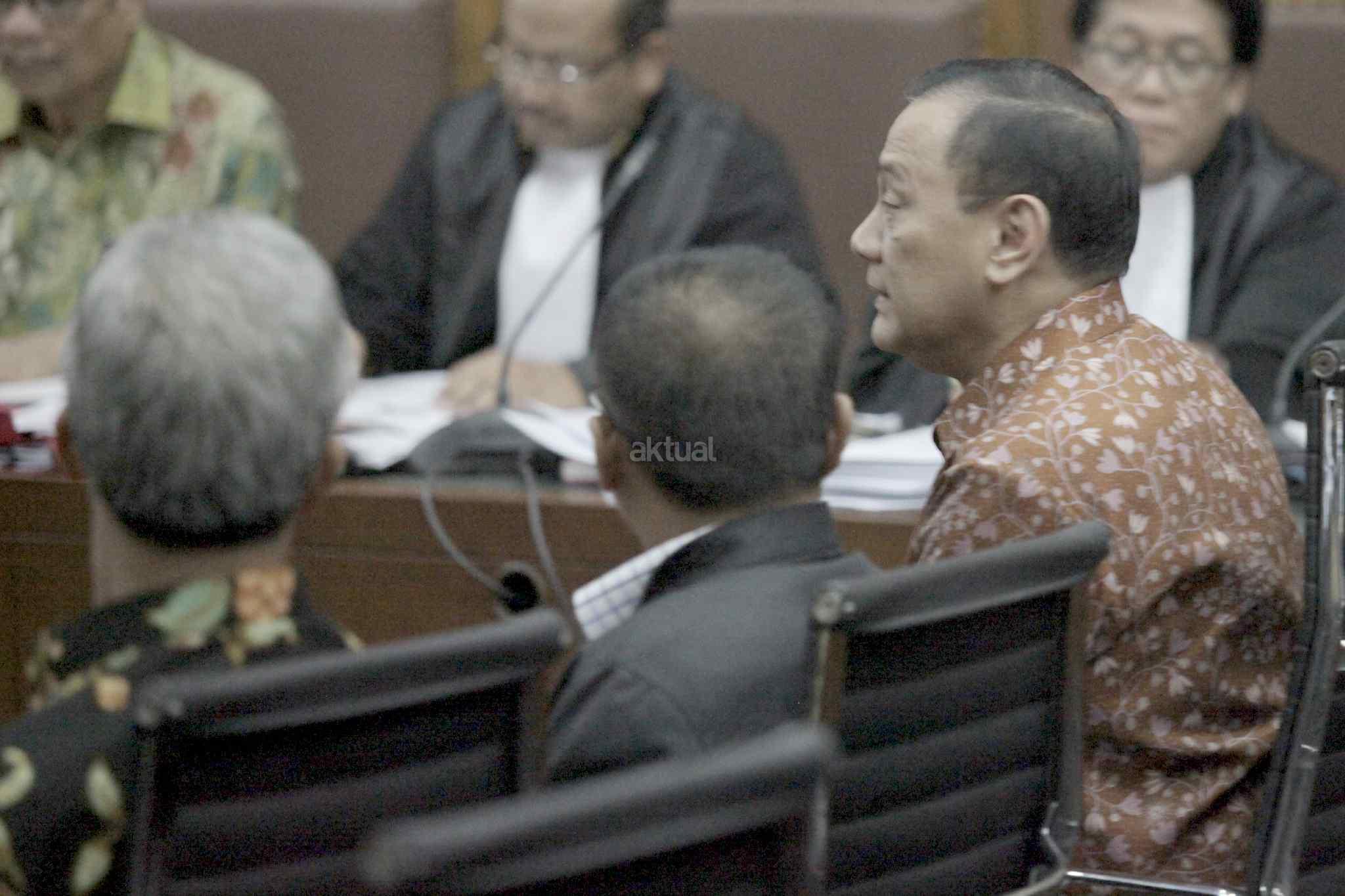 Gubernur Bank Indonesia Agus Martowardojo, Anggota DPR Komisi III Agun Gunandjar dan Gubernur Jateng Ganjar Pranowo dalam sidang kasus tindak pidana korupsi pengadaan pekerjaan KTP elektronik (E-KTP) dengan terdakwa Sugiharto (kanan) dan Irman (kiri atas) di Pengadilan Tipikor, Jakarta Pusat, Kamis (30/3). Dalam persidangan tersebut, Miryam menyangkal keterangan BAP penyidik KPK yang diperiksa atas dirinya. AKTUAL/Tino Oktaviano