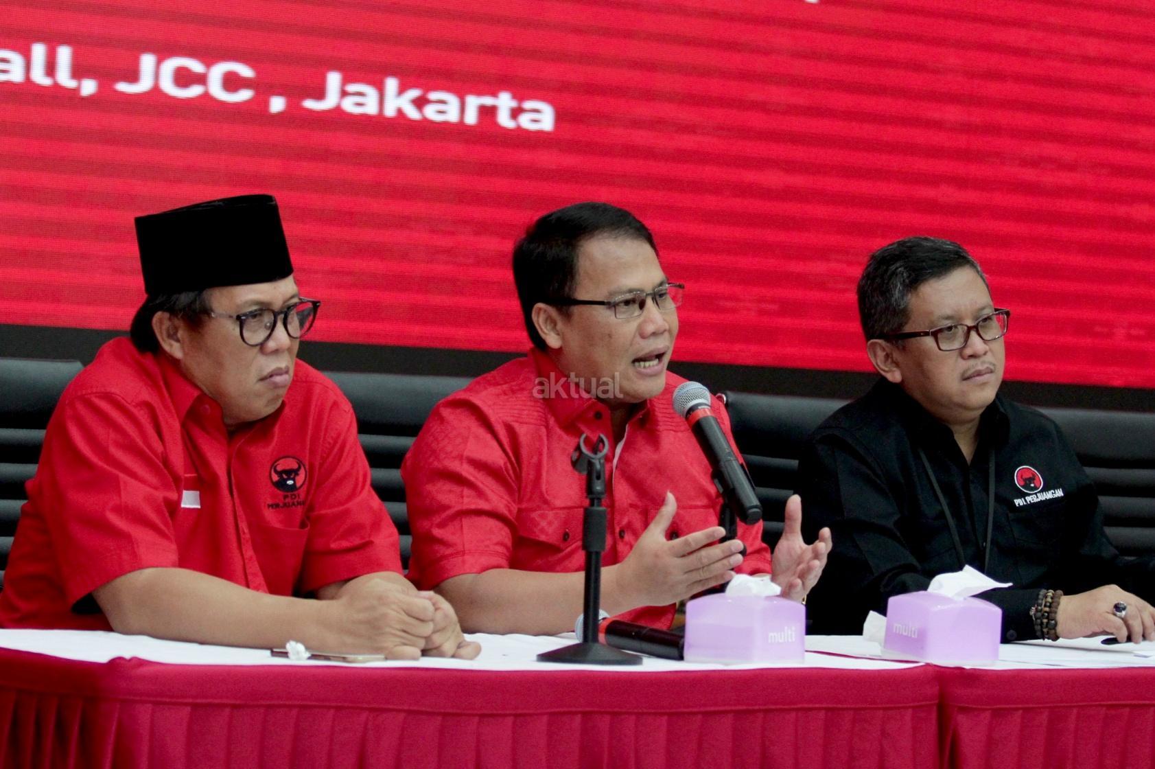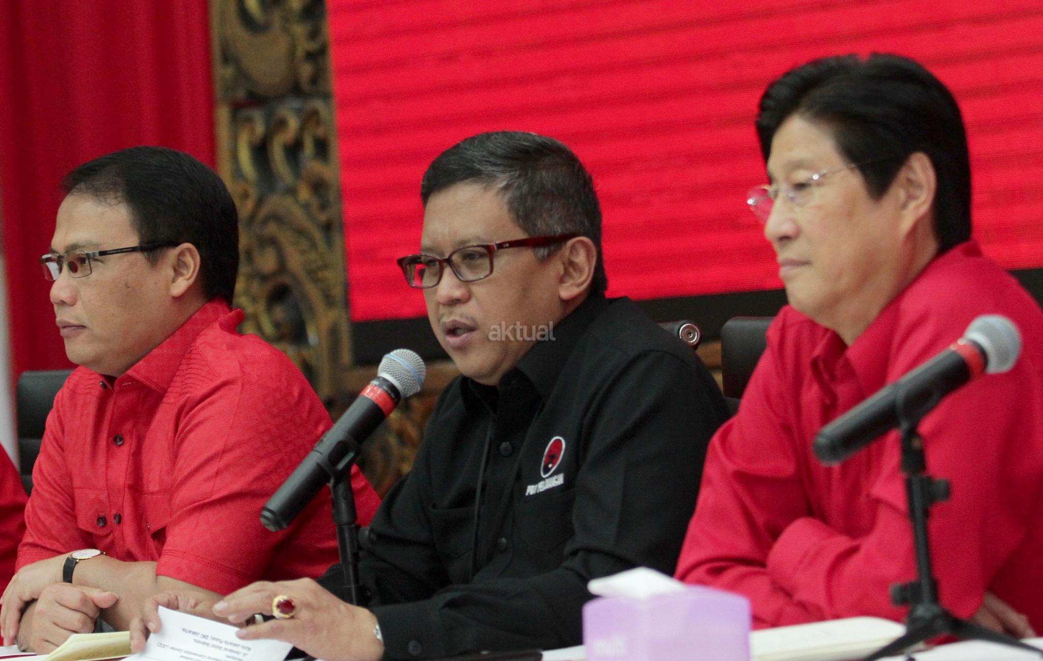 Sekjen PDIP Hasto Kristiyanto (tengah) didampingi pengurus partai memberikan keterangan pers terkait Ketua Umum GMNI Ahmad Basarah (kiri) sebagai calon Wakil Gubernur Jawa Timur pengganti Abdullah Azwar Anas di kantor DPP PDIP, Jakarta, Selasa (9/1). Partai Demokrasi Indonesia Perjuangan (PDIP) memberikan sinyal kepada kader PDIP Ahmad Basarah sebagai calon Wakil Gubernur yang akan mendampingi Calon Gubernur Syaifullah Yusuf (Gus Ipul) untuk maju dalam Pilgub Jawa Timur 2018. AKTUAL/Tino Oktaviano