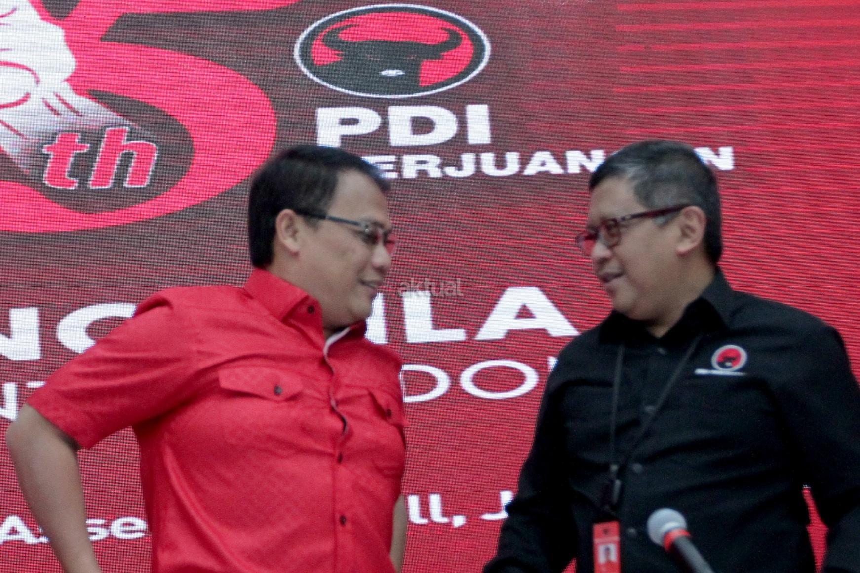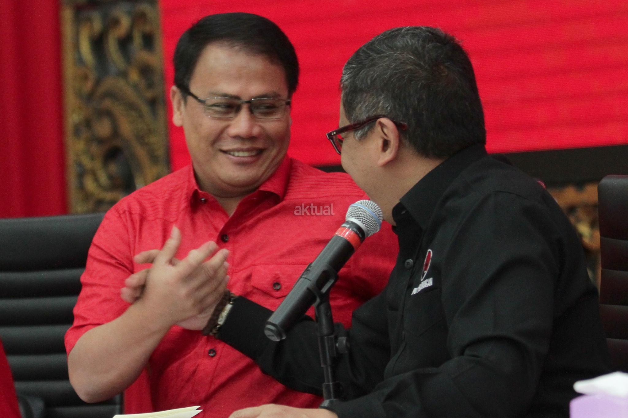 Sekjen PDIP Hasto Kristiyanto (kanan) berbincang dengan Ketua GMNI Ahmad Basarah sebagai calon Wakil Gubernur Jawa Timur pengganti Abdullah Azwar Anas di kantor DPP PDIP, Jakarta, Selasa (9/1). Partai Demokrasi Indonesia Perjuangan (PDIP) memberikan sinyal kepada kader PDIP Ahmad Basarah sebagai calon Wakil Gubernur yang akan mendampingi Calon Gubernur Syaifullah Yusuf (Gus Ipul) untuk maju dalam Pilgub Jawa Timur 2018. AKTUAL/Tino Oktaviano