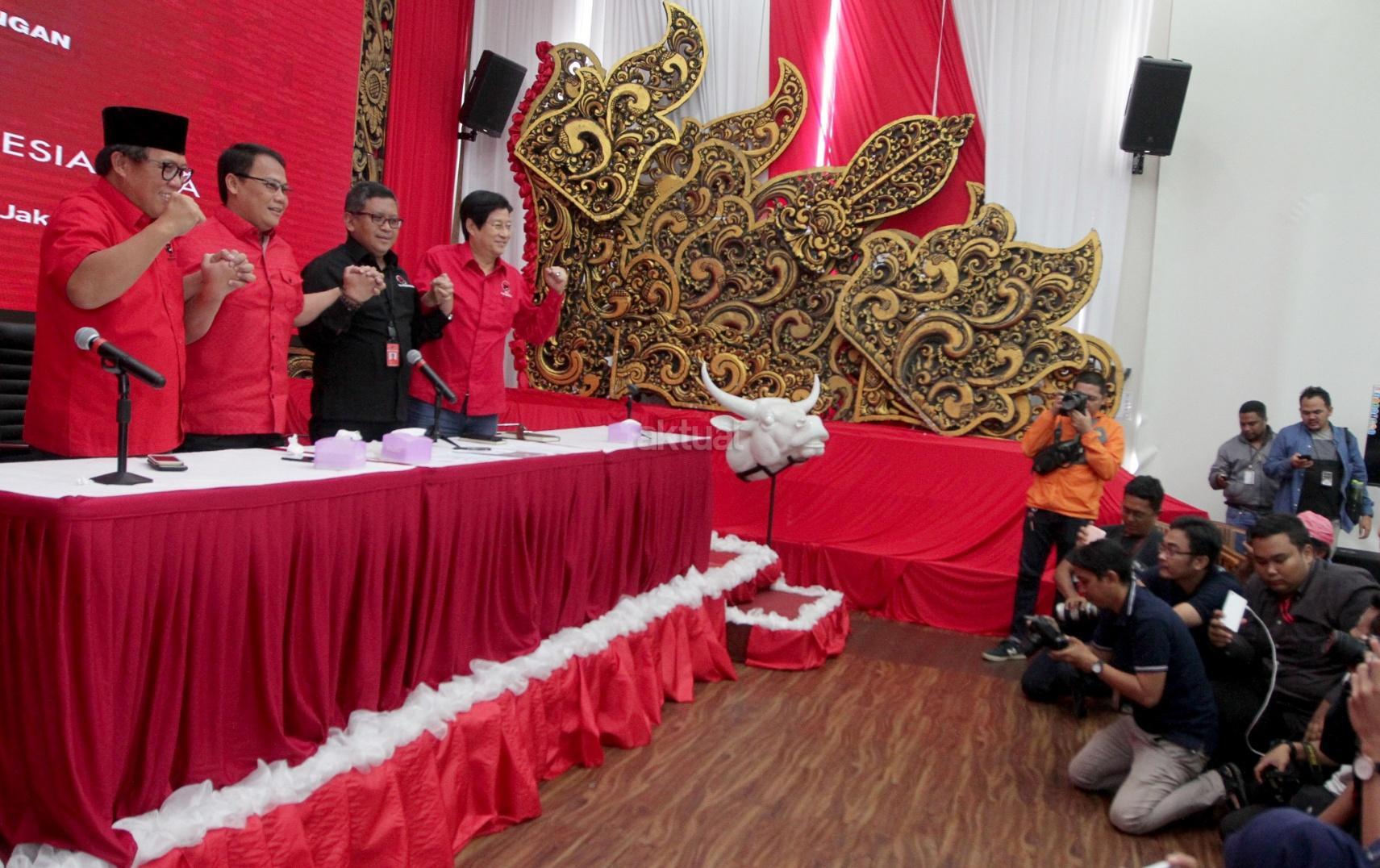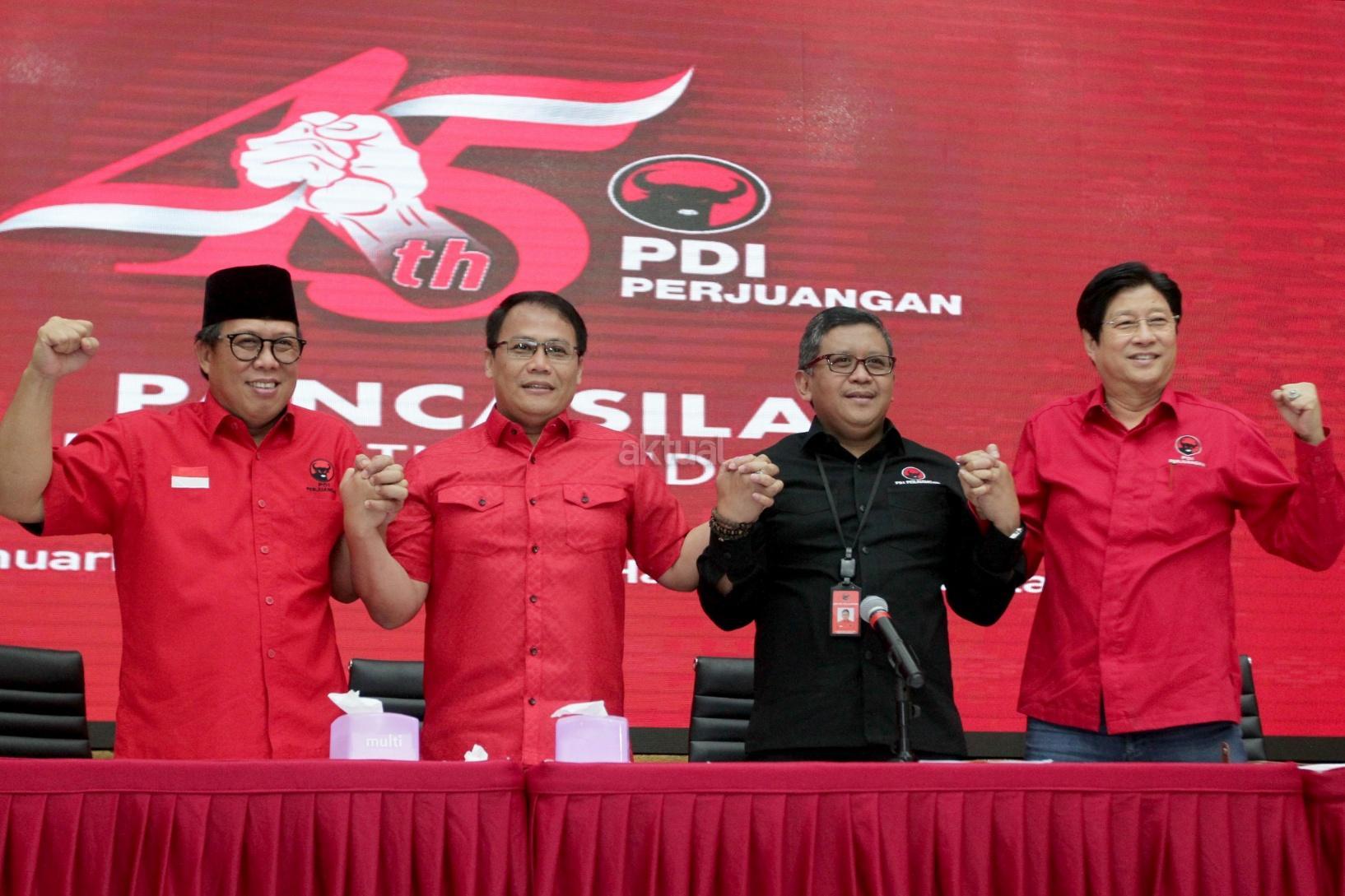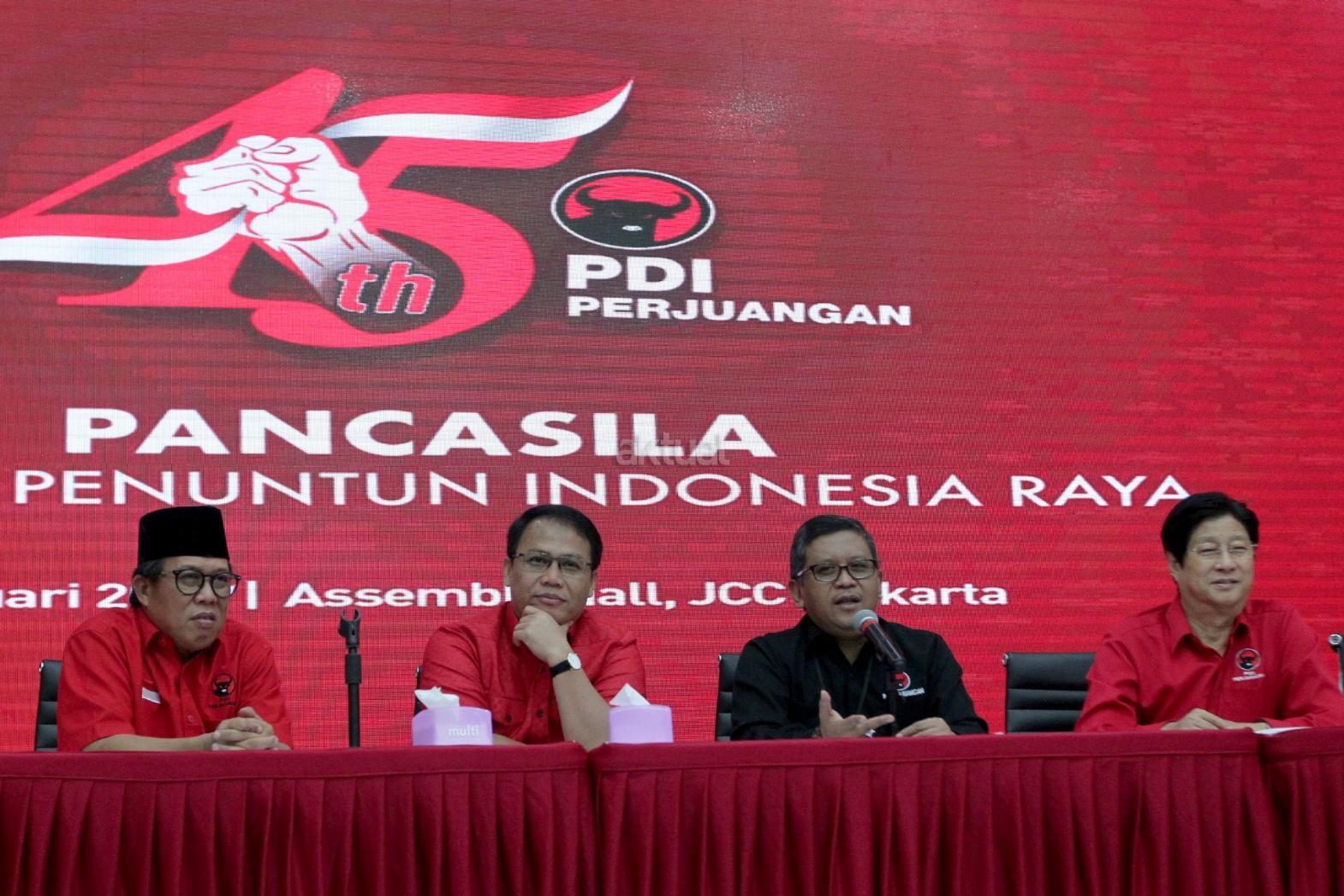 Sekjen PDIP Hasto Kristiyanto (kedua kanan) didampingi pengurus partai memberikan keterangan pers terkait Ketua Umum GMNI Ahmad Basarah (kedua kiri) sebagai calon Wakil Gubernur Jawa Timur pengganti Abdullah Azwar Anas di kantor DPP PDIP, Jakarta, Selasa (9/1). Partai Demokrasi Indonesia Perjuangan (PDIP) memberikan sinyal kepada kader PDIP Ahmad Basarah sebagai calon Wakil Gubernur yang akan mendampingi Calon Gubernur Syaifullah Yusuf (Gus Ipul) untuk maju dalam Pilgub Jawa Timur 2018. AKTUAL/Tino Oktaviano