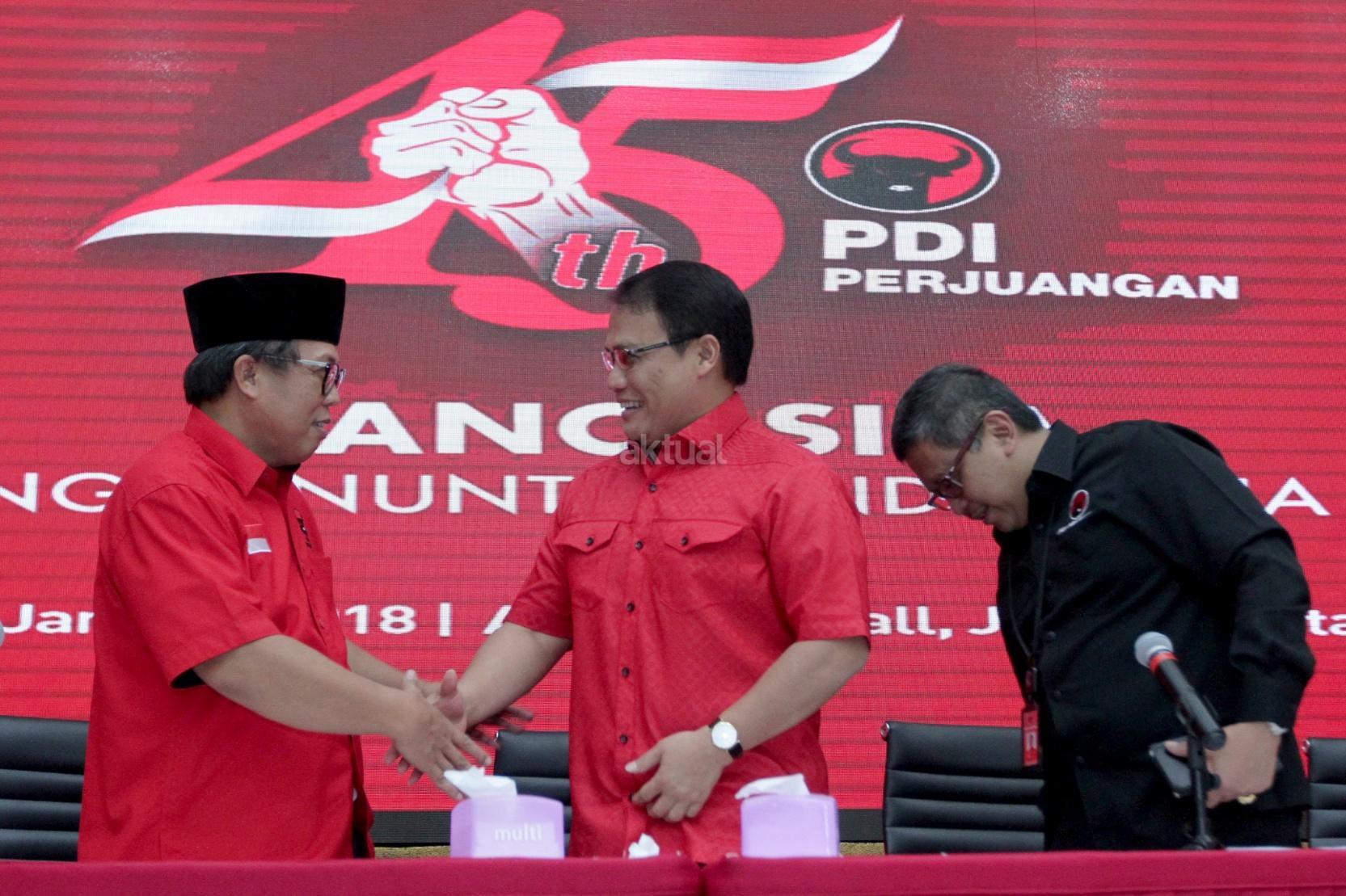 Ketua Umum GMNI Ahmad Basarah (tengah) sebagai calon Wakil Gubernur Jawa Timur pengganti Abdullah Azwar Anas di kantor DPP PDIP, Jakarta, Selasa (9/1). Partai Demokrasi Indonesia Perjuangan (PDIP) memberikan sinyal kepada kader PDIP Ahmad Basarah sebagai calon Wakil Gubernur yang akan mendampingi Calon Gubernur Syaifullah Yusuf (Gus Ipul) untuk maju dalam Pilgub Jawa Timur 2018. AKTUAL/Tino Oktaviano