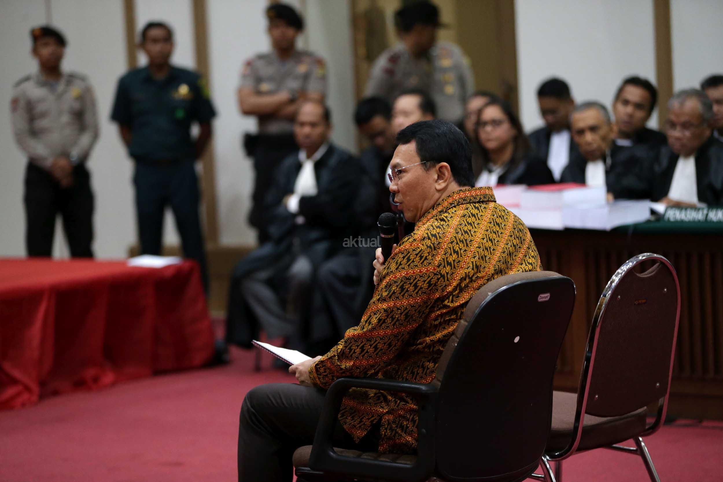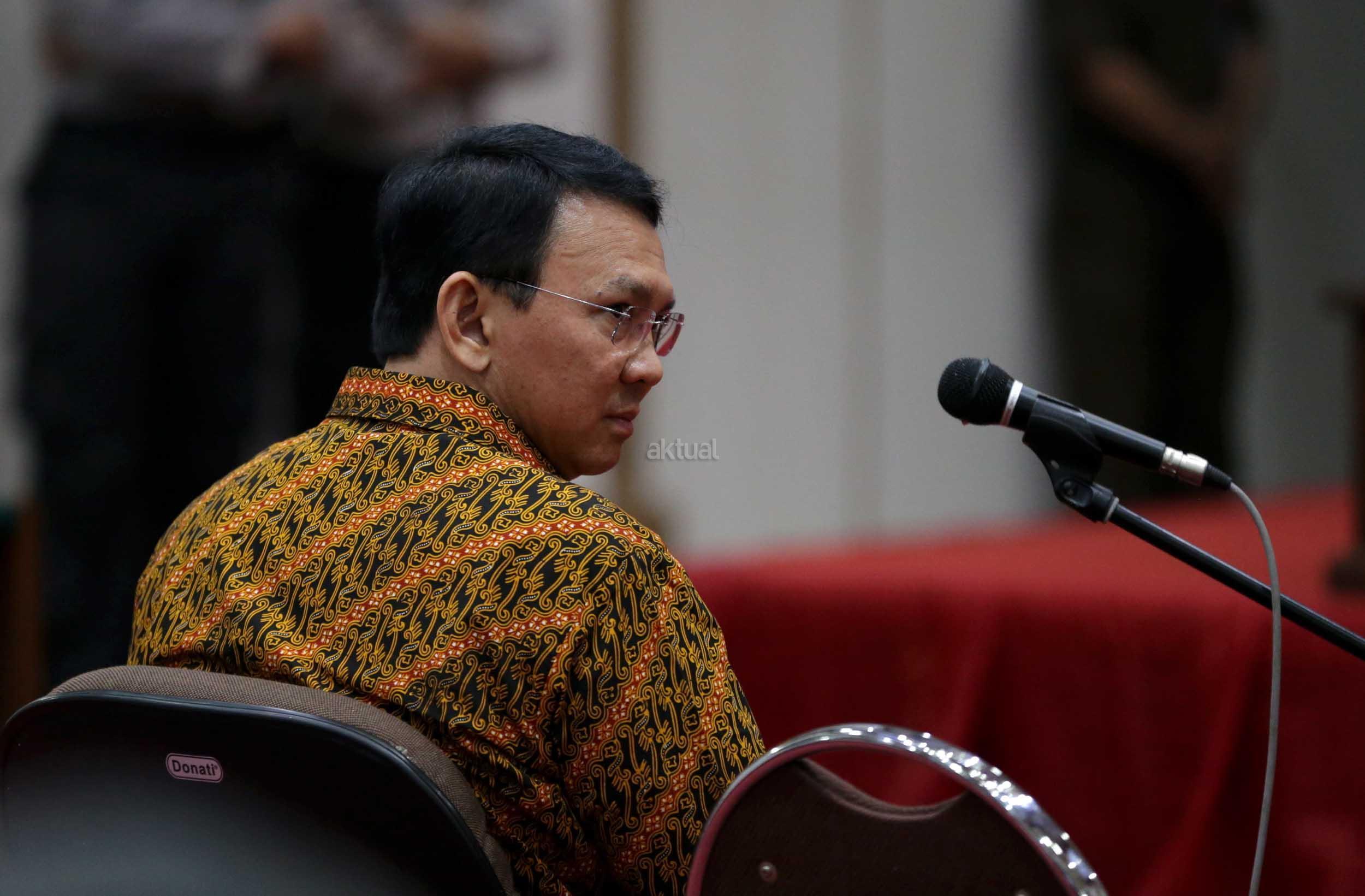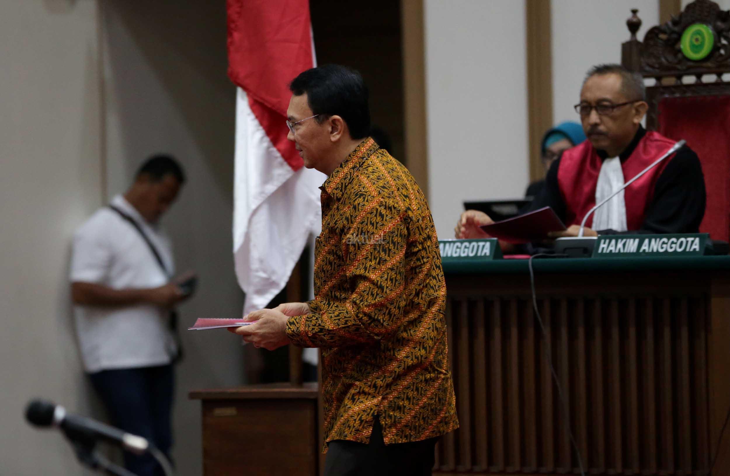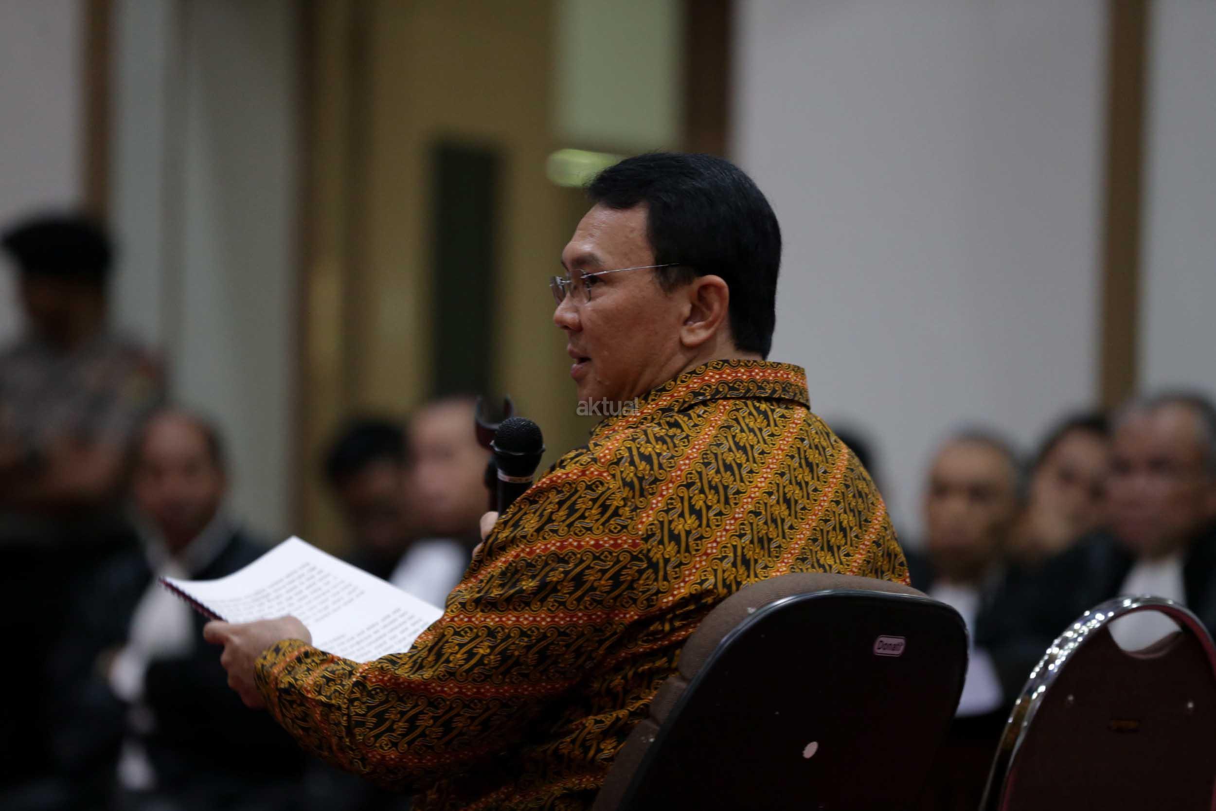 Terdakwa kasus dugaan penodaan agama, Basuki Tjahaja Purnama atau Ahok mengikuti sidang di Pengadilan Negeri Jakarta Utara di Auditorium Kementerian Pertanian, Jakarta Selatan, Selasa (25/4/2017). Sidang kali ini dengan Basuki Tjahaja Purnama membacakan pledoi atau pembelaannya. POOL/KOMPAS IMAGES/KRISTIANTO PURNOMO