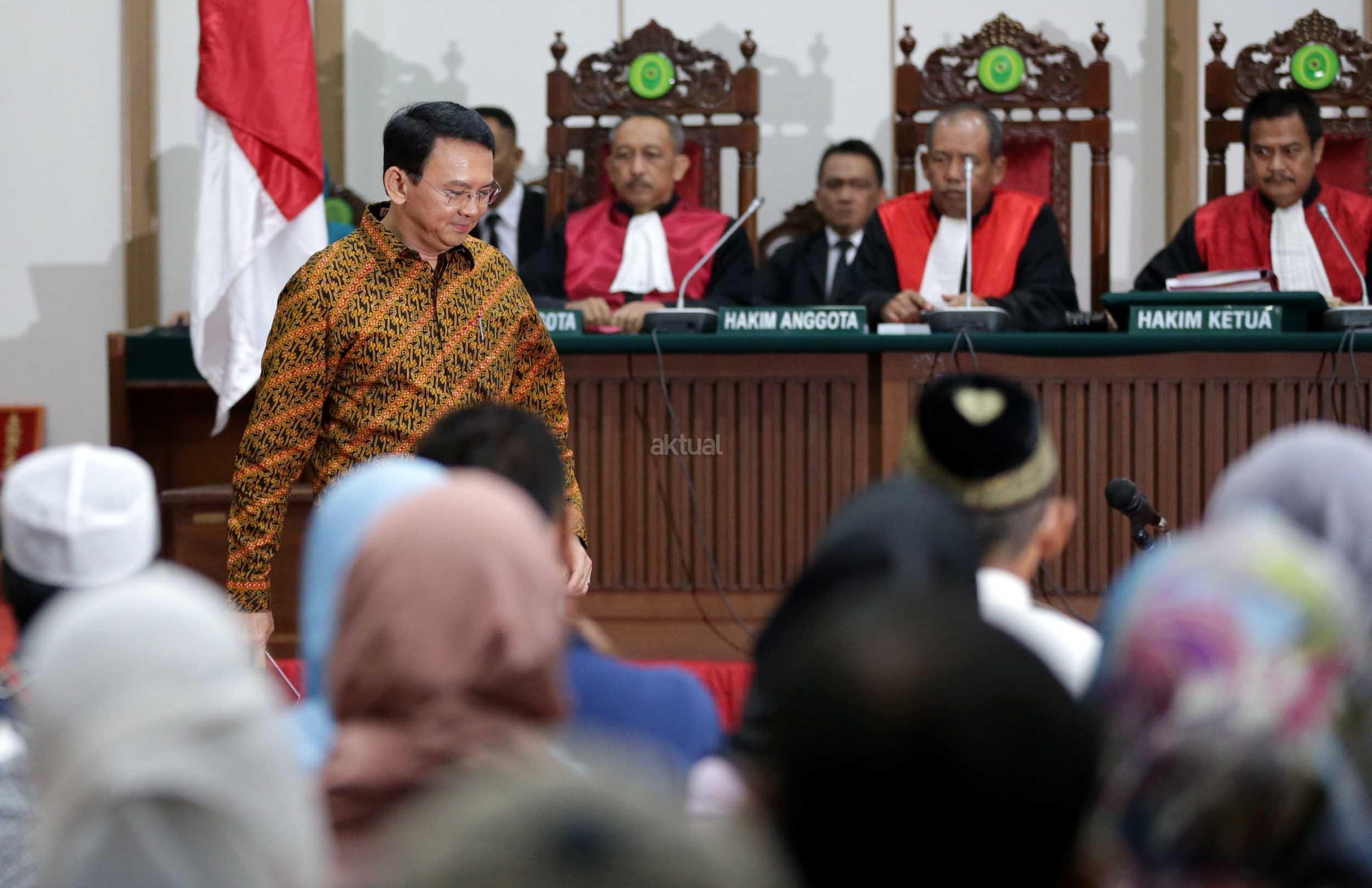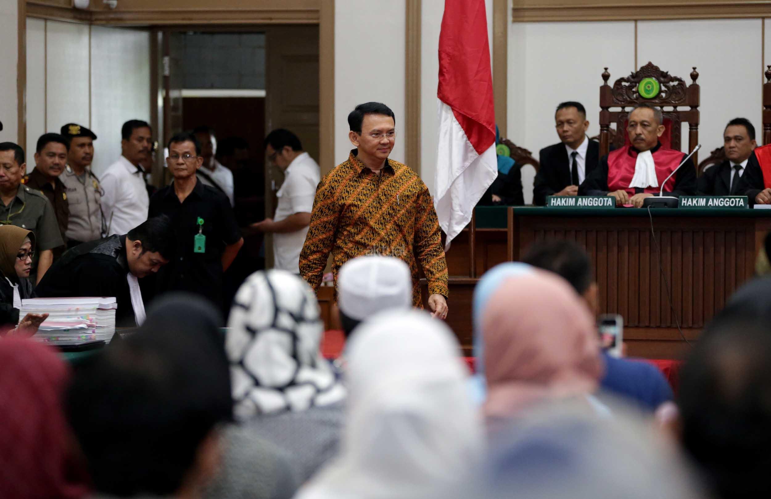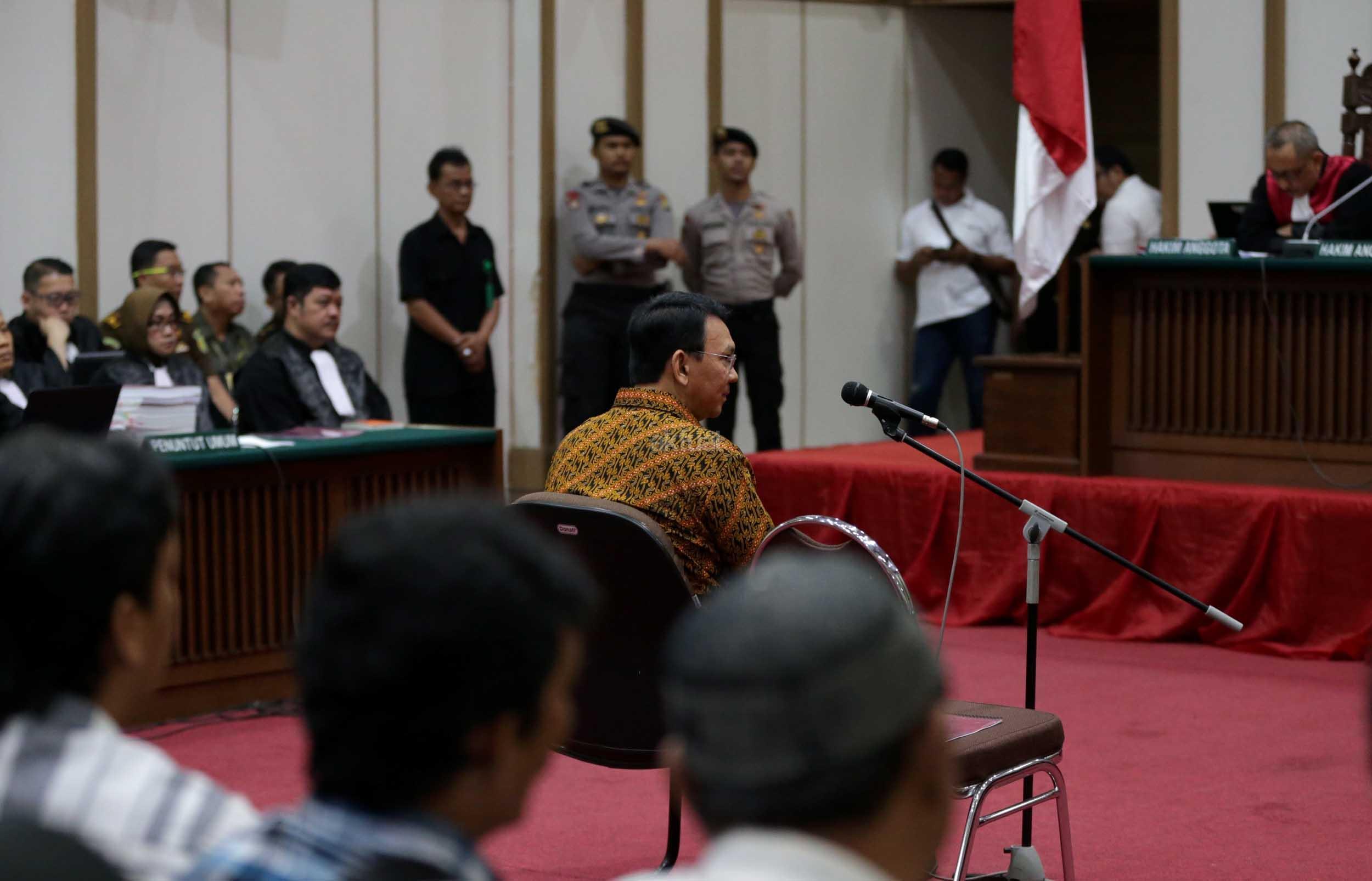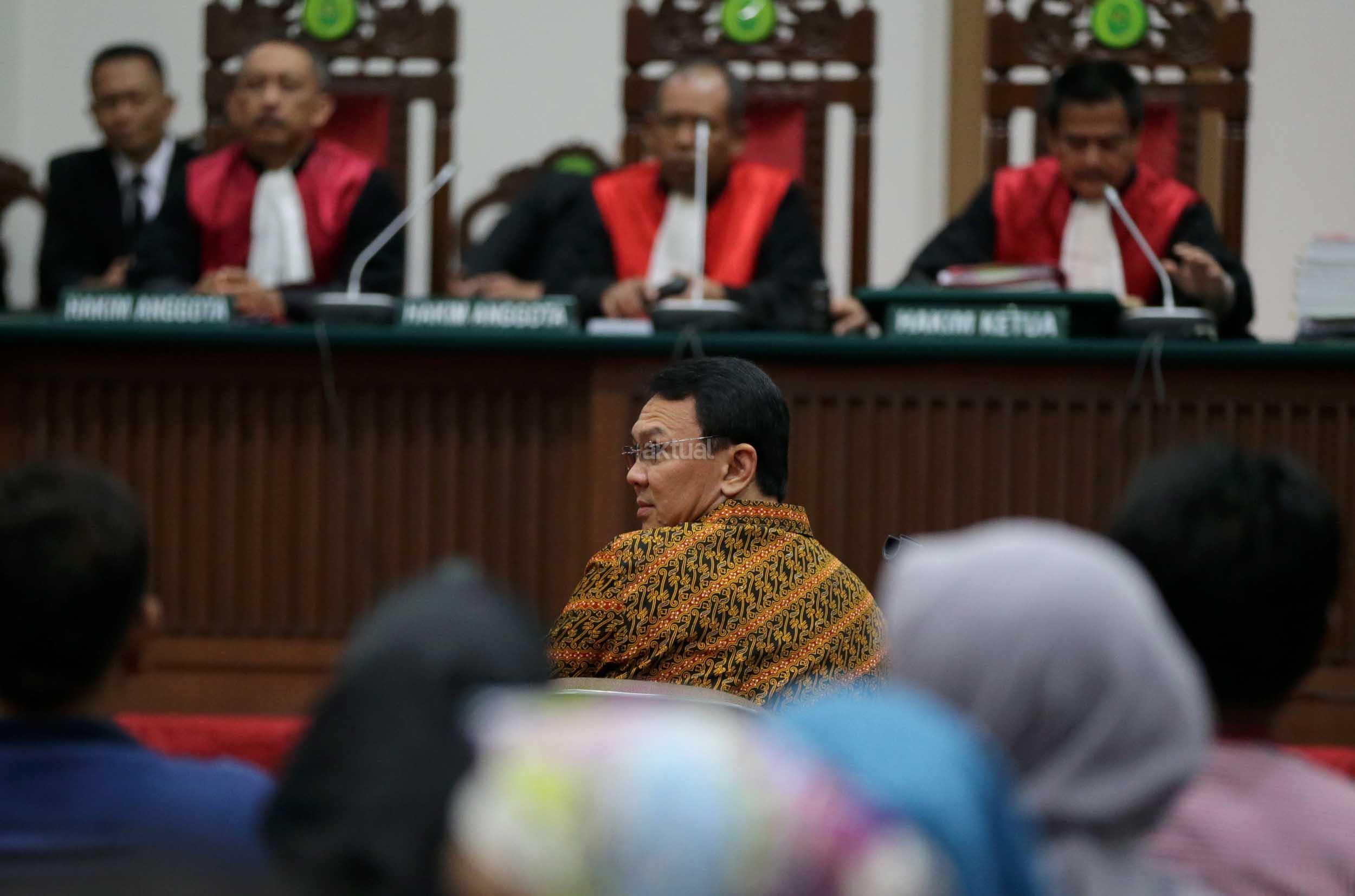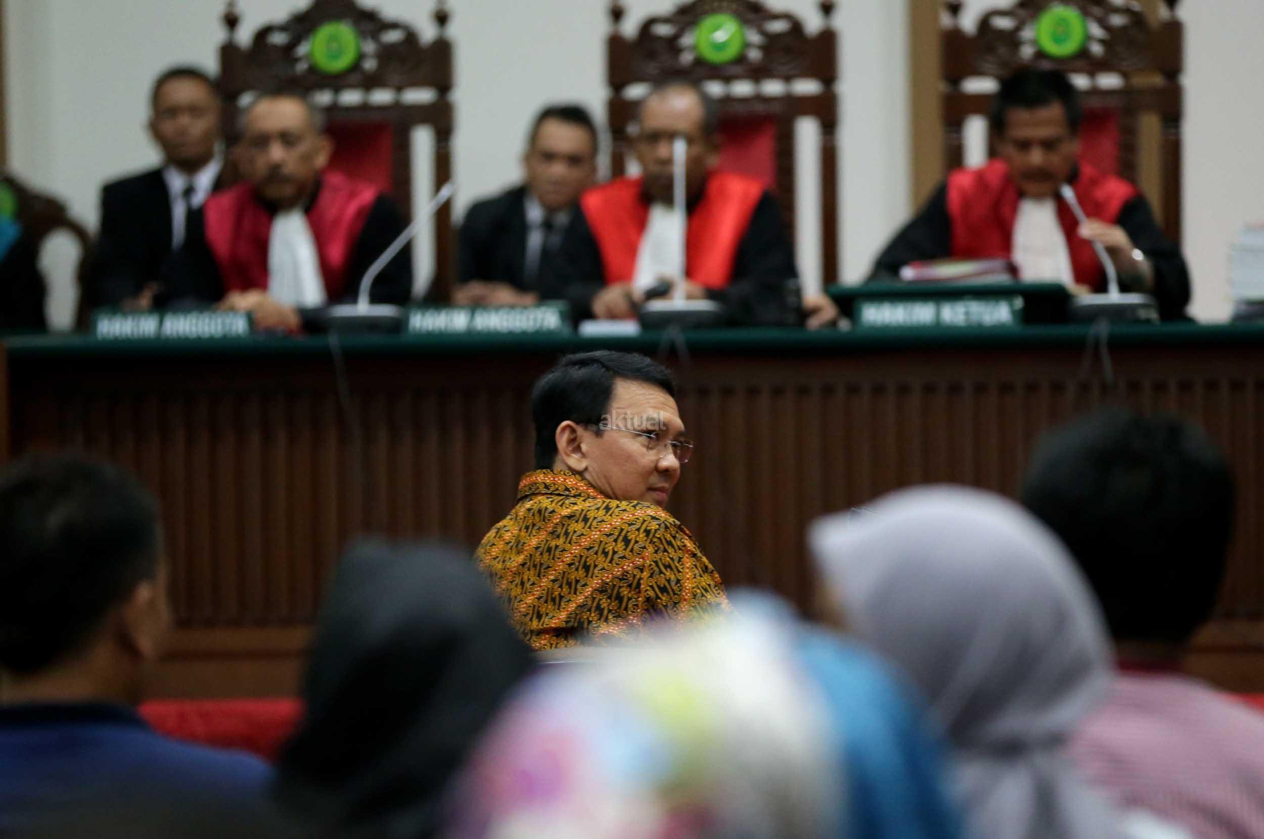 Terdakwa kasus dugaan penodaan agama, Basuki Tjahaja Purnama atau Ahok mengikuti sidang di Pengadilan Negeri Jakarta Utara di Auditorium Kementerian Pertanian, Jakarta Selatan, Selasa (25/4/2017). Sidang kali ini dengan Basuki Tjahaja Purnama membacakan pledoi atau pembelaannya. POOL/KOMPAS IMAGES/KRISTIANTO PURNOMO