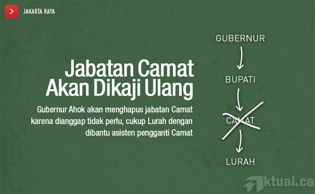“Sekarang kita bertanya, perlu nggak sih camat? Sebenarnya nggak perlu. Kenapa mesti ada kantor camat. Lurah saja, asisten di kota yang membawahi supervisi menjadi penyelia mereka,” kata Ahok kemarin.