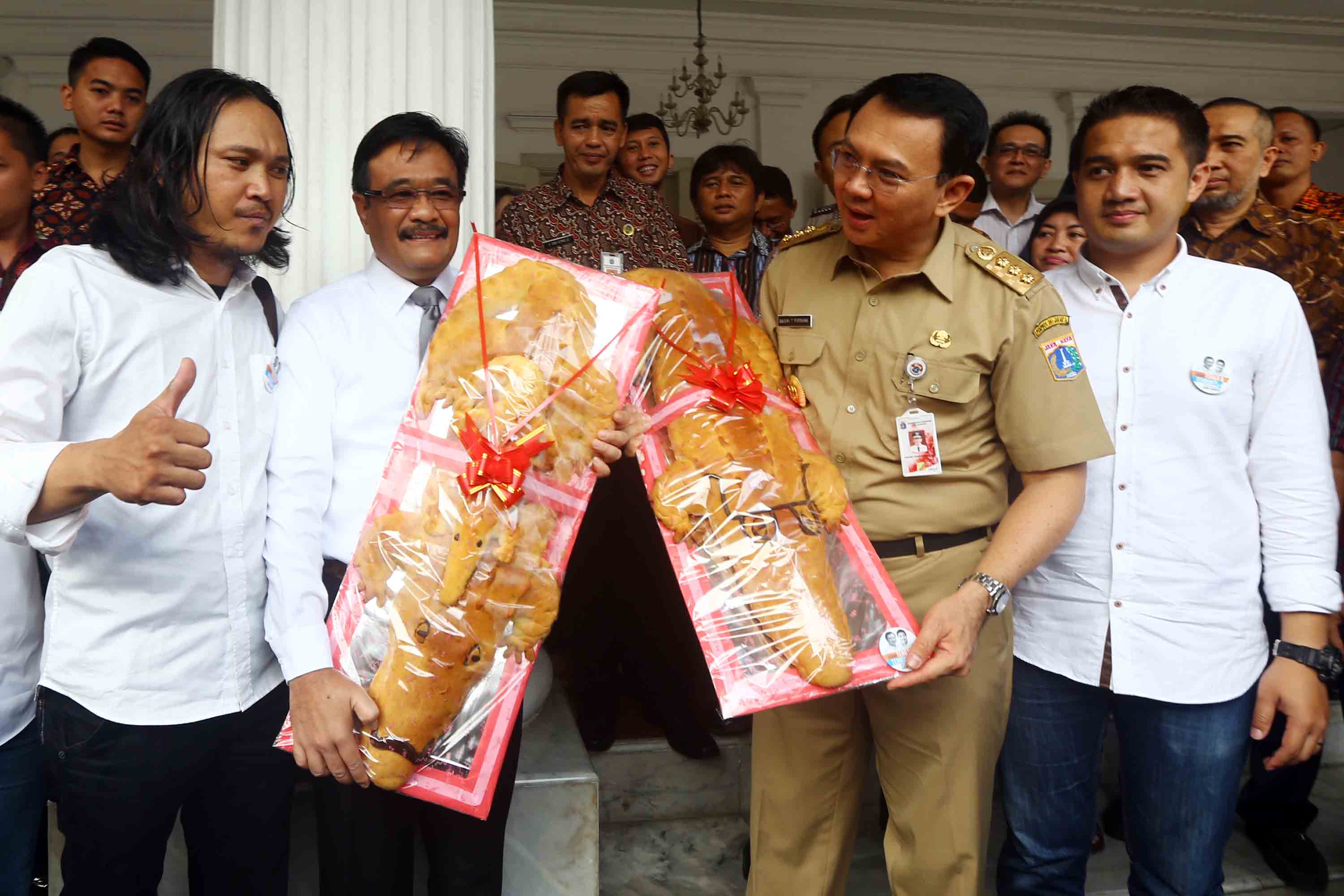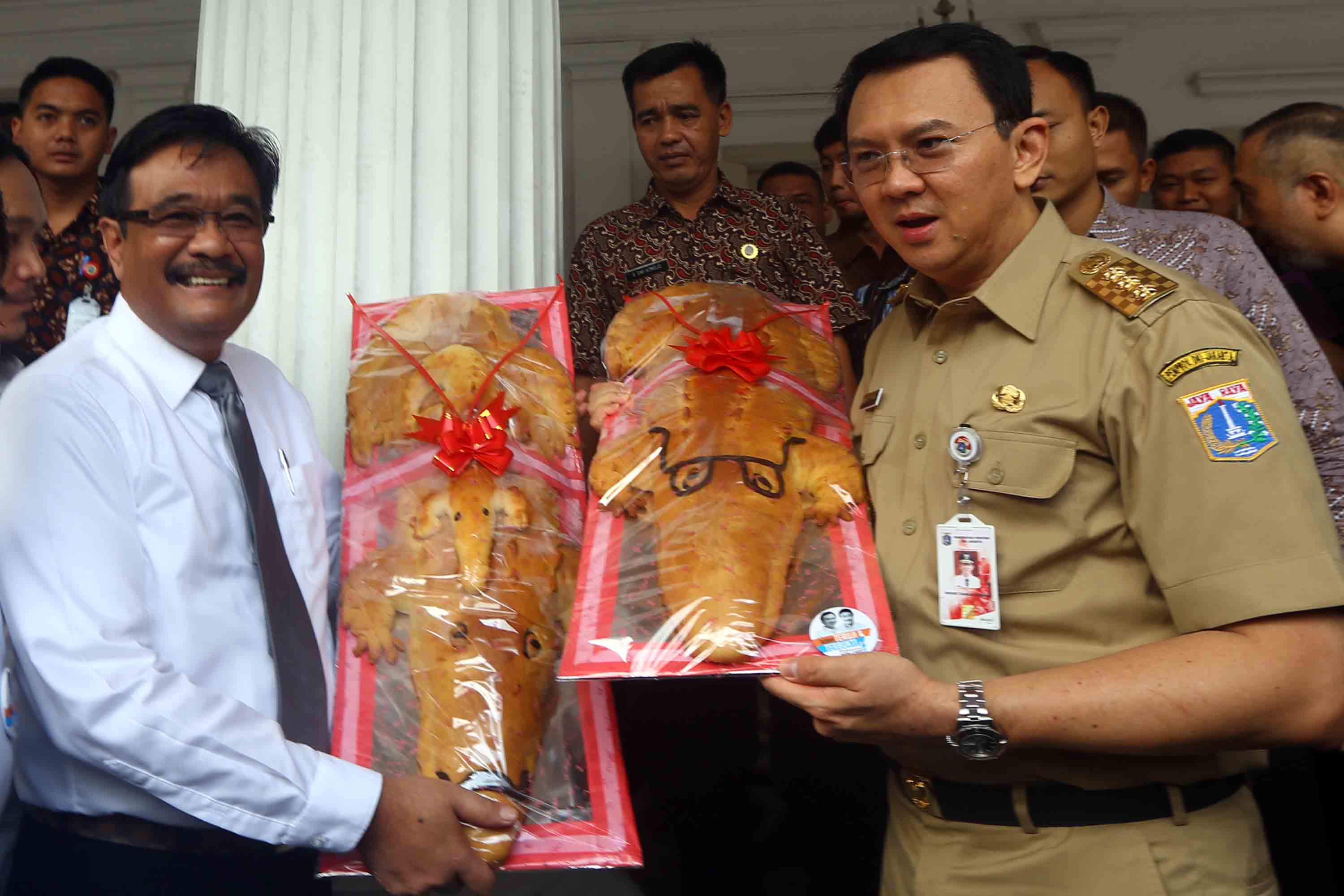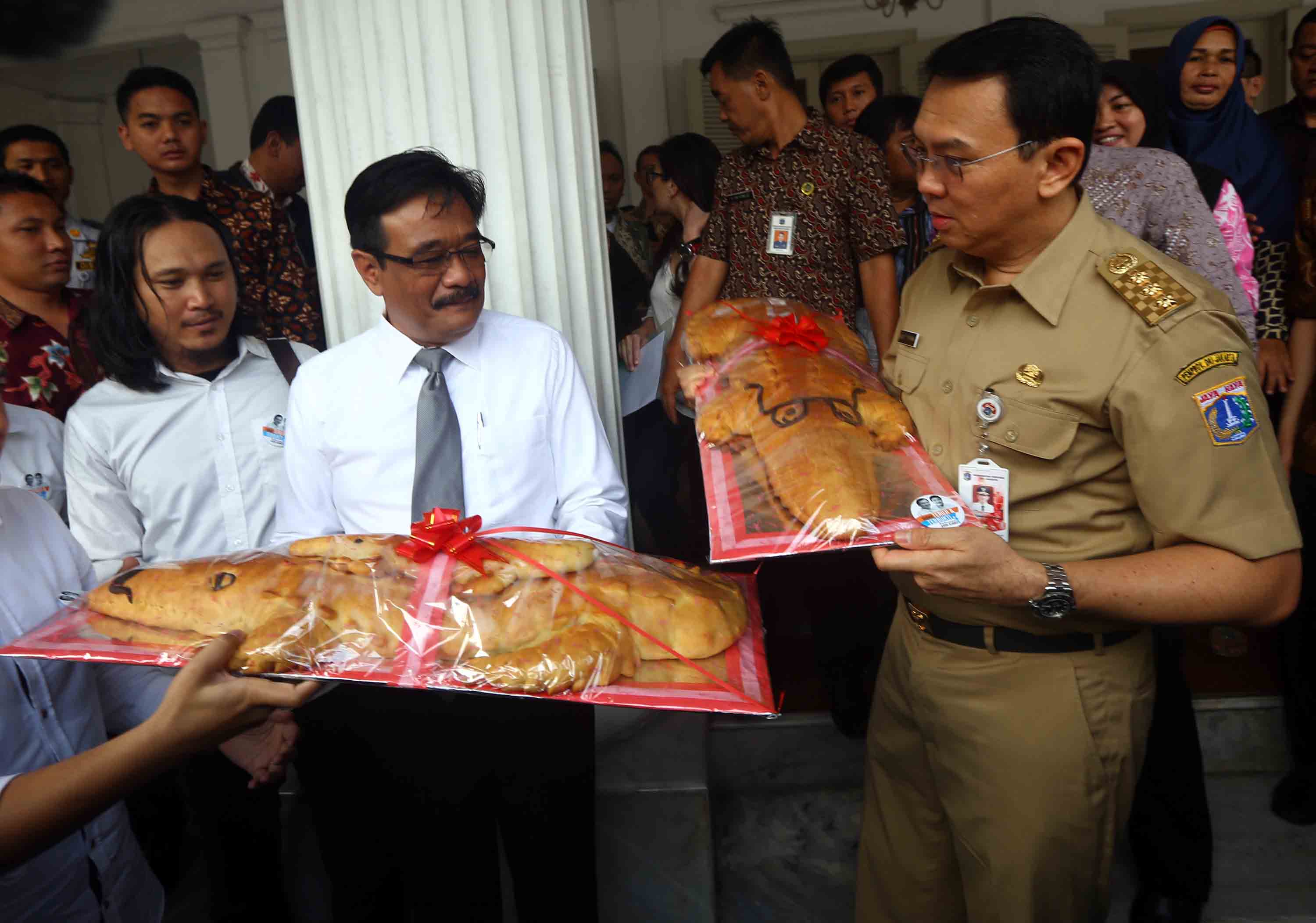 Gubernur DKI Jakarta Basuki Tjahaja Purnama dan Wakil Gubernur DKI Jakarta Djarot Saiful Hidayat menerima roti buaya dari relawan di Balai Kota DKI Jakarta, Senin (29/8/2016).Koordinator Relawan Ahok-Djarot, Doddy A Matondang menyatakan, roti buaya sebagai simbol warga DKI meminang Ahok-Djarot kembali memimpin DKI dengan mengikuti Pilkada DKI Jakarta 2017.