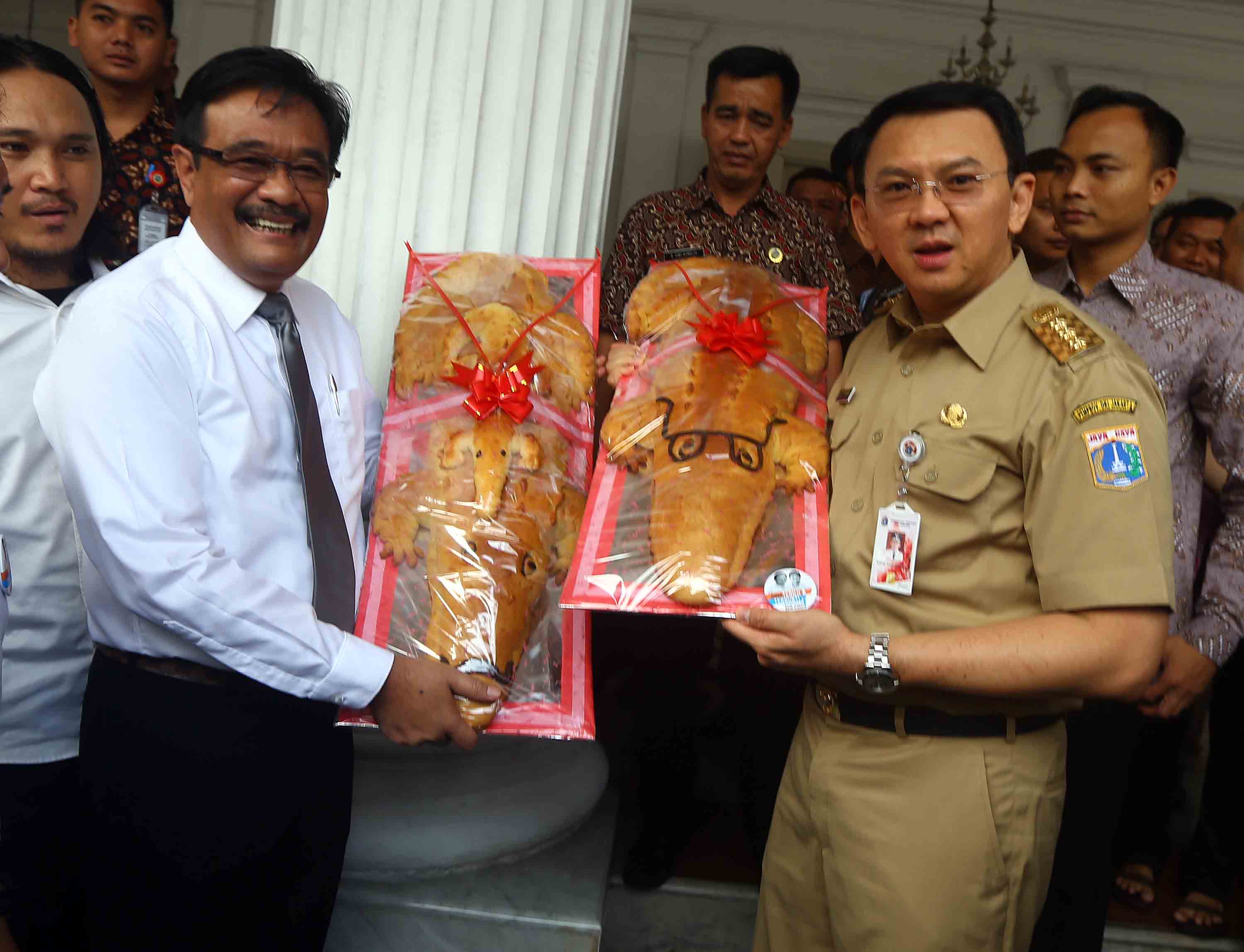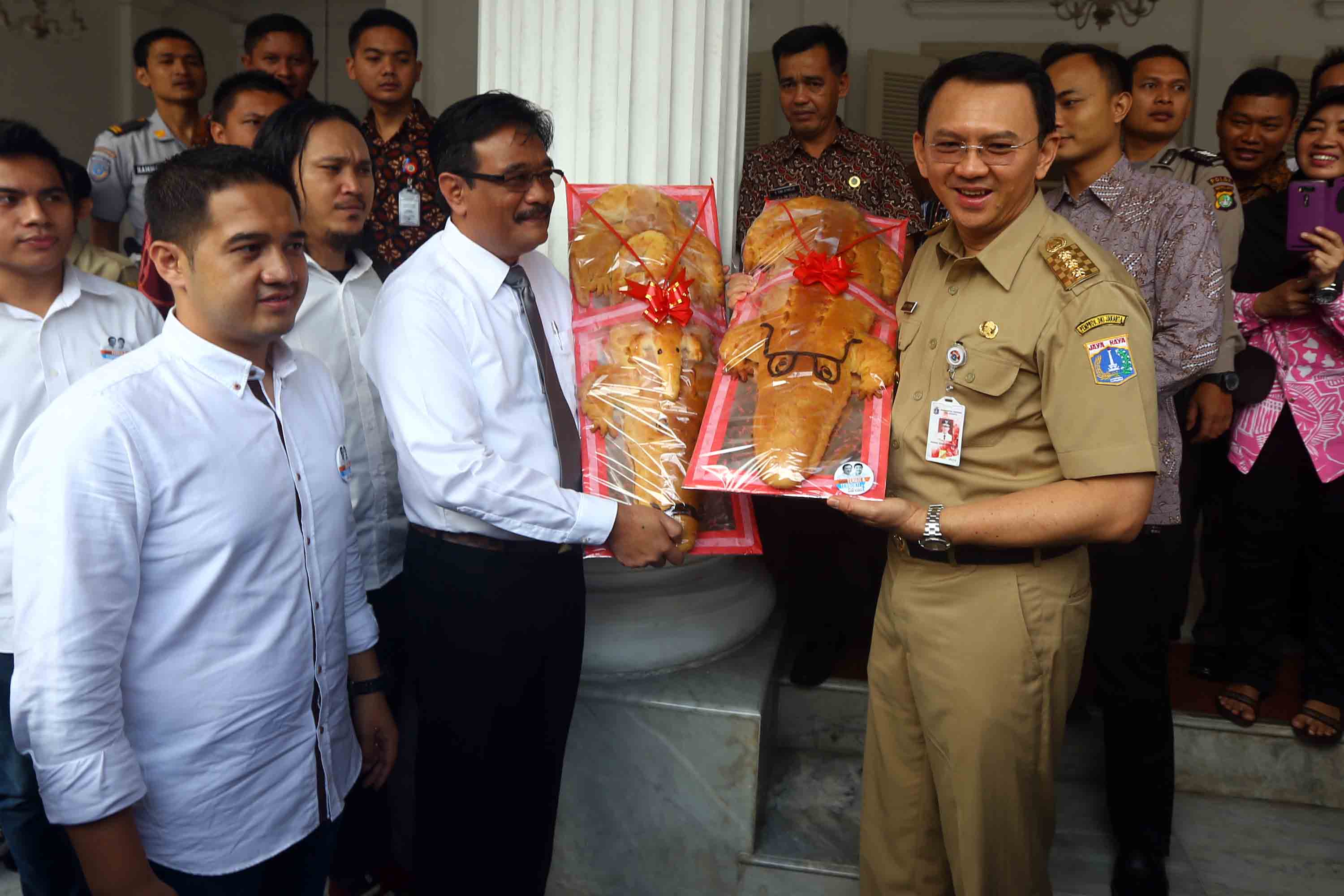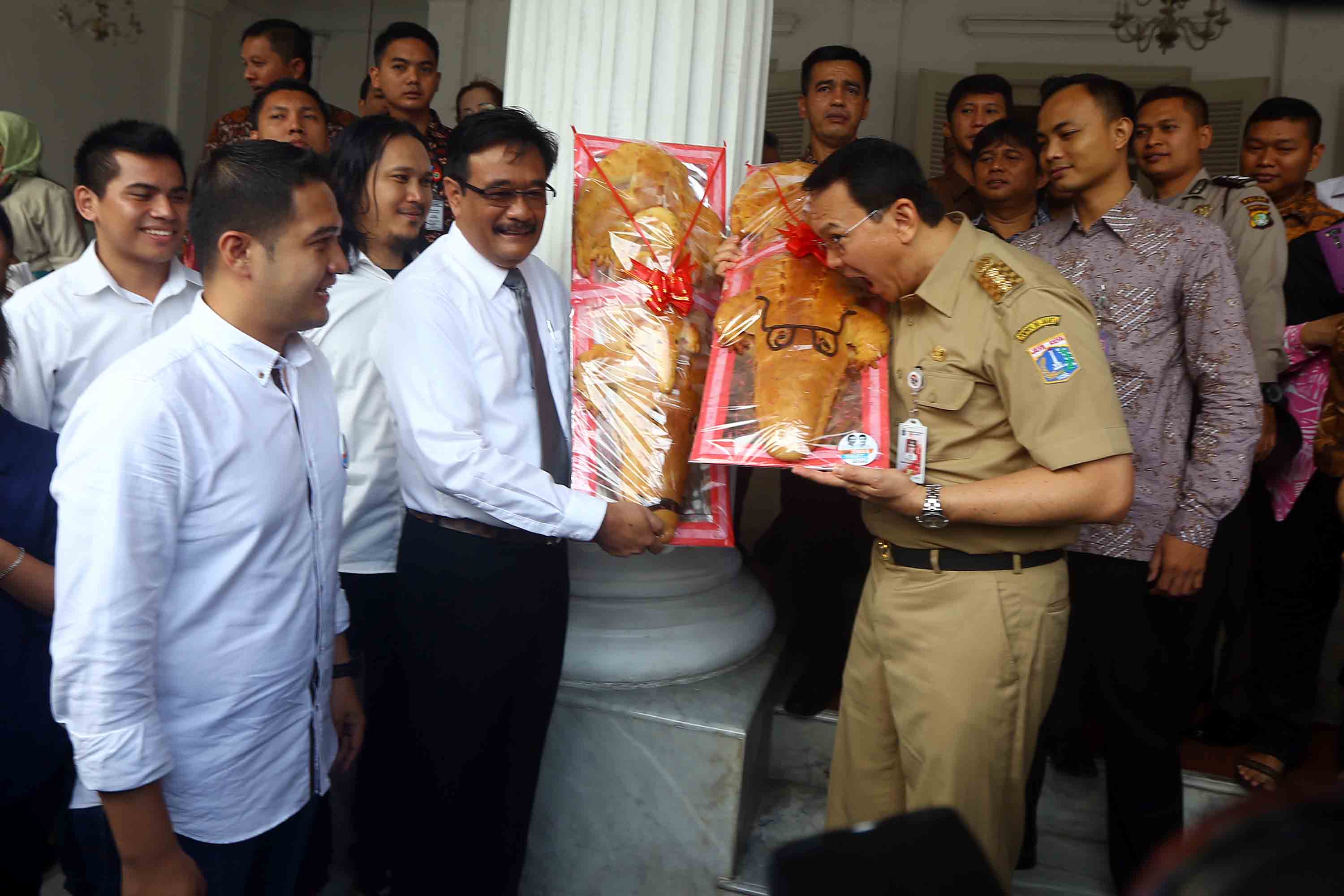 Gubernur DKI Jakarta Basuki Tjahaja Purnama dan Wakil Gubernur DKI Jakarta Djarot Saiful Hidayat menerima roti buaya dari relawan di Balai Kota DKI Jakarta, Senin (29/8/2016).Koordinator Relawan Ahok-Djarot, Doddy A Matondang menyatakan, roti buaya sebagai simbol warga DKI meminang Ahok-Djarot kembali memimpin DKI dengan mengikuti Pilkada DKI Jakarta 2017.