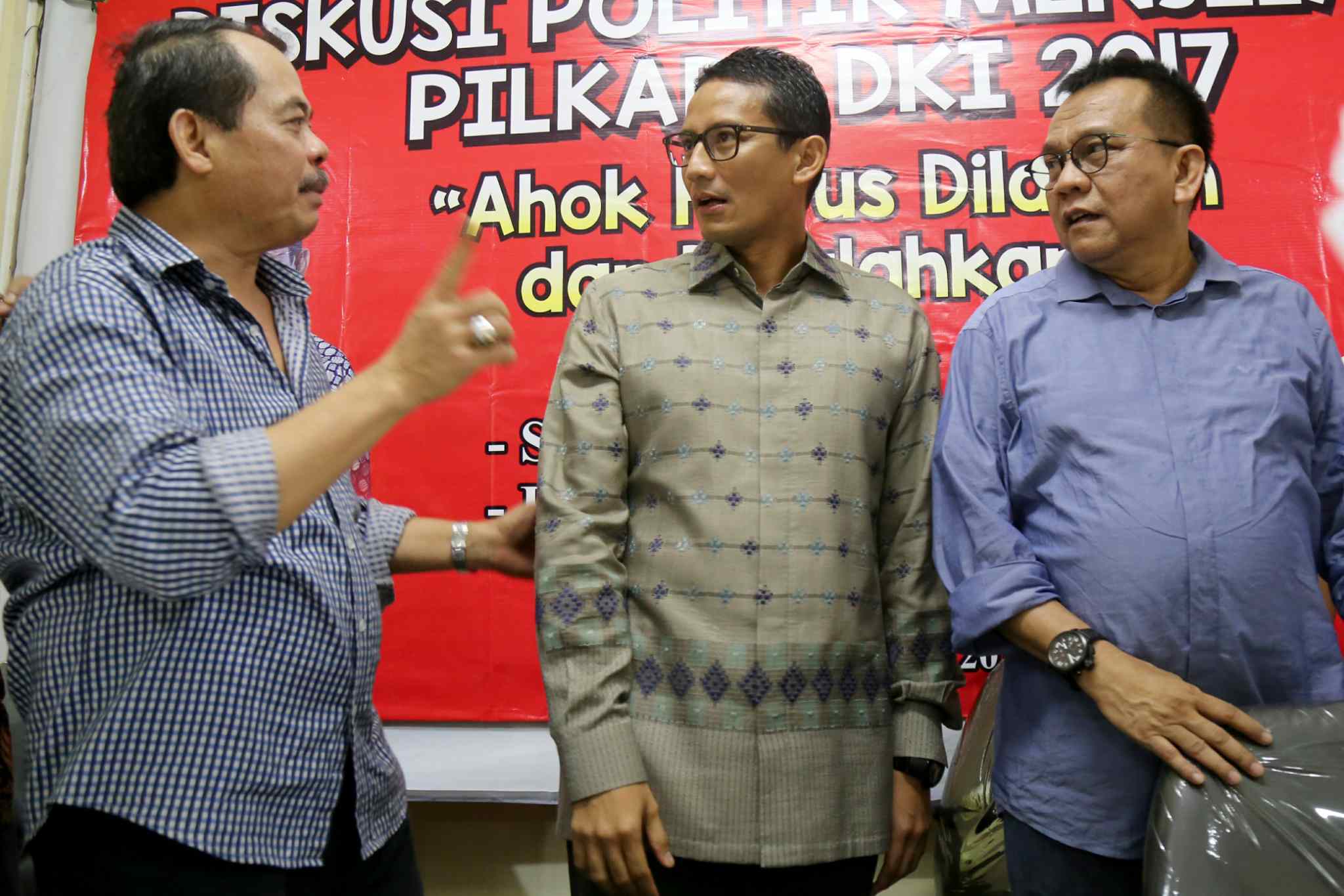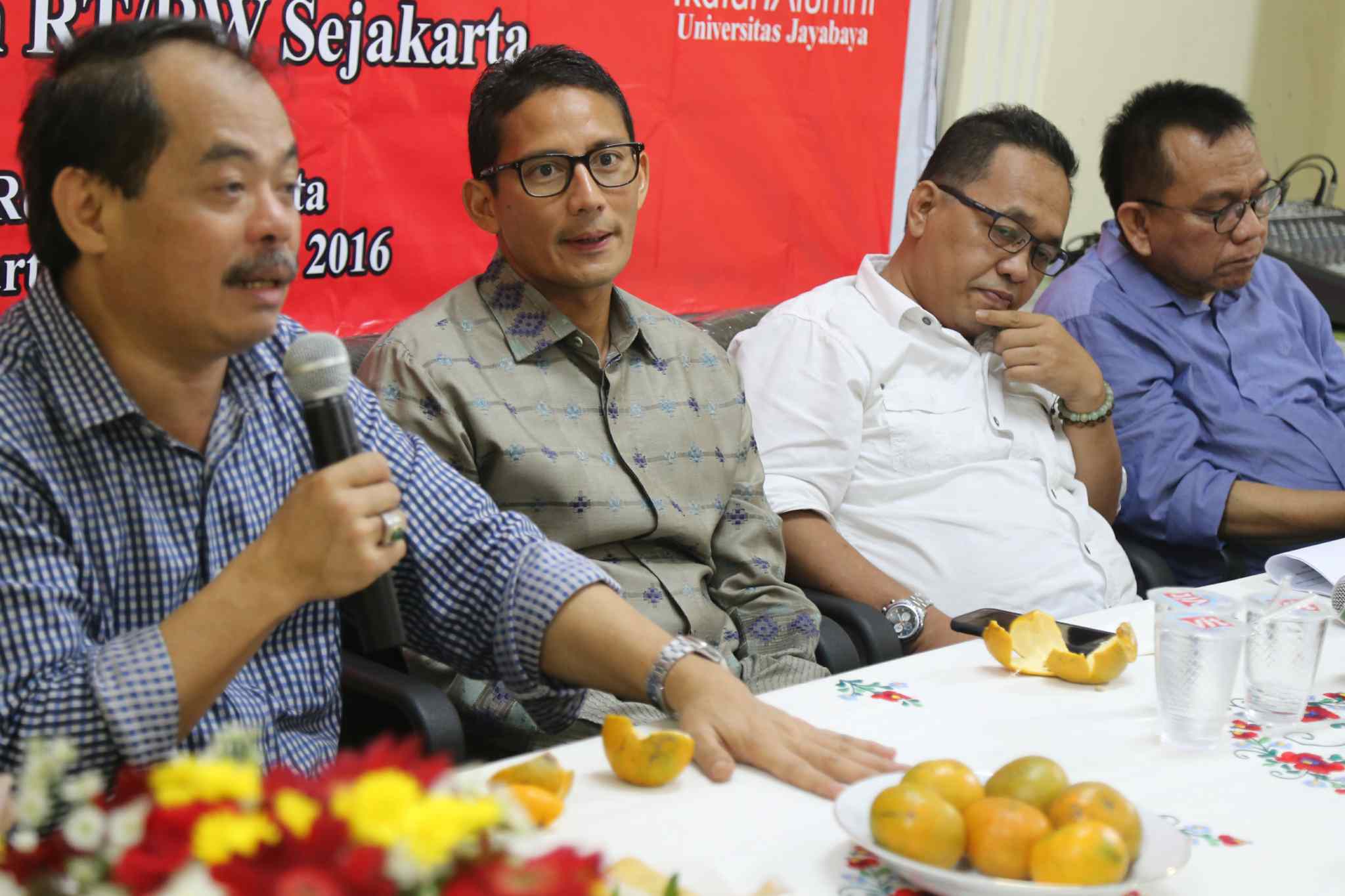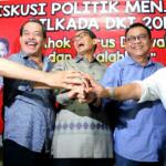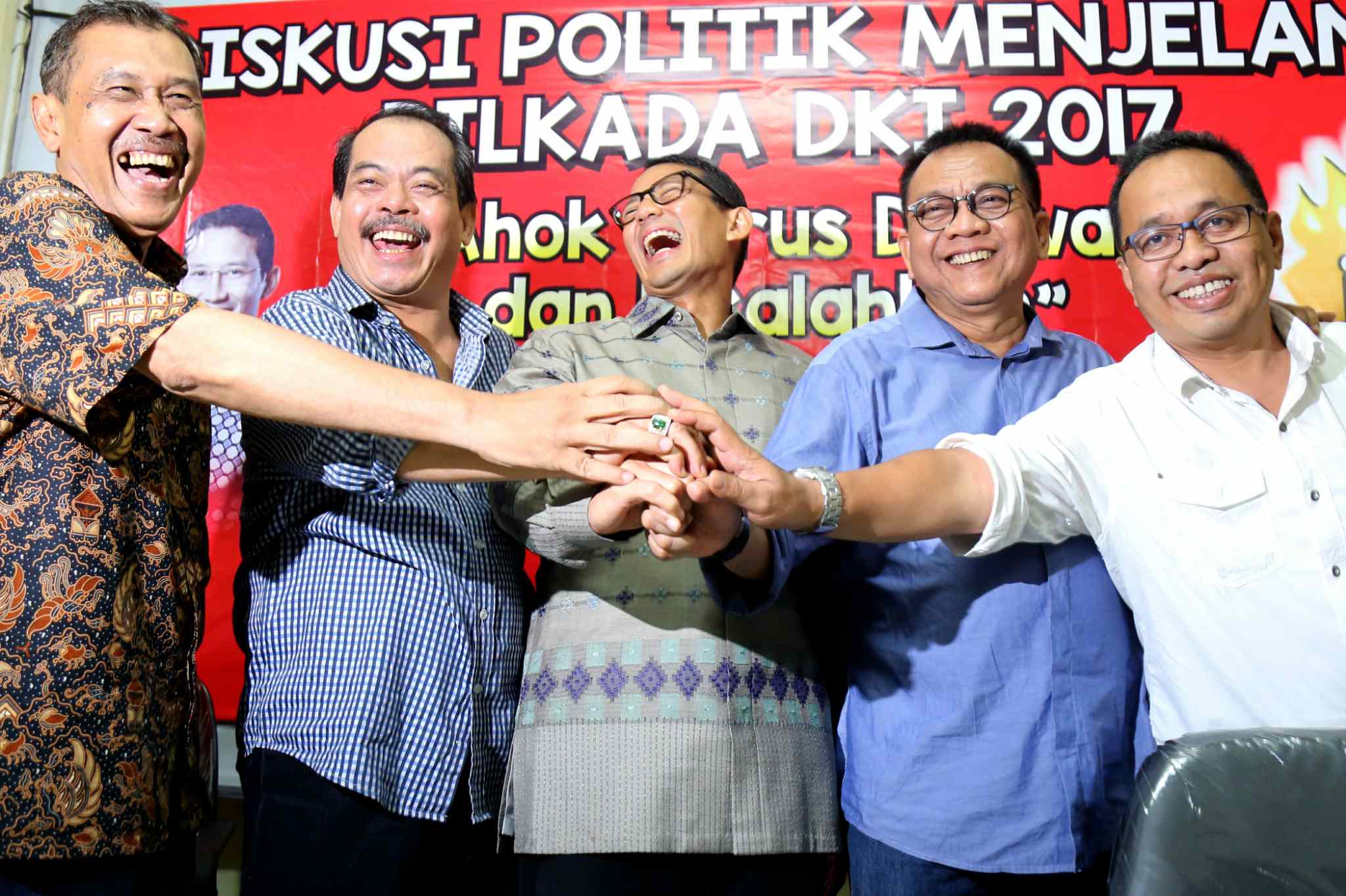 Dari kiri ke kanan, Senior Ikatan Alumni Universitas Jayabaya (Ika Jayabaya) Heru Darmawan, Aktivis Senior Bursah Zarnubi, Balon Gub DKI Jakarta Sandiaga Uno, Ketua DPD Gerindra DKI Mohammad Taufik dan Presidium Forum RT/RW DKI Jakarta Andi Pane, berbicara dalam diakusi Politik "Lawan dan Kalahkan Ahok dalam Pilkada DKI 2017" di Jakarta, Sabtu (27/8). Mereka memaparkan sejumlah starategi dalam kampanye untuk mengalahkan calon Petahana dengan diantaranya melalui penguatan dukungan jaringan komunitas dan media sosial. AKTUAL/TINO OKTAVIANO