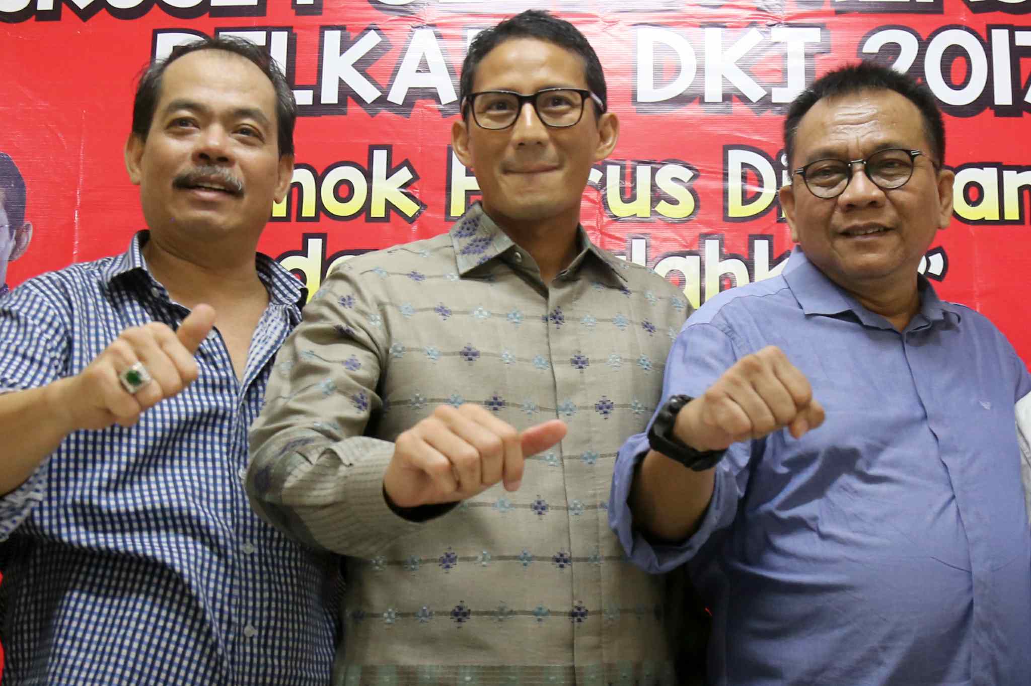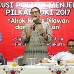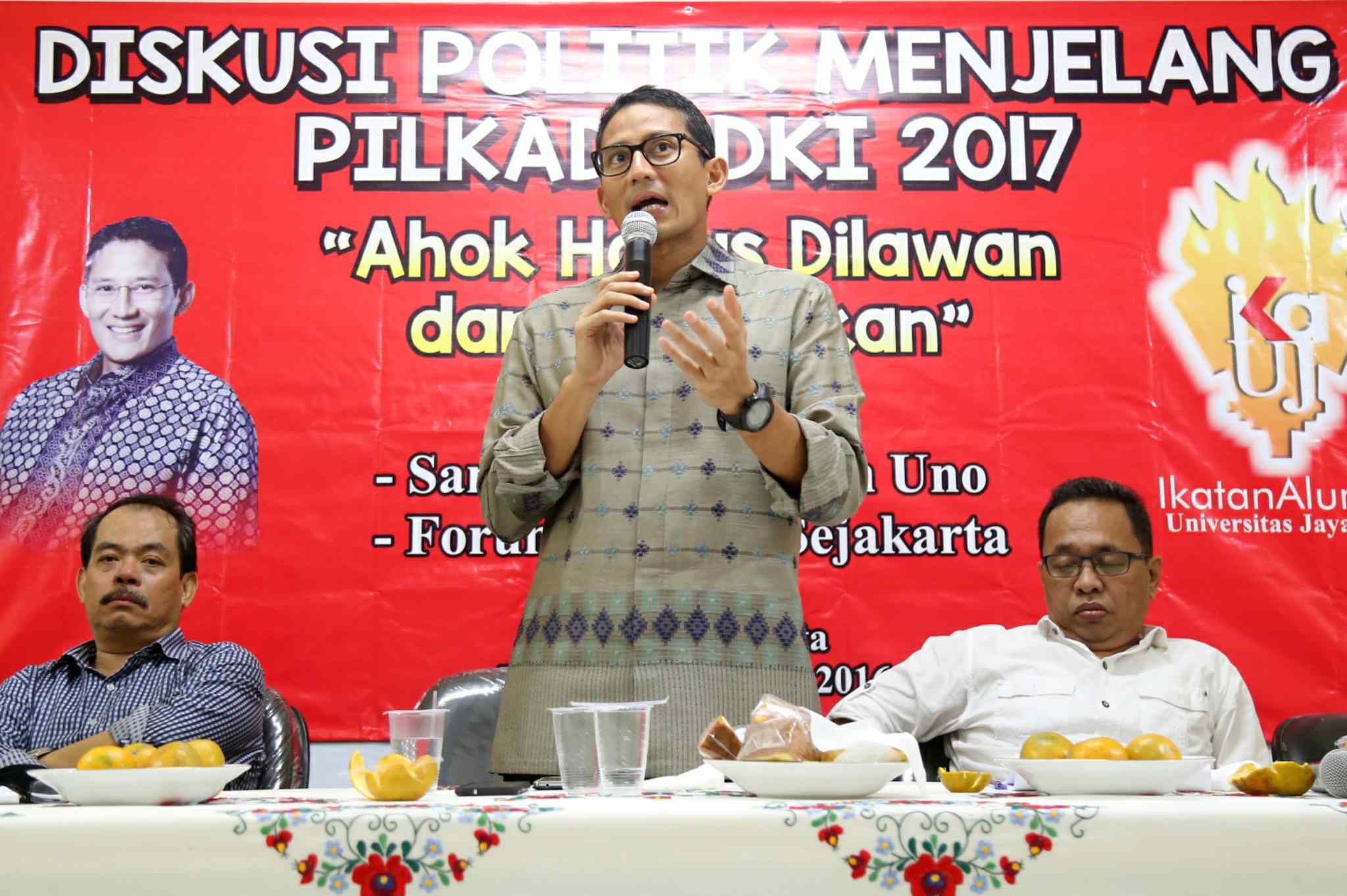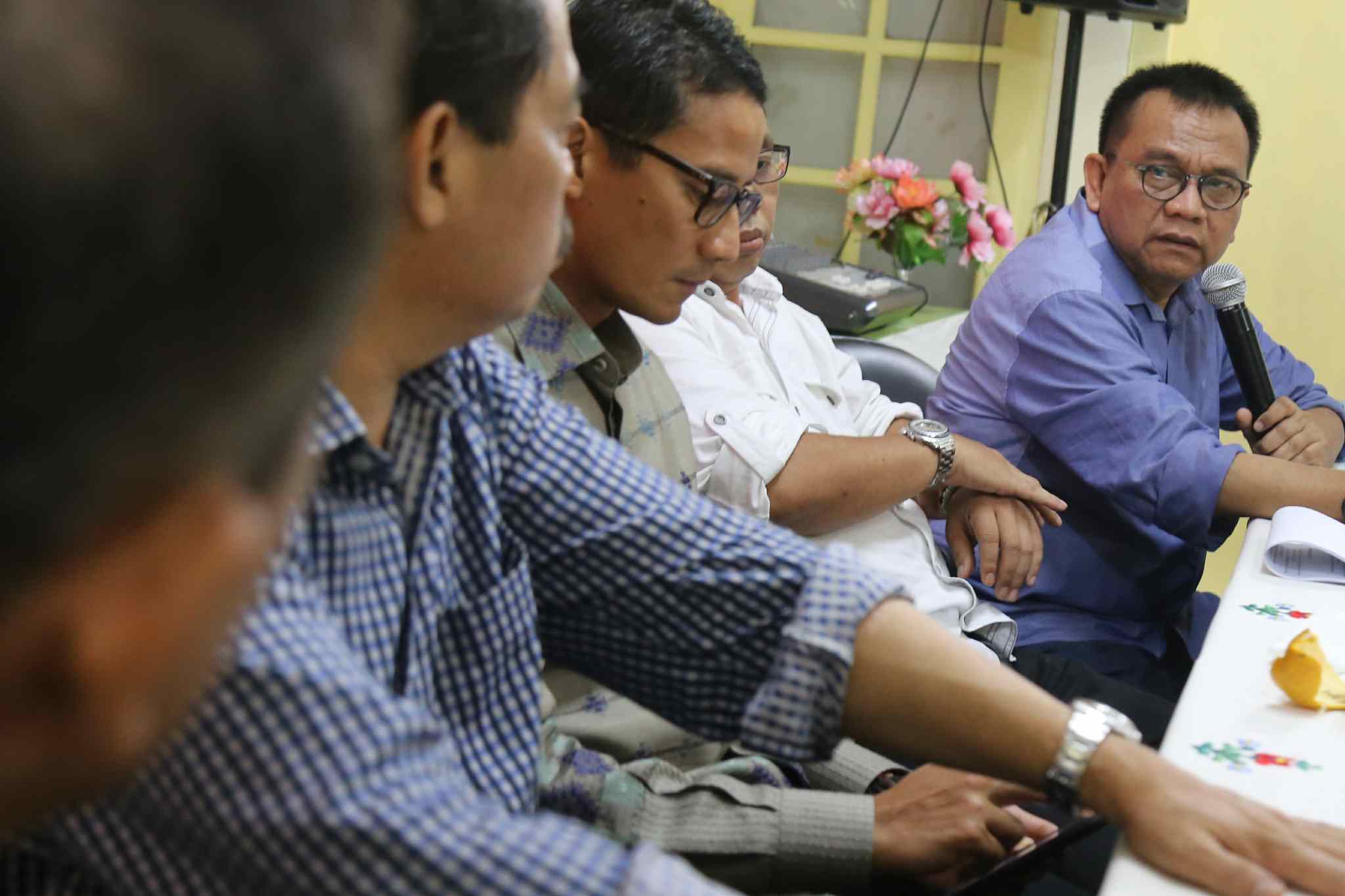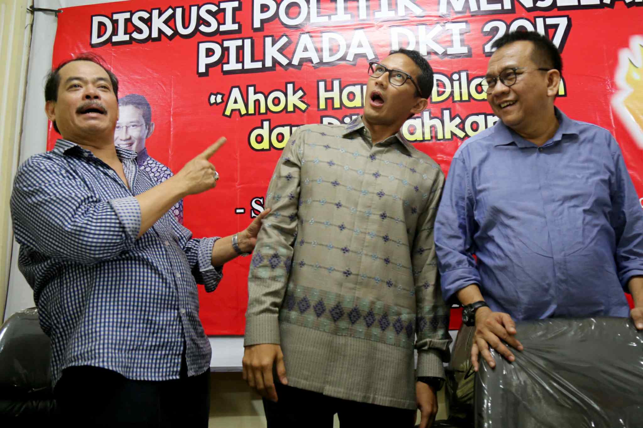 Dari kiri ke kanan, Senior Ikatan Alumni Universitas Jayabaya (Ika Jayabaya) Heru Darmawan, Aktivis Senior Bursah Zarnubi, Balon Gub DKI Jakarta Sandiaga Uno, Ketua DPD Gerindra DKI Mohammad Taufik dan Presidium Forum RT/RW DKI Jakarta Andi Pane, berbicara dalam diakusi Politik "Lawan dan Kalahkan Ahok dalam Pilkada DKI 2017" di Jakarta, Sabtu (27/8). Mereka memaparkan sejumlah starategi dalam kampanye untuk mengalahkan calon Petahana dengan diantaranya melalui penguatan dukungan jaringan komunitas dan media sosial. AKTUAL/TINO OKTAVIANO