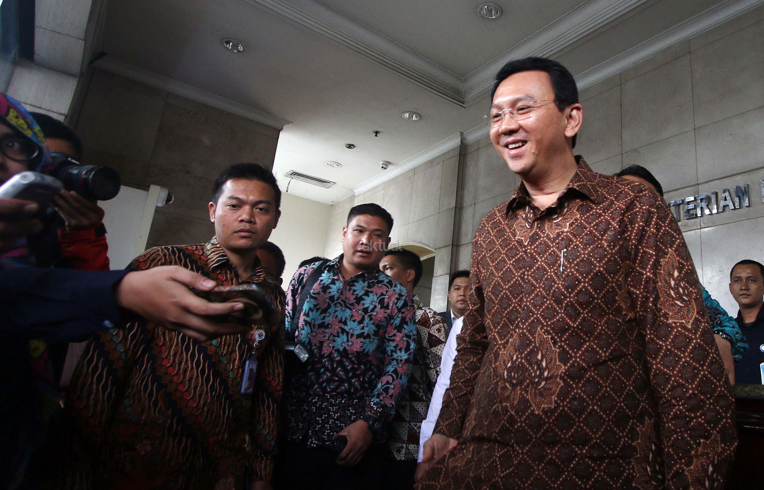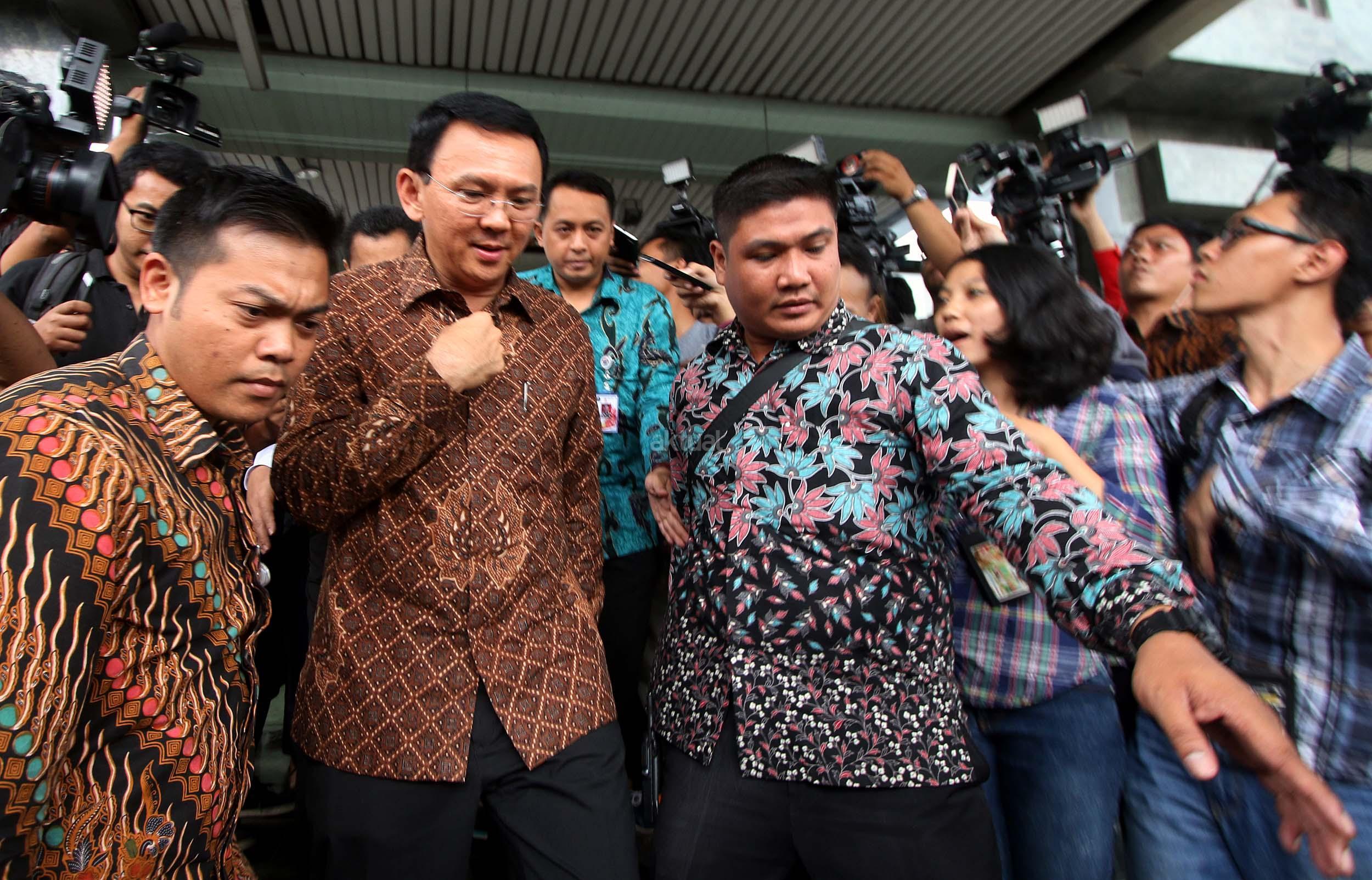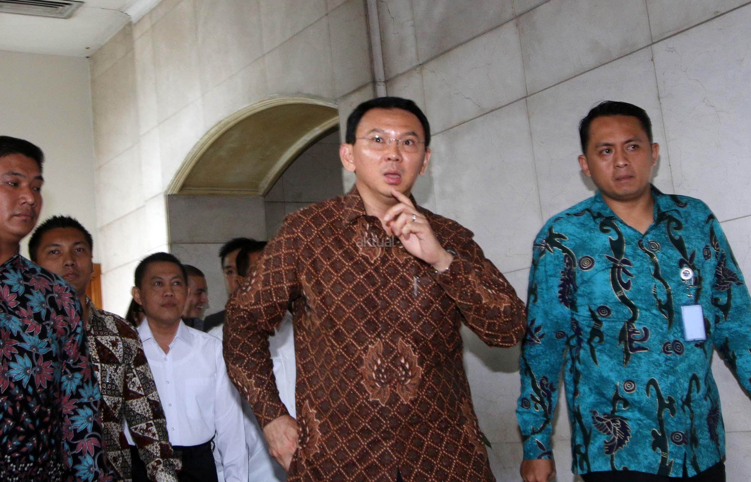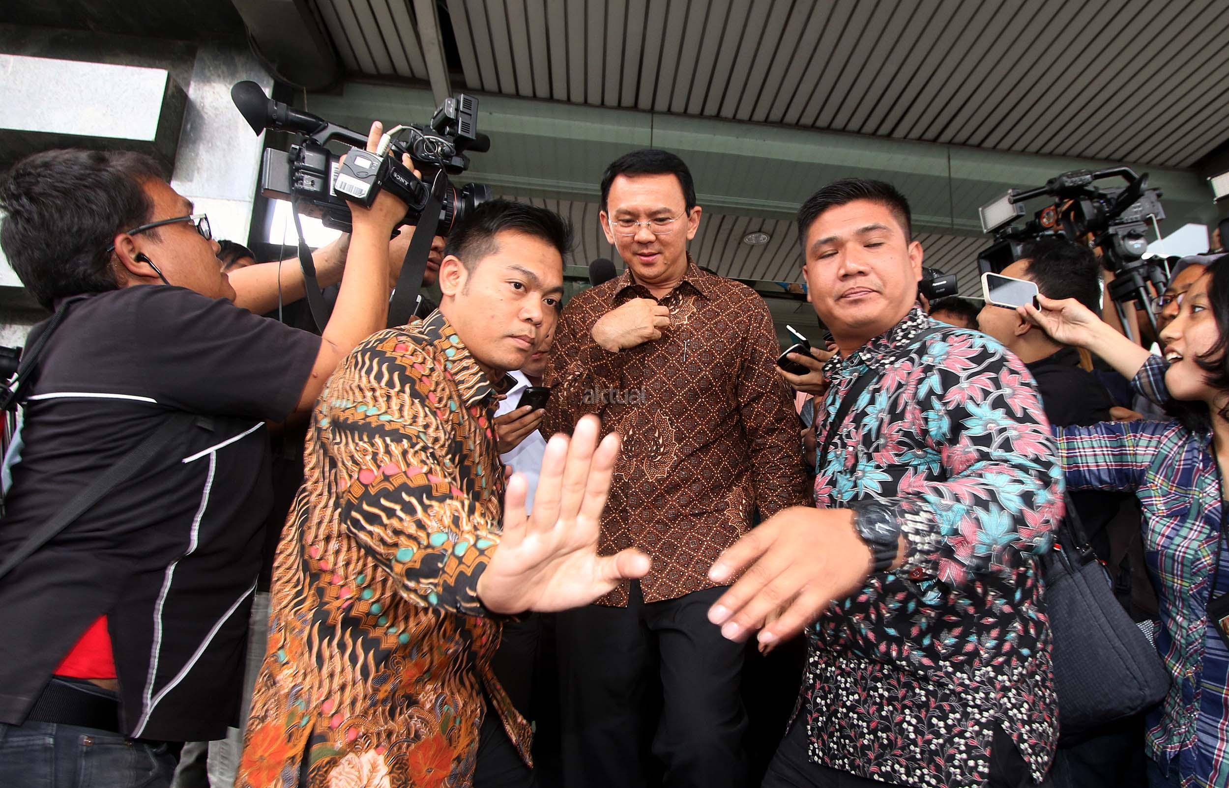Gubernur DKI Jakarta Basuki Tjahaja Purnama atau Ahok keluar dari gedung Bareskrim Polri usai memenuhi panggilan di Jakarta, Senin (24/10/2016). Ahok mendatangi Bareskrim Polri untuk memberikan keterangan dan klarifikasi soal kasus dugaan penistaan agama kepada penyidik.