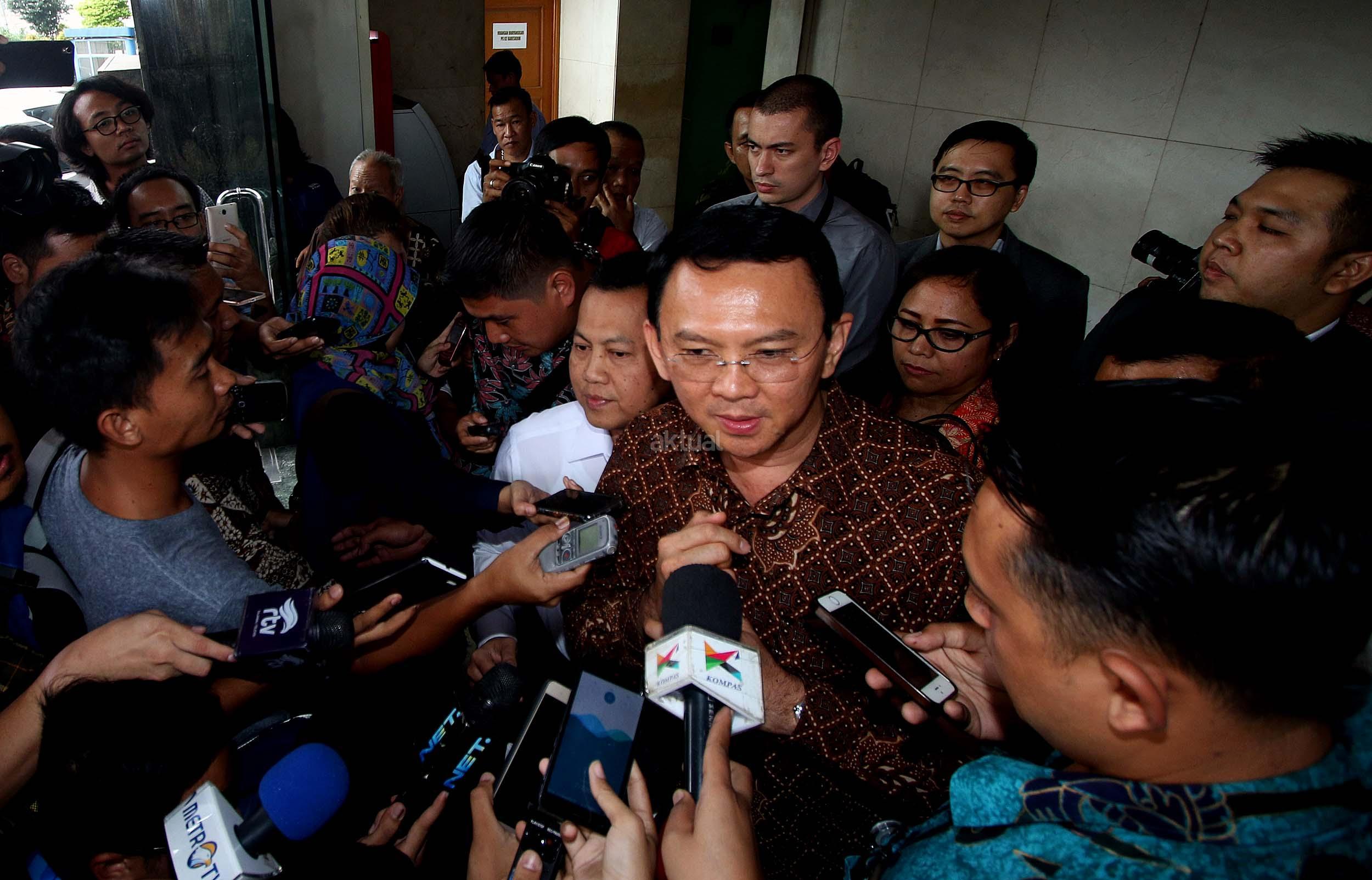 Gubernur DKI Jakarta Basuki Tjahaja Purnama atau Ahok memberikan keterangan persnya usa memenuhi panggilan Bareskrim Polri ,di Jakarta, Senin (24/10/2016). Ahok mendatangi Bareskrim Polri untuk memberikan keterangan dan klarifikasi soal kasus dugaan penistaan agama kepada penyidik.