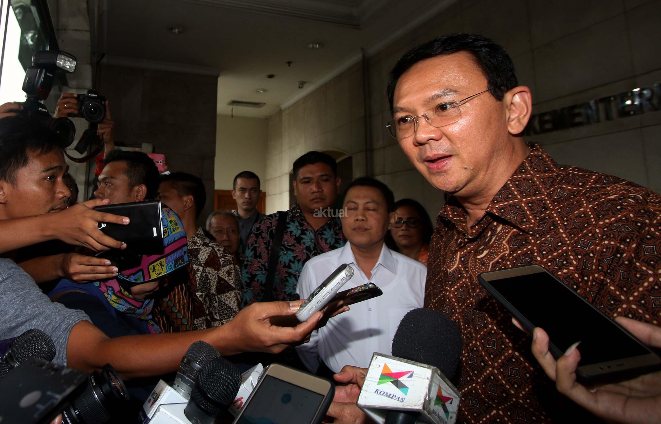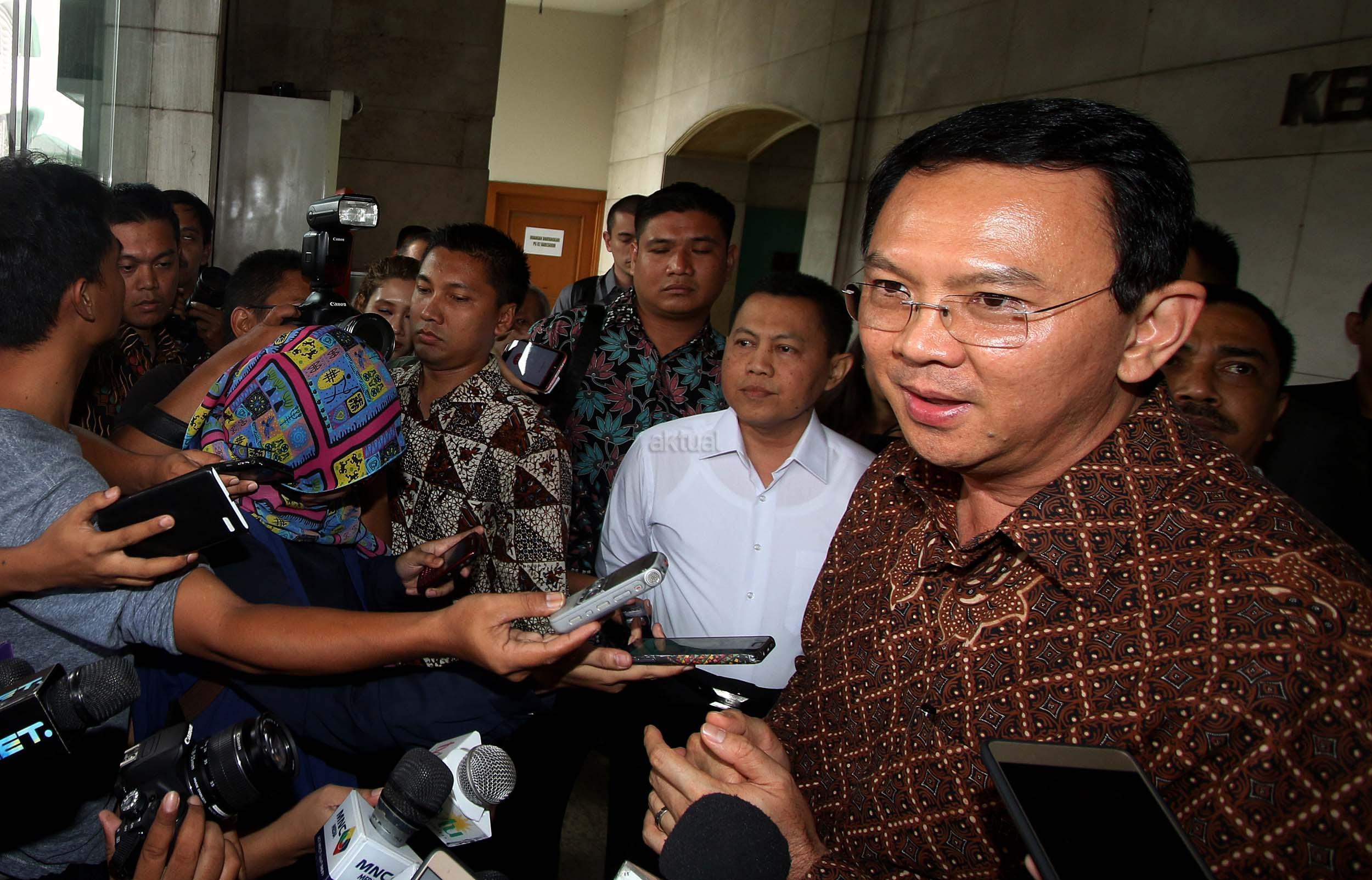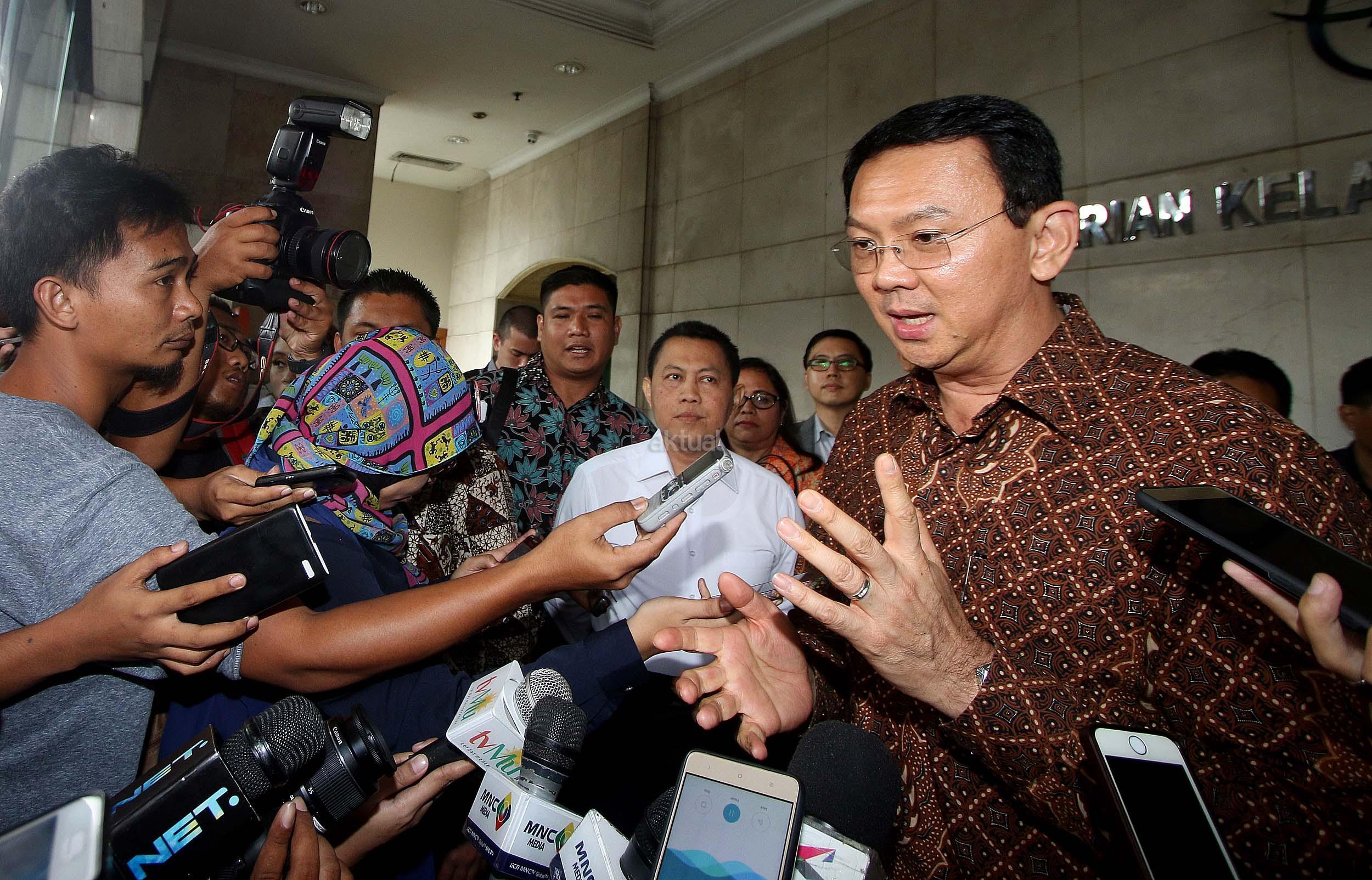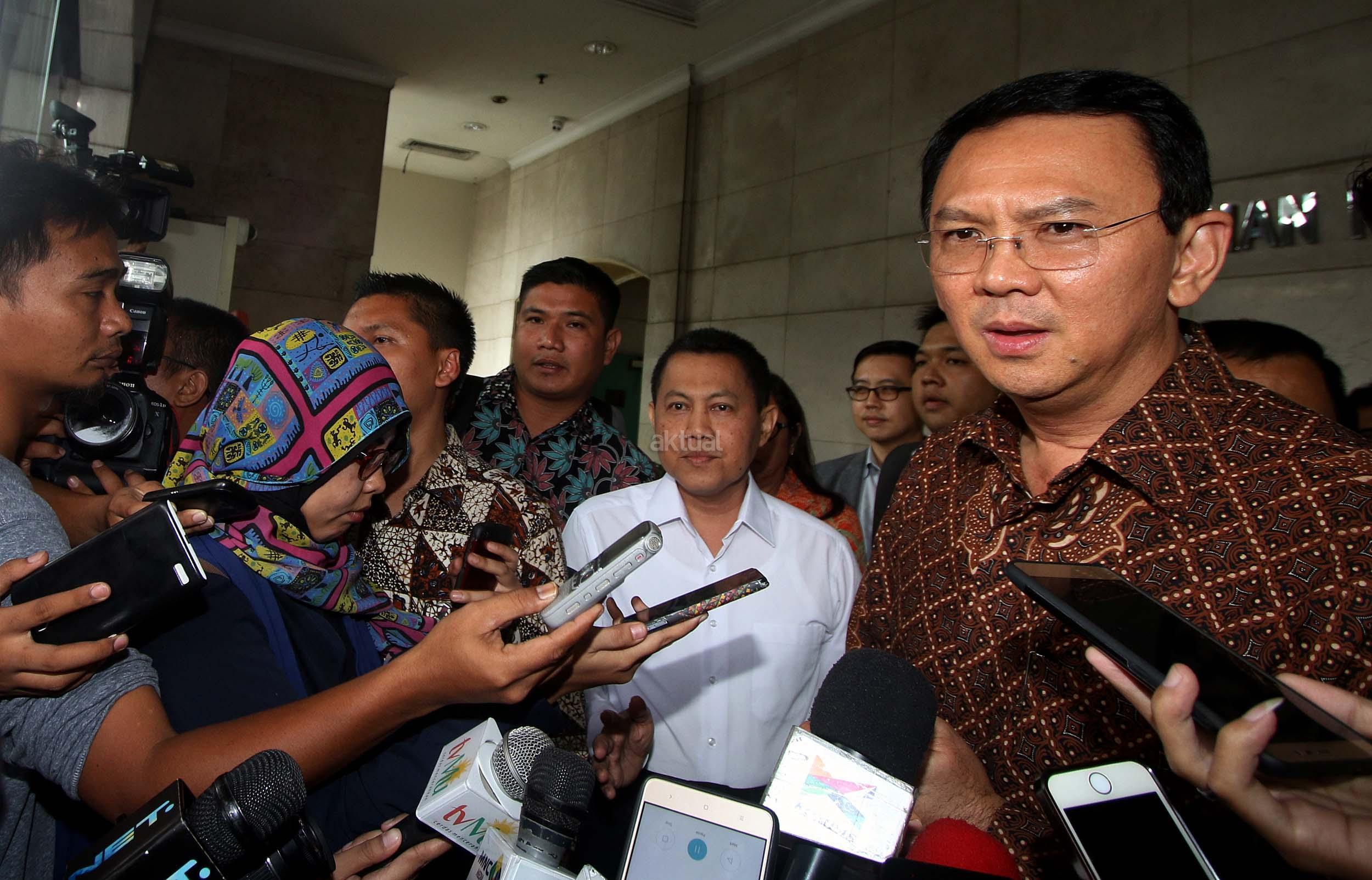 Gubernur DKI Jakarta Basuki Tjahaja Purnama atau Ahok memberikan keterangan persnya usai memenuhi panggilan Bareskrim Polri ,di Jakarta, Senin (24/10/2016). Ahok mendatangi Bareskrim Polri untuk memberikan keterangan dan klarifikasi soal kasus dugaan penistaan agama kepada penyidik.
