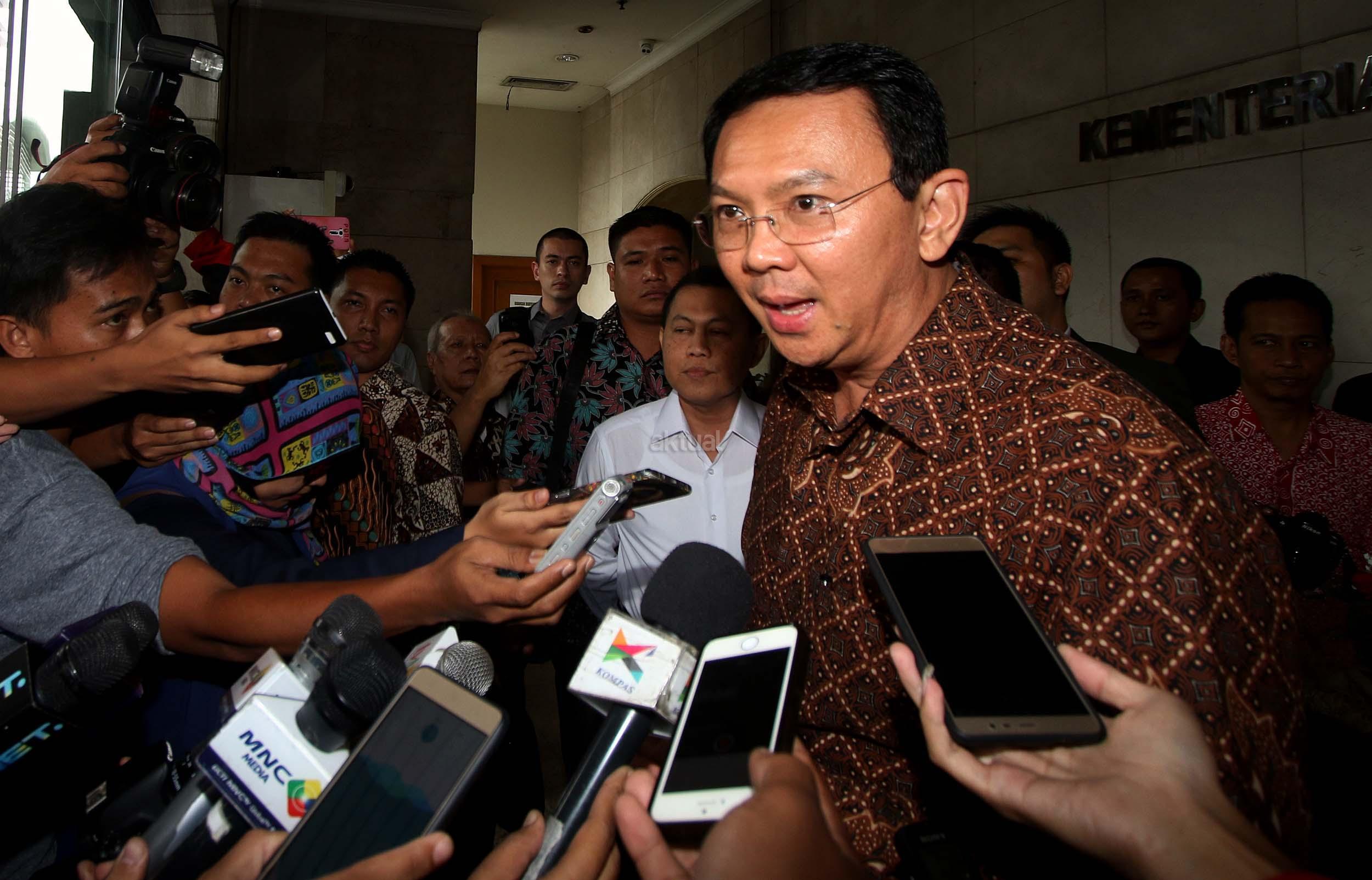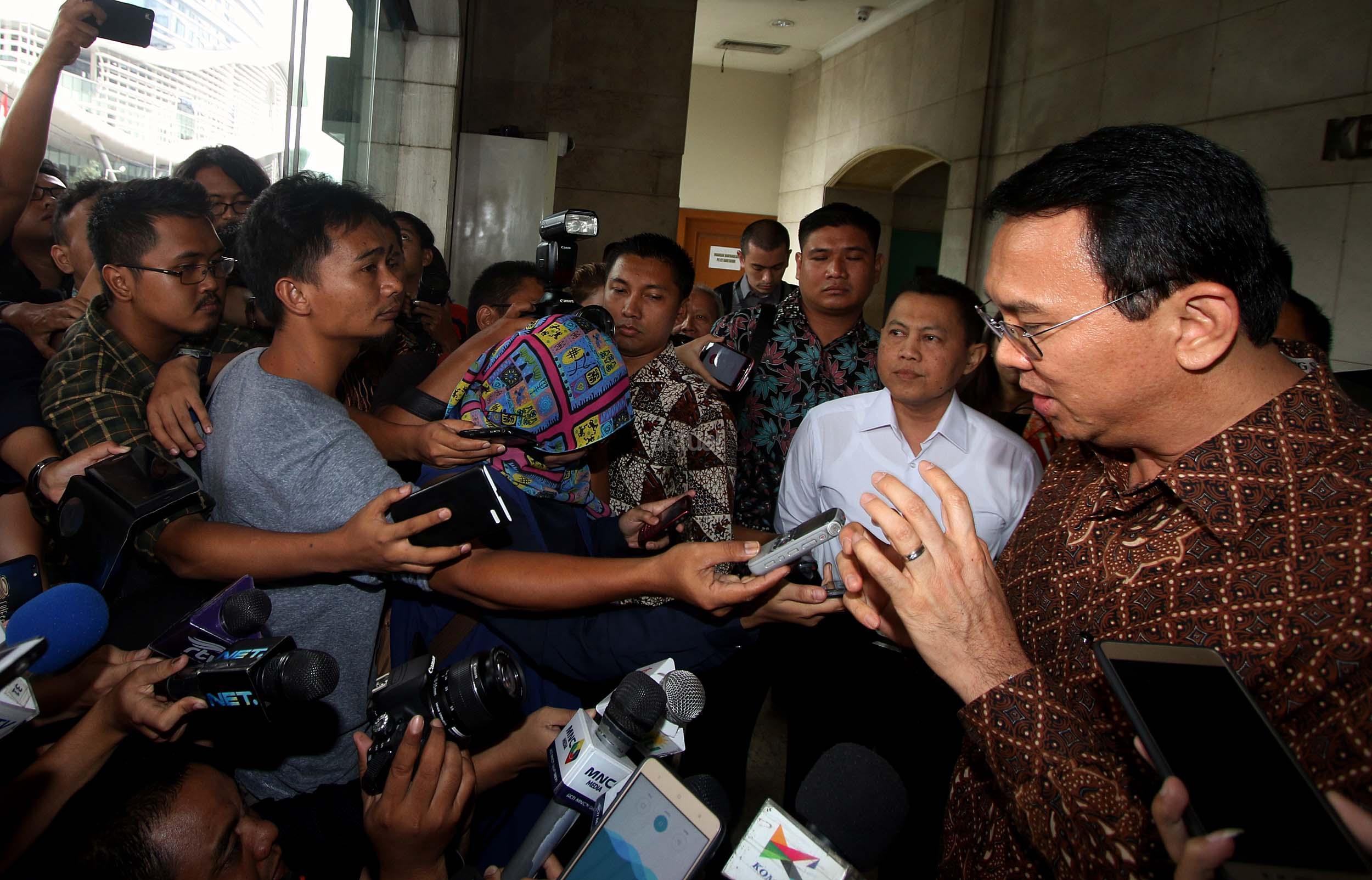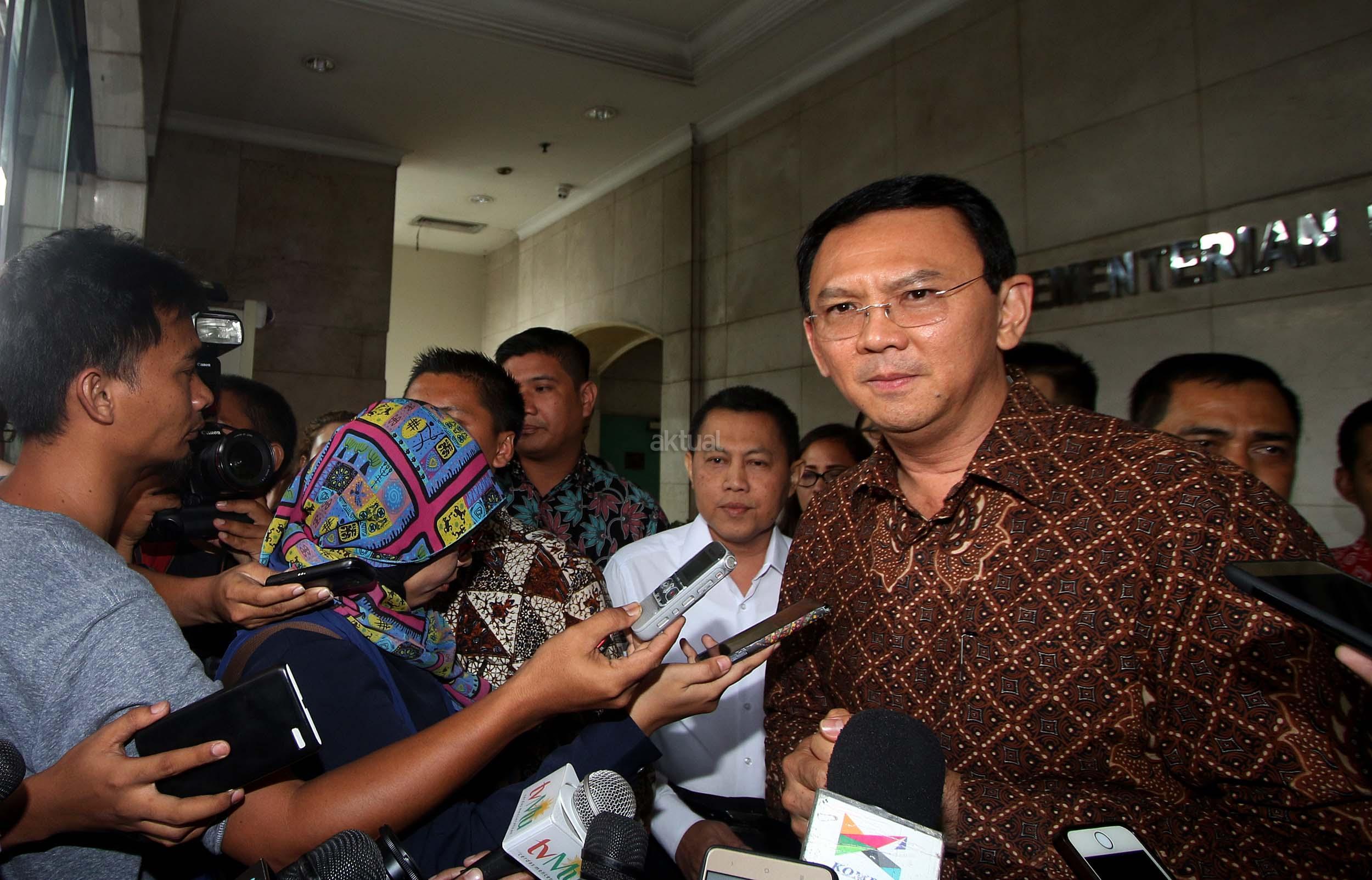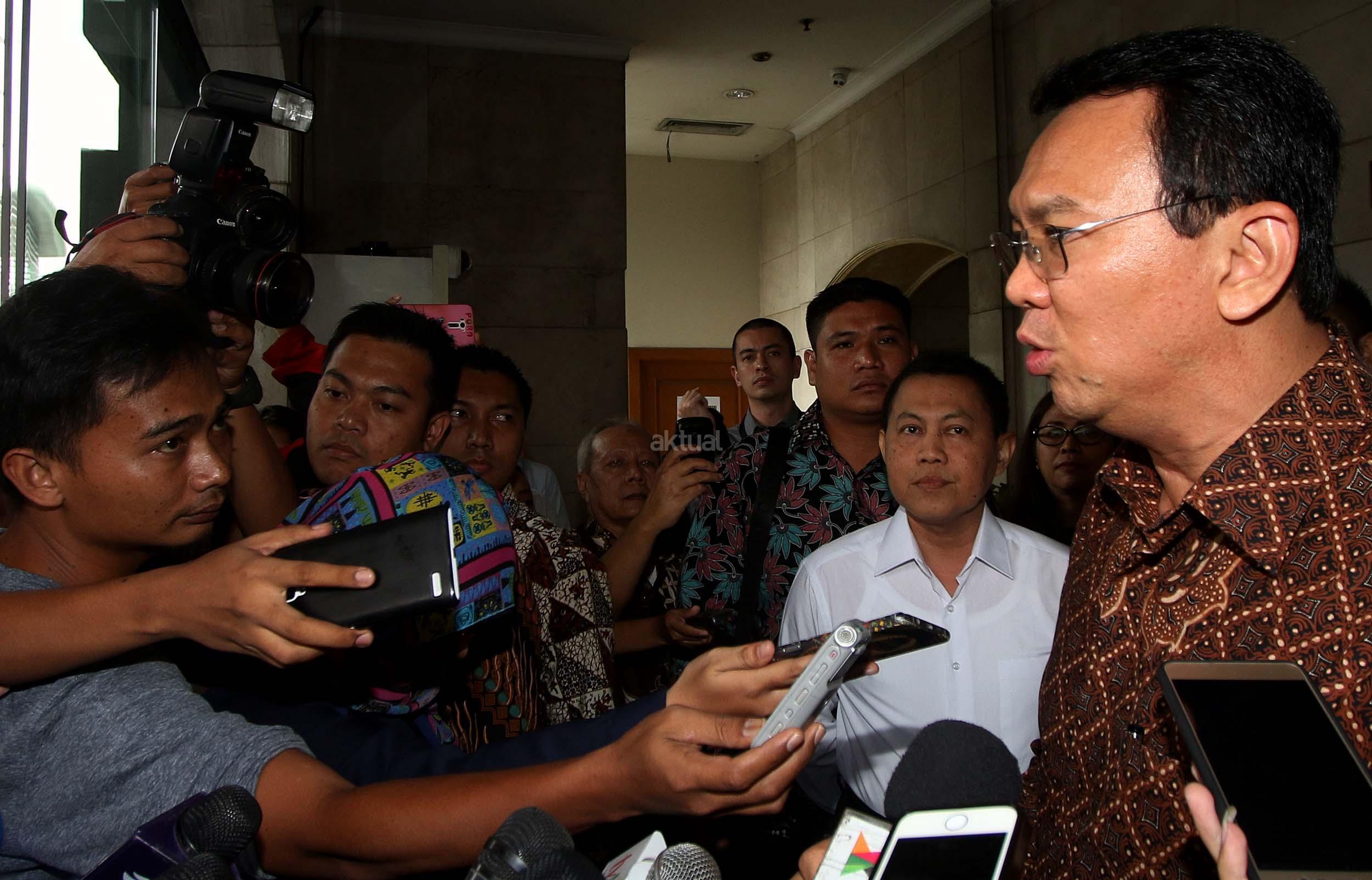 Gubernur DKI Jakarta Basuki Tjahaja Purnama atau Ahok memberikan keterangan persnya usai memenuhi panggilan Bareskrim Polri ,di Jakarta, Senin (24/10/2016). Ahok mendatangi Bareskrim Polri untuk memberikan keterangan dan klarifikasi soal kasus dugaan penistaan agama kepada penyidik.