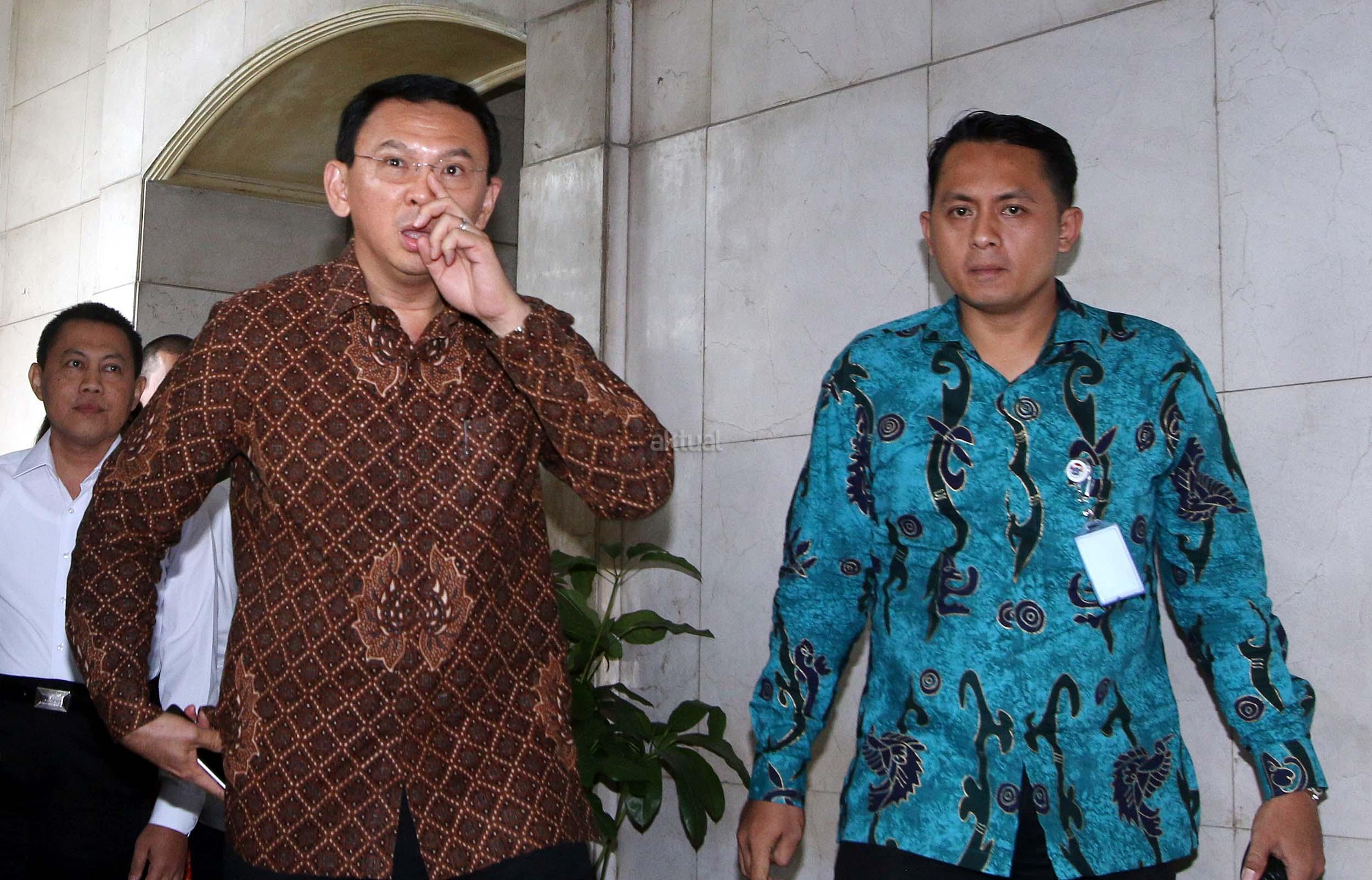Gubernur DKI Jakarta Basuki Tjahaja Purnama atau Ahok keluar dari gedung Bareskrim Polri usai memenuhi panggilan di Jakarta, Senin (24/10/2016). Ahok mendatangi Bareskrim Polri untuk memberikan keterangan dan klarifikasi soal kasus dugaan penistaan agama kepada penyidik. AKTUAL/Munzir