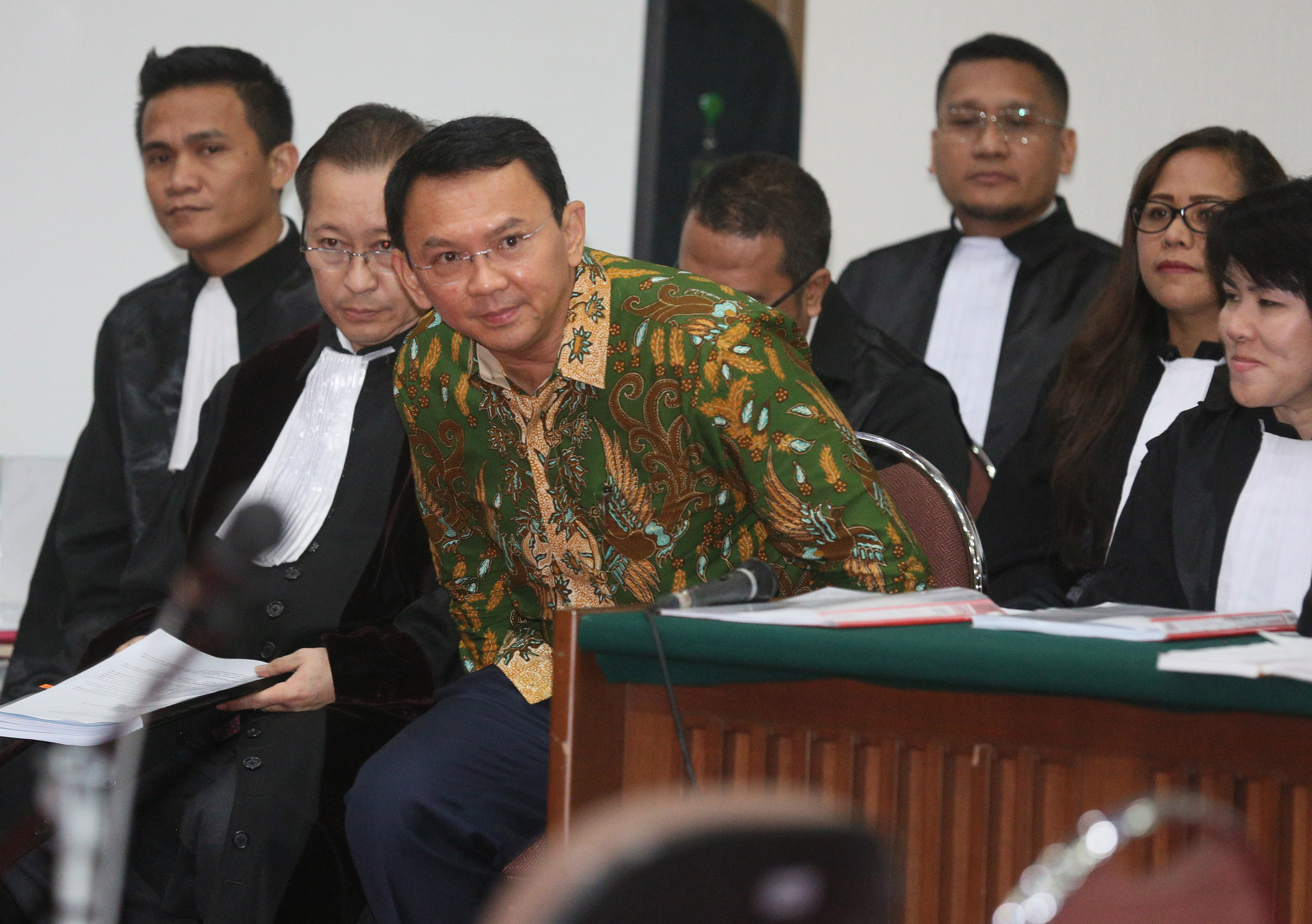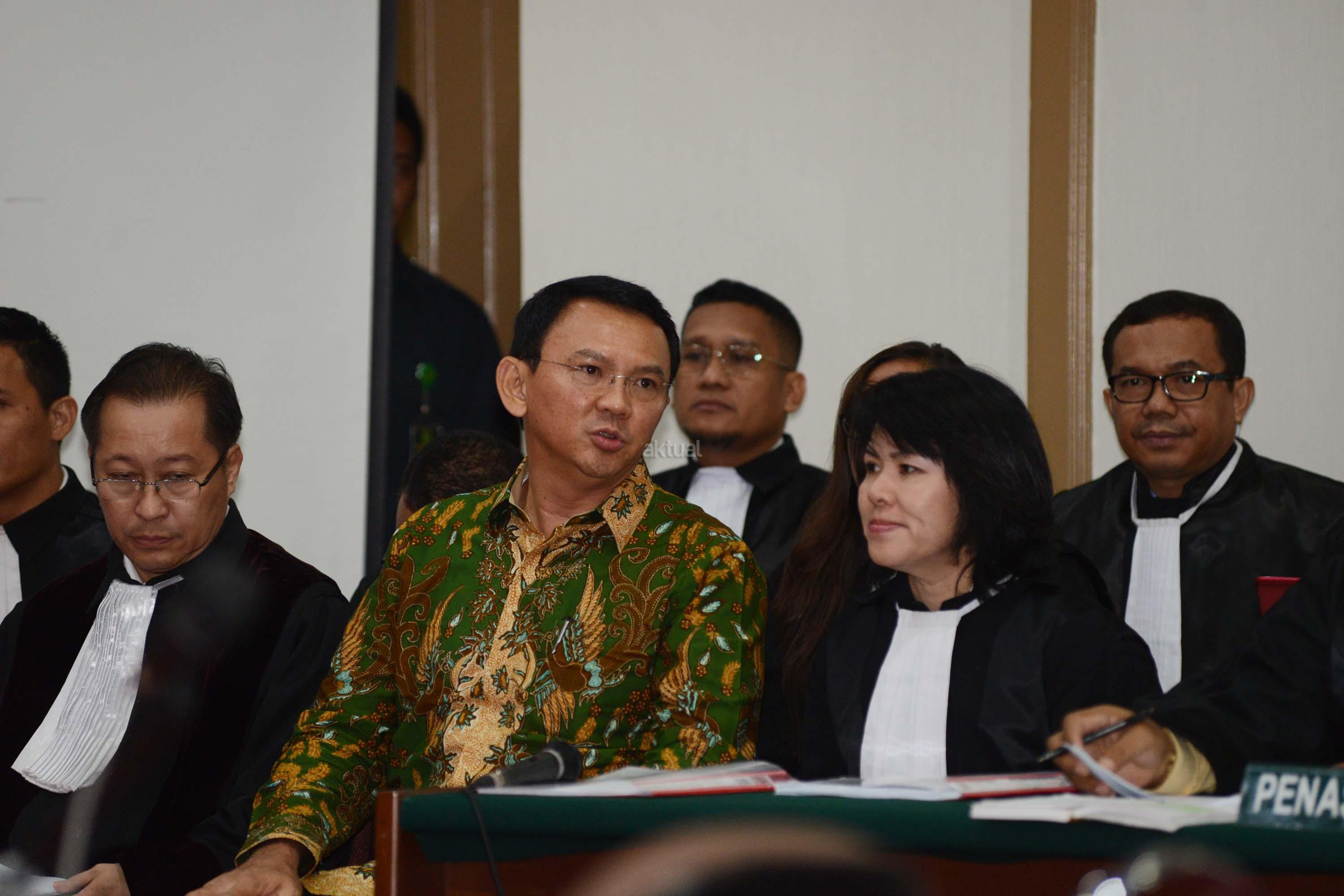 Terdakwa kasus dugaan penistaan agama Gubernur DKI Jakarta, Basuki Tjahaja Purnama menjalani sidang yang digelar oleh Pengadilan Negeri Jakarta Utara di Auditorium Kementerian Pertanian, Jakarta, Selasa (28/2). Dalam sidang tersebut, Jaksa Penuntut Umum menghadirkan dua orang saksi ahli yaitu Habib Rizieq Shihab dan Ahli Hukum Pidana Abdul Chair Ramadhan untuk memberikan keterangan terkait dugaan kasus penistaan agama. Republika-Pool/Raisan Al Farisi