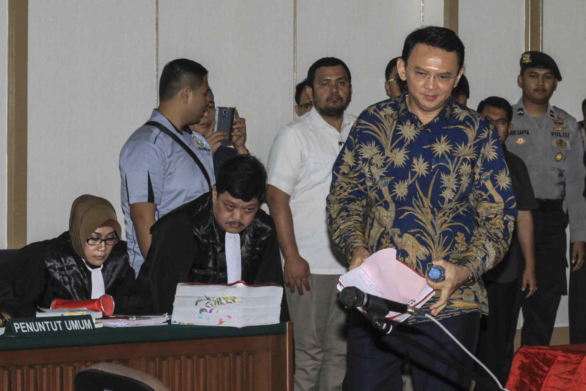 Gubernur DKI Jakarta nonaktif Basuki Tjahaja Purnama alias Ahok (kanan) memasuki ruang sidang untuk menjalani sidang lanjutan kasus dugaan penistaan agama di PN Jakarta Utara, Auditorium Kementerian Pertanian, Jakarta, Selasa (4/4). Sidang ke-17 tersebut beragendakan pemeriksaan terdakwa Basuki Tjahaja Purnama. ANTARA FOTO/Gilang Praja/hma/ama/17