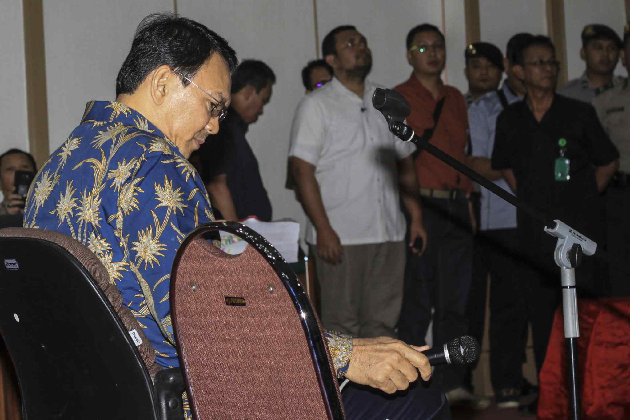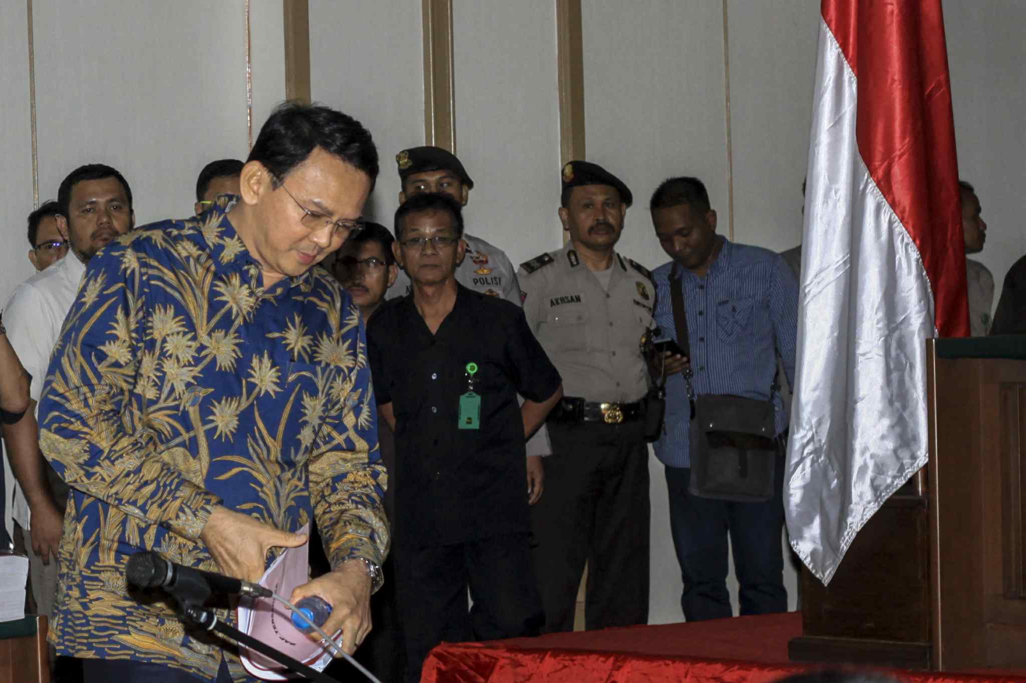 Gubernur DKI Jakarta nonaktif Basuki Tjahaja Purnama alias Ahok memasuki ruang sidang untuk menjalani sidang lanjutan kasus dugaan penistaan agama di PN Jakarta Utara, Auditorium Kementerian Pertanian, Jakarta, Selasa (4/4). Sidang ke-17 tersebut beragendakan pemeriksaan terdakwa Basuki Tjahaja Purnama. ANTARA FOTO/Gilang Praja/hma/ama/17