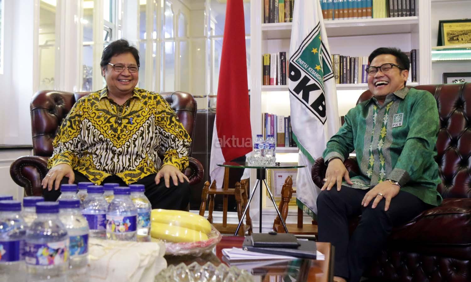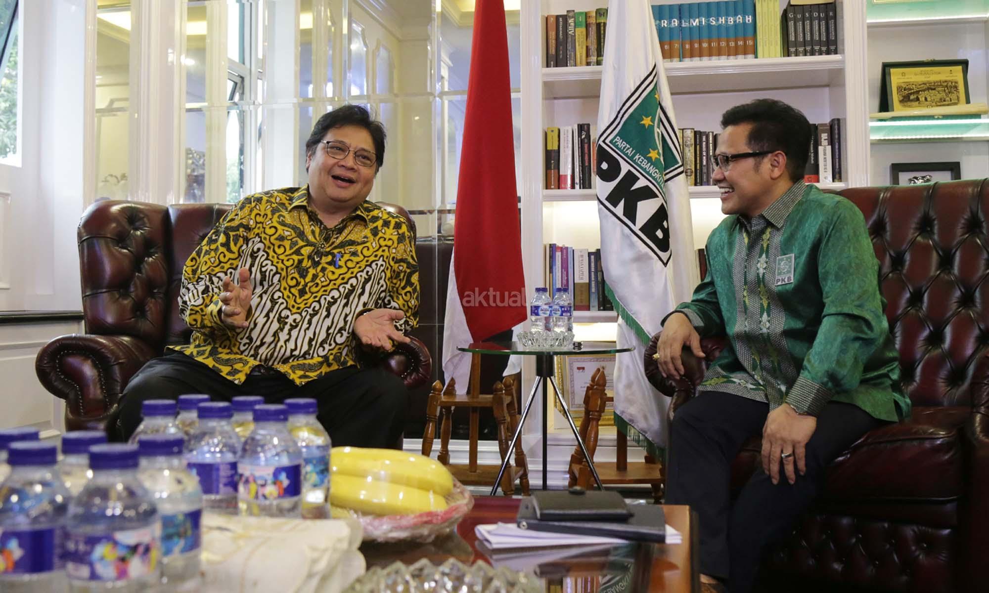 Ketua Umum Partai Golongan Karya (Golkar) Airlangga Hartarto berbincang dengan Ketua Umum PKB Muhaimin Iskandar (Cak Imin) saat silaturahmi ke kantor DPP Partai Kebangkitan Bangsa (PKB), Jakarta, Rabu (4/7/2018). Pertemuan tersebut membahas koalisi partai pendukung Jokowi di pilpres 2019. AKTUAL/Tino Oktaviano