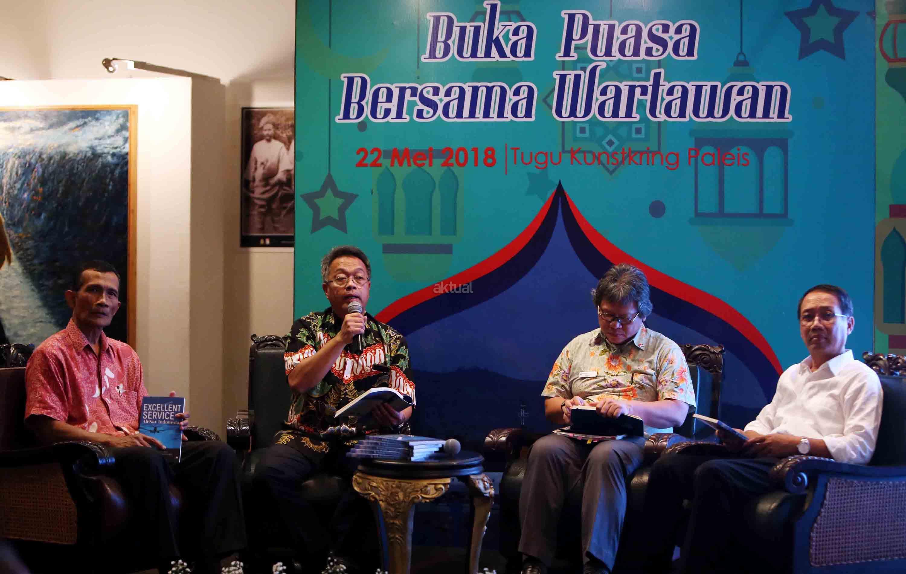 Direktur Utama AirNav Indonesia Novie Riyanto (kedua kanan), Direktur AirNav Indonesia Wisnu Darjono (kiri), Direktur Keselamatan, Keamanan dan Standardisasi AirNav Indonesia Yurlis Hasibuan (kedua kiri) dan Direktur Personalia dan Umum Rahadi Sulistyo (kanan) saat peluncuran buku Excellent Service Of AirNav Indonesia, di Jakarta, Selasa (22/5/2018). Di sela peluncuran buku Excellent Service Of AirNav Indonesia, AirNav Indonesia juga memaparkan kesiapan pengelolaan angkutan Lebaran 2018. AKTUAL/Tino Oktaviano