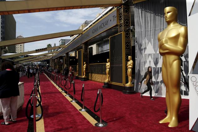Patung Oscar dalam foto di karpet merah di Dolby Theater saat persiapan menjelang Academy Awards ke-88 di Hollywood, California, Sabtu (27/2). ANTARA FOTO/REUTERS/Mario Anzuoni/cfo/16