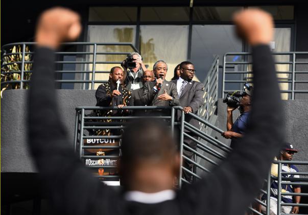Pendeta Al Sharpton (tengah) berbicara dalam protes diluar Academy Awards ke-88 ketika seorang pendemo mengangkat tangannya di Hollywood, California, Minggu (28/2). Sharpton memimpin sebuah kelompok memprotes kegagalan Academy Awards untuk mengakui orang dengan kulit berwarna di kebanyakan kategori. ANTARA FOTO/REUTERS/Stuart Palley/cfo/16