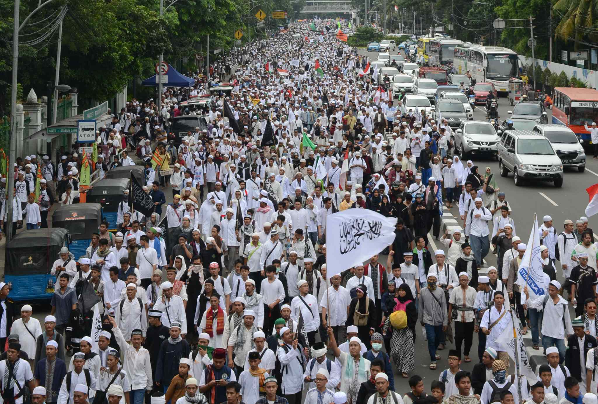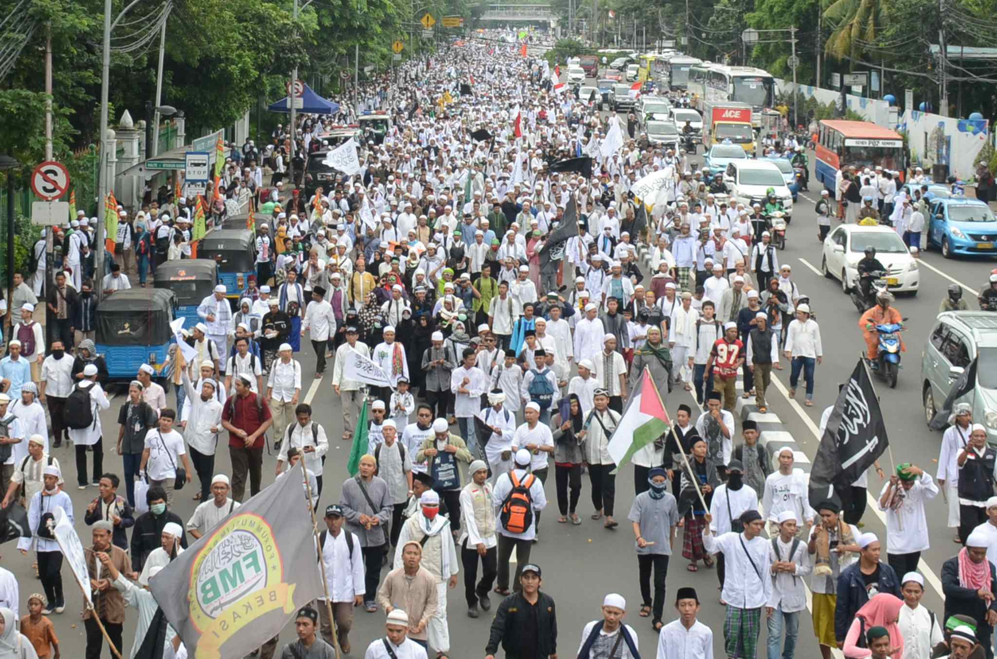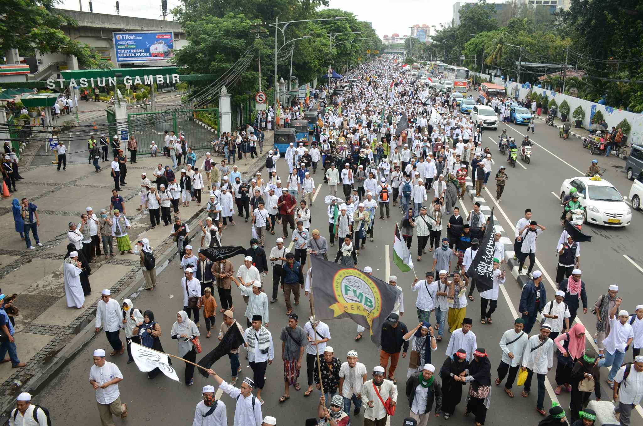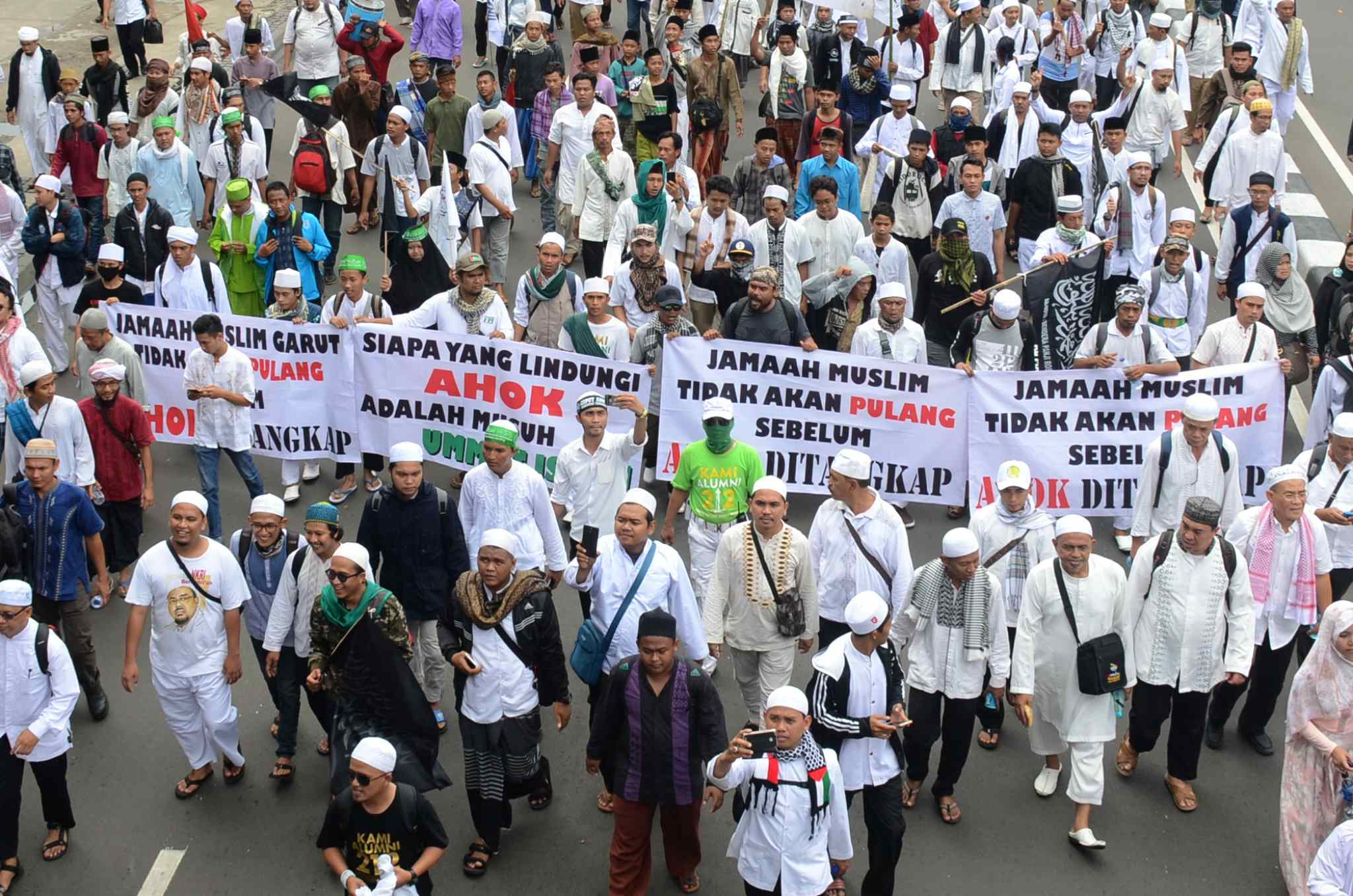 Umat muslim yang tergabung dalam Forum Umat Islam (FUI) melakukan long march menuju Istana di Jalan Medan Merdeka Timur, Jakarta, Jumat (31/3). Aksi ini menuntut kepada presiden Jokowi untuk mecabut jabatan Basuki Tjahaja Purnama atau Ahok dari posisinya sebagai Gubernur DKI Jakarta. AKTUAL/Tino Oktaviano