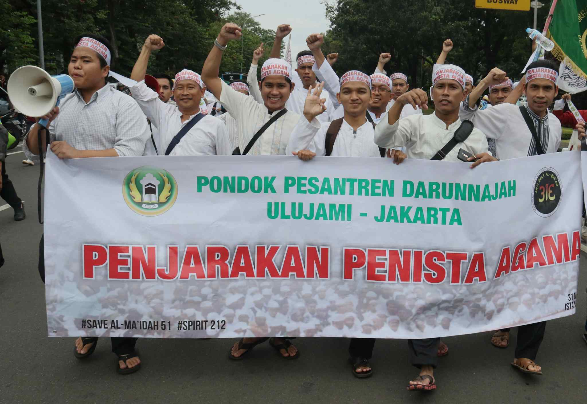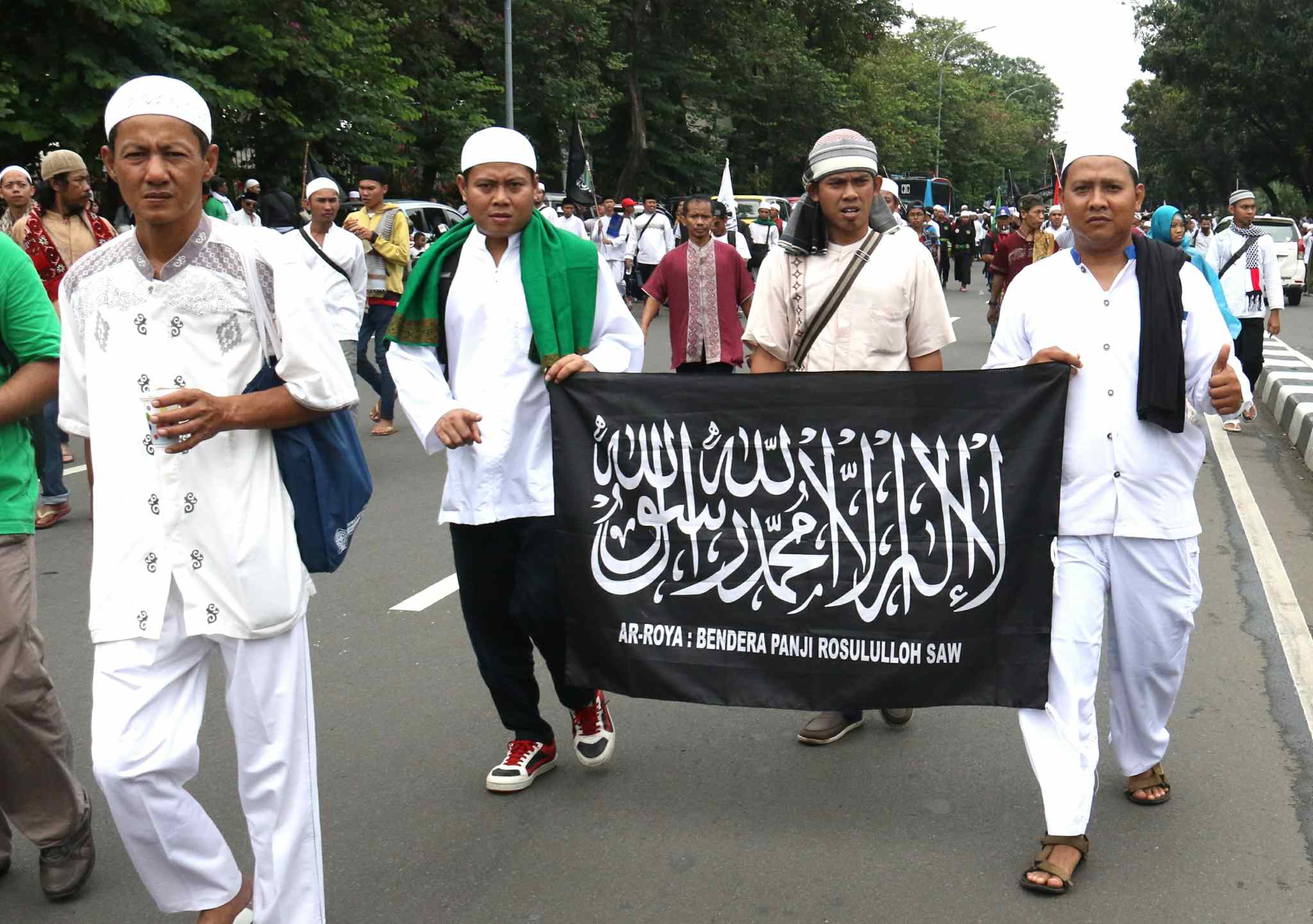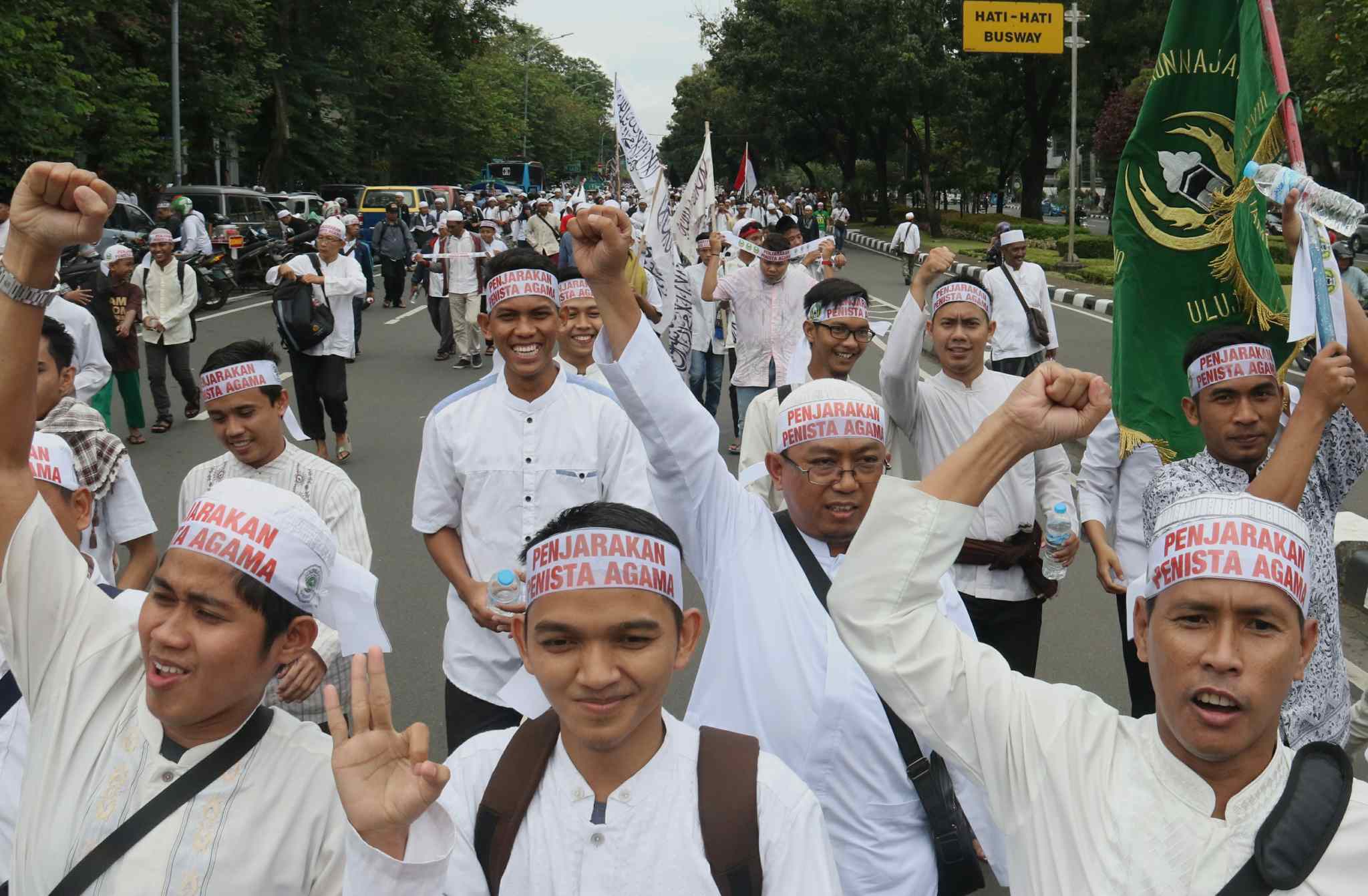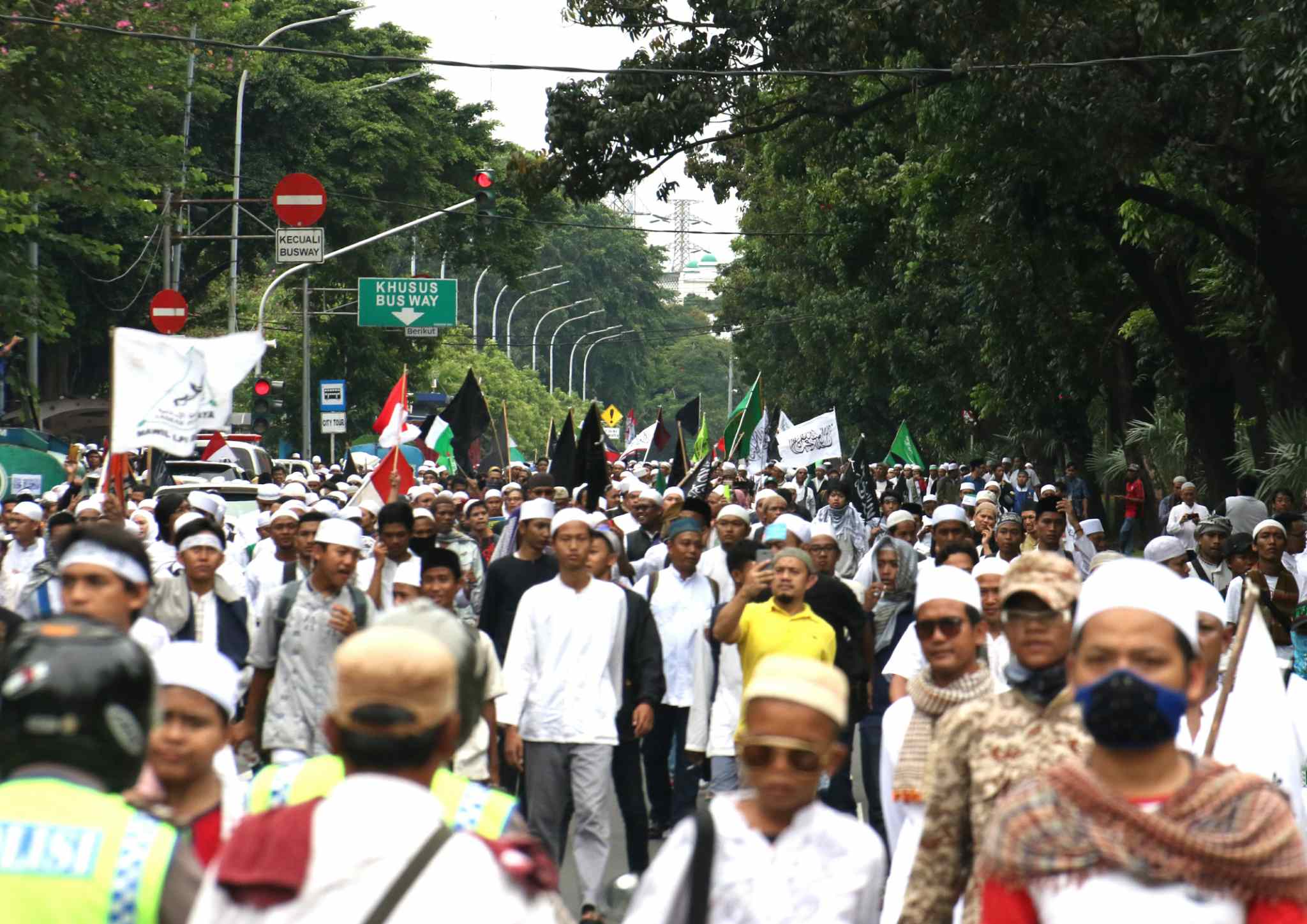 Ribuan umat Islam yang tergabung dalam Forum Umat Islam (FUI) melakukan aksi longmarch menuju patung Arjuna, Jakarta, Jumat (31/3/2017). Dalam aksi 313 ini ribuan umat mendesak Jokowi untuk segera mencopot dan menahan Gubernur penista agama Basuki Tjahja Purnama (Ahok). AKTUAL/Munzir