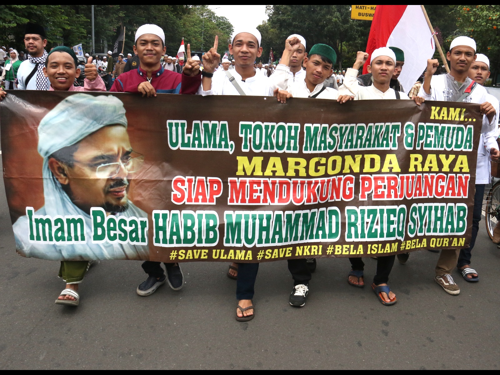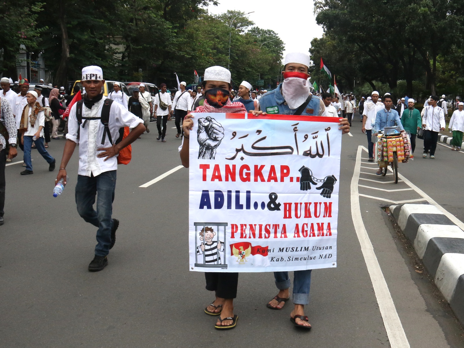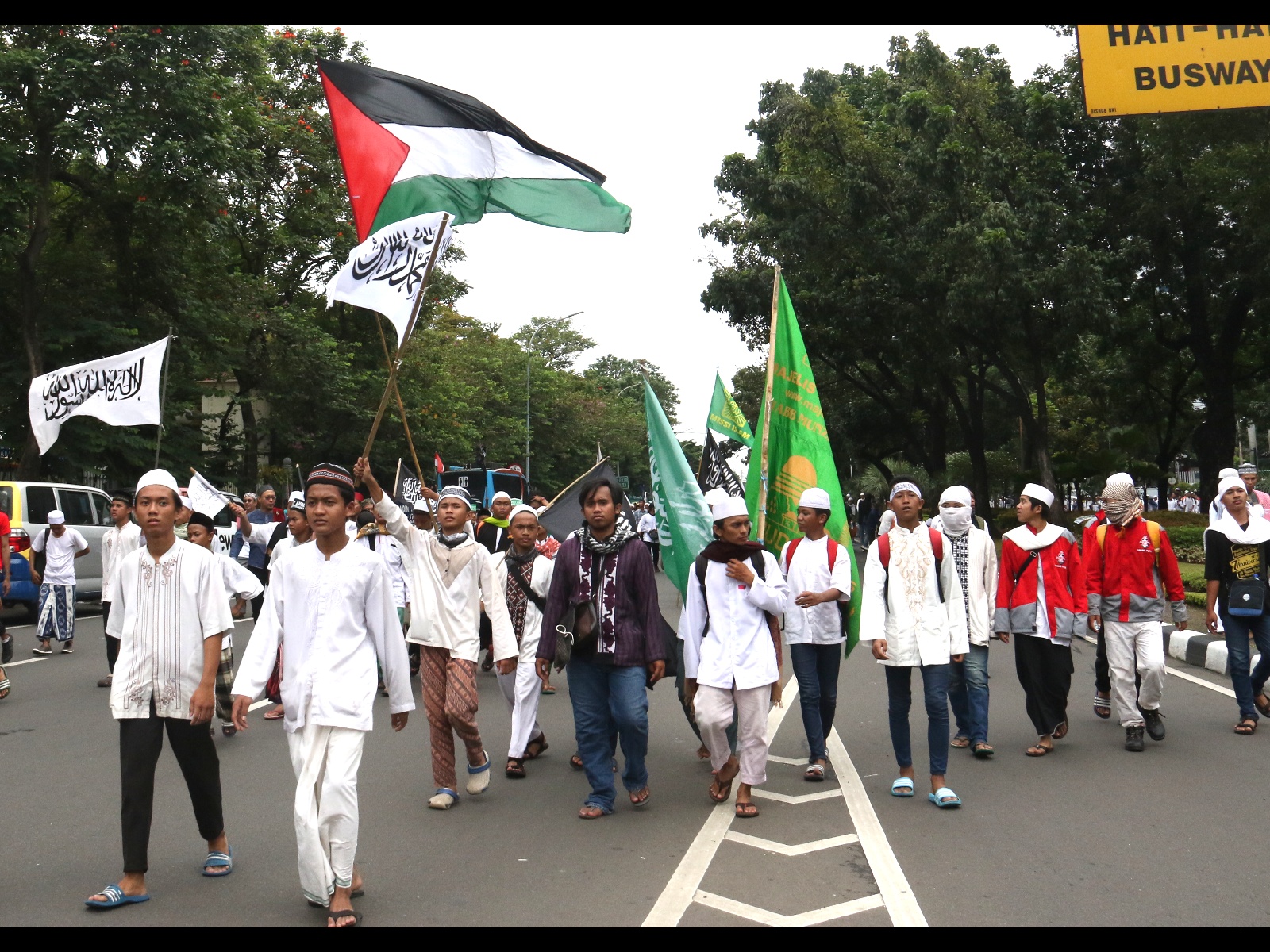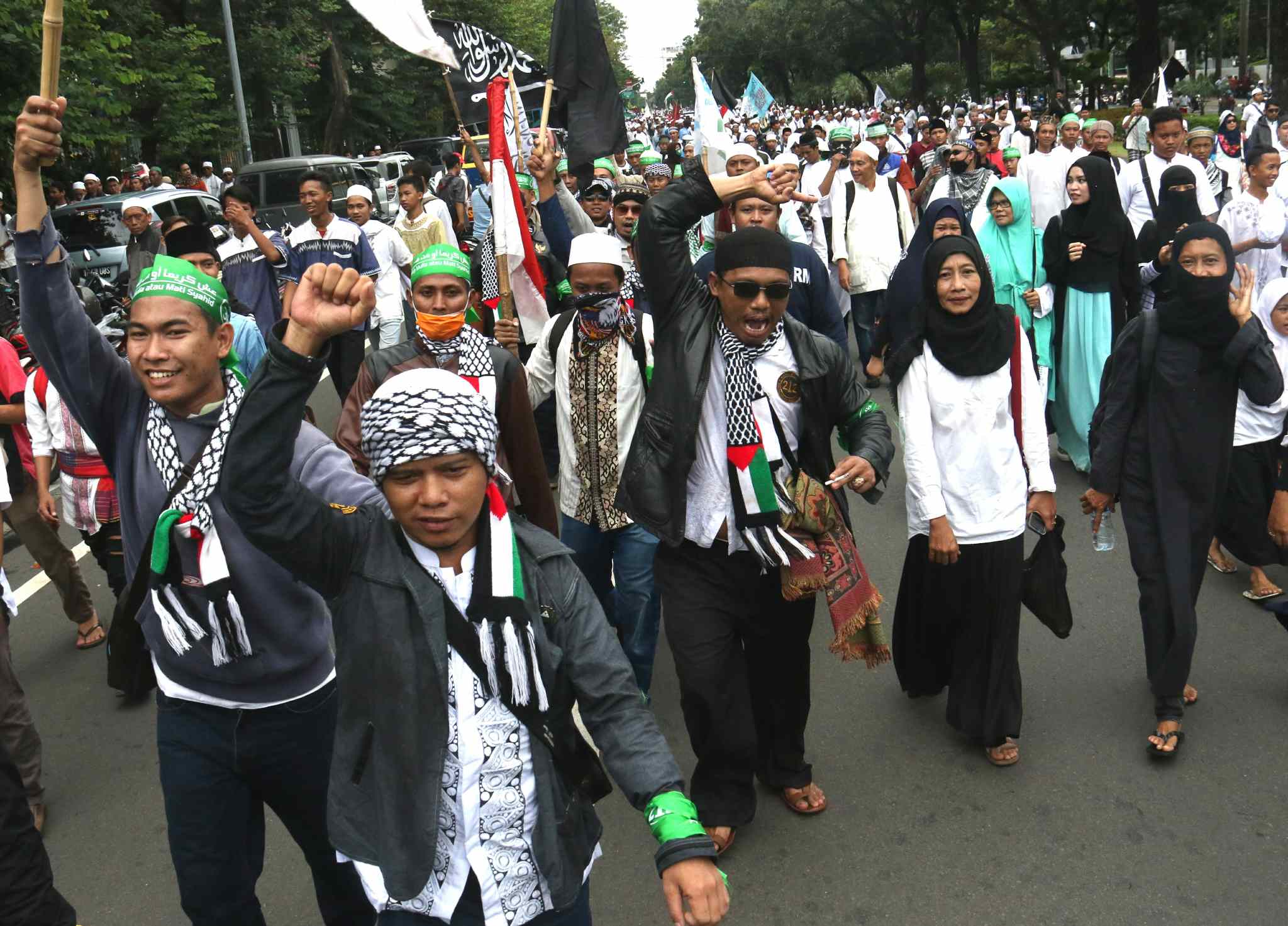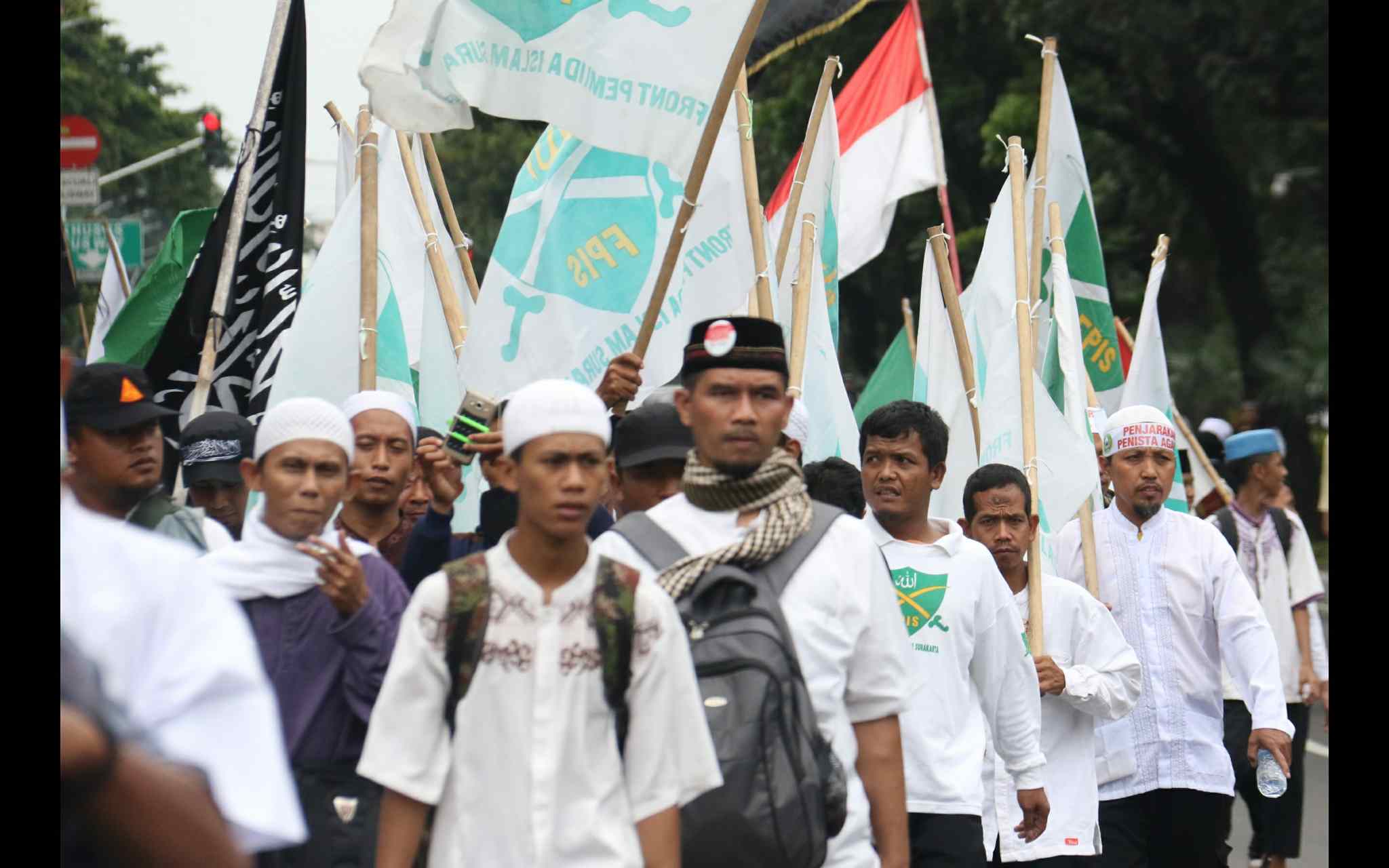 Ribuan umat Islam yang tergabung dalam Forum Umat Islam (FUI) melakukan aksi longmarch menuju patung Arjuna, Jakarta, Jumat (31/3/2017). Dalam aksi 313 ini ribuan umat mendesak Jokowi untuk segera mencopot dan menahan Gubernur penista agama Basuki Tjahja Purnama (Ahok). AKTUAL/Munzir