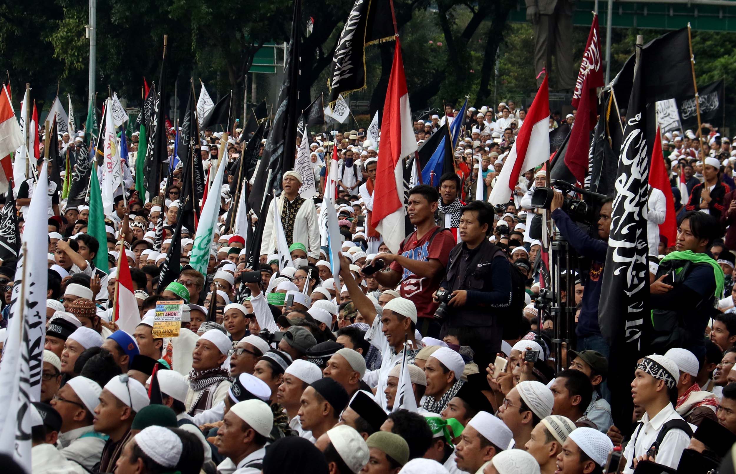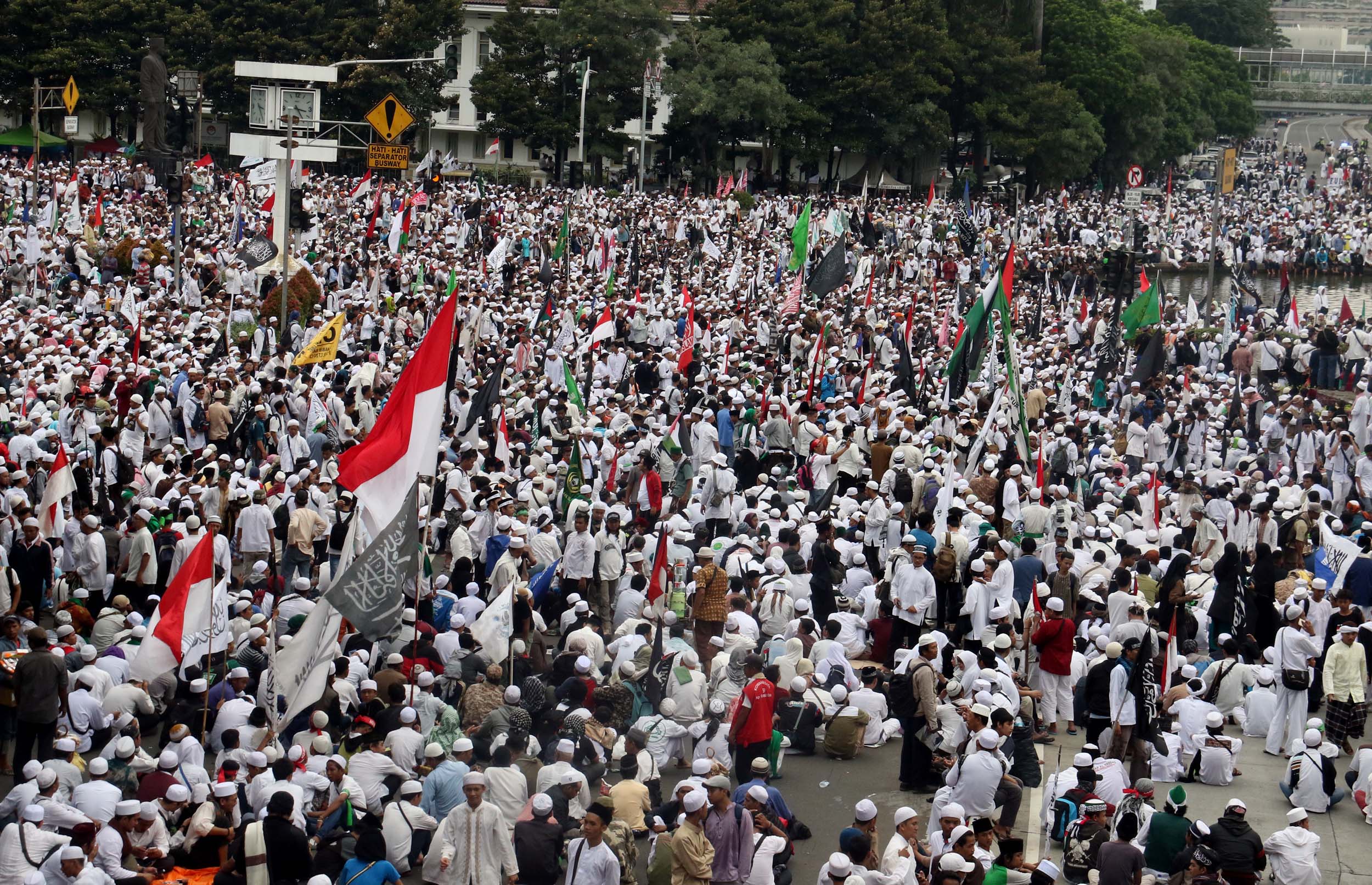 Ratusan ribu umat Islam berkumpul dalam Aksi 313 di Bundaran Patung Kuda, Jakarta, Jumat (31/3/2017). Mereka mendesak pemerintah mencopot Basuki T. Purnama dari jabatan gubernur DKI Jakarta karena sudah menjadi terdakwa kasus penistaan agama.
