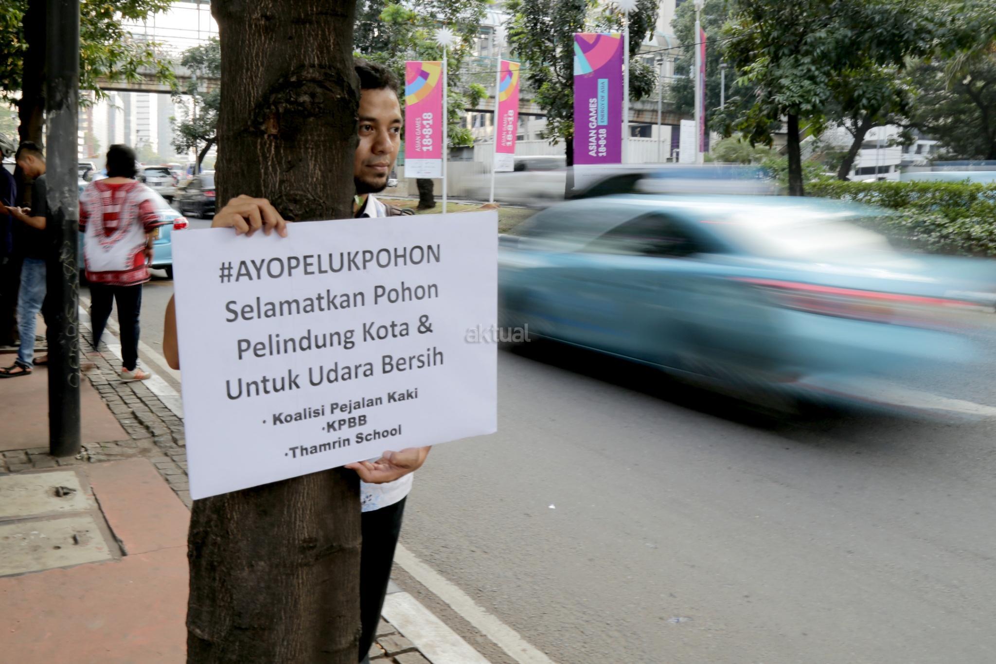 Beberapa aktivis yang tergabung dalam Koalisi Pejalan Kaki melakukan aksi #ayopelukpohon di kawasan Jalan Sudirman, Jakarta Pusat, Jumat (22/9). Aksi tersebut untuk mengajak masyarakat menyelamatkan pohon-pohon di kawasan jalan Jenderal Sudirman serta menambah jumlah pohon di seluruh jalur trotar di Jakarta agar memberi kenyamanan bagi pejalan kaki dan mutu udara yang lebih baik. AKTUAL/Tino Oktaviano