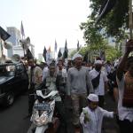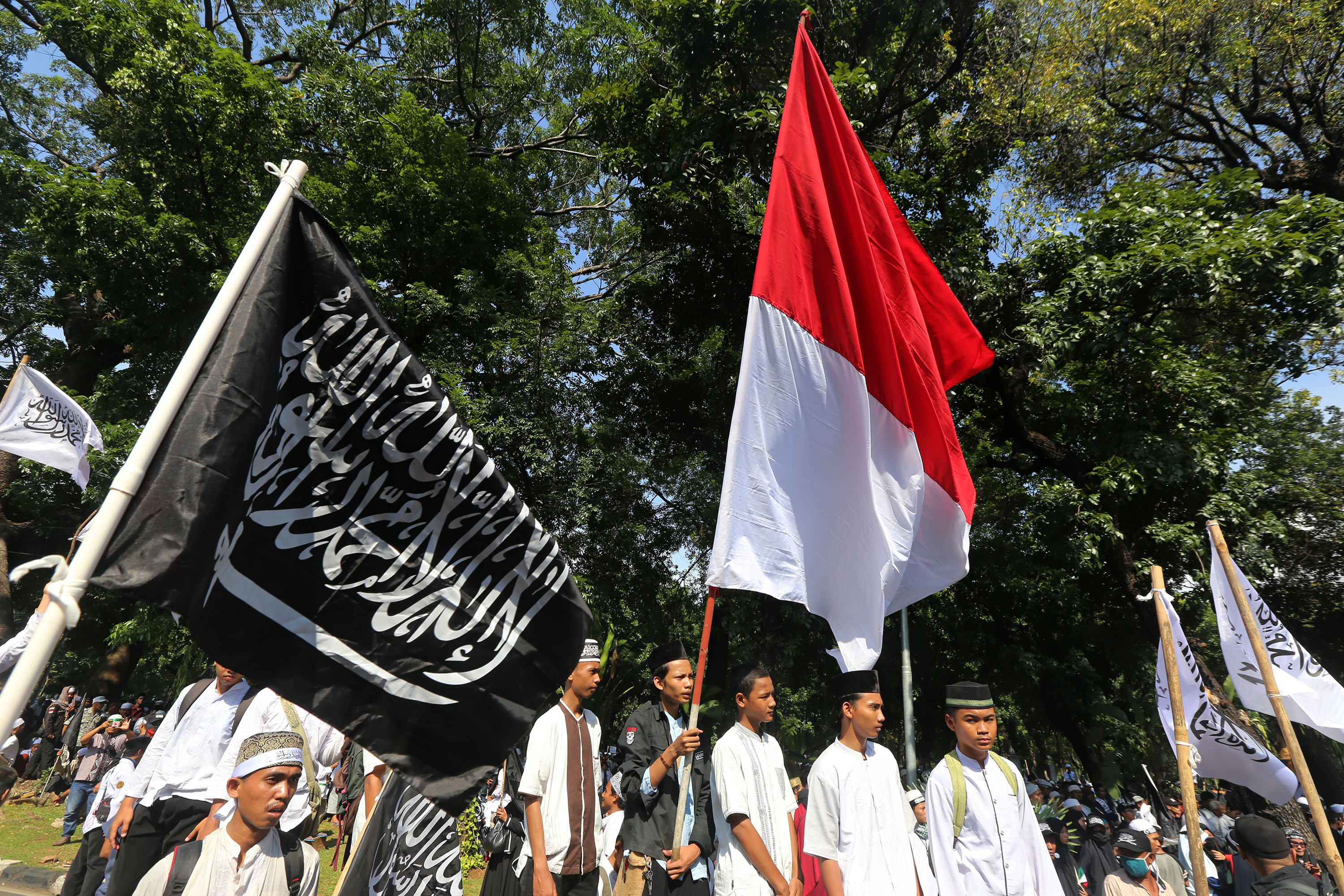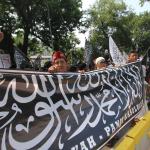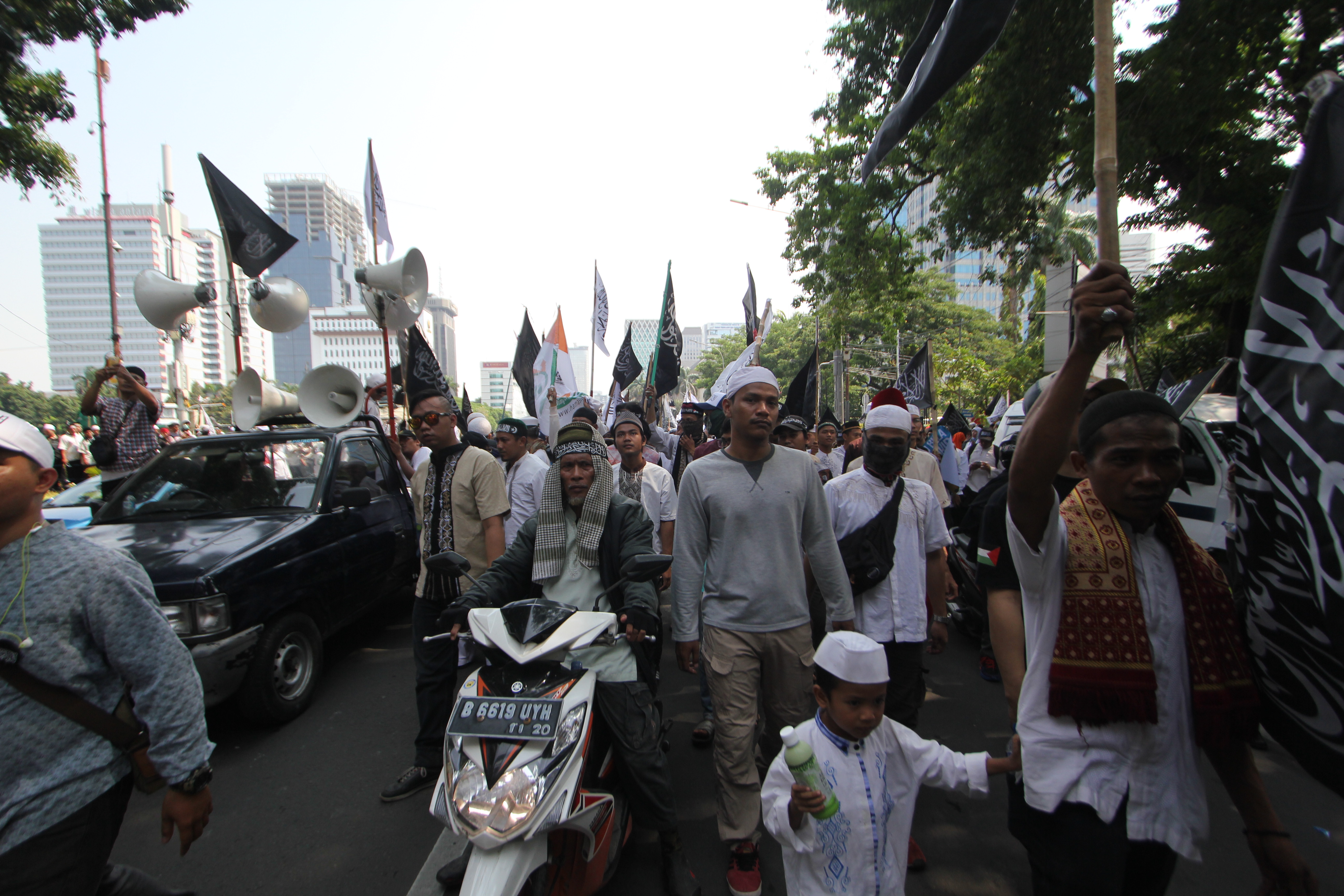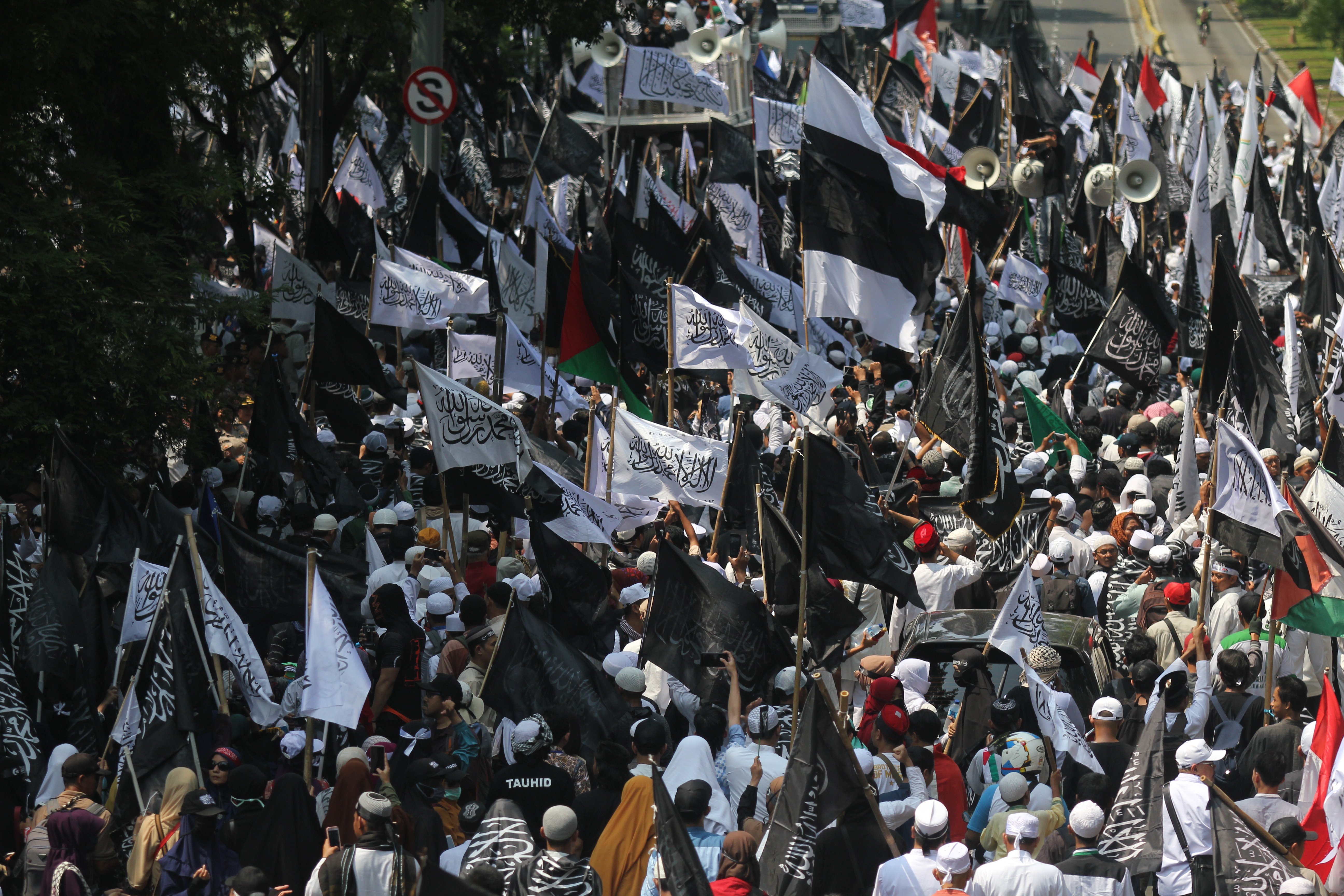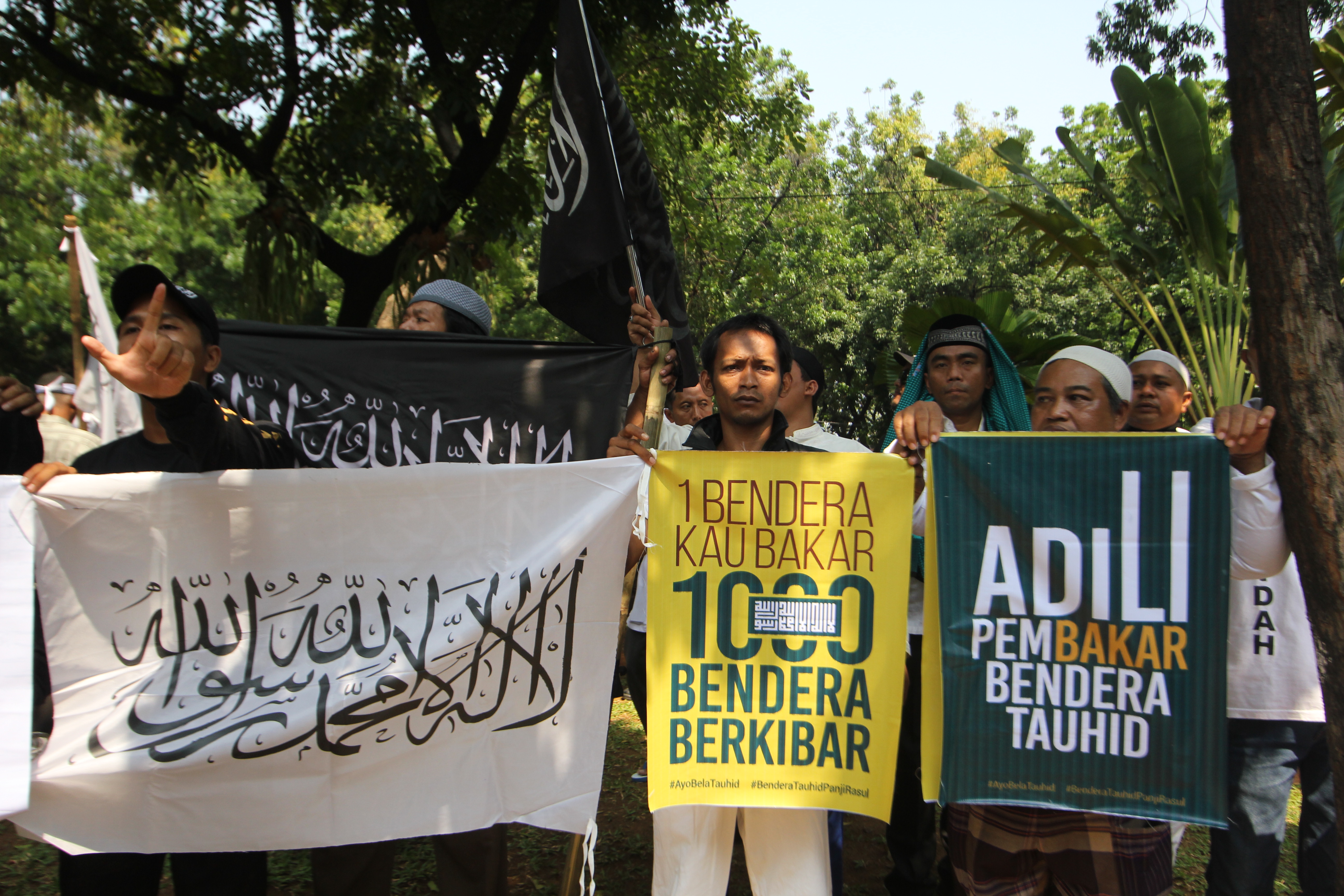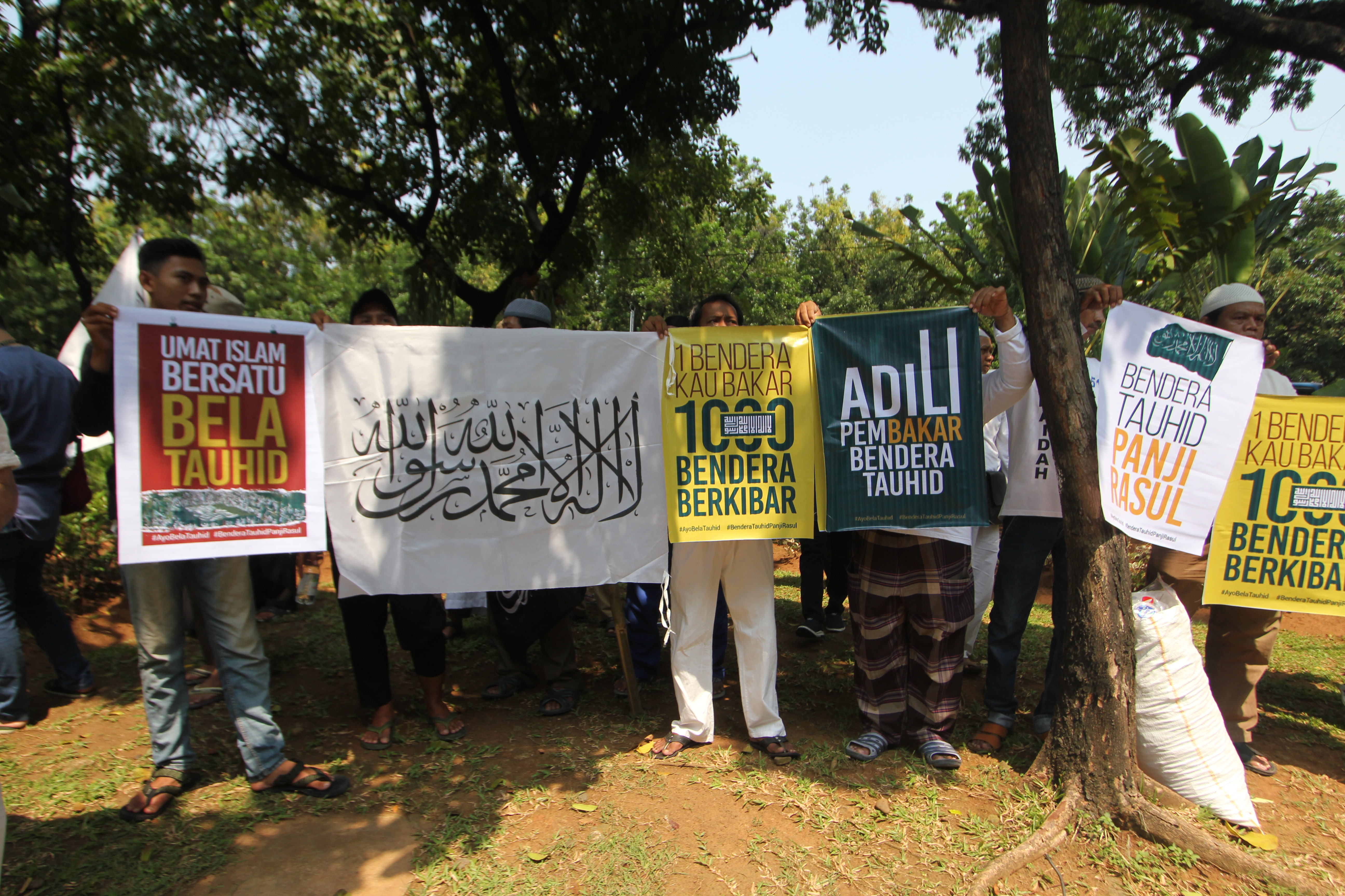 Ribuan orang melakukan Aksi Bela Tauhid didepan Kementerian Koordinator Politik, Hukum, dan Keamanan (Kemenko Polhukam) di Jakarta, Jumat (26/10/2018). Aksi ini bentuk dibakarnya bendera tauhid oleh anggota Banser saat peryaan hari santri nasional di Garut dan meminta meminta Ketua GP Ansor Yaqut Cholil Qaumas meminta maaf kepada umat Islam. Sebab, menurutnya, hingga saat ini Yaqut dinilai belum minta maaf. AKTUAL/Str