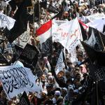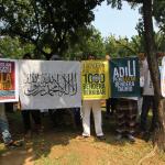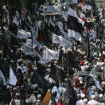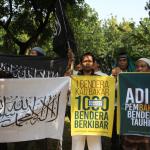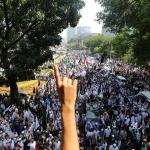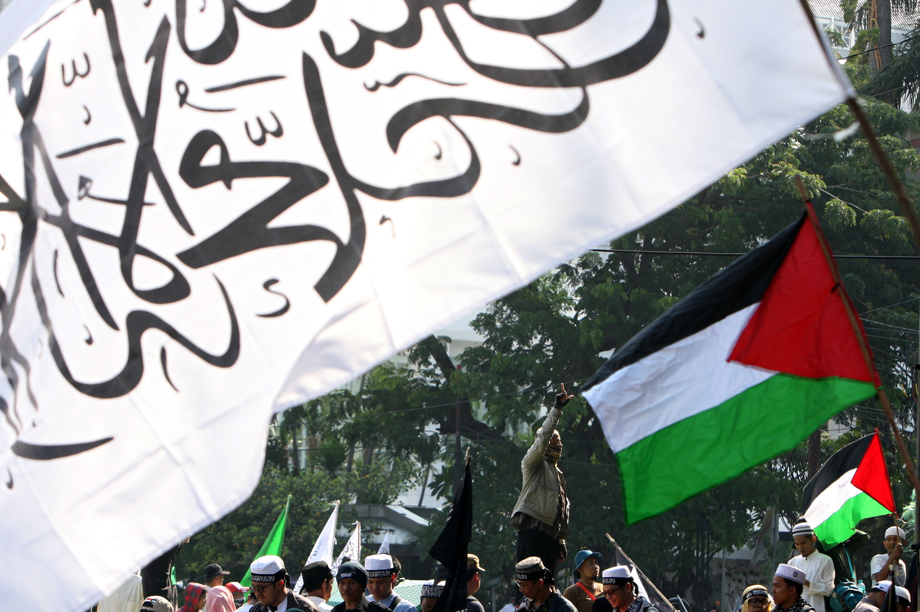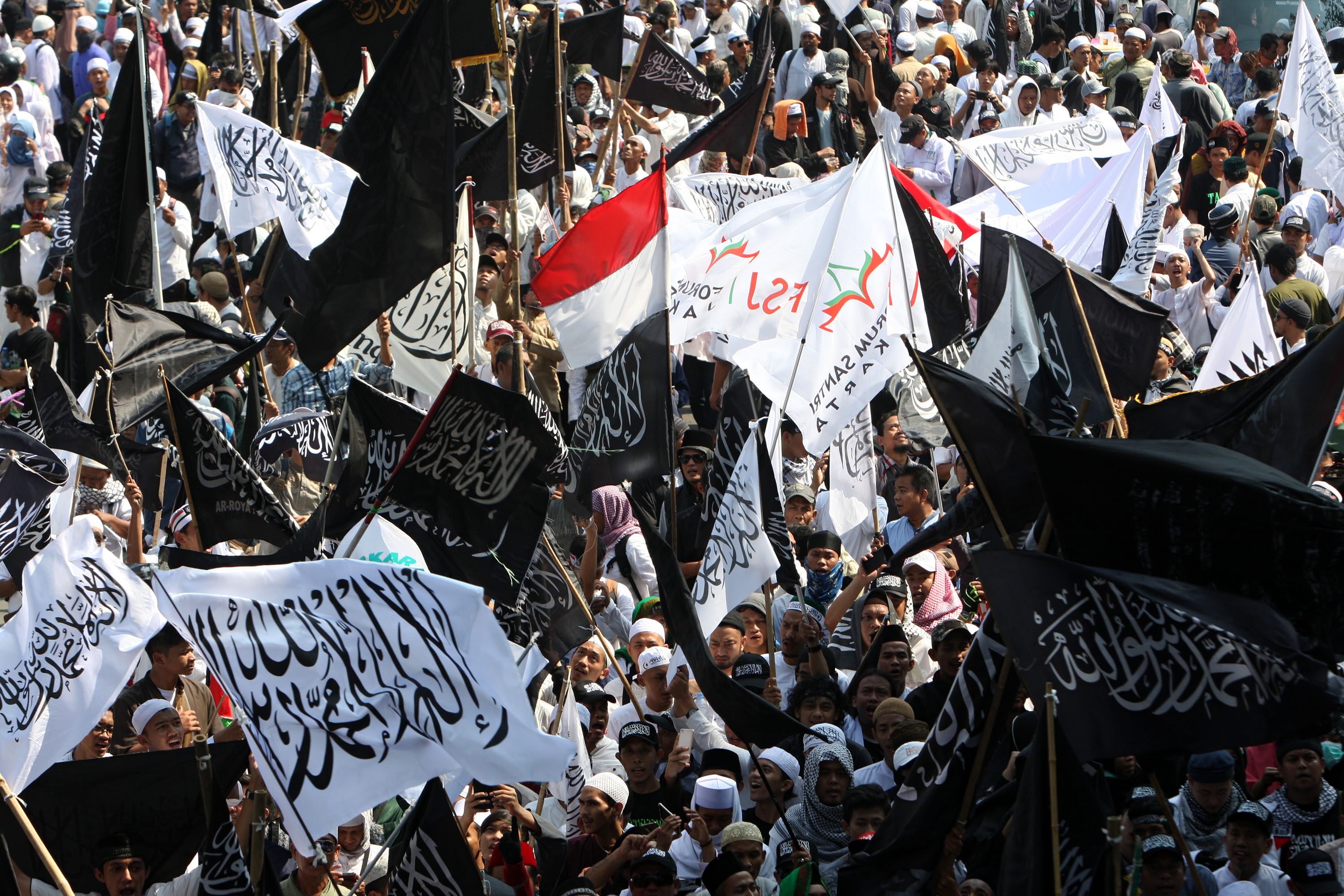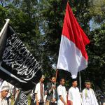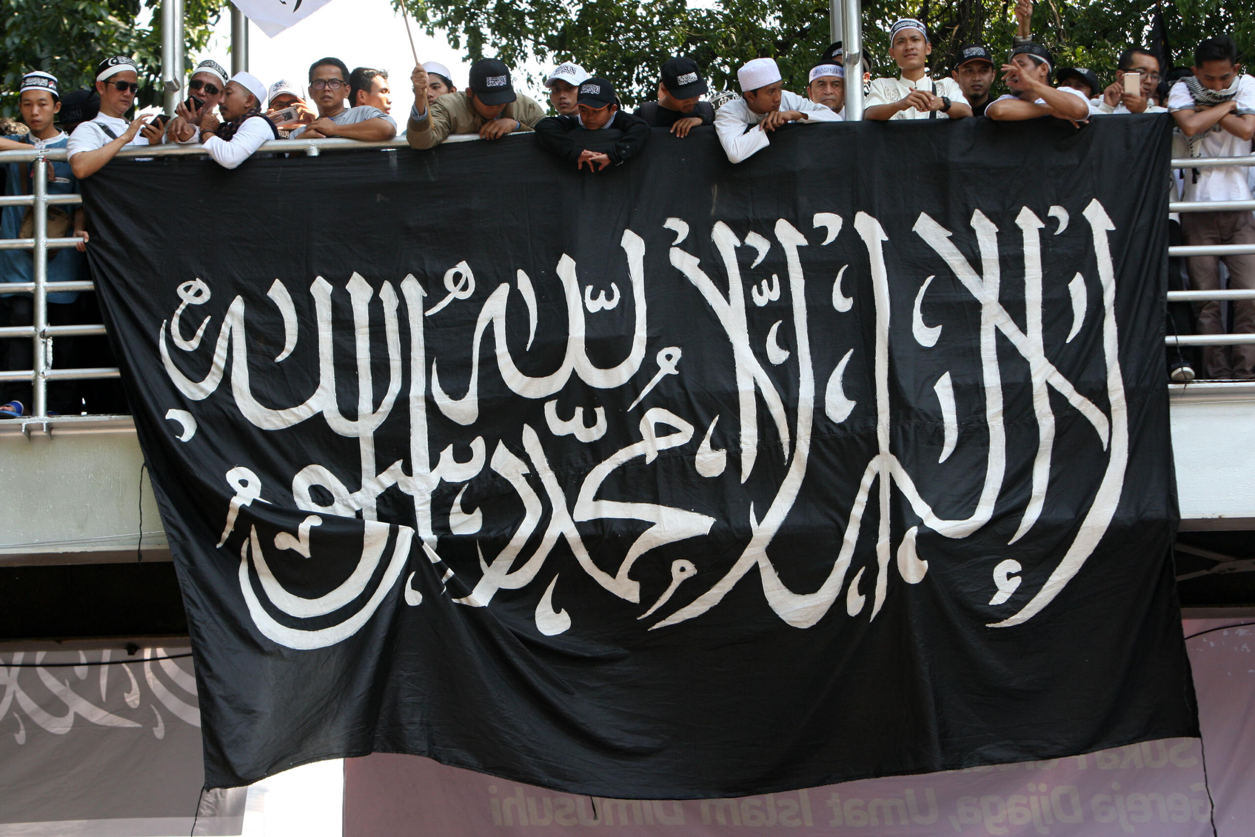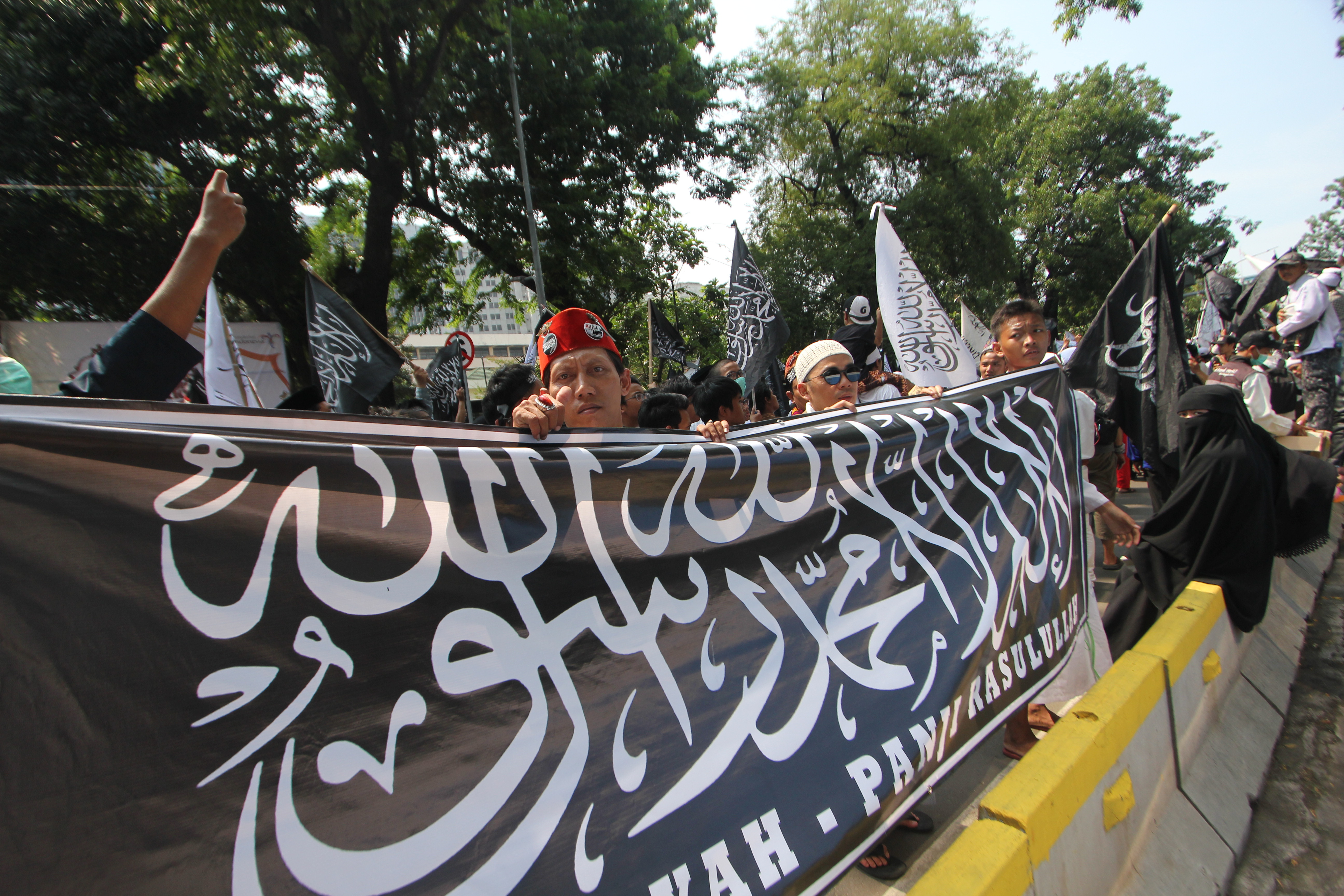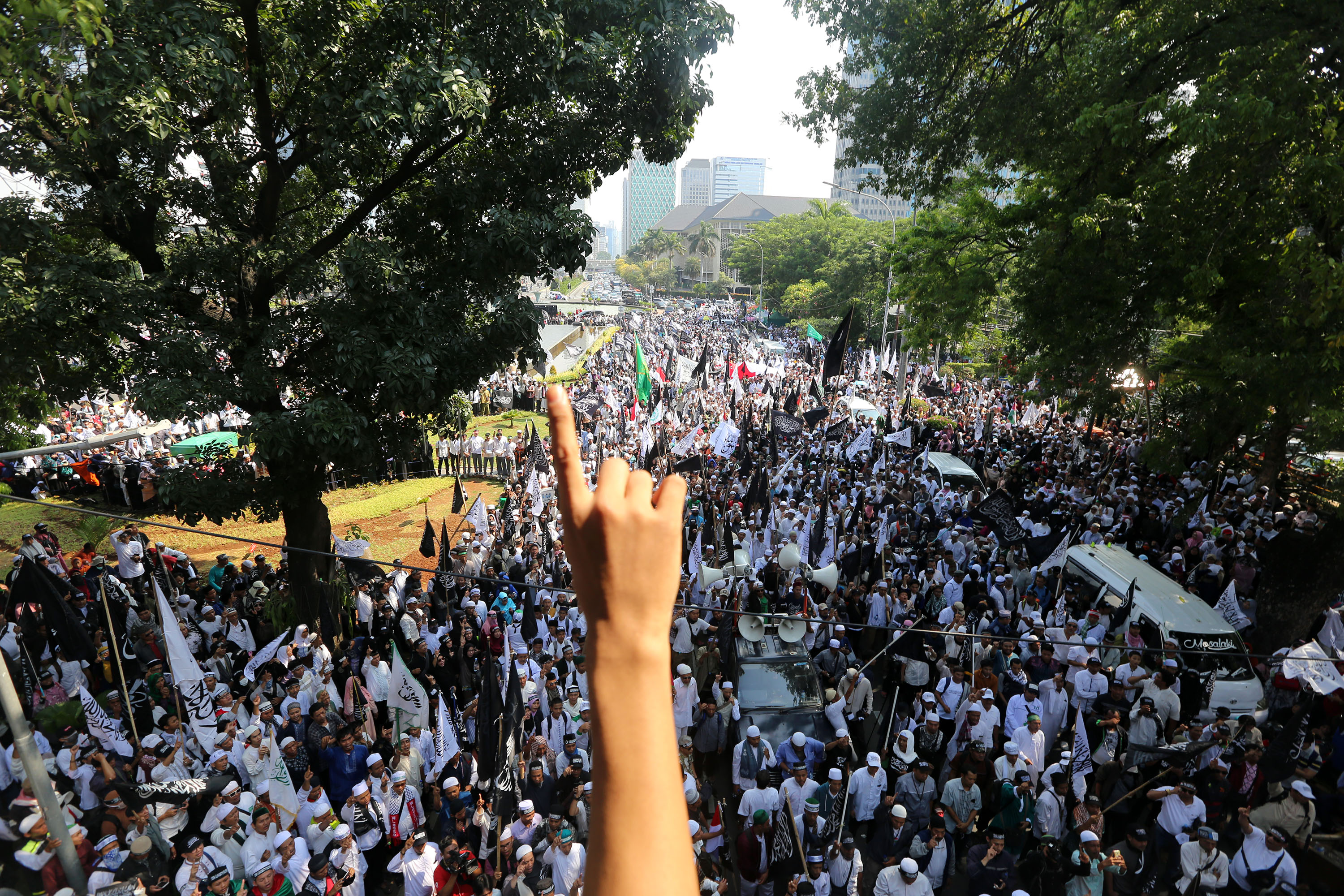 Ribuan orang melakukan Aksi Bela Tauhid didepan Kementerian Koordinator Politik, Hukum, dan Keamanan (Kemenko Polhukam) di Jakarta, Jumat (26/10/2018). Aksi ini bentuk dibakarnya bendera tauhid oleh anggota Banser saat peryaan hari santri nasional di Garut dan meminta meminta Ketua GP Ansor Yaqut Cholil Qaumas meminta maaf kepada umat Islam. Sebab, menurutnya, hingga saat ini Yaqut dinilai belum minta maaf. AKTUAL/Str