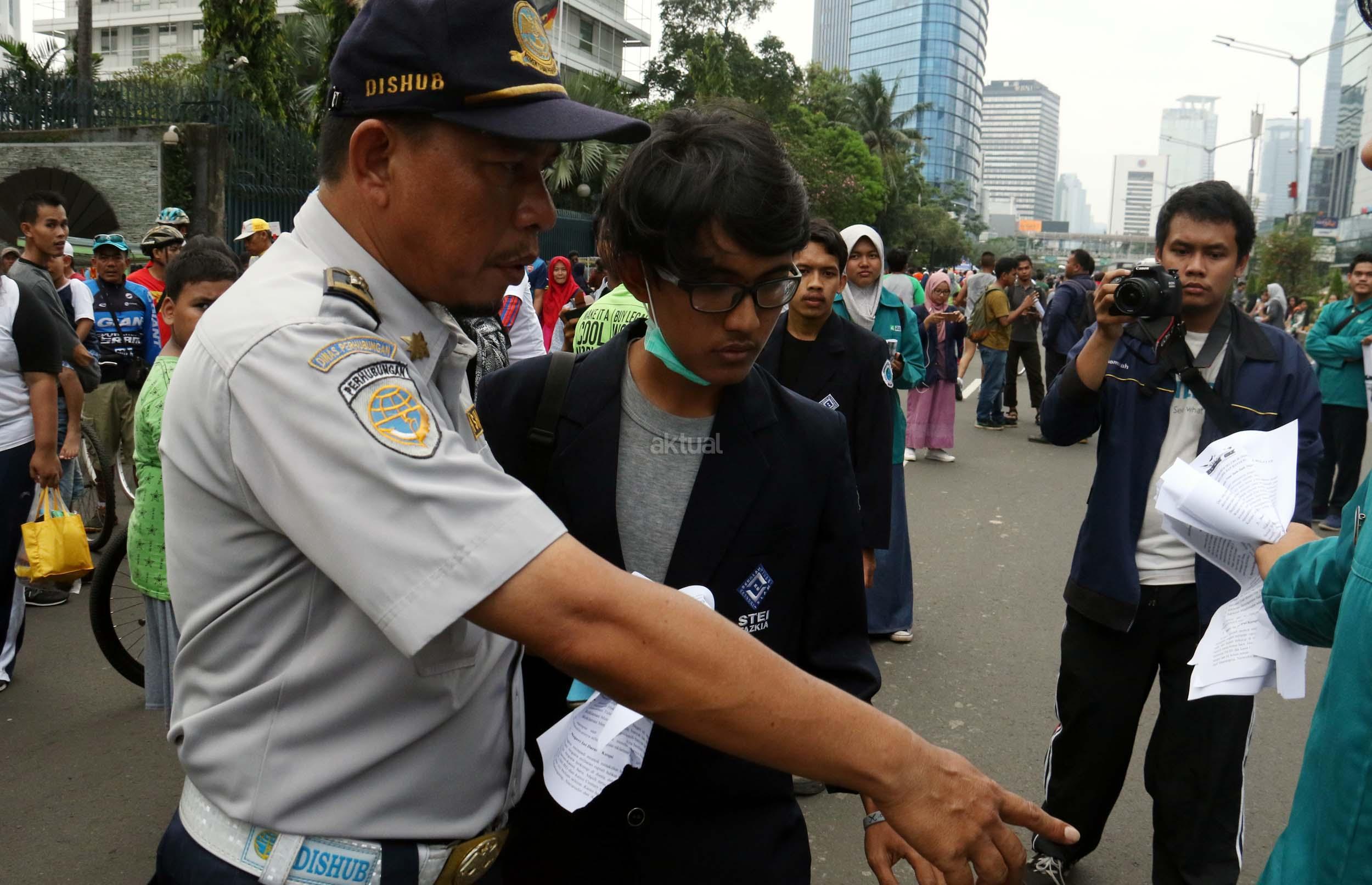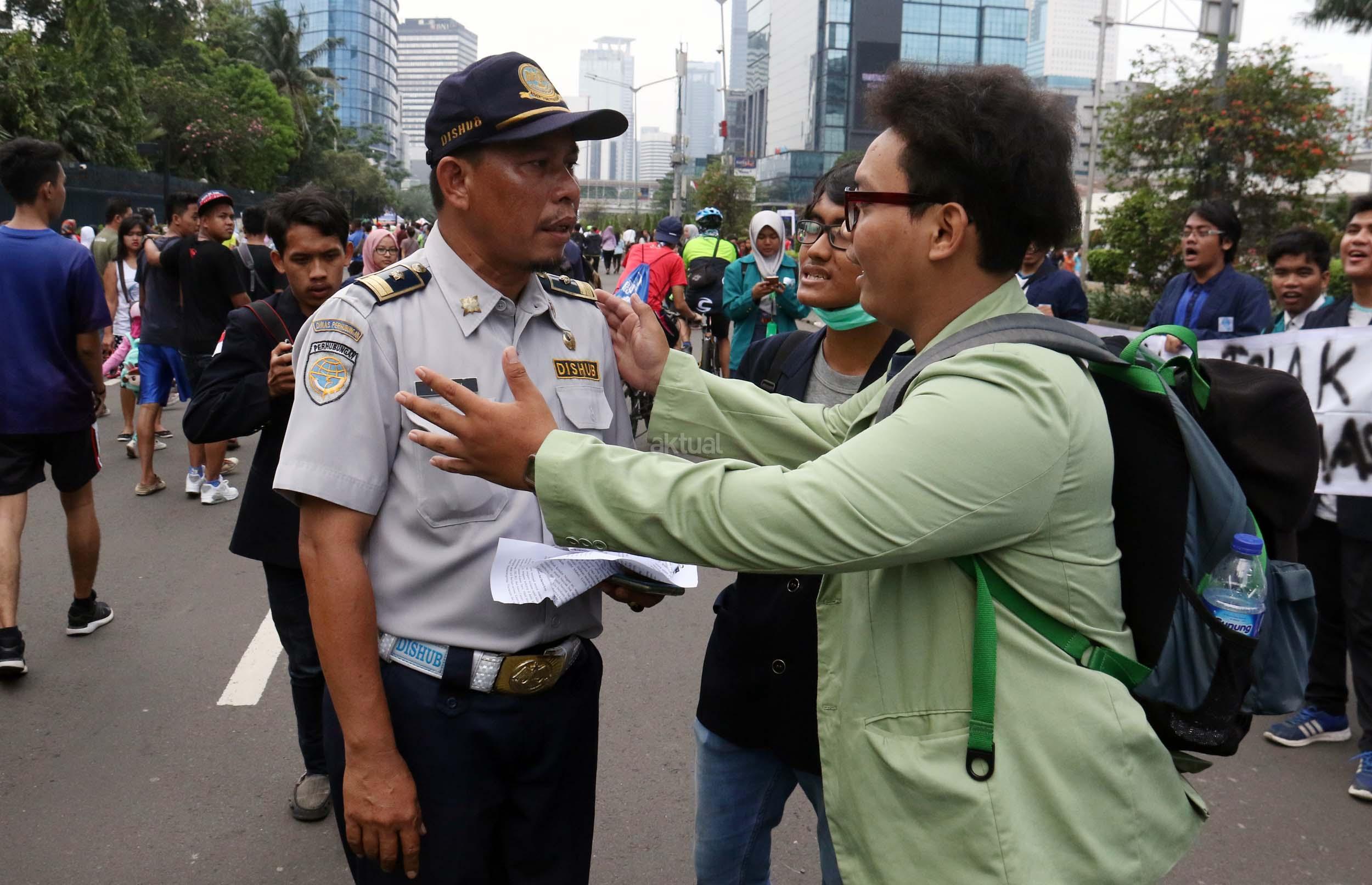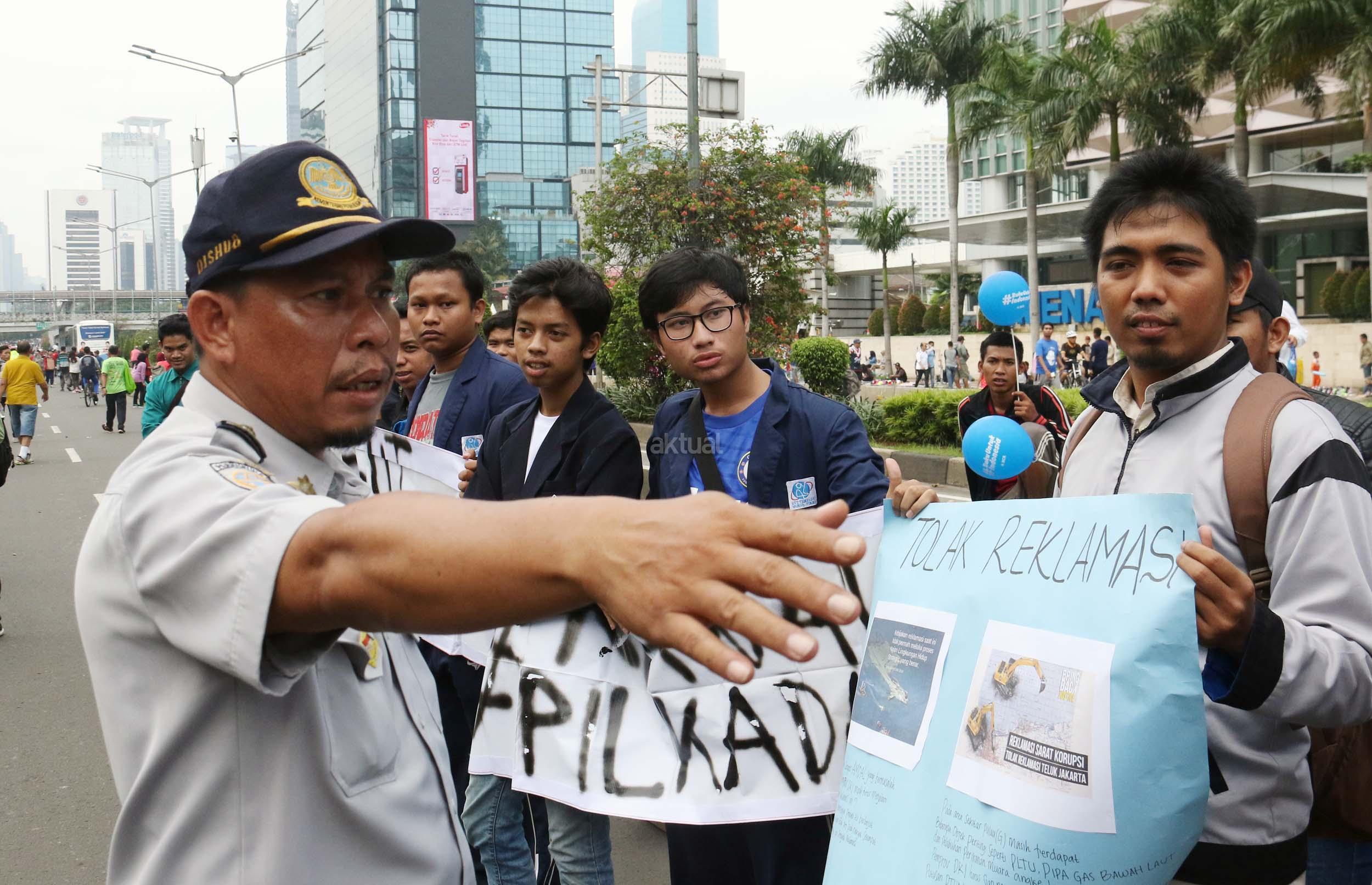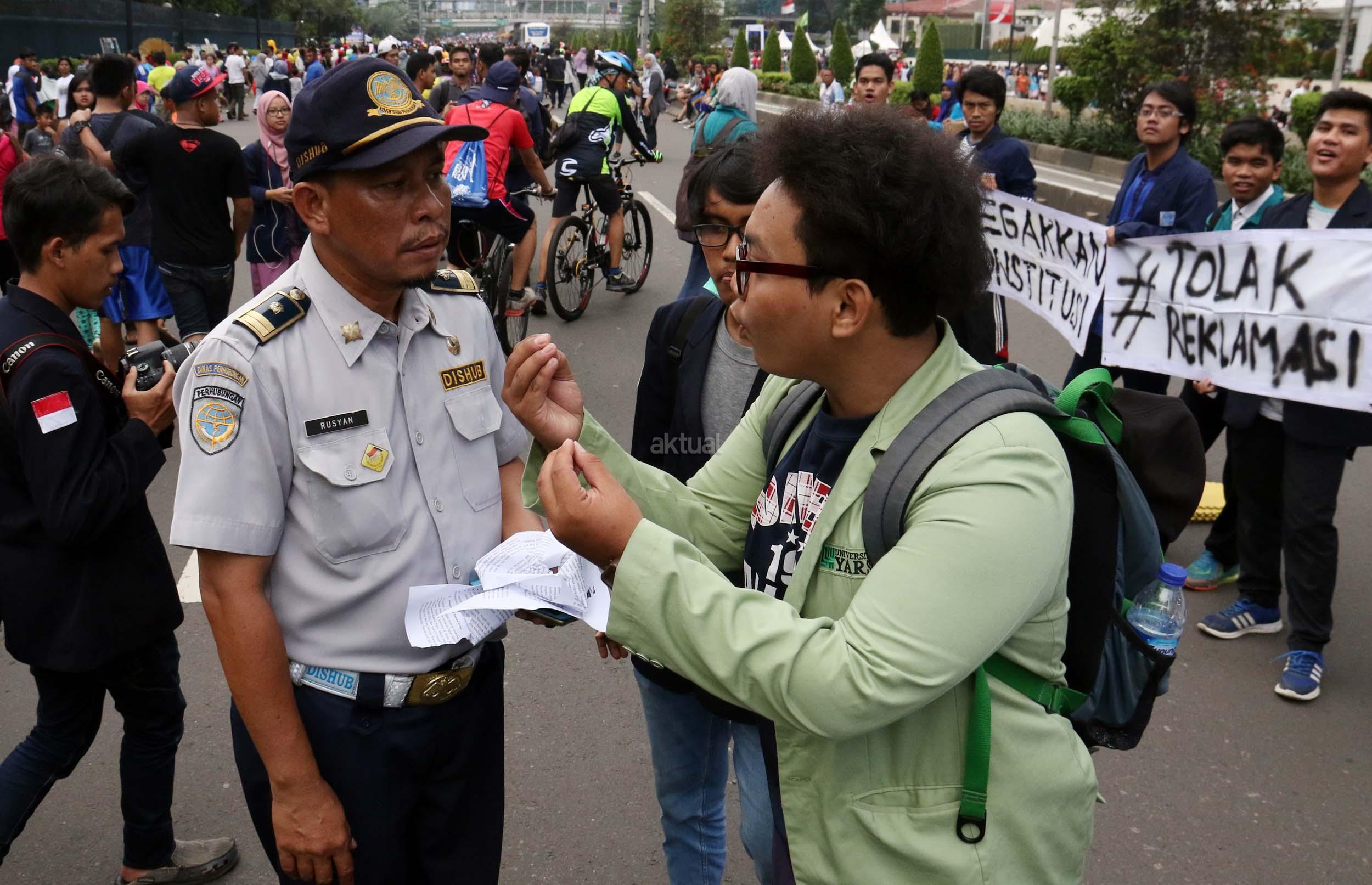 Petugas Dishub DKI Jakarta menghentikan aksi mahasiswa dan merampas kertas rilis para mahasiwa yang sedang melakukan orasi menolak Reklamasi Teluk Jakarta, dikawasan CFD, Jakarta, Minggu (26/3/2017). Alasan diberhentikannya aksi tersebut karena mengganggu aktivitas Car Free Day (CFD) dan tidak ada surat izin aksi mahasiswa yang tergabung dalam Aliansi BEM Seluruh Indonesia. AKTUAL/Munzir