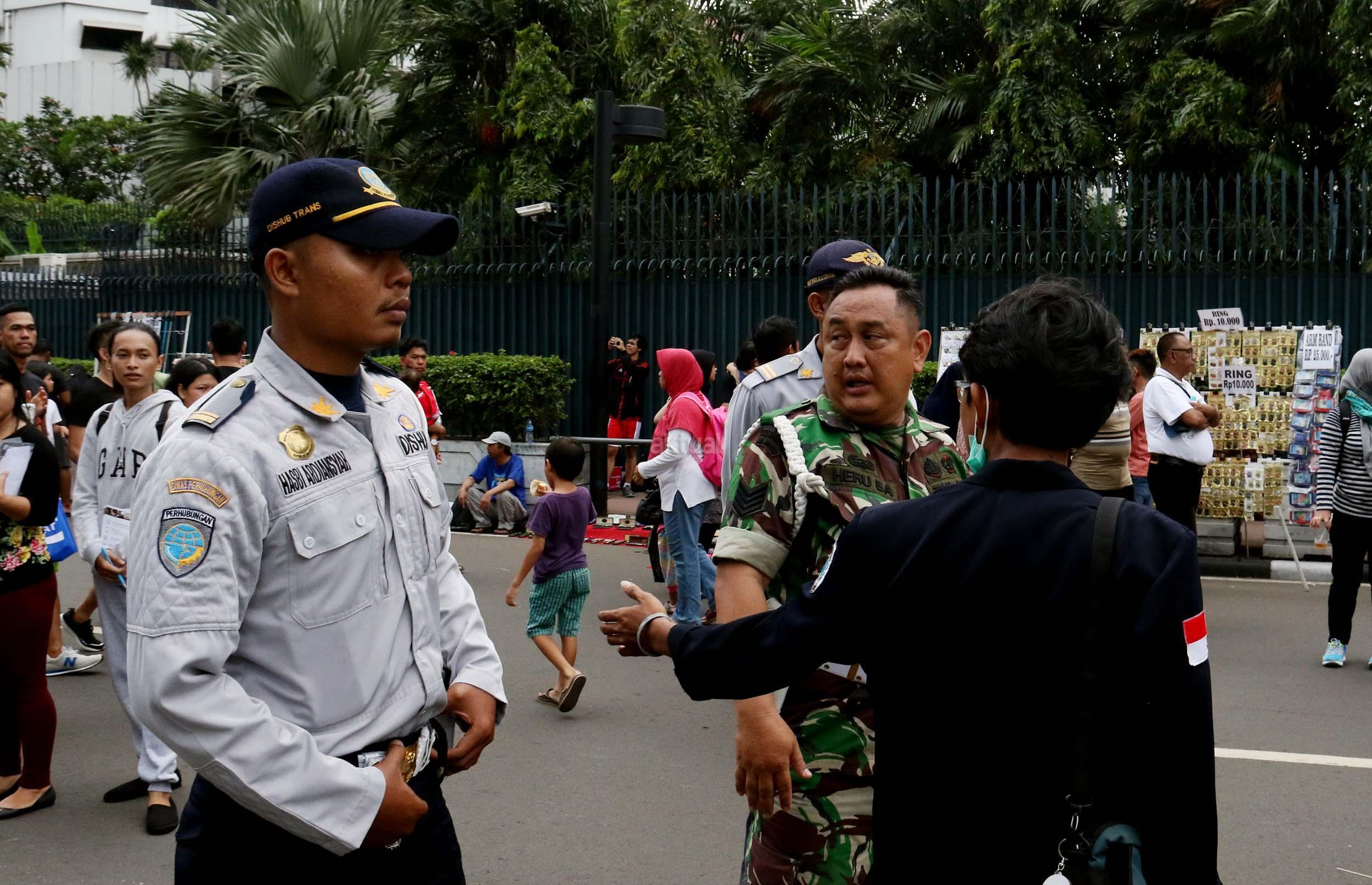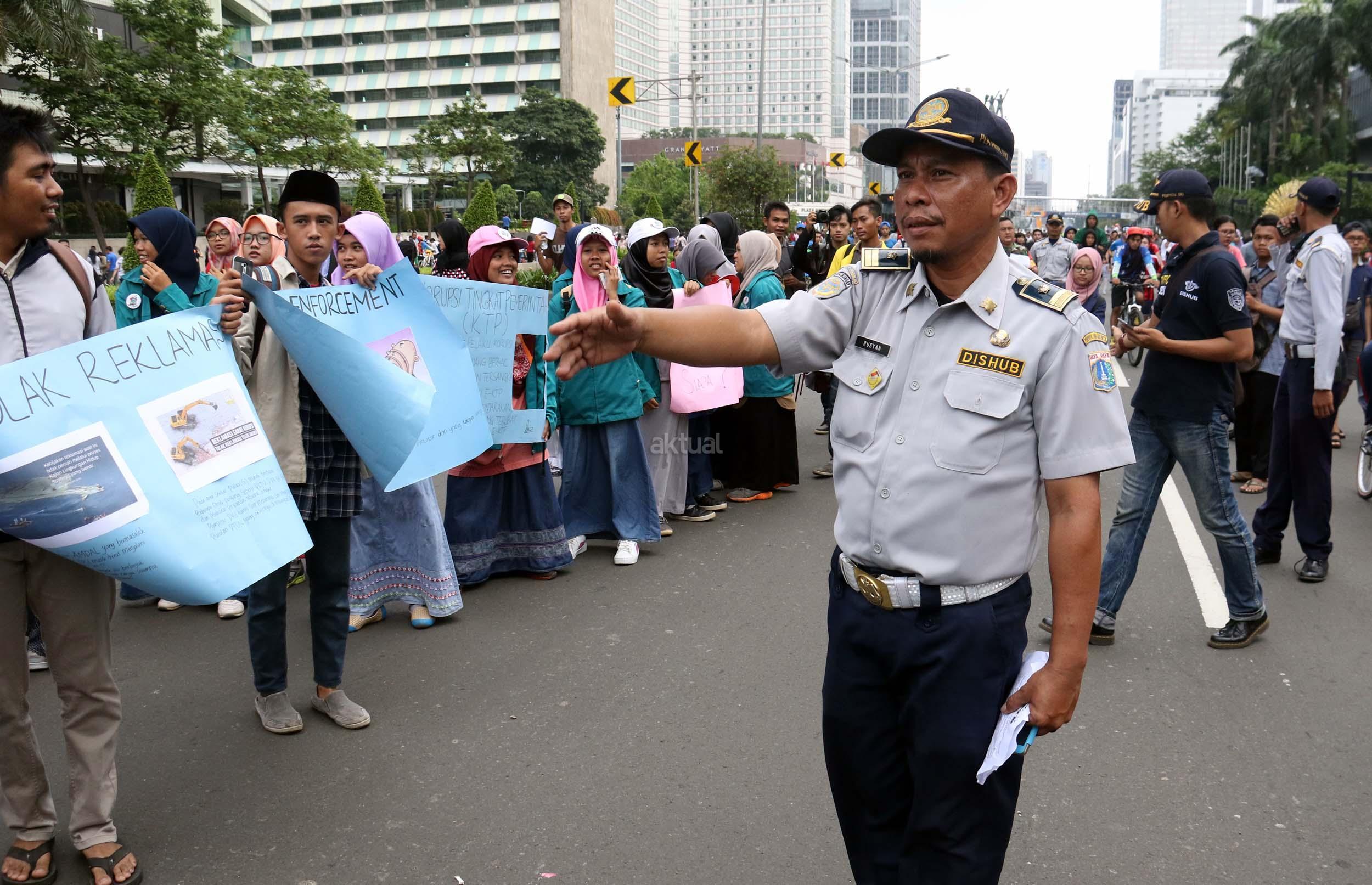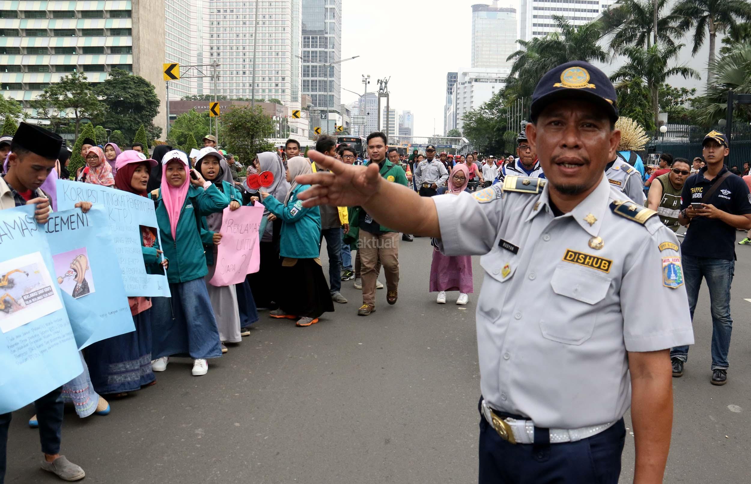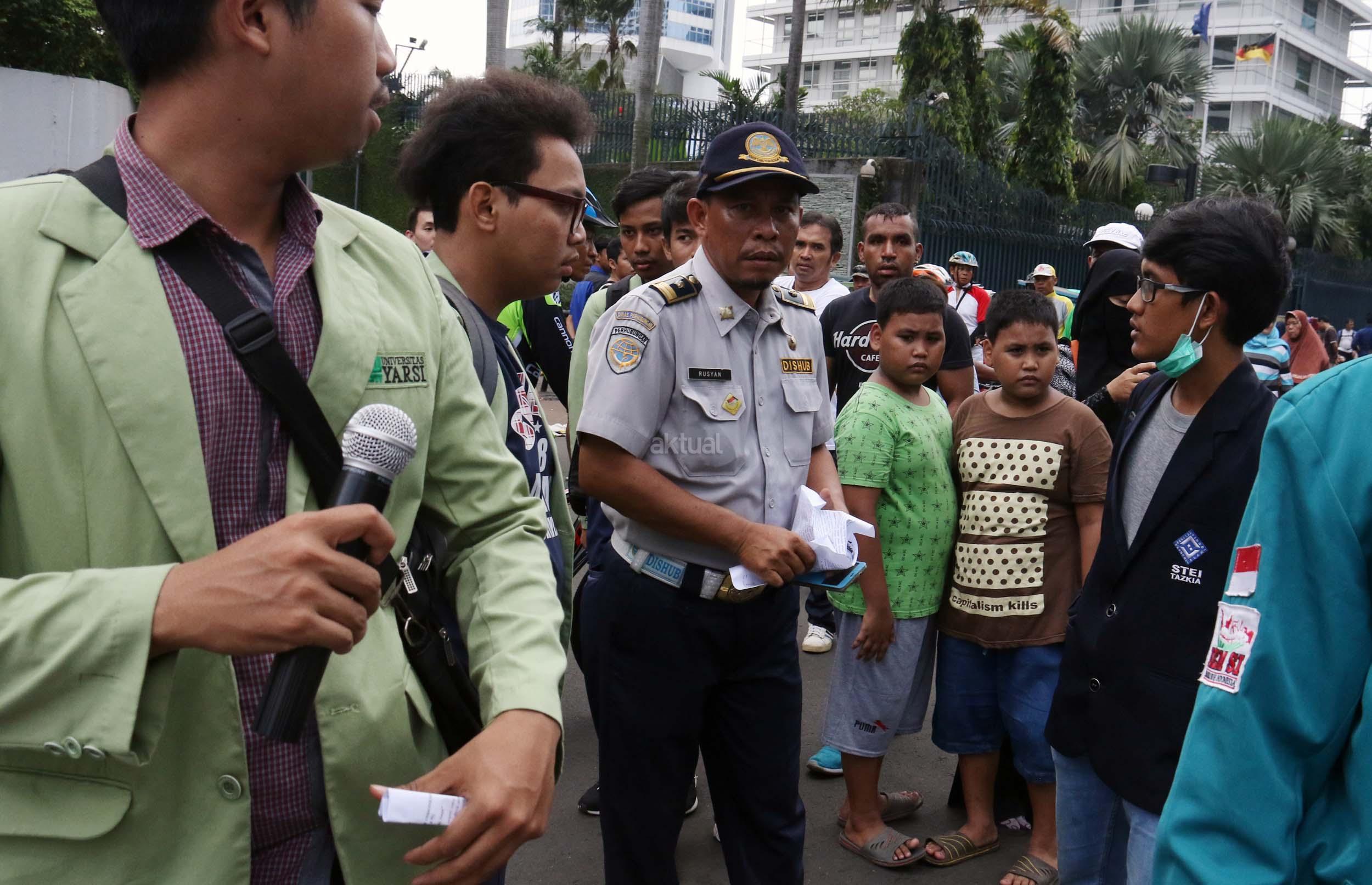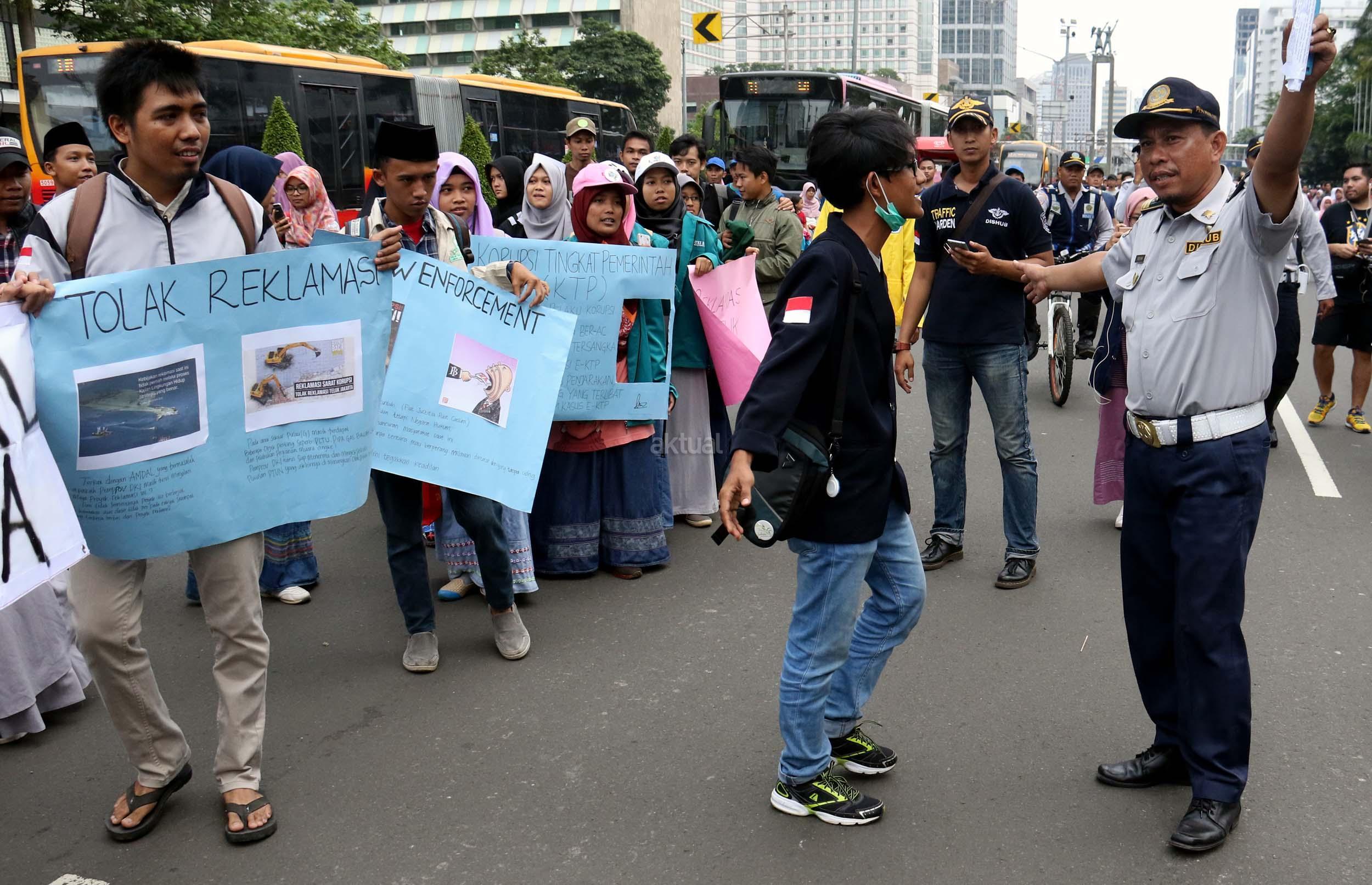 Petugas Dishub DKI Jakarta menghentikan aksi mahasiswa dan merampas kertas rilis para mahasiwa yang sedang melakukan orasi menolak Reklamasi Teluk Jakarta, dikawasan CFD, Jakarta, Minggu (26/3/2017). Alasan diberhentikannya aksi tersebut karena mengganggu aktivitas Car Free Day (CFD) dan tidak ada surat izin aksi mahasiswa yang tergabung dalam Aliansi BEM Seluruh Indonesia. AKTUAL/Munzir