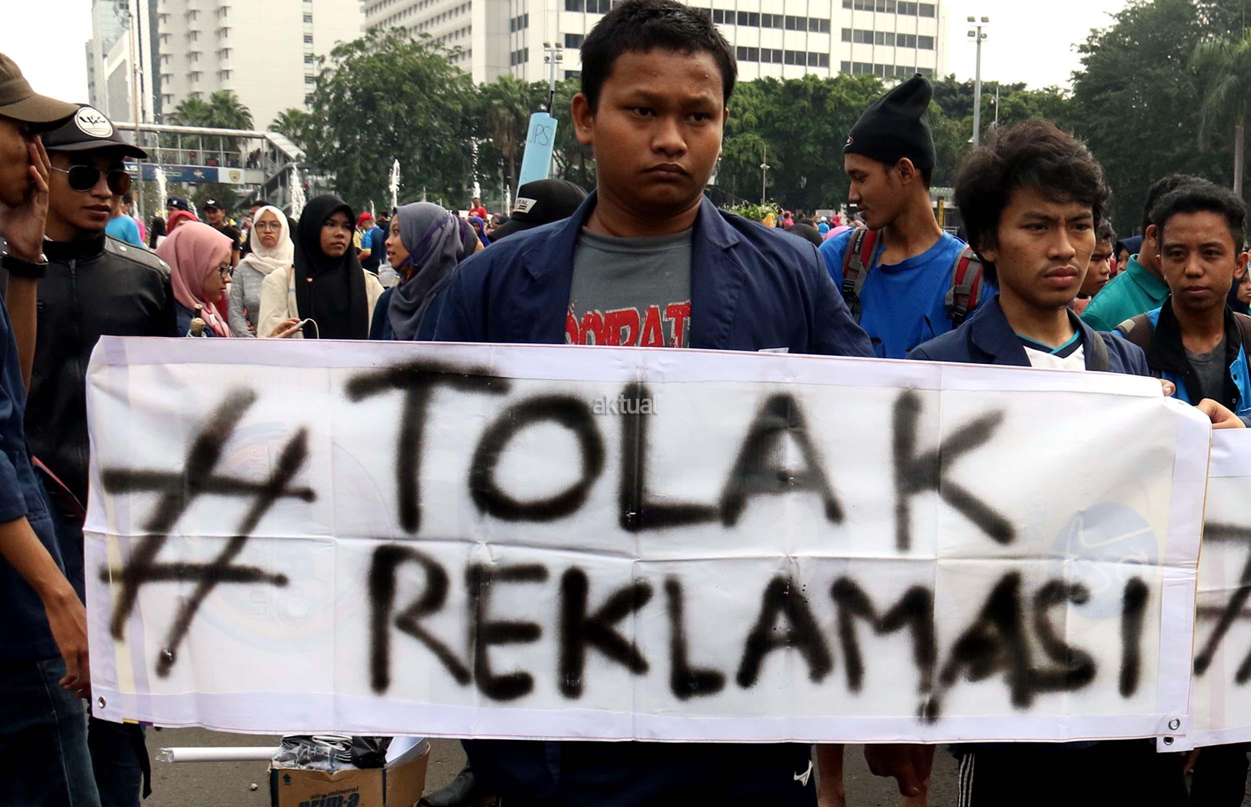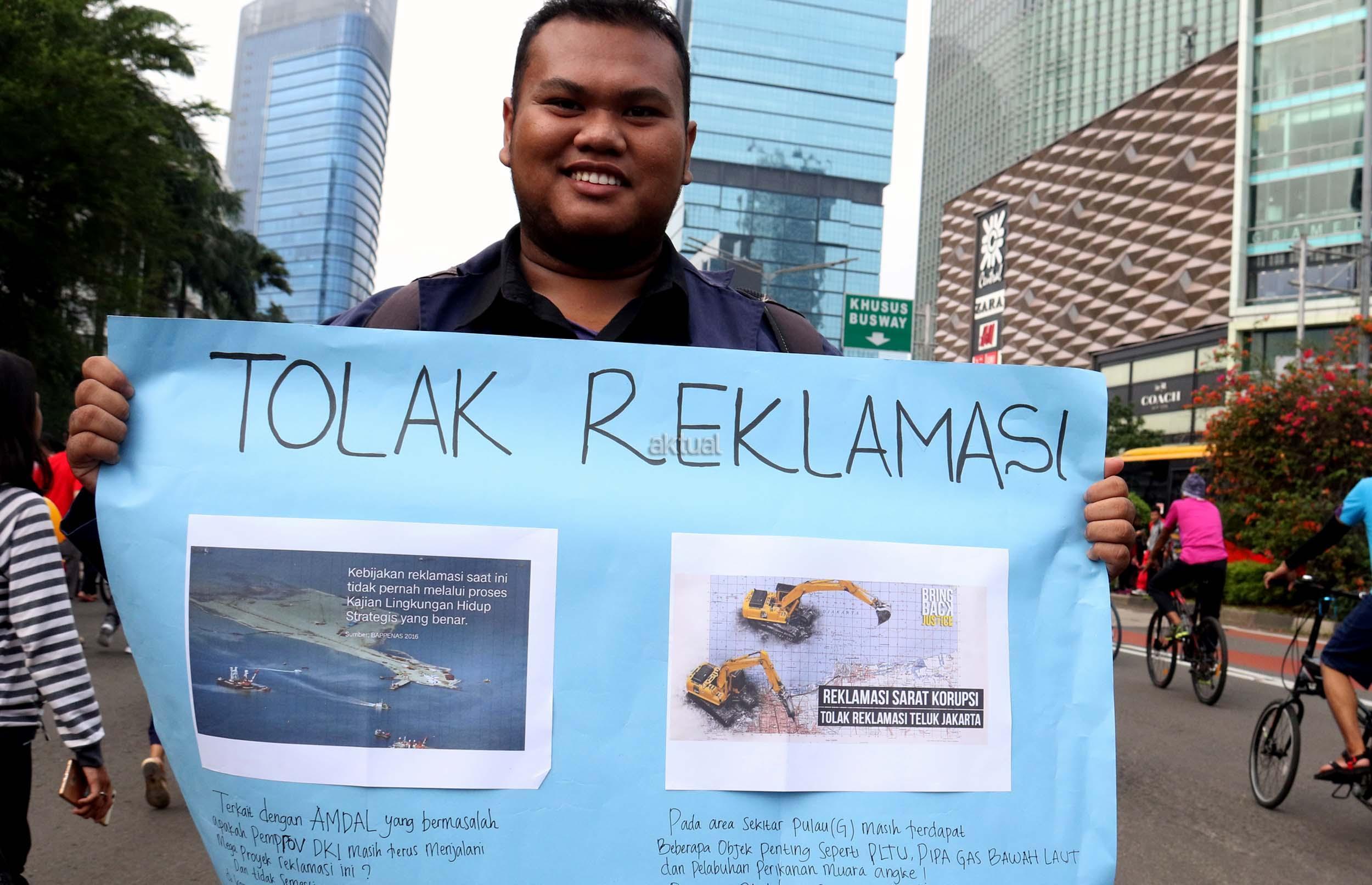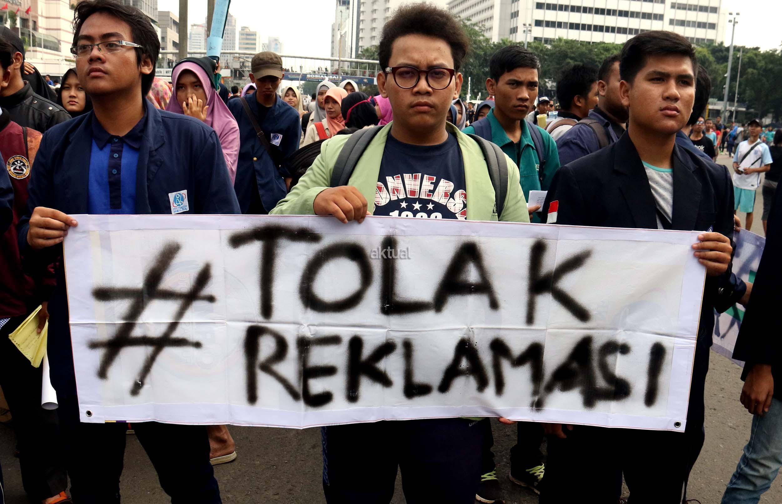 Sejumlah mahasiswa dari berbagai kampus yang tergabung dalam Aliansi BEM Seluruh Indonesia melakukan aksi menolak Reklamasi Teluk Jakarta, di kawasan CFD, Jakarta, Minggu ( 26/3/2017). Dalam aksinya, mereka menolak Reklamasi Teluk Jakarta, karena ini menjadi salah satu bukti negeri ini belum berpihak kepada Rakyatnya. Reklamasi Teluk Jakarta tidak memberi nilai tambah pada Jakarta dan Reklamasi menghilangkan ladang pekerjaan bagi para nelayan. AKTUAL/Munzir