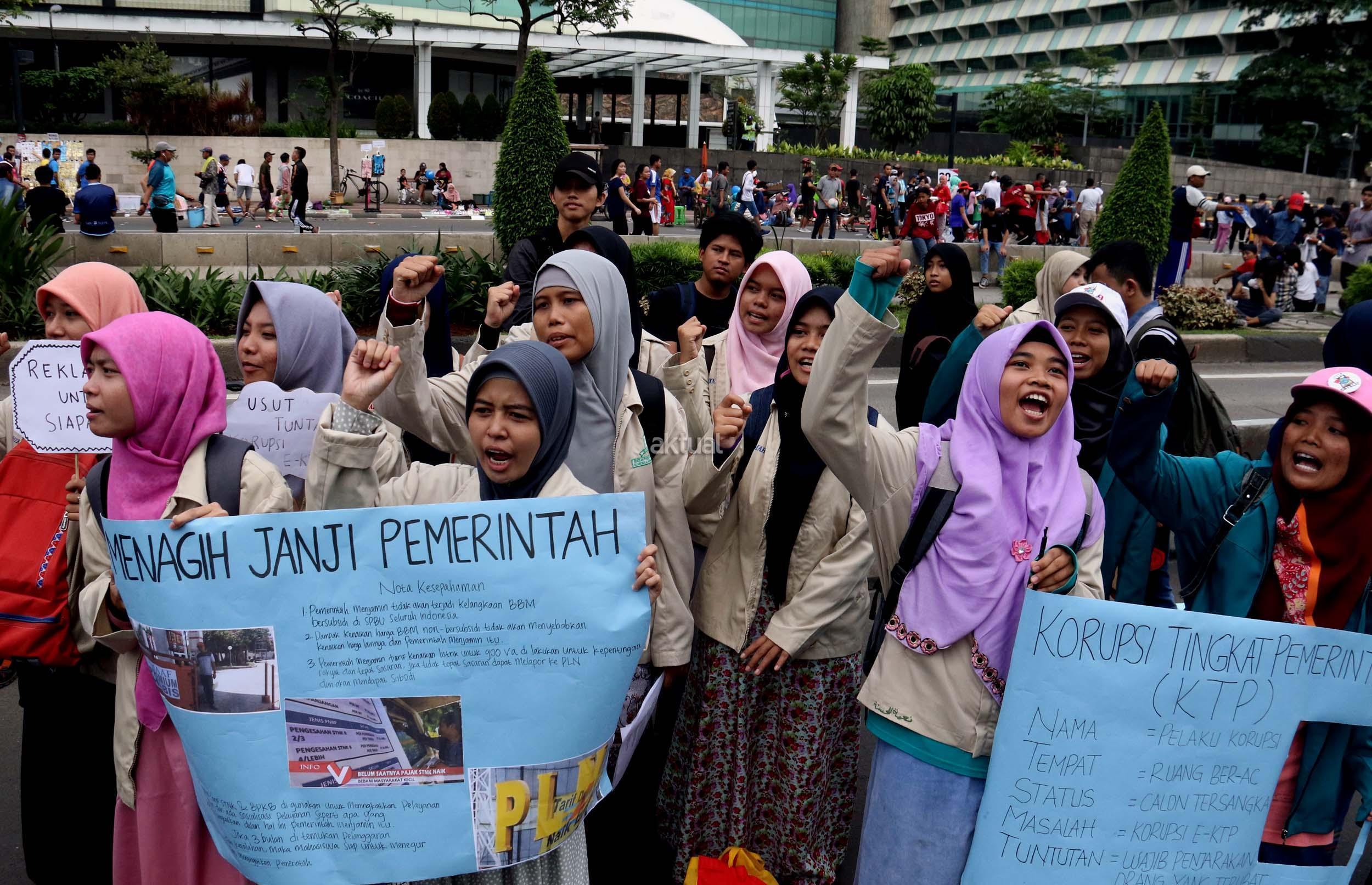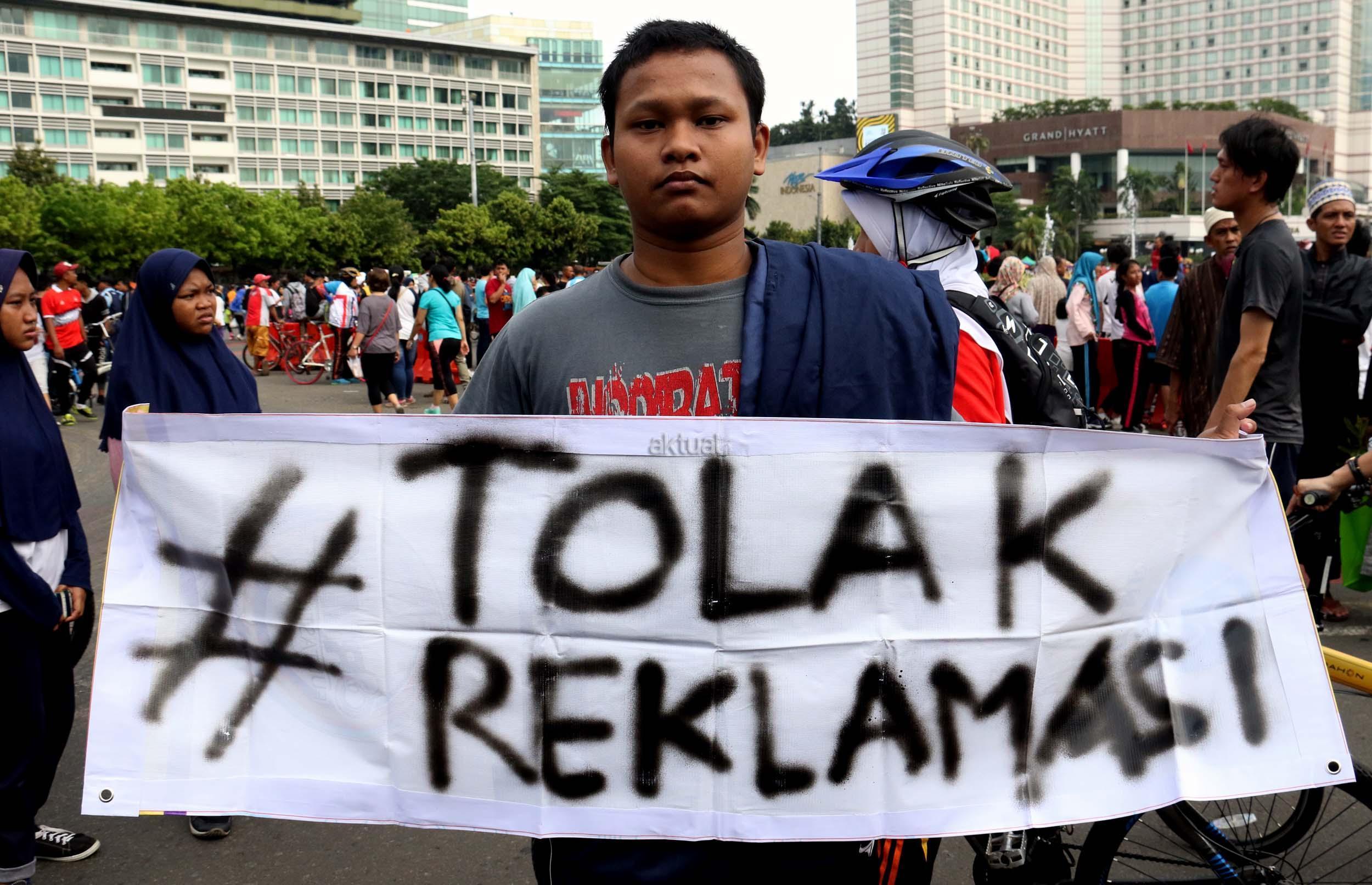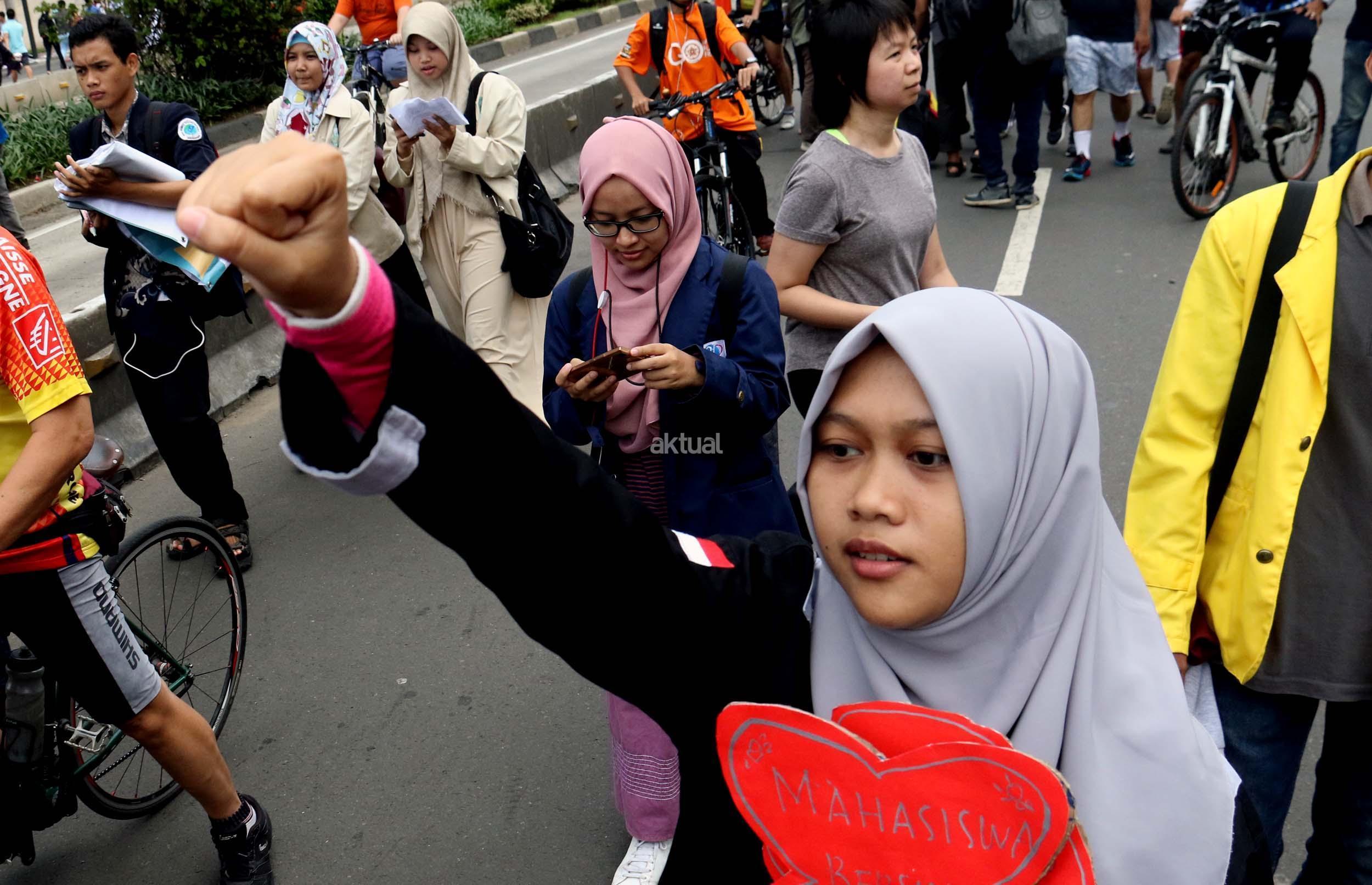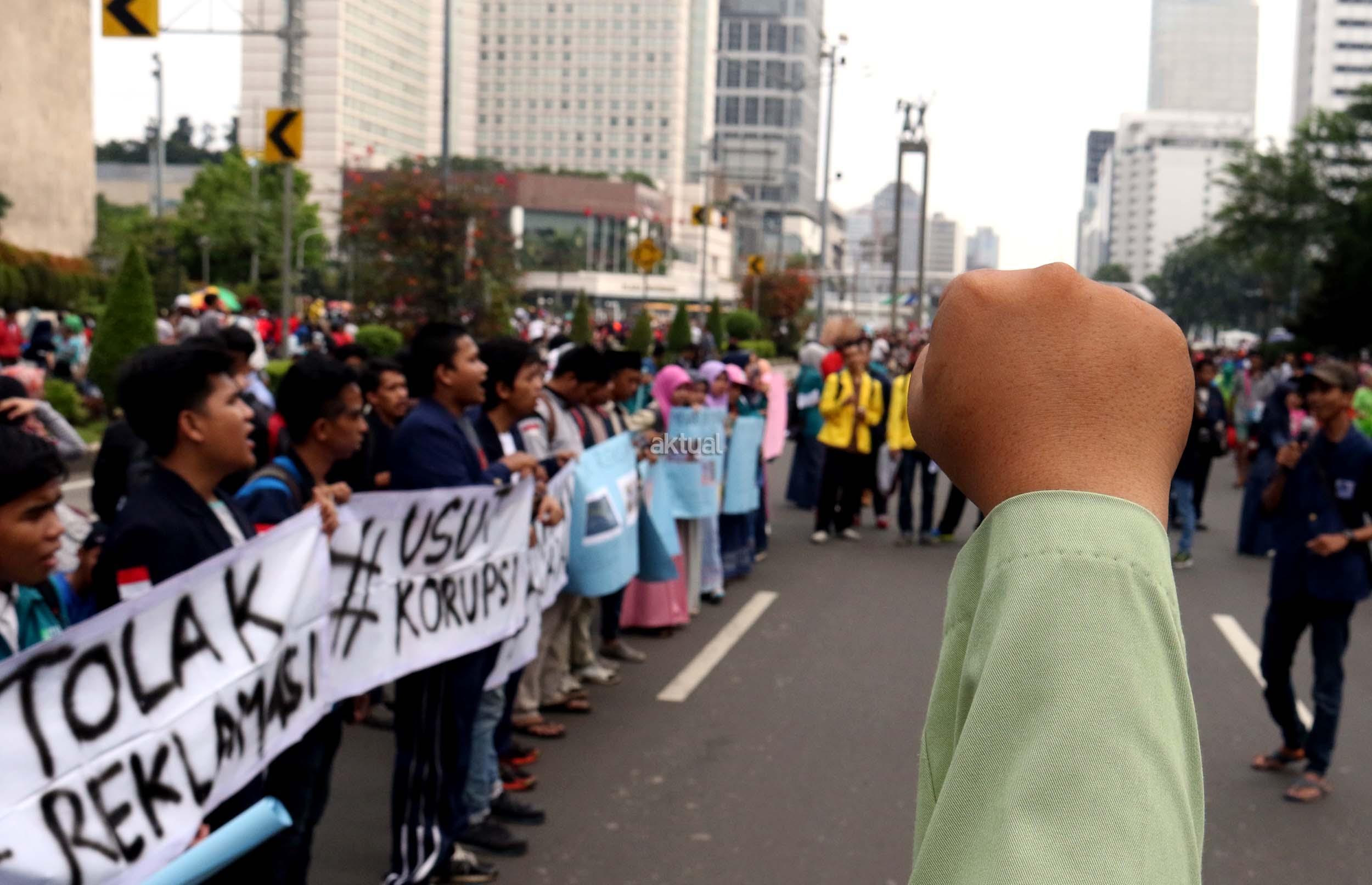 Sejumlah mahasiswa dari berbagai kampus yang tergabung dalam Aliansi BEM Seluruh Indonesia melakukan aksi menolak Reklamasi Teluk Jakarta, di kawasan CFD, Jakarta, Minggu ( 26/3/2017). Dalam aksinya, mereka menolak Reklamasi Teluk Jakarta, karena ini menjadi salah satu bukti negeri ini belum berpihak kepada Rakyatnya. Reklamasi Teluk Jakarta tidak memberi nilai tambah pada Jakarta dan Reklamasi menghilangkan ladang pekerjaan bagi para nelayan. AKTUAL/Munzir