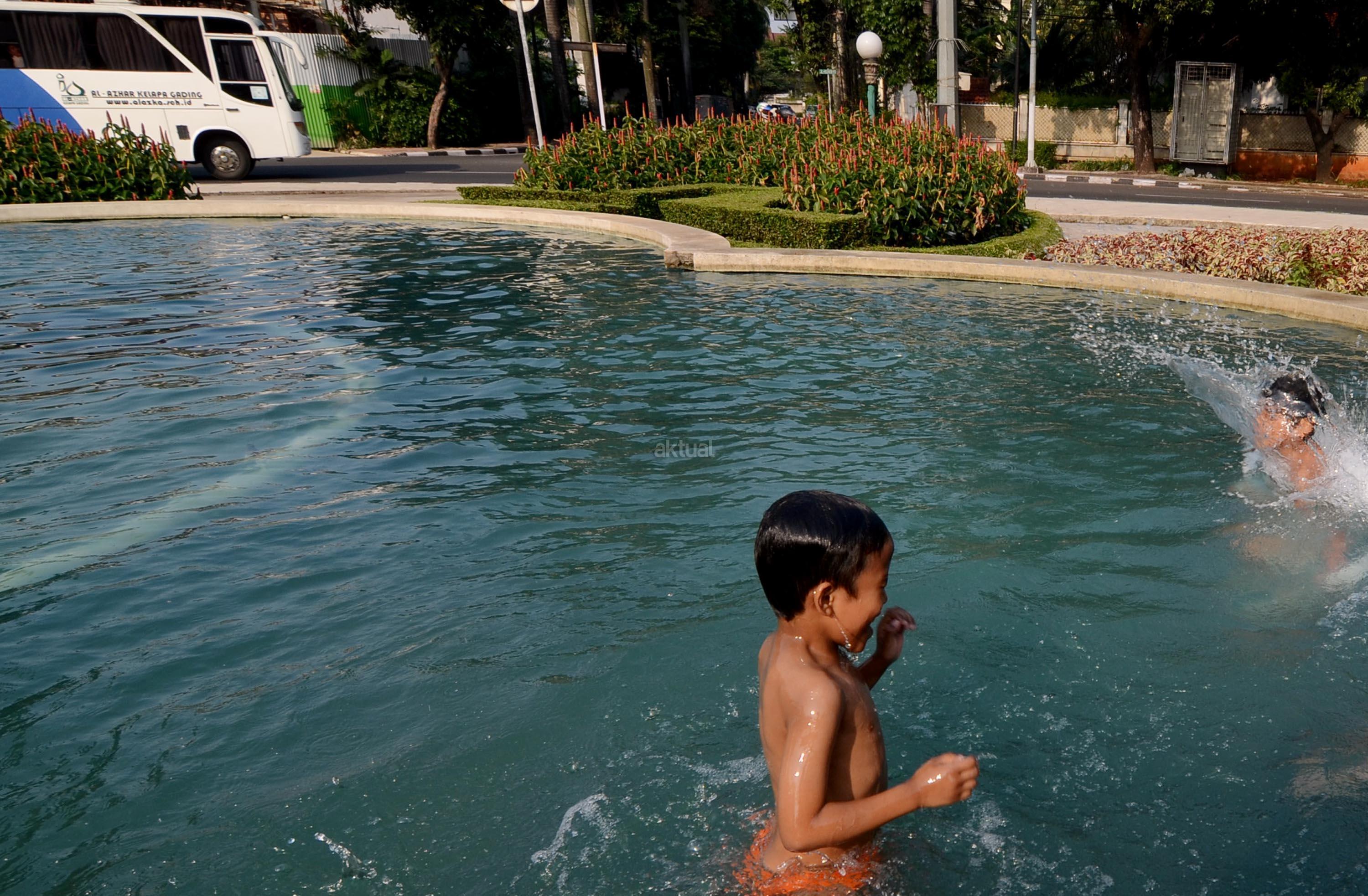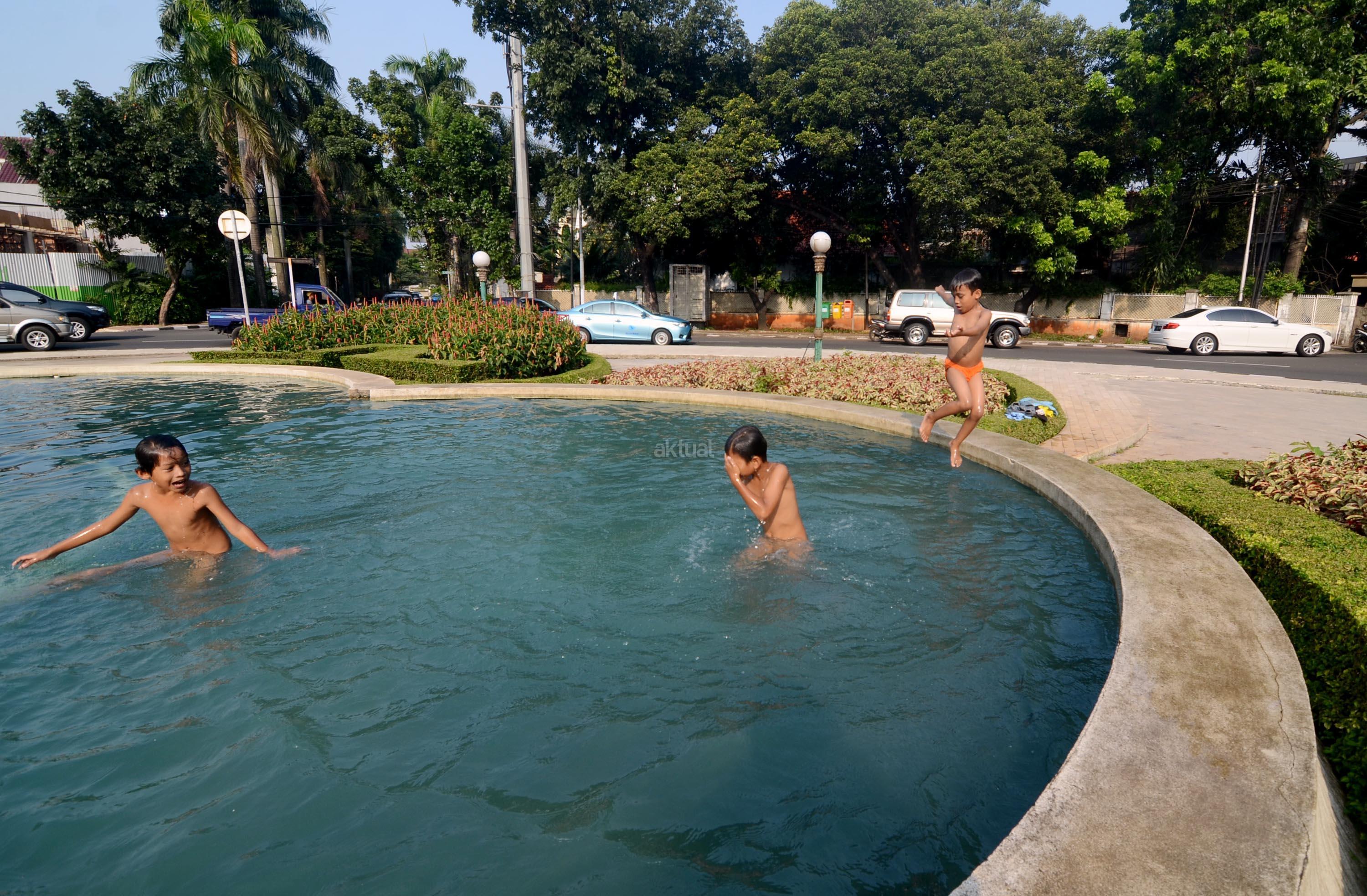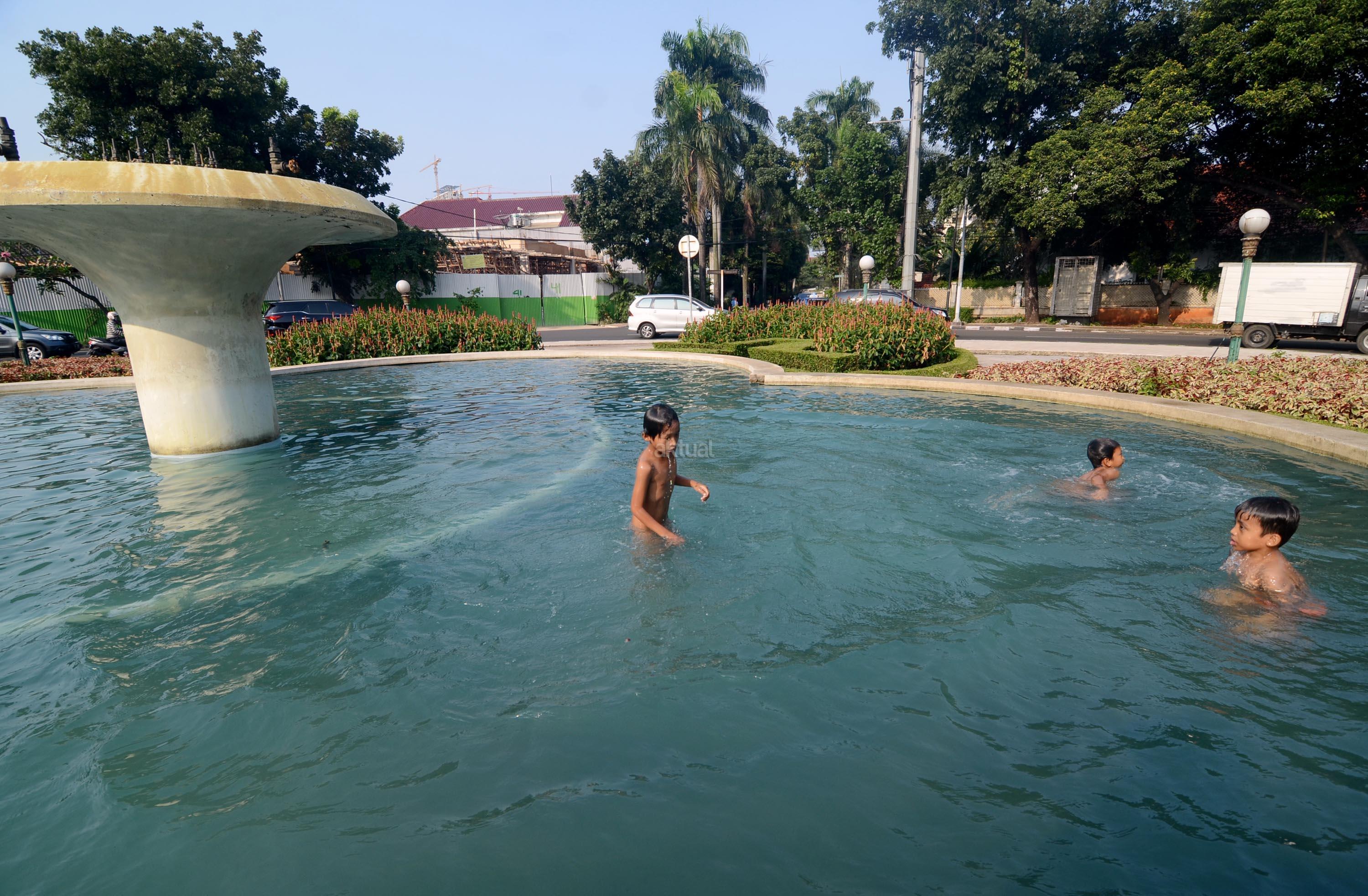 Sejumlah anak berenang di kolam air mancur, Jalan Teuku Umar, Menteng, Jakarta Pusat, Kamis (27/7/2017). Kurangnnya fasilitas umum lahan bermain, menyebabkan mereka memanfaatkan fasilitas air mancur taman kota untuk bermain. AKTUAL/Munzir