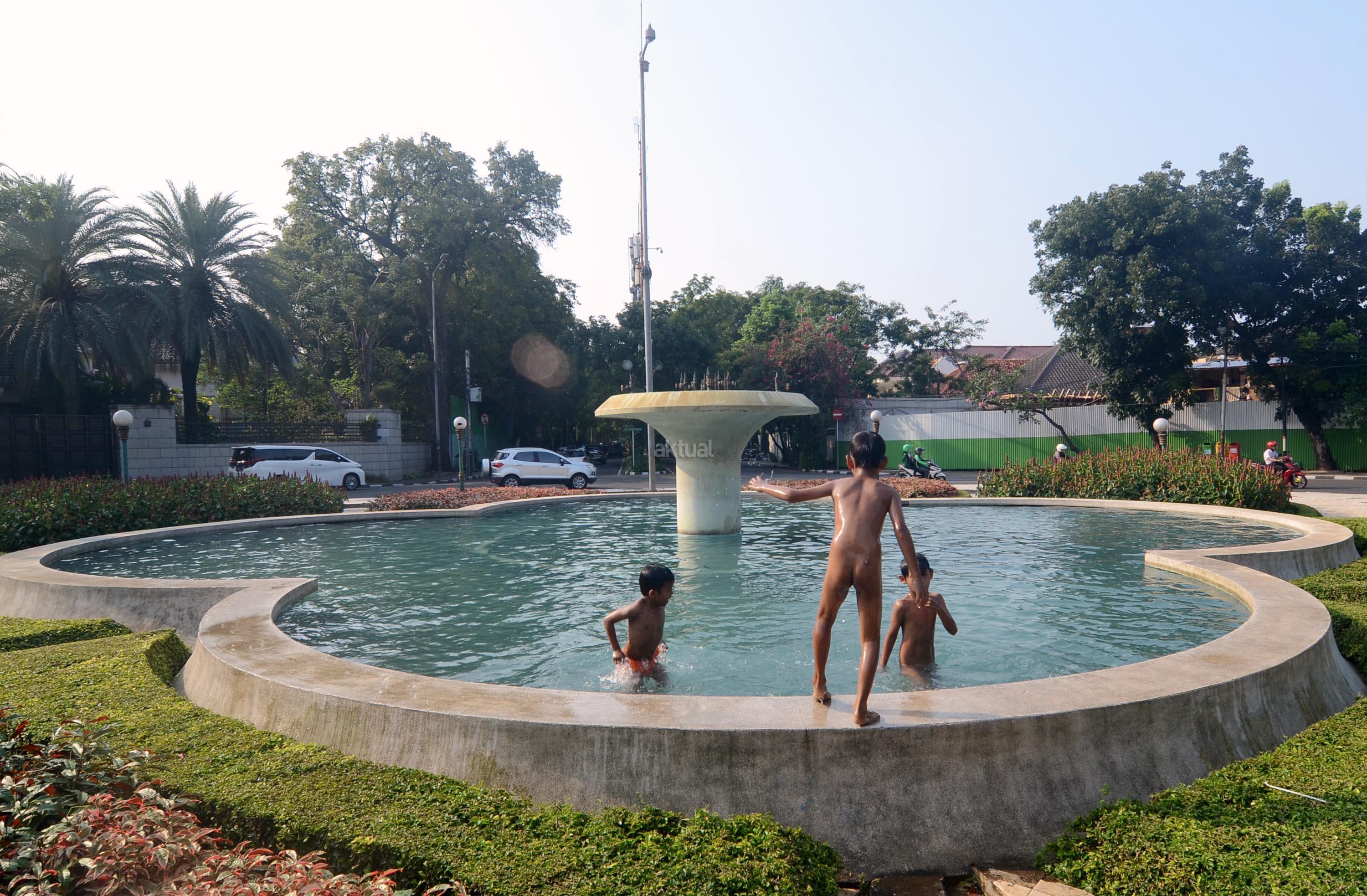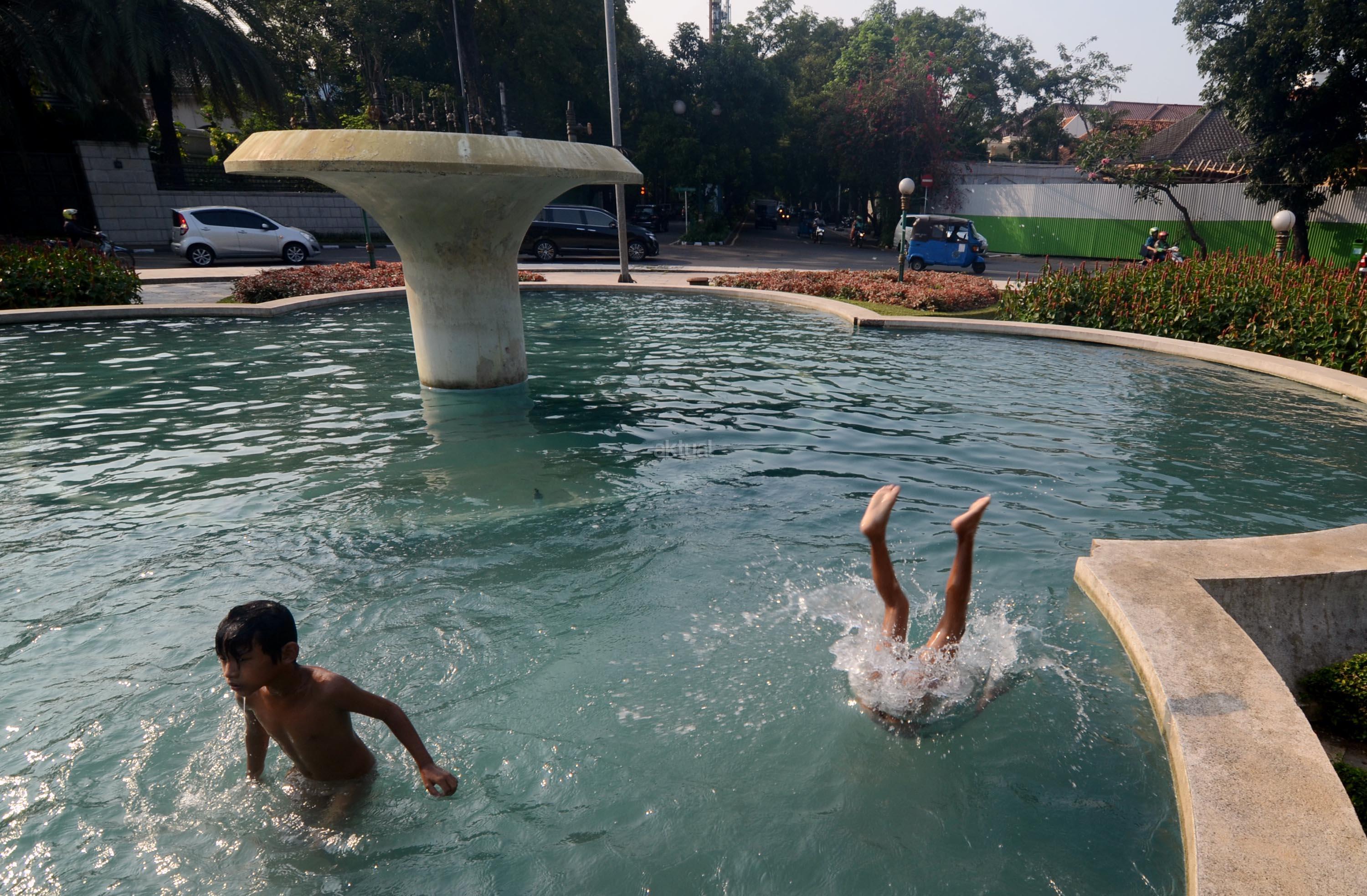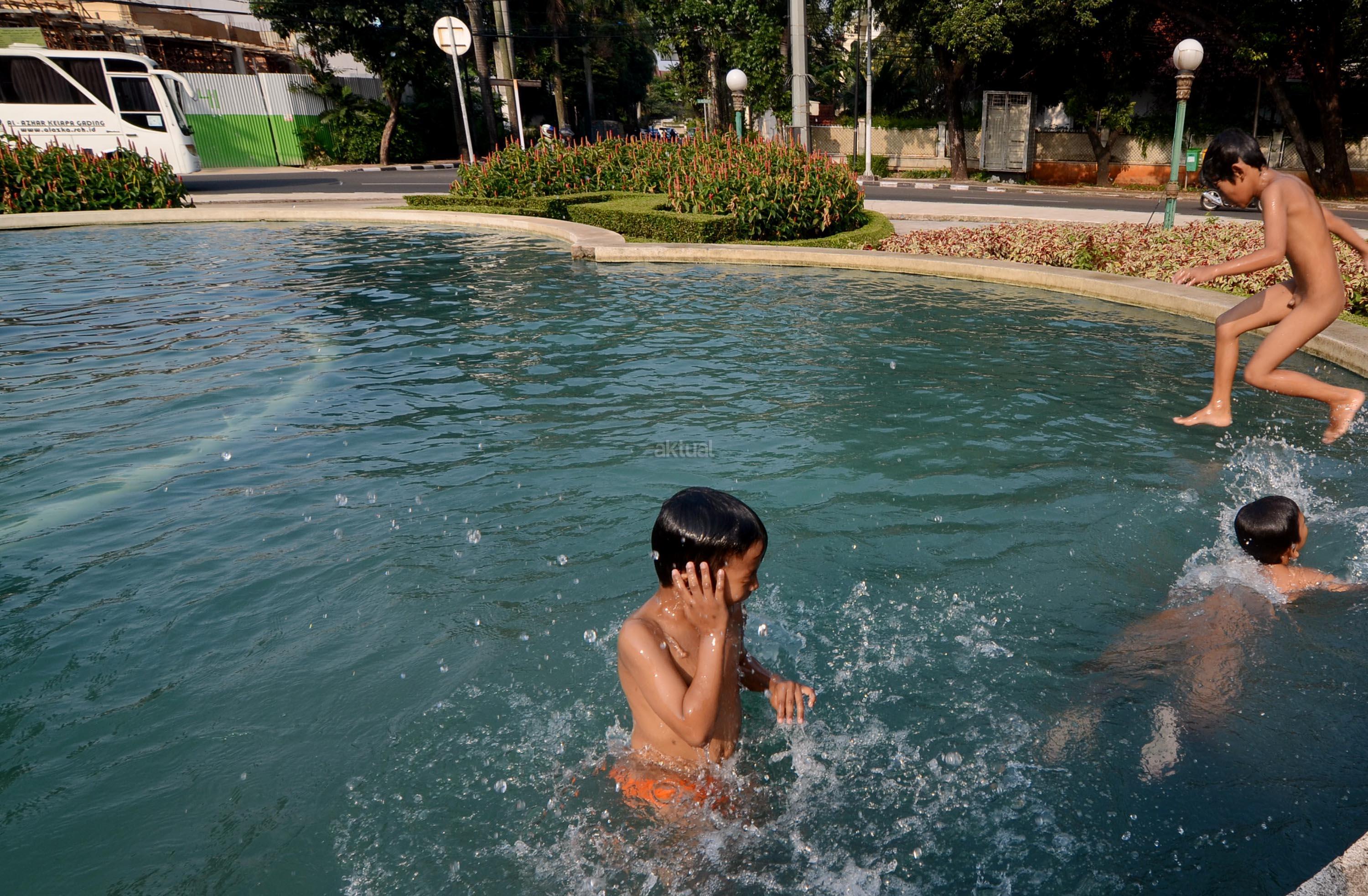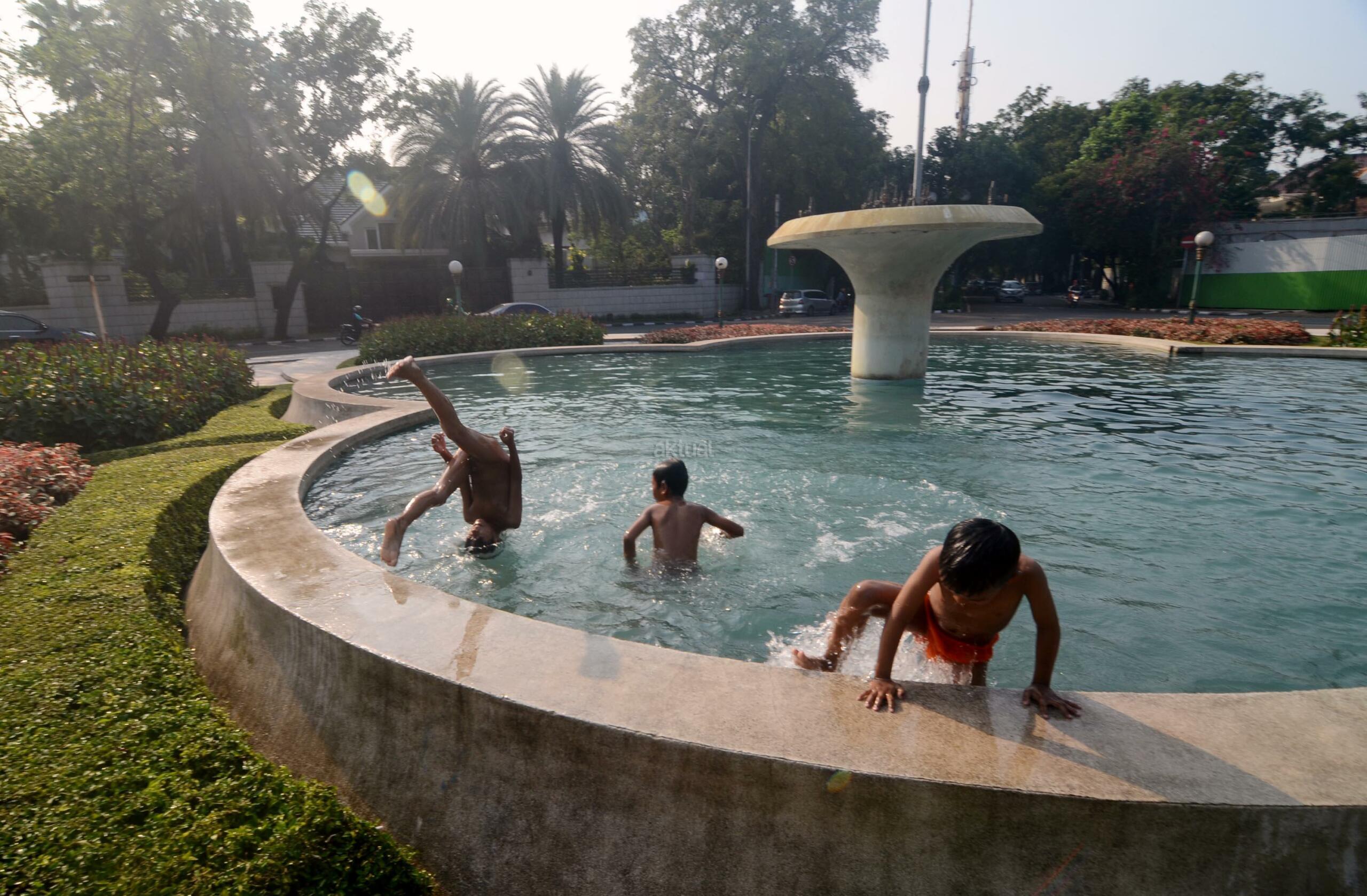 Sejumlah anak berenang di kolam air mancur, Jalan Teuku Umar, Menteng, Jakarta Pusat, Kamis (27/7/2017). Kurangnnya fasilitas umum lahan bermain, menyebabkan mereka memanfaatkan fasilitas air mancur taman kota untuk bermain. AKTUAL/Munzir