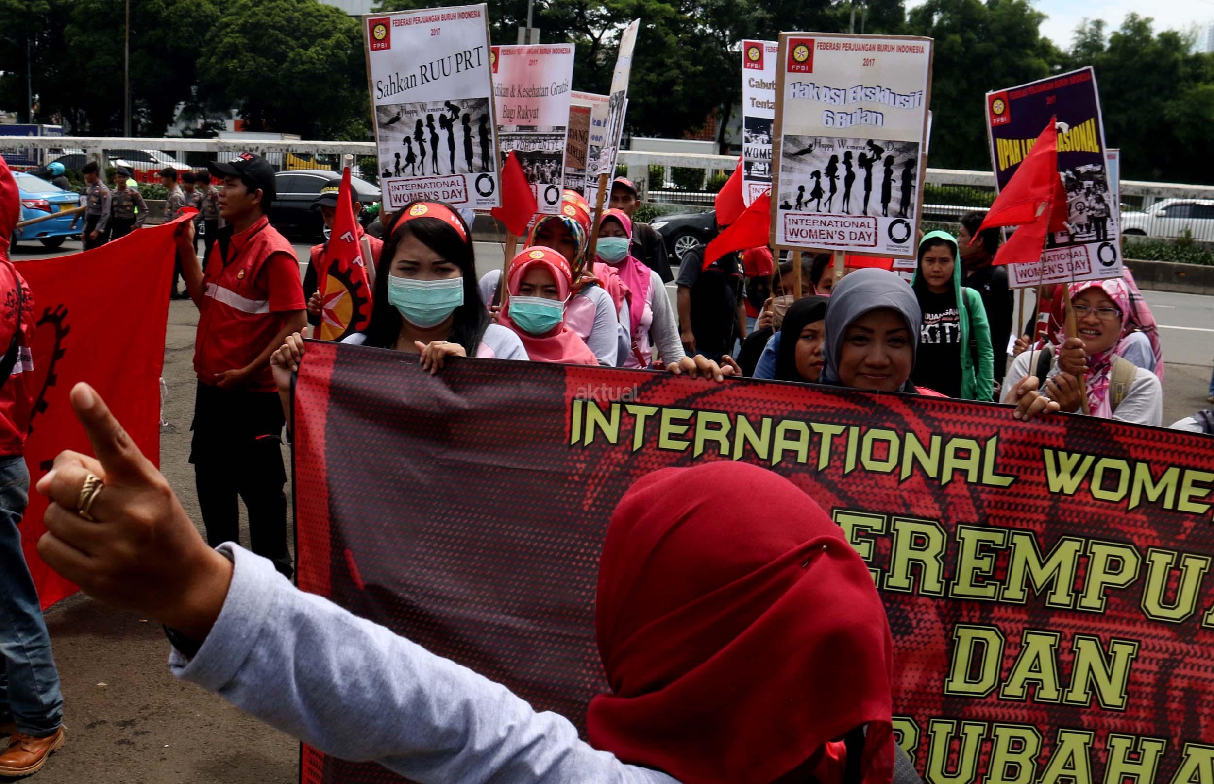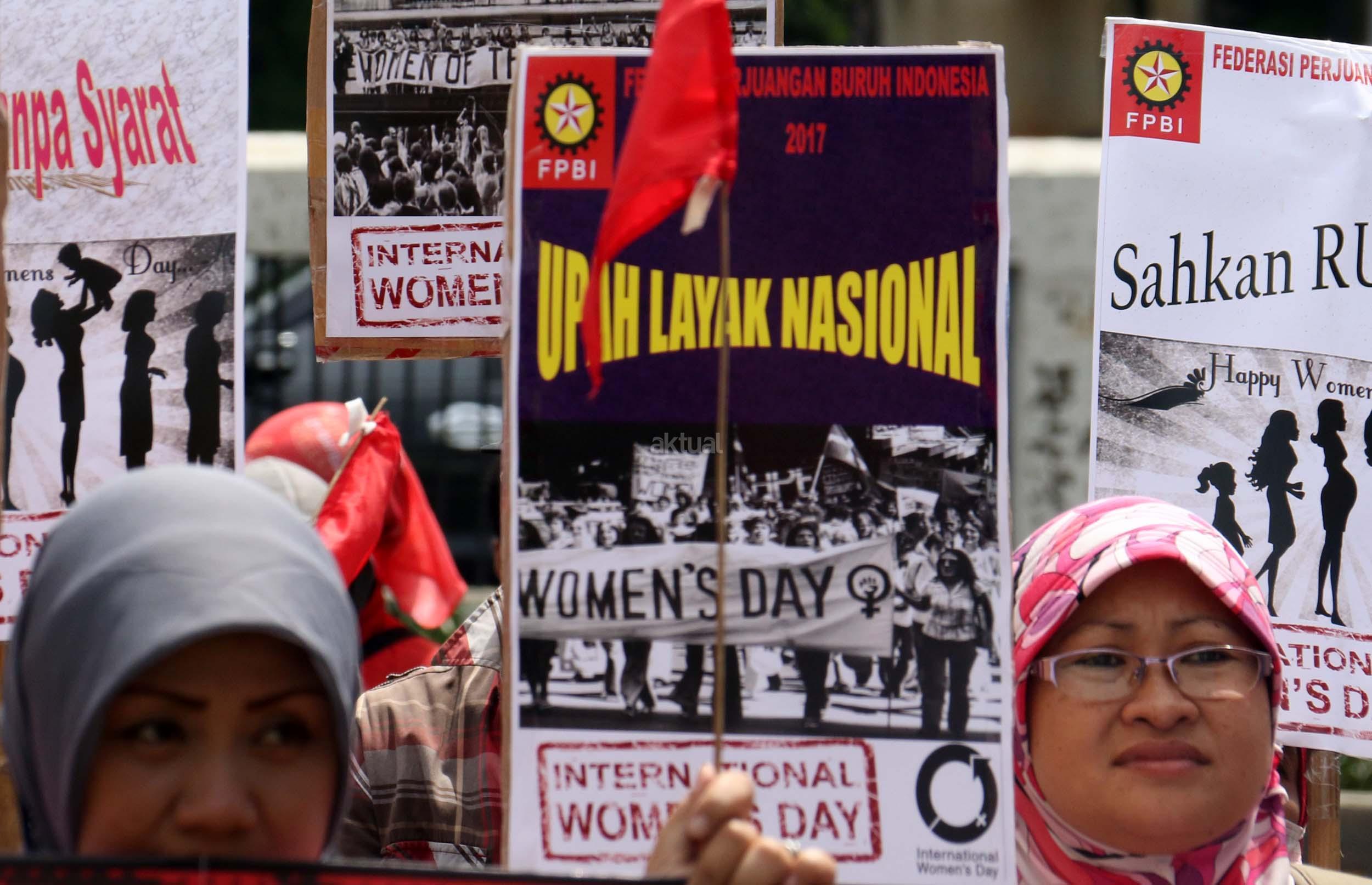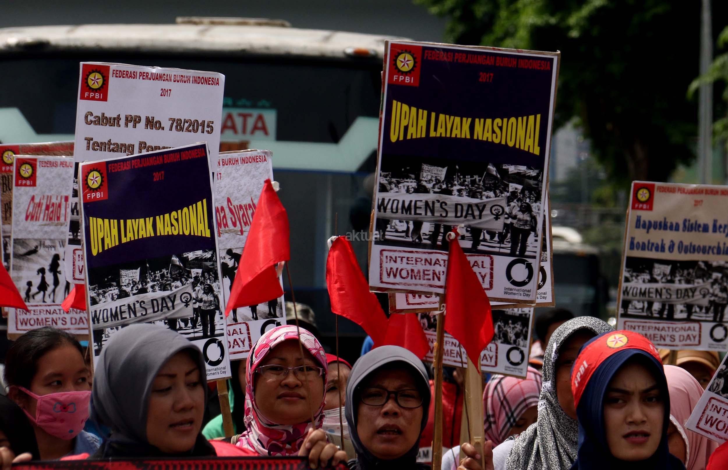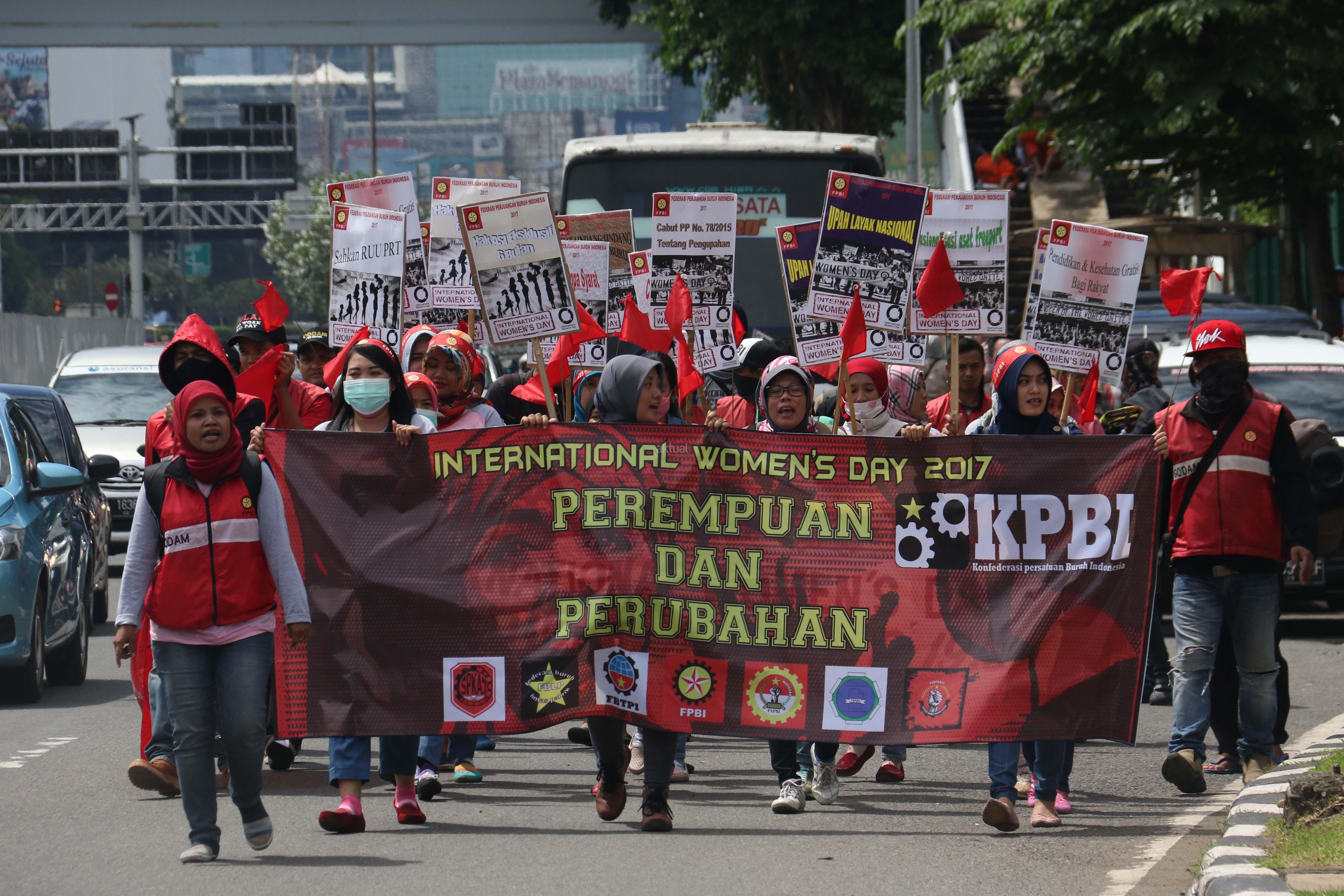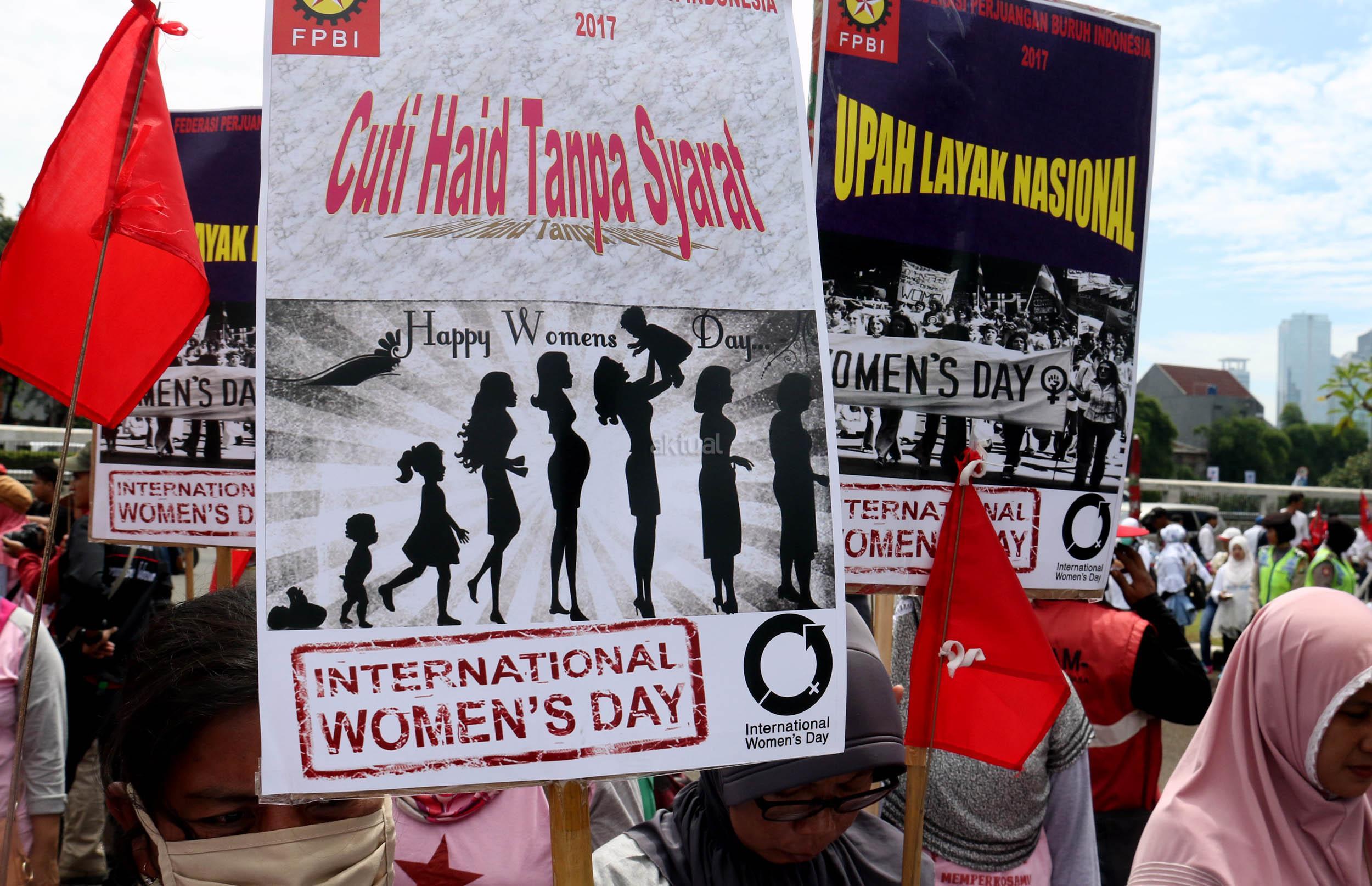 Sejumlah buruh yang perempuan yang tergabung dalam Konfederasi Buruh Indonesia (KPBI) melakukan aksi di depan gedung DPR RI, Jakarta, Rabu (8/3/2017). Dalam aksinya para buruh perempuan untuk memperingati hari perempuan internasional dan menolak cuti haid tanpa syarat. AKTUAL/Munzir