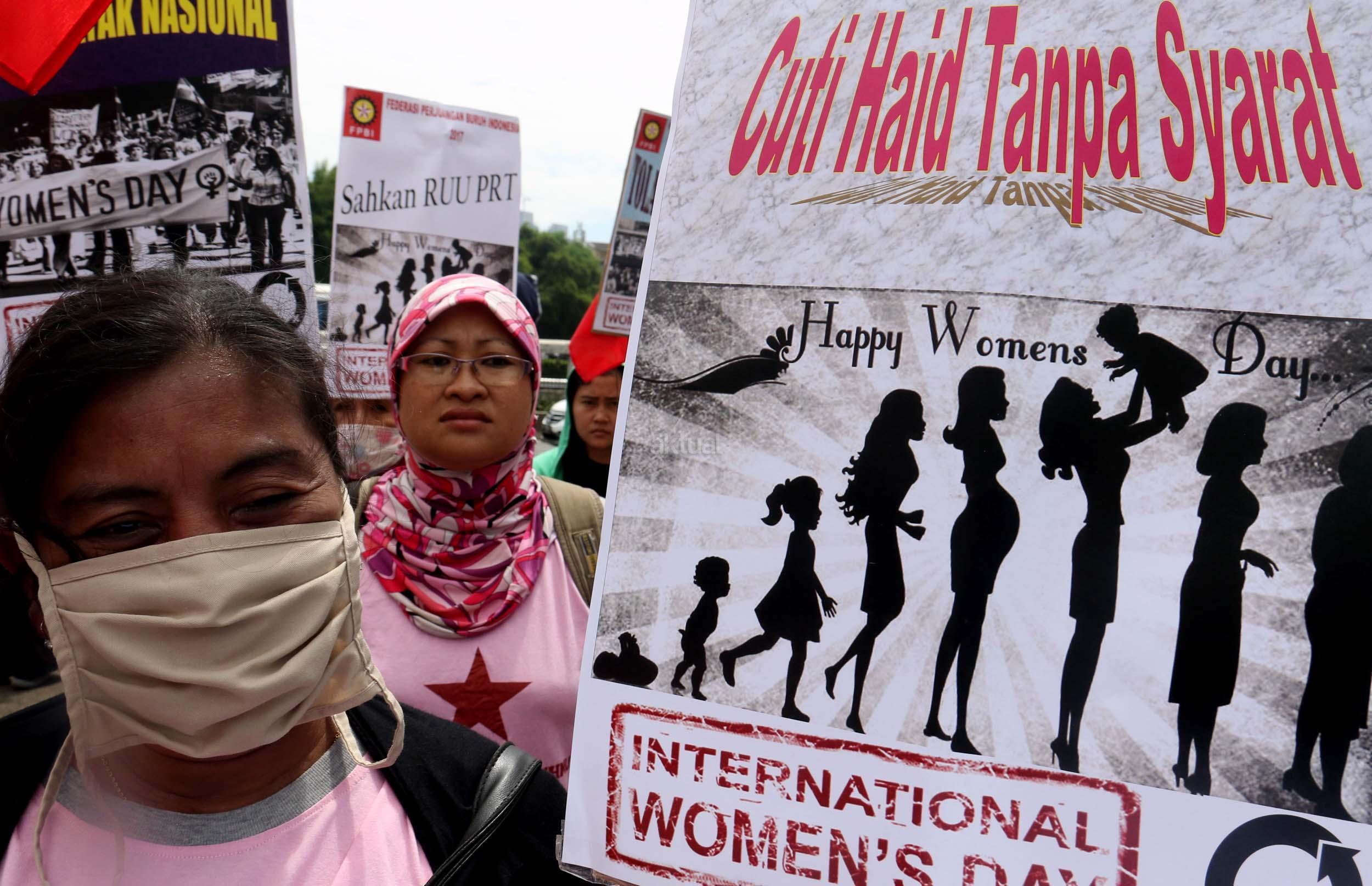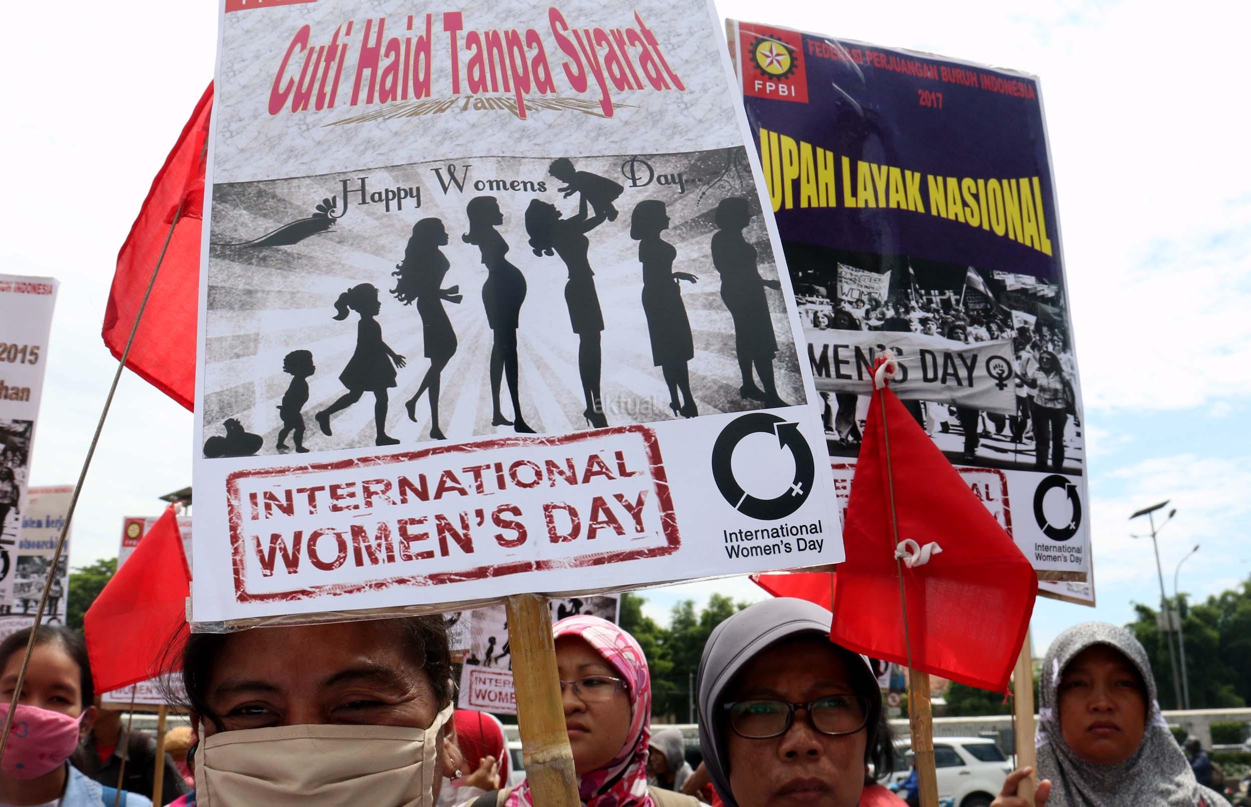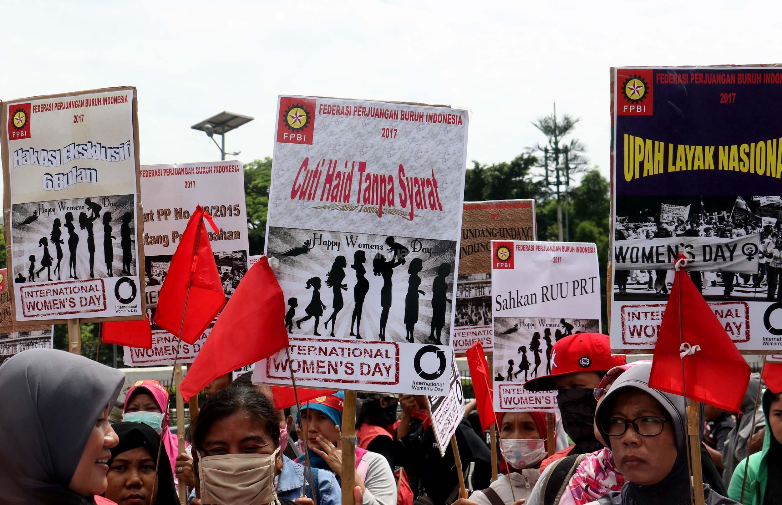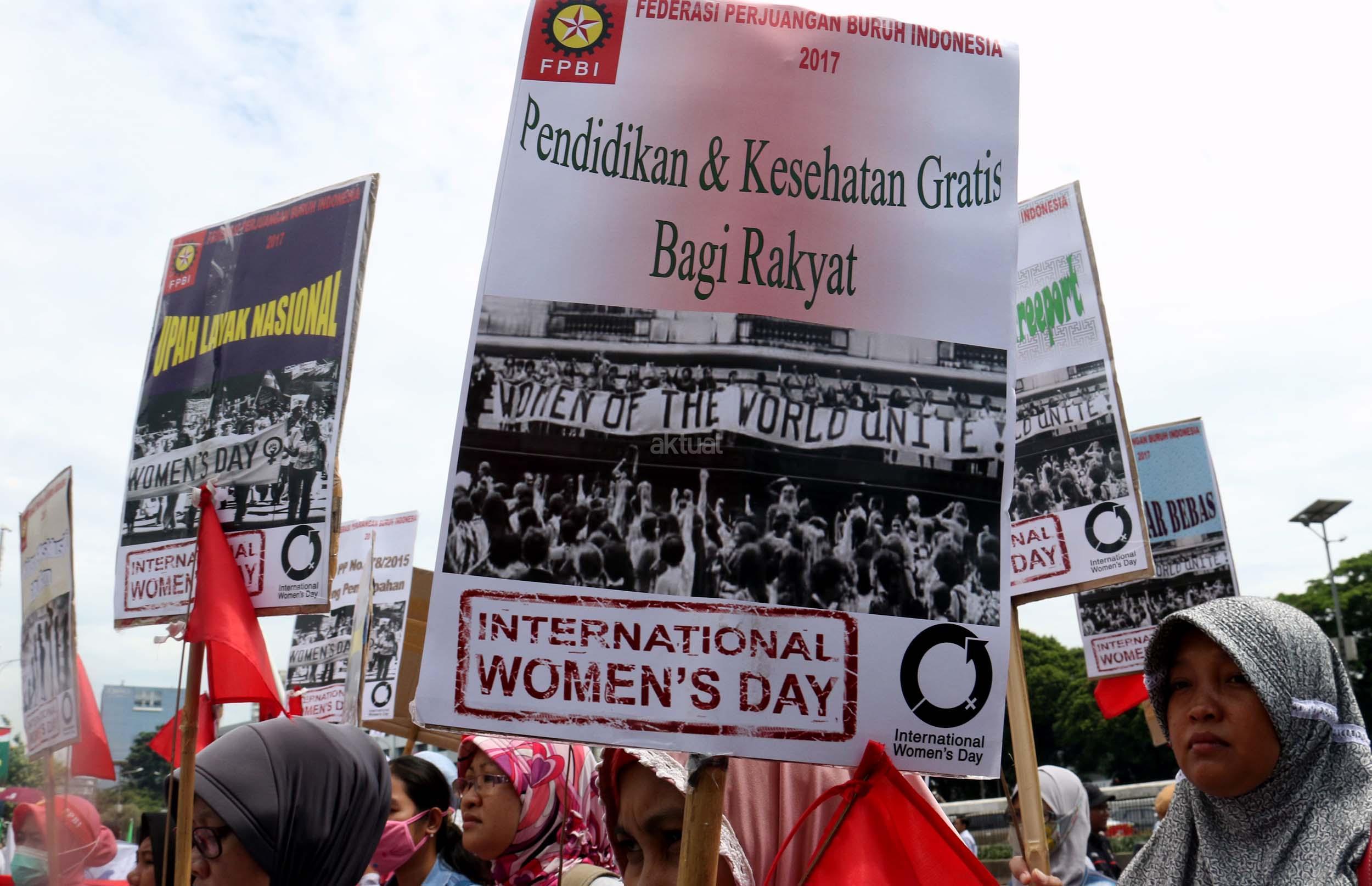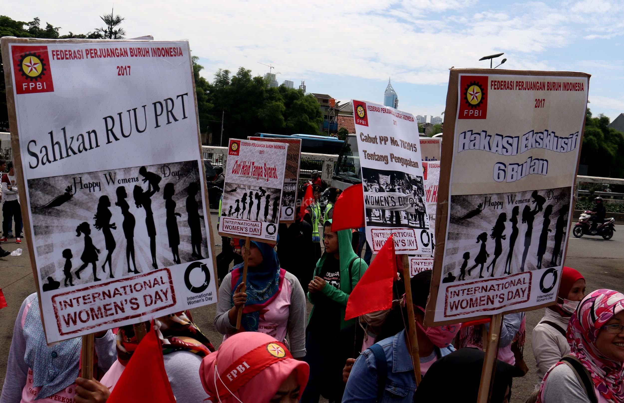 Sejumlah buruh yang perempuan yang tergabung dalam Konfederasi Buruh Indonesia (KPBI) melakukan aksi di depan gedung DPR RI, Jakarta, Rabu (8/3/2017). Dalam aksinya para buruh perempuan untuk memperingati hari perempuan internasional dan menolak cuti haid tanpa syarat. AKTUAL/Munzir