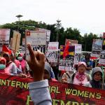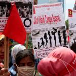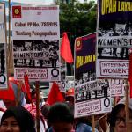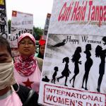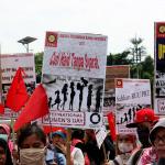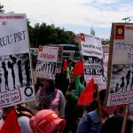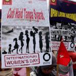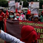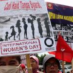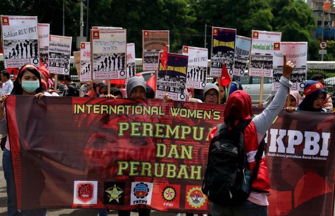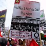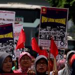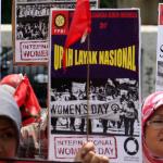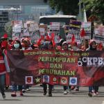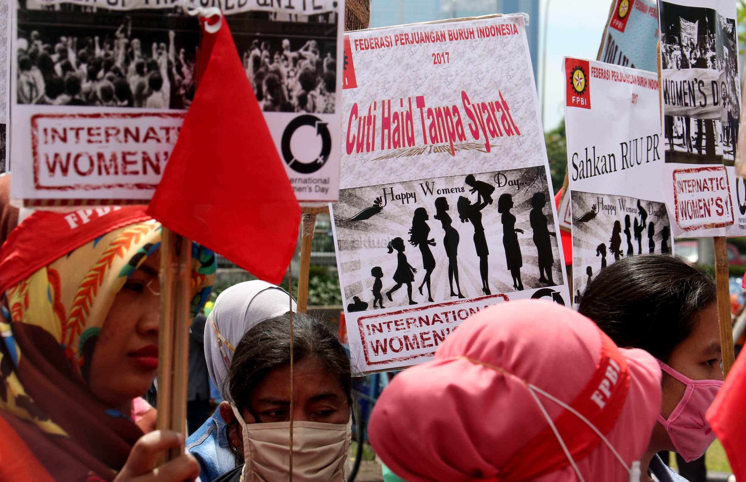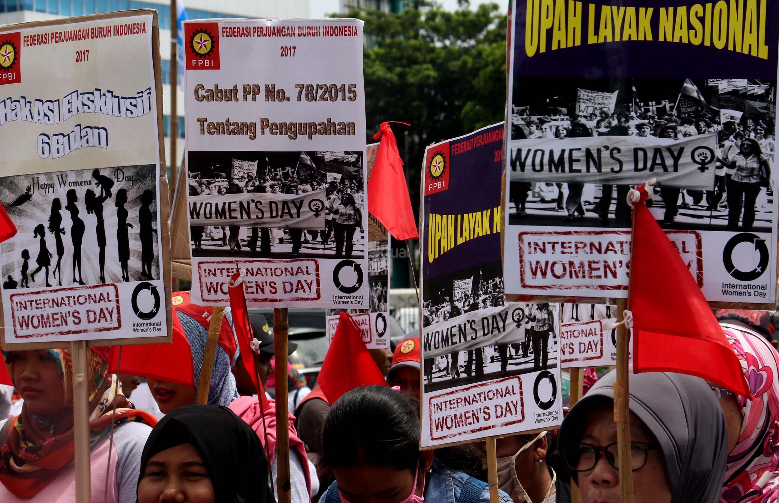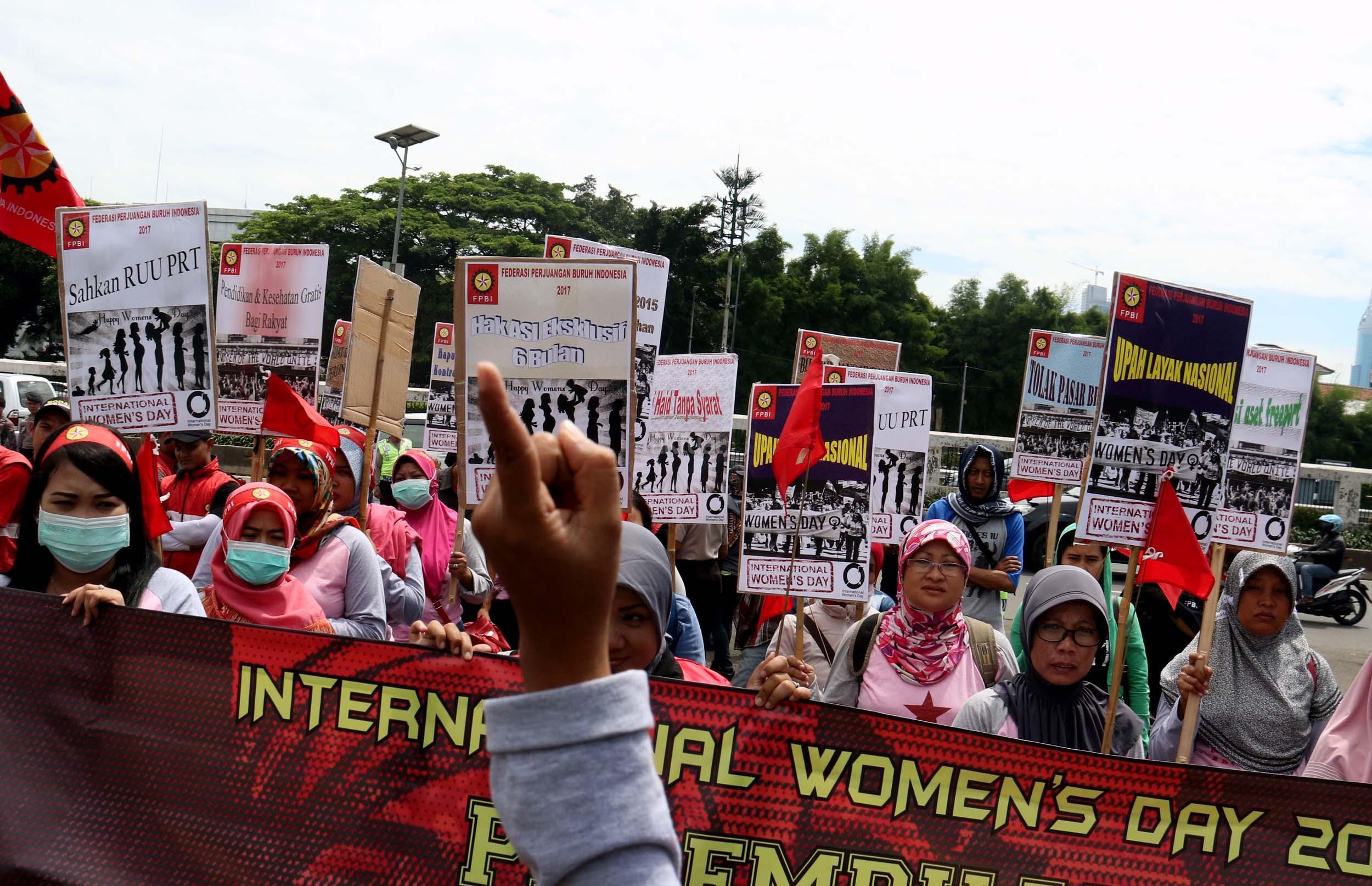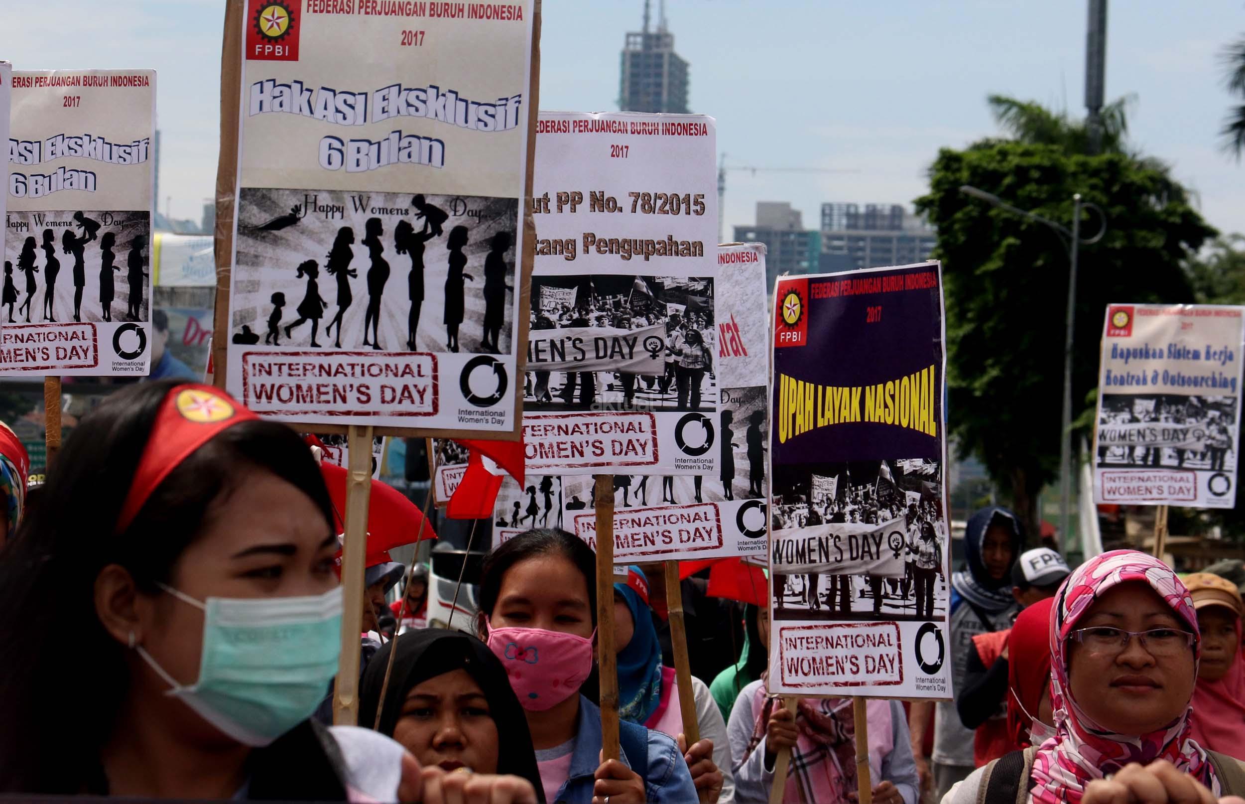 Sejumlah buruh yang perempuan yang tergabung dalam Konfederasi Buruh Indonesia (KPBI) melakukan aksi di depan gedung DPR RI, Jakarta, Rabu (8/3/2017). Dalam aksinya para buruh perempuan untuk memperingati hari perempuan internasional dan menolak cuti haid tanpa syarat. AKTUAL/Munzir