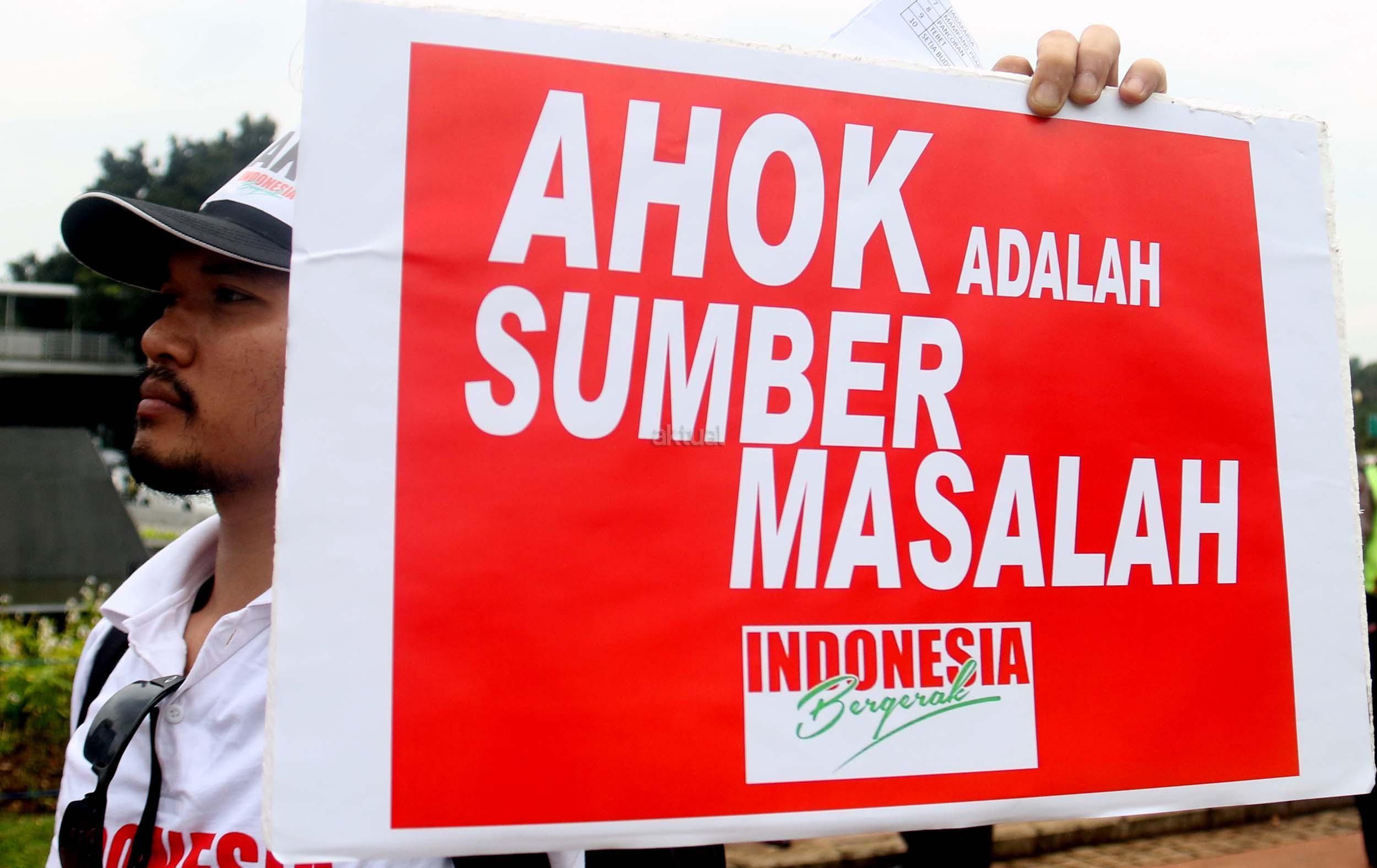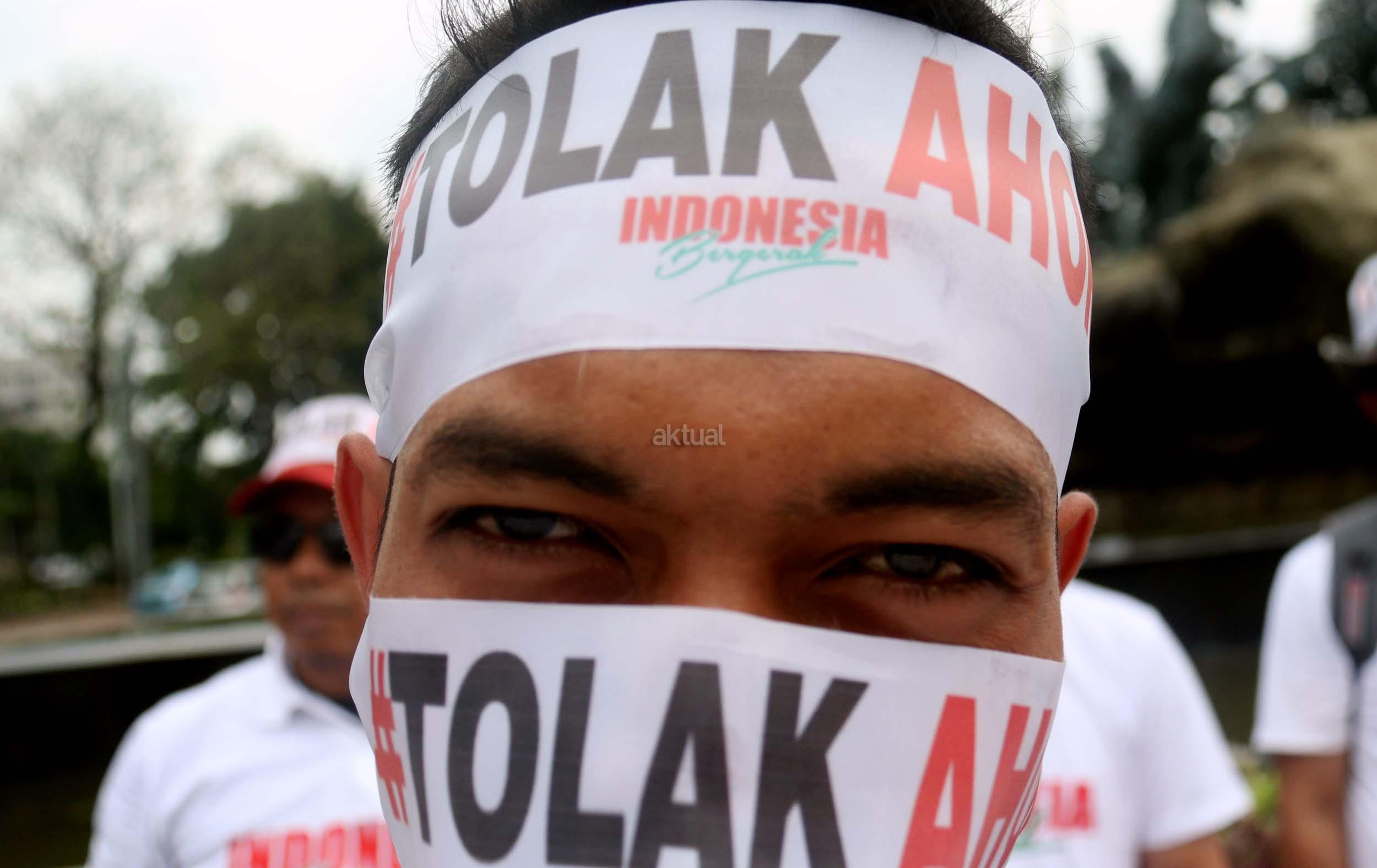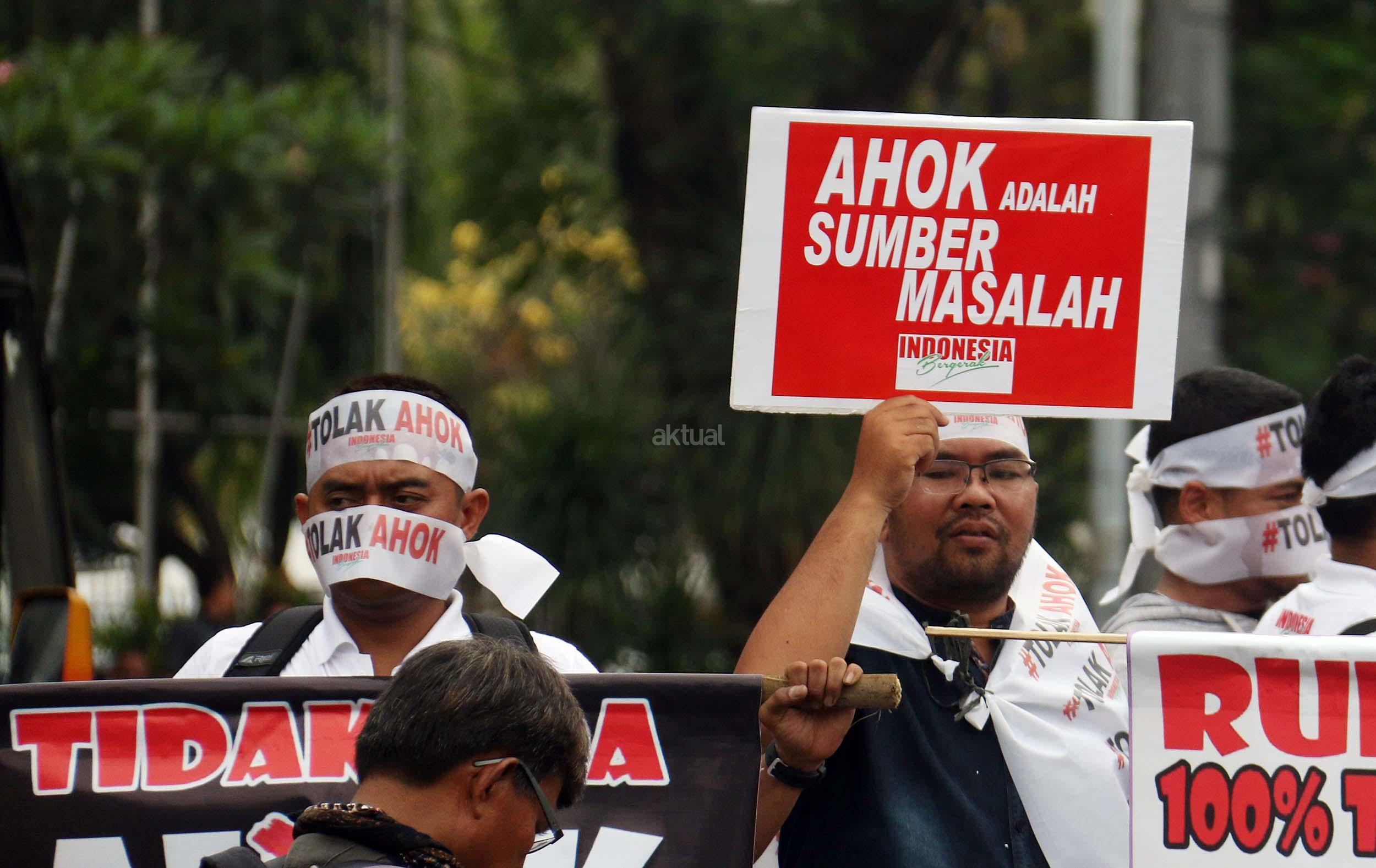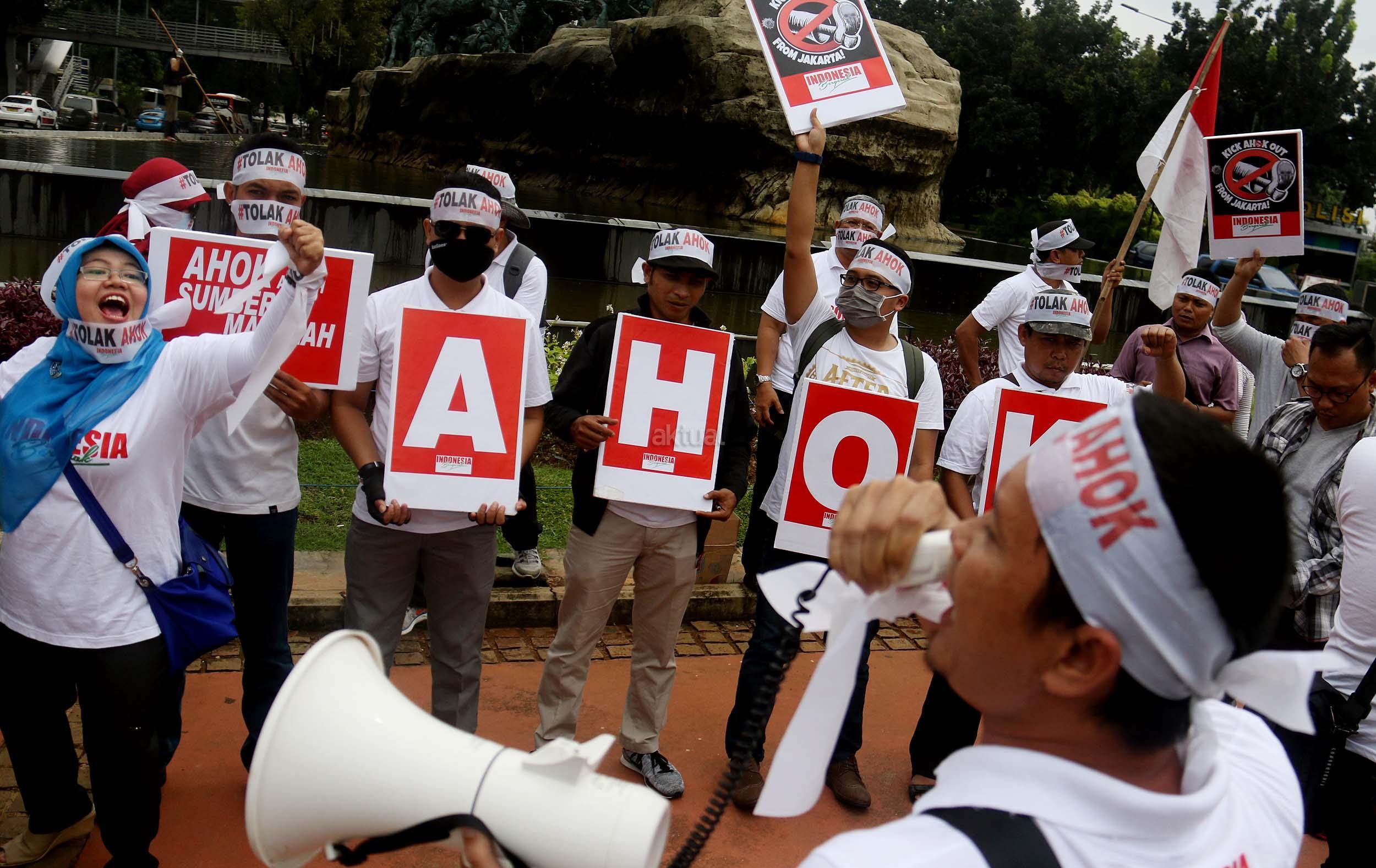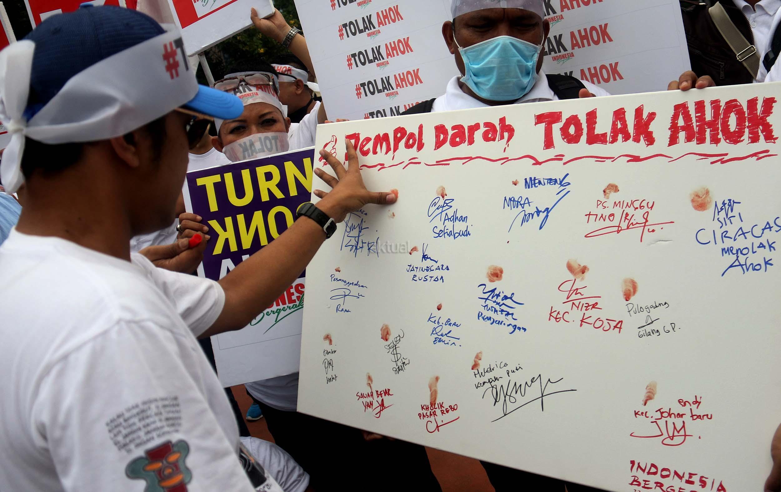 Puluhan massa yang tergabung dalam Indonesia Bergerak melakukan aksi Cap Jempol Darah dengan tagar #TolakAhok, Jakarta, Kamis (22/9/2016). Dalam aksinya Indonesia Bergerak dengan melakukan cap jempol darah sebagai bentuk perlawanan terhadap rezim kepemimpinan Basuki Tjahaja Purnama (Ahok) yang telah melukai banyak warga Jakarta dan aksi ini juga sebagai bentuk solidaritas terhadap warga Jakarta yang sudah menjadi korban keganasan Ahok selama menjabat sebagai Gubenur DKI Jakarta. AKTUAL/MUNZIR