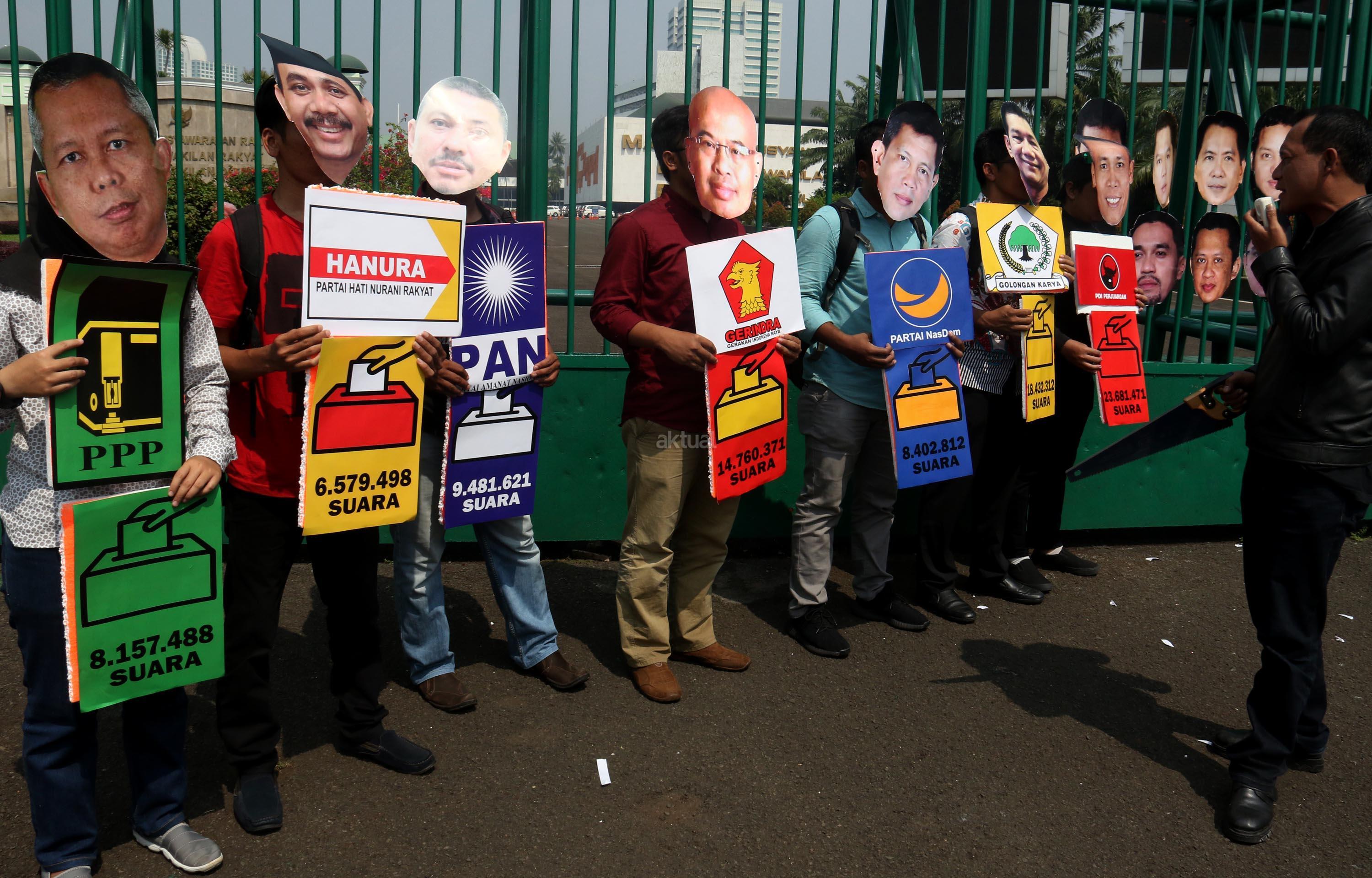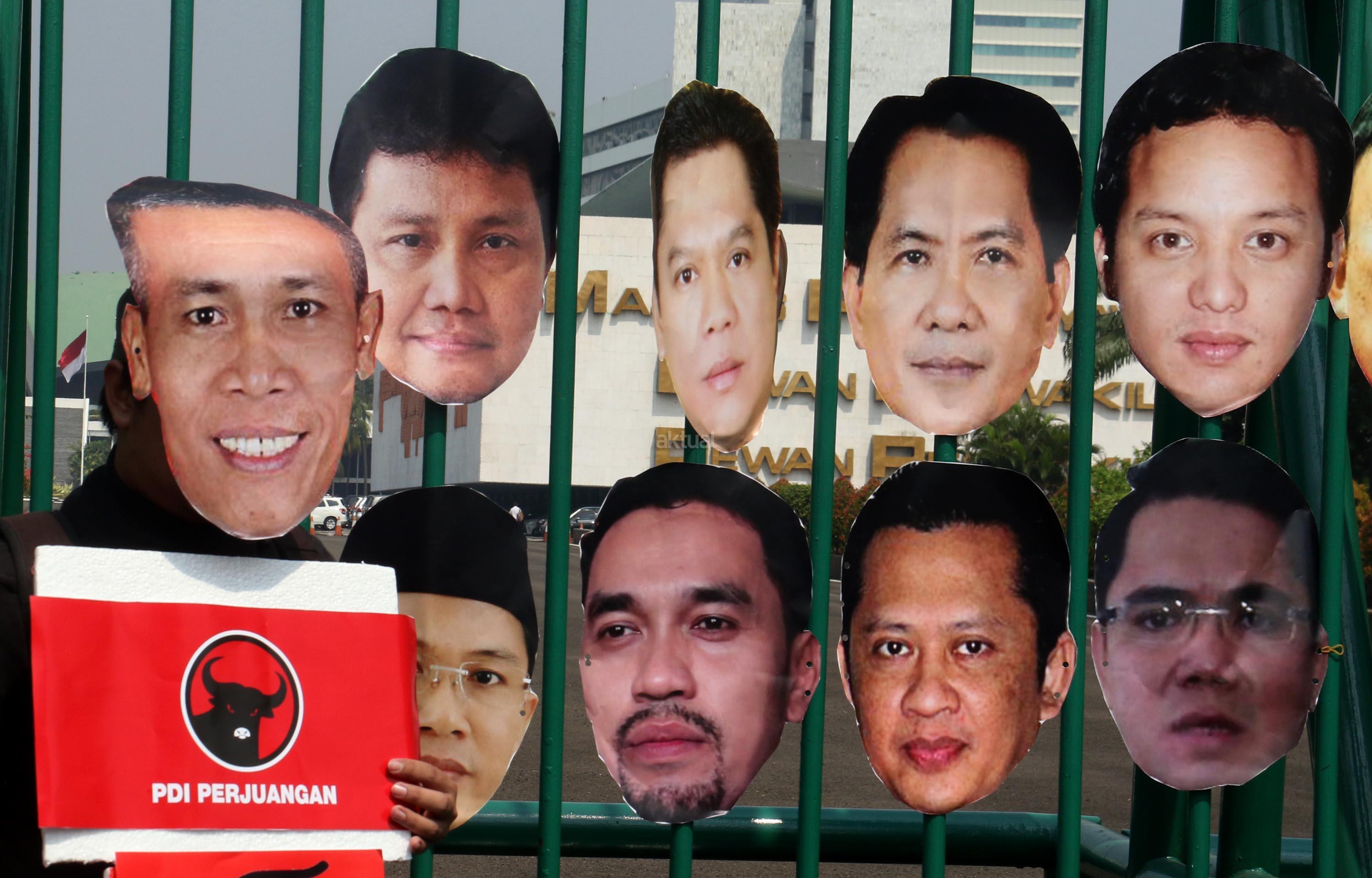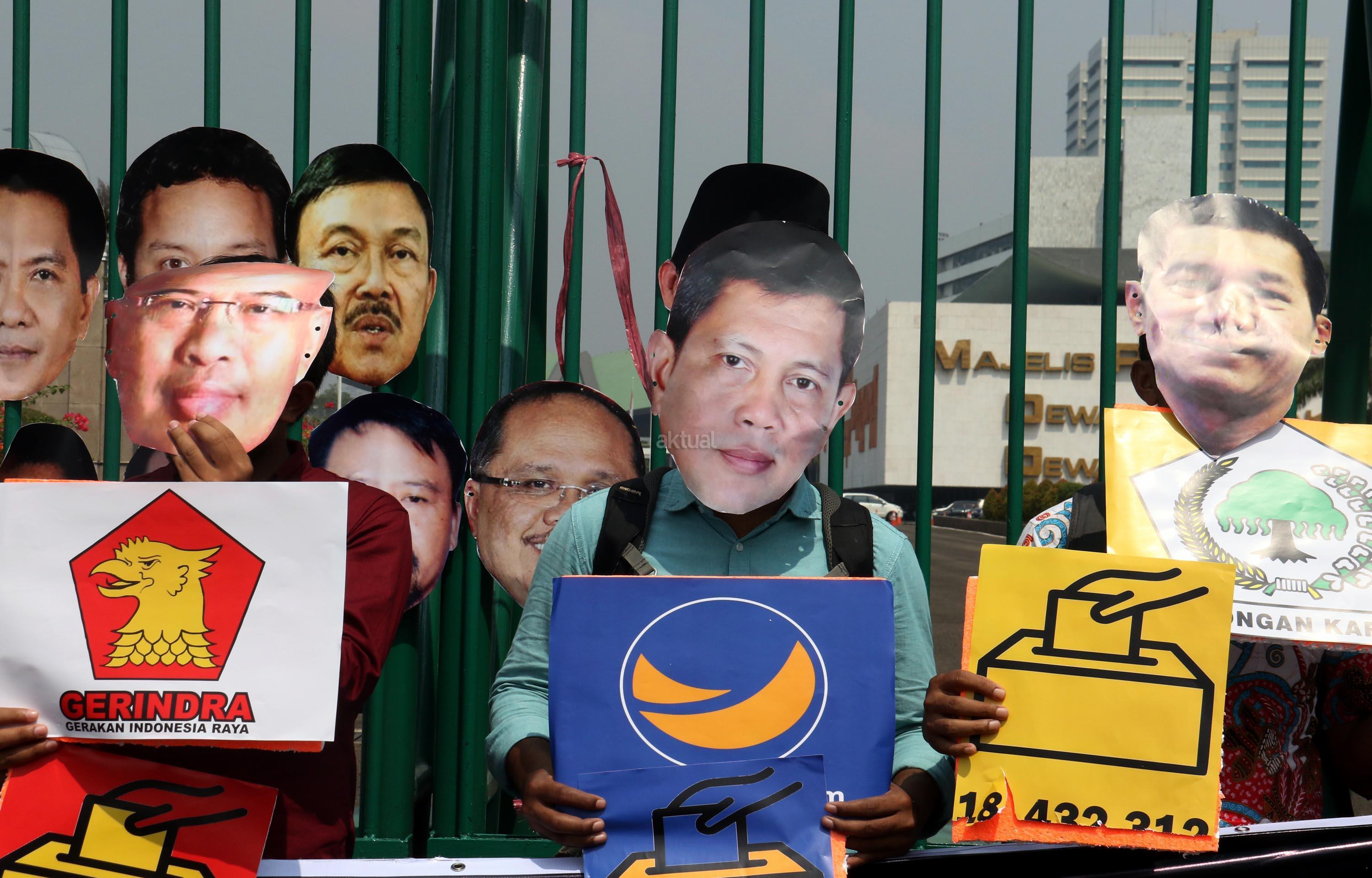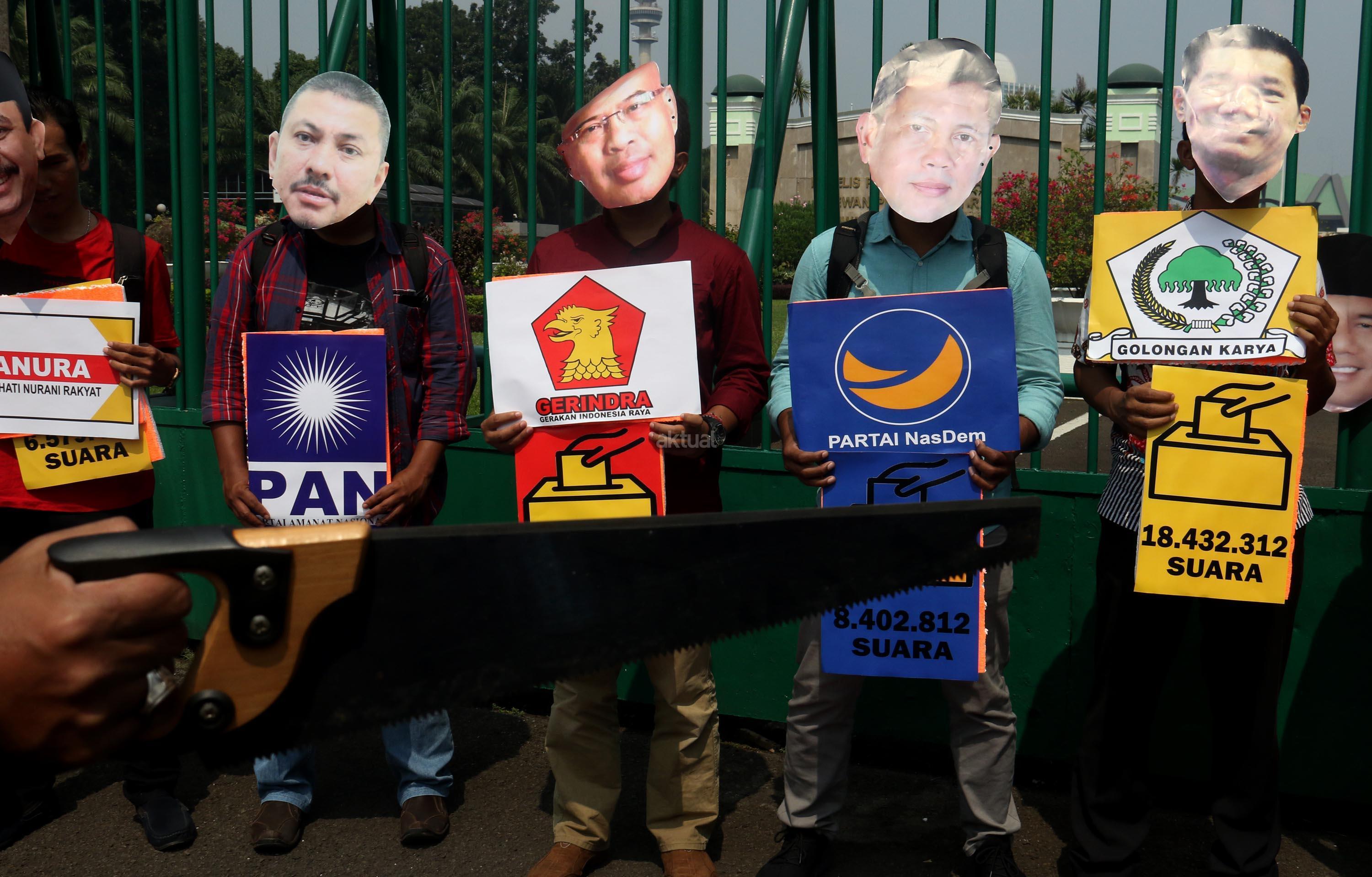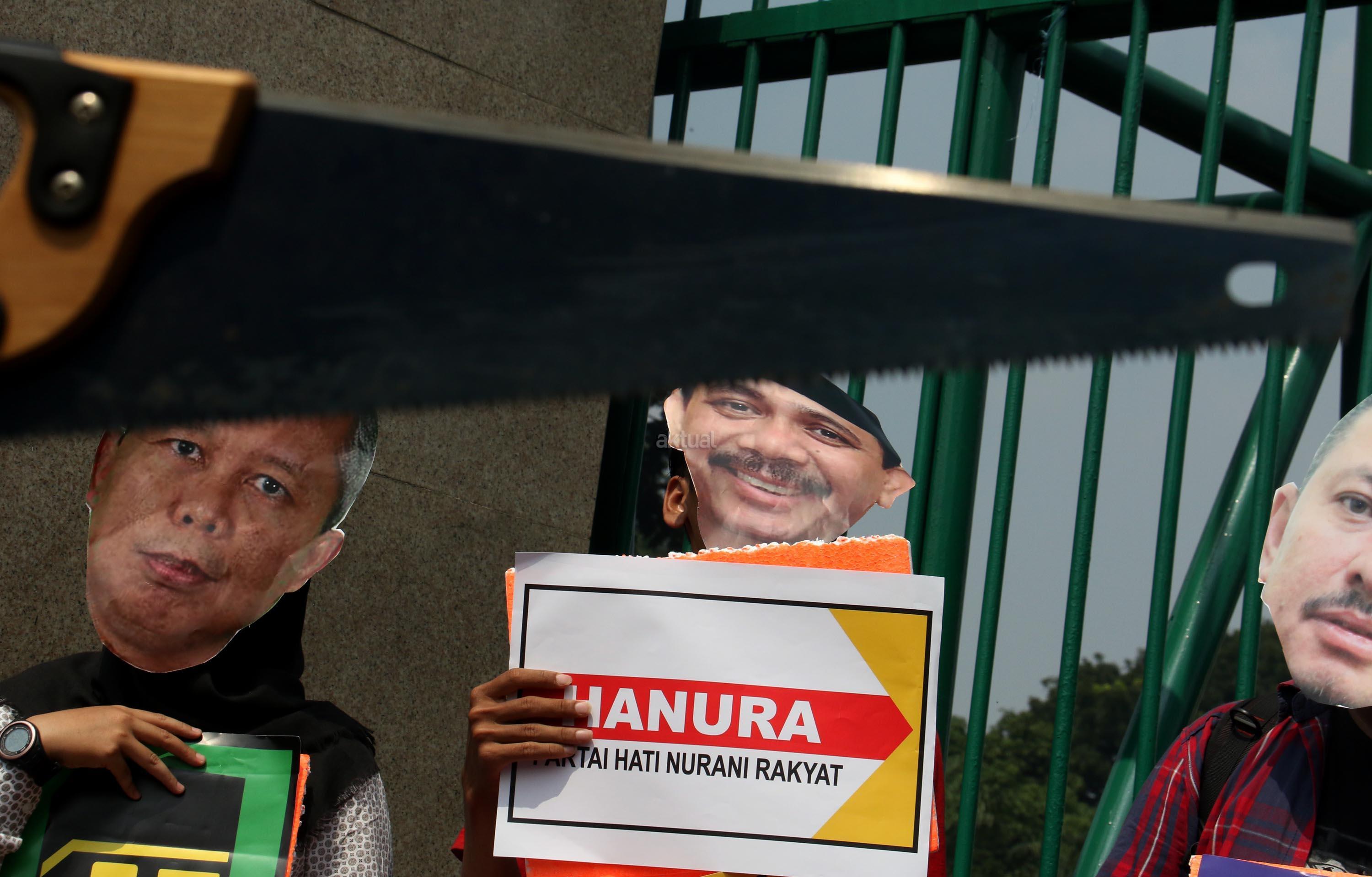 Sejumlah aktivis anti korupsi yang tergabung dalam Jaringan Anti Korupsi 15 Daerah melakukan aksi Gergaji Suara Rakyat dan Partai didepan gedung DPR RI, Jakarta, Rabu (19/7/2017). Dalam aksi Gergaji Suara Rakyat dan Partai serta mengajak masyarakat untuk jangan pilih lagi anggota DPR yang menjadi anggota Pansus Hak Angket KPK. AKTUAL/Munzir