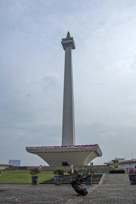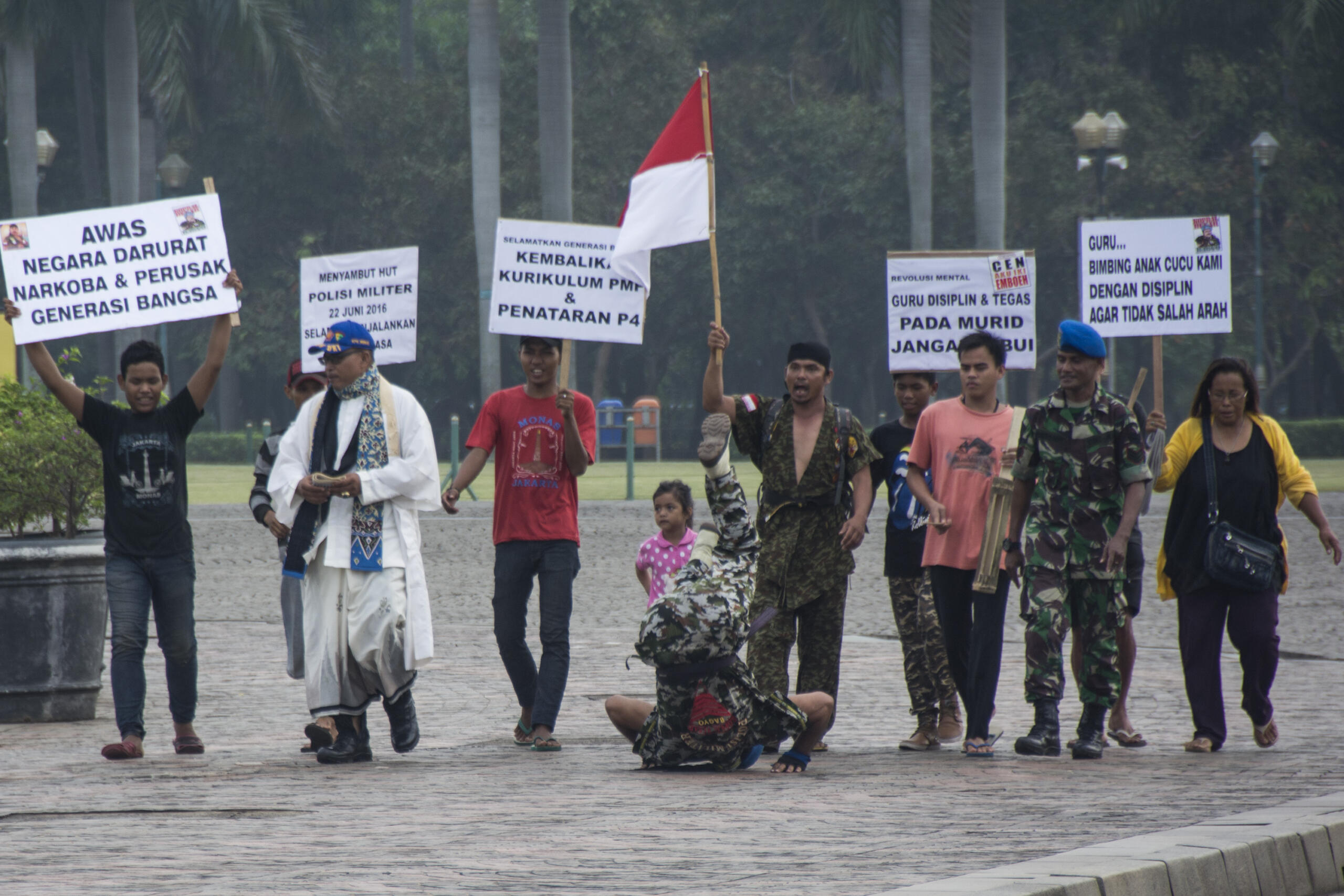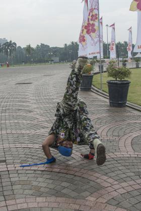 Anggota Polisi Militer Angkatan Darat IV/Surakarta, Kopral Partika Subagyo Lelono melakukan aksi jungkir balik mengelilingi Tugu Monas, Jakarta, Jumat (17/6). Aksi tersebut dilakukan dalam rangka peringatan hari ulang tahun Polisi Militer Angkatan Darat ke-70. ANTARA FOTO/Aprillio Akbar/foc/16.