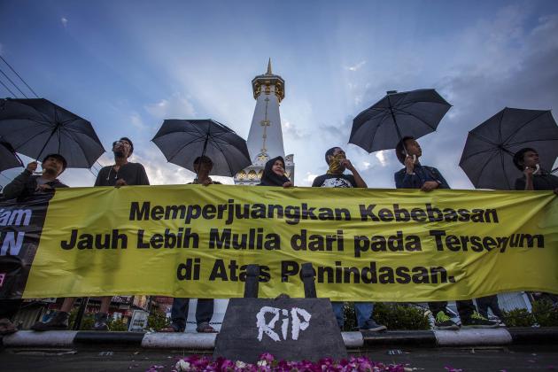 Aktivis yang tergabung dalam Social Movement Institute (SMI) dan Kontras melakukan teatrikal saat aksi diam kamisan di Tugu Pal Putih, DI Yogyakarta, Kamis (19/5). Dalam aksi itu mereka meminta pihak kepolisian untuk tidak takut pada kegiatan kritis yang memiliki peran mendidik serta meminta aparat hukum menindak tegas kelompok yang berbuat kekerasan. ANTARA FOTO/Andreas Fitri Atmoko/ama/16.
