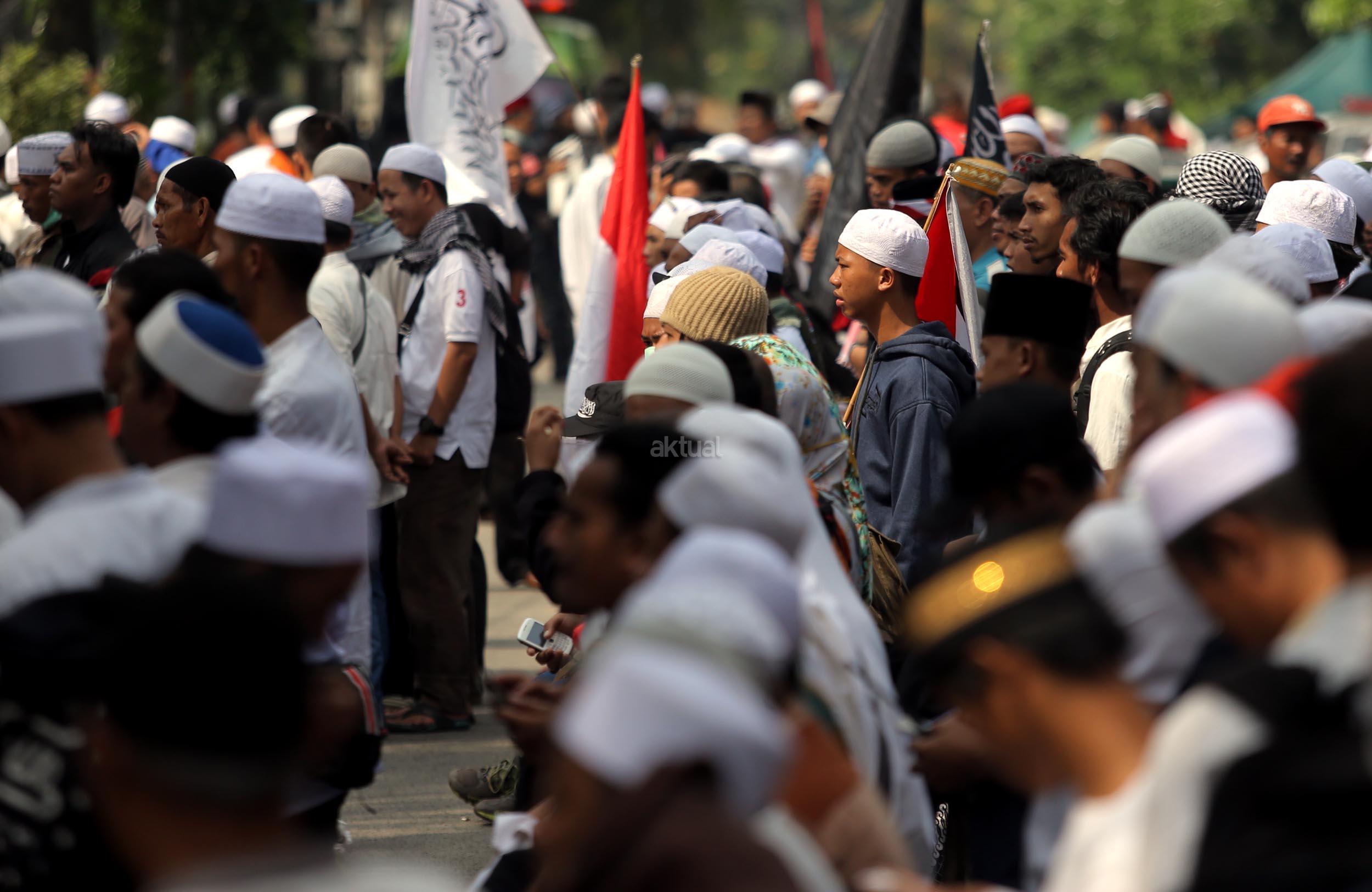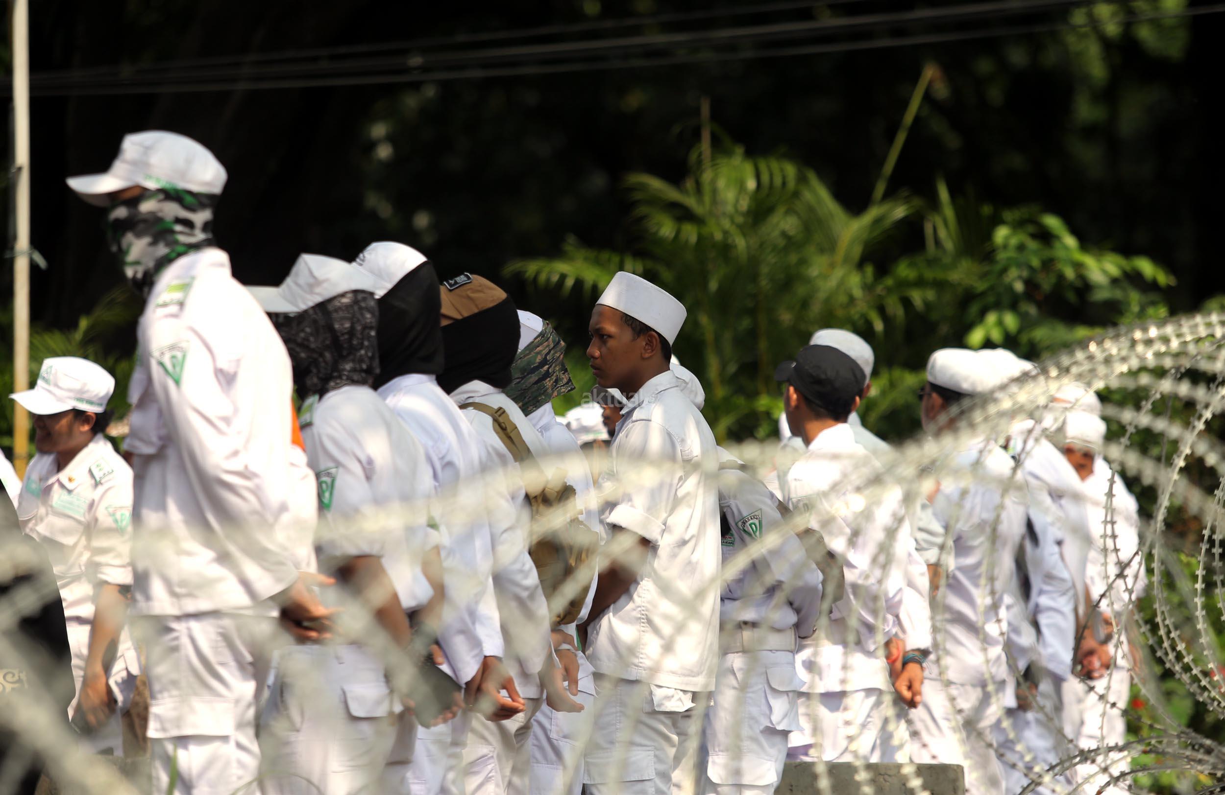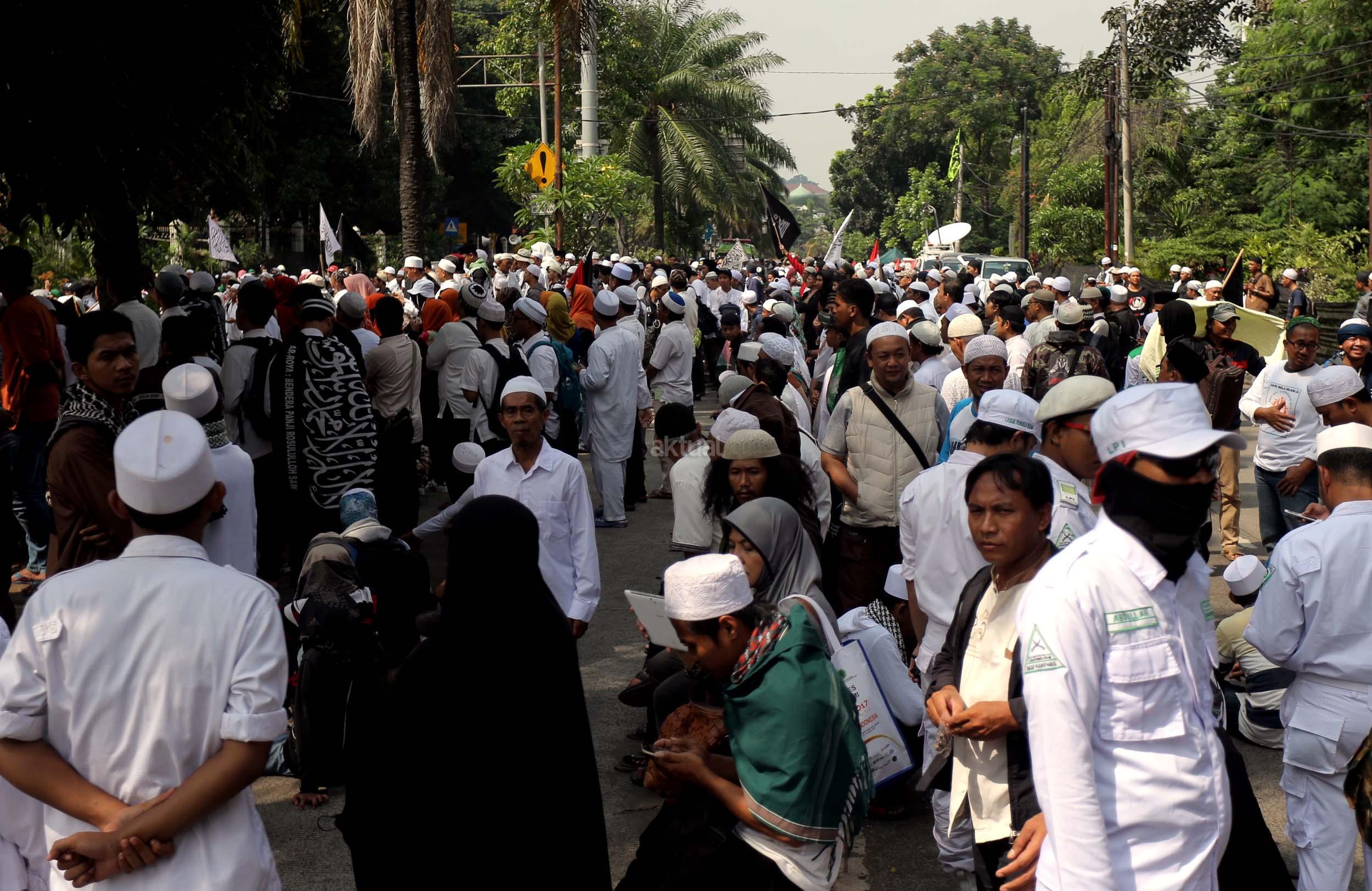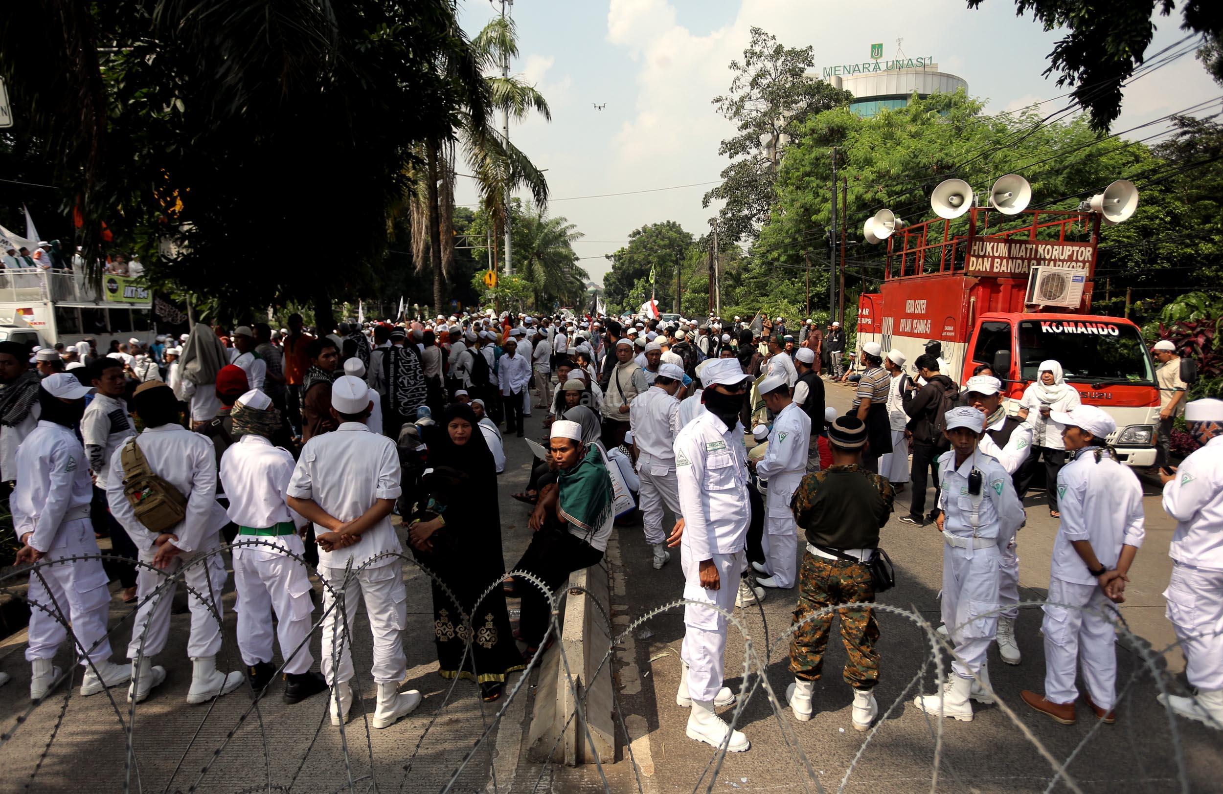 Ribuan umat Islam dari berbagai organisasi kembali melakukan aksi kawal sidang Gubernur Penista Agama di depan Kementan, Jakarta, Selasa (25/4/2017). Aksi kawal sidang Gubernur Penista Agama ini terkait pembacaan pledoi atau pembelaan Basuki Tjahja Purnama (Ahok). AKTUAL/Munzir