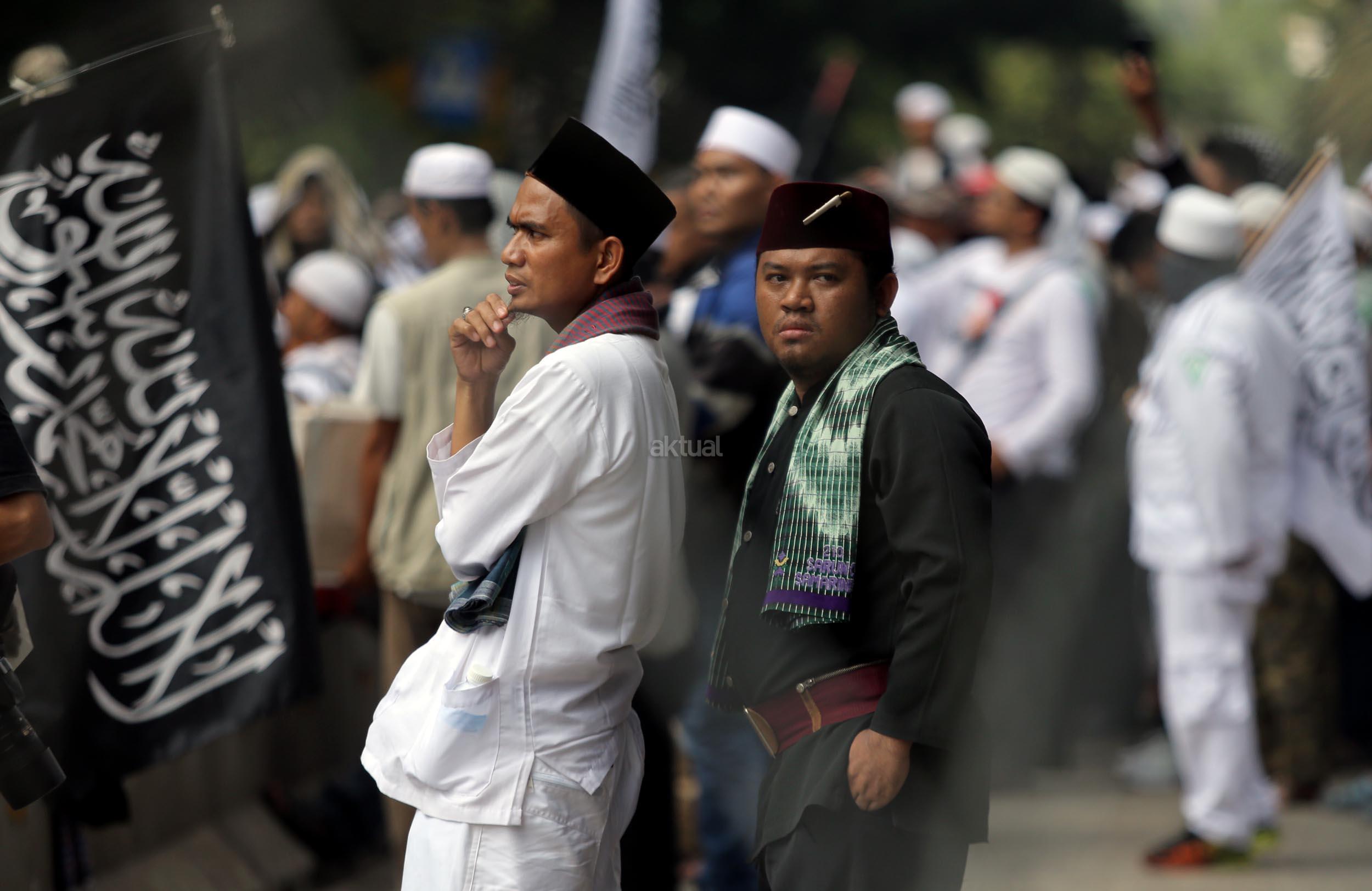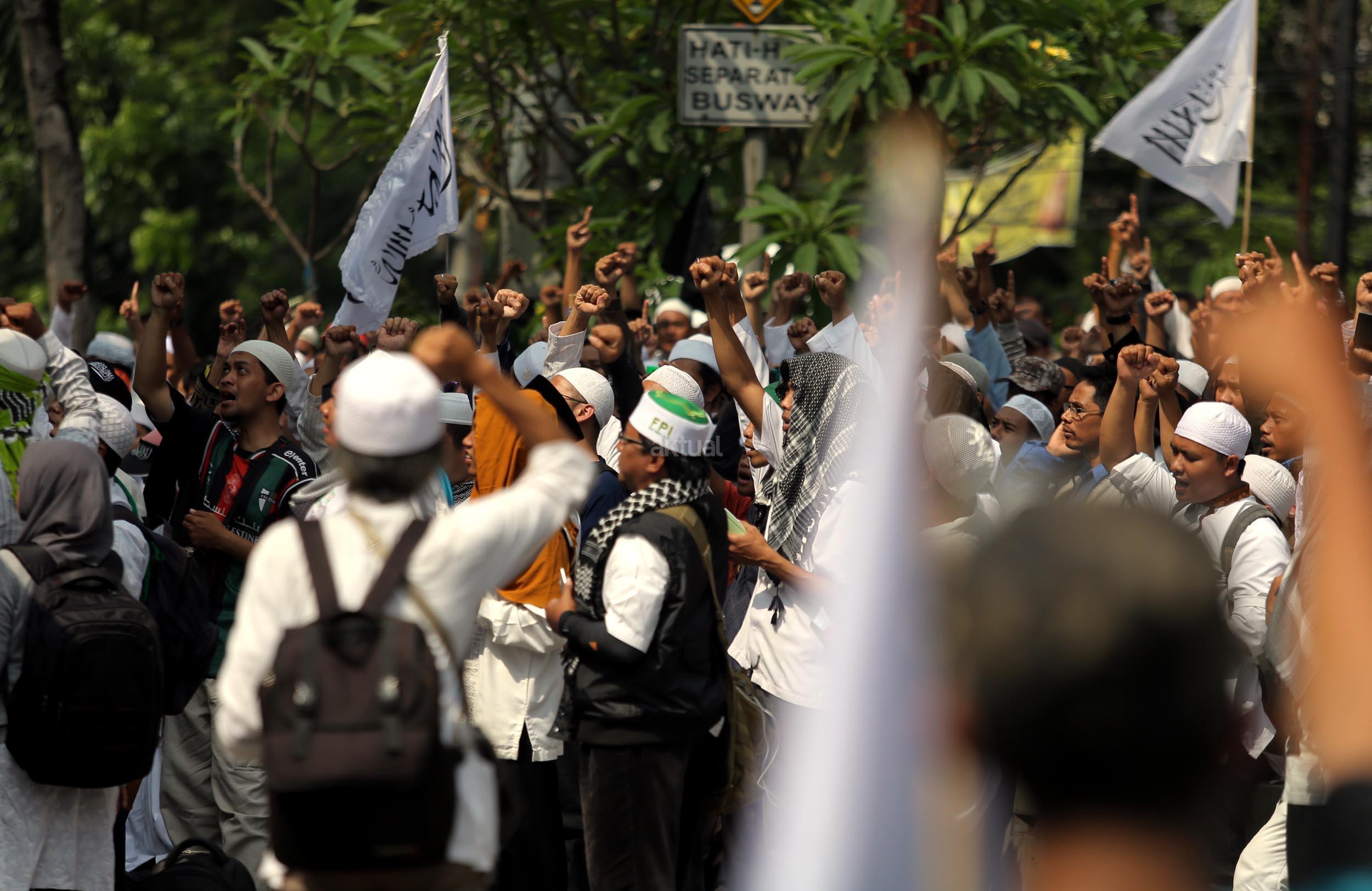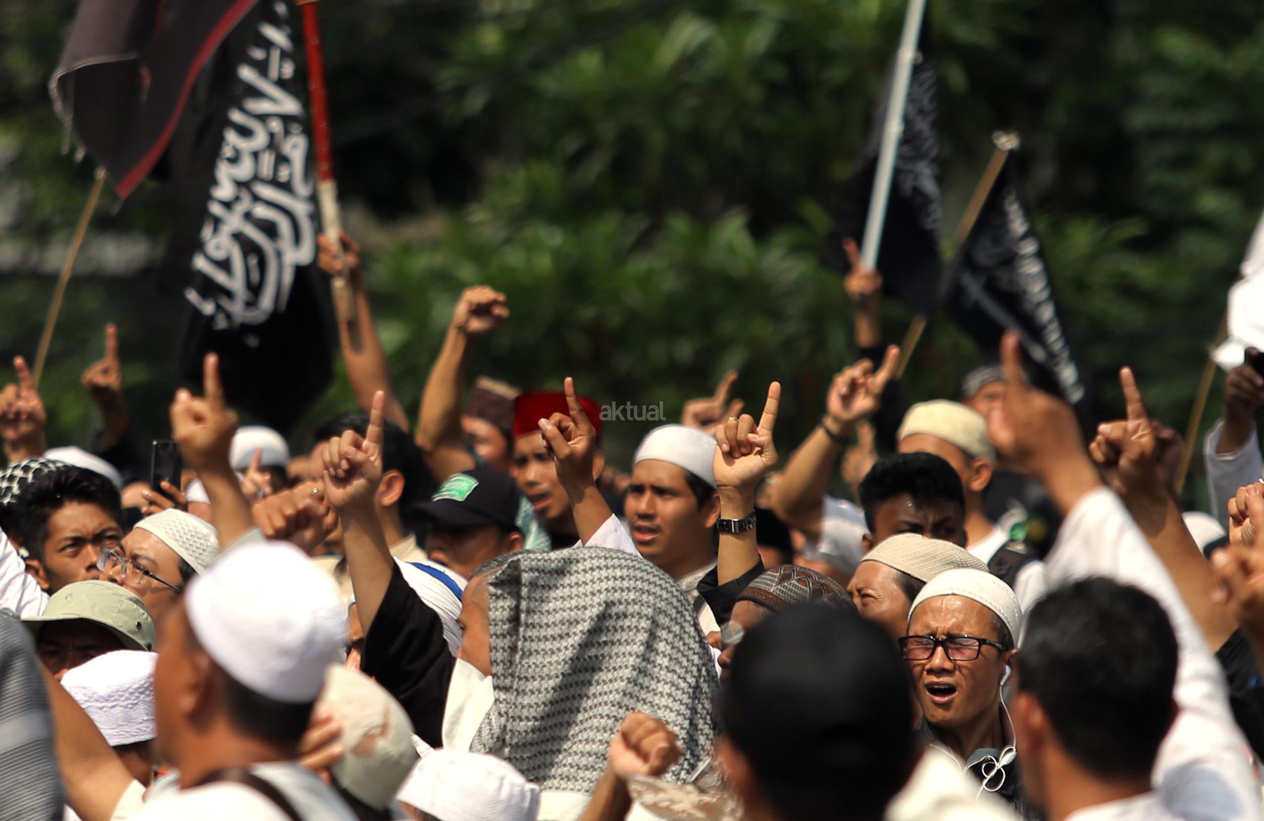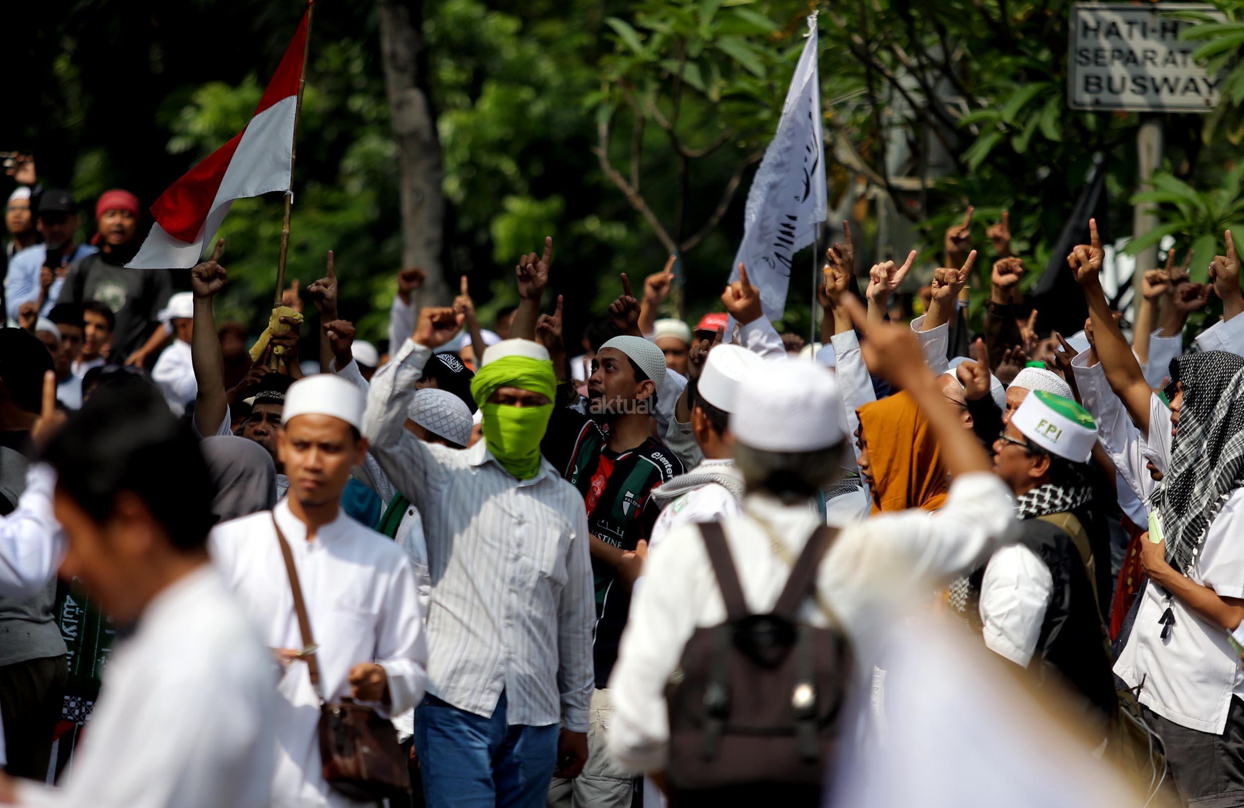 Ribuan umat Islam dari berbagai organisasi kembali melakukan aksi kawal sidang Gubernur Penista Agama di depan Kementan, Jakarta, Selasa (25/4/2017). Aksi kawal sidang Gubernur Penista Agama ini terkait pembacaan pledoi atau pembelaan Basuki Tjahja Purnama (Ahok). AKTUAL/Munzir