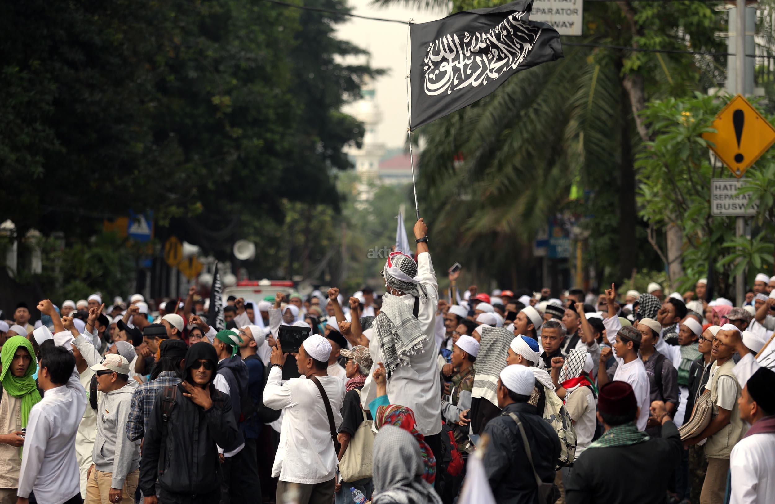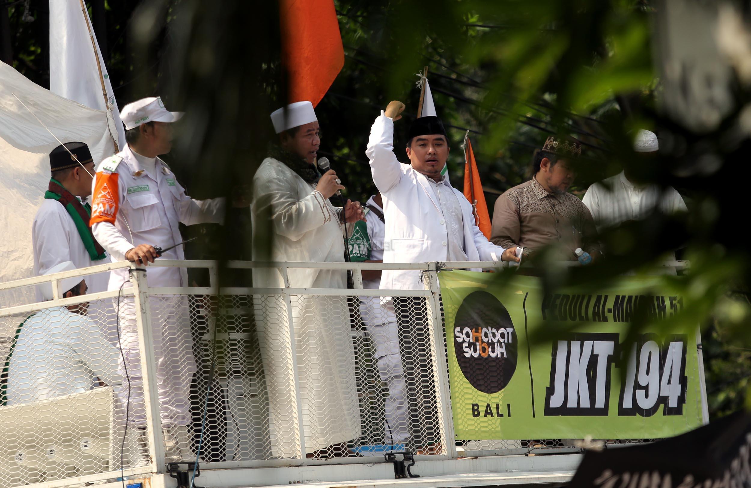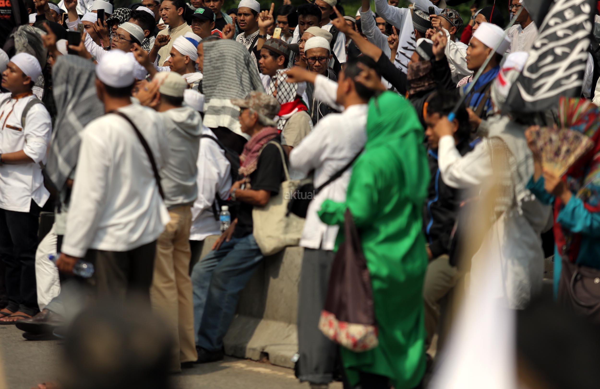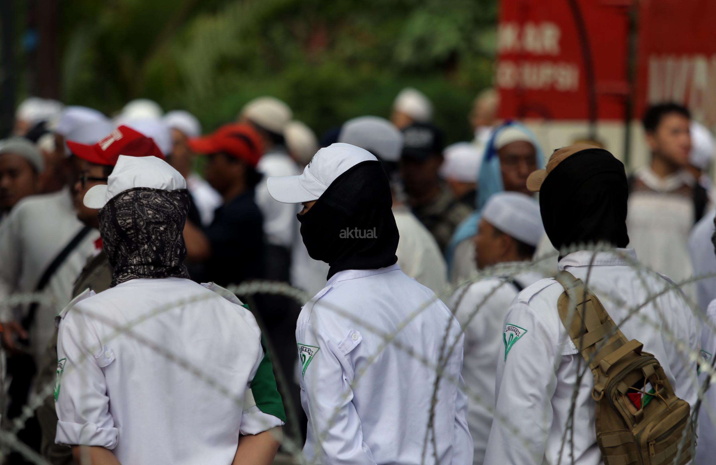 Ribuan umat Islam dari berbagai organisasi kembali melakukan aksi kawal sidang Gubernur Penista Agama di depan Kementan, Jakarta, Selasa (25/4/2017). Aksi kawal sidang Gubernur Penista Agama ini terkait pembacaan pledoi atau pembelaan Basuki Tjahja Purnama (Ahok). AKTUAL/Munzir