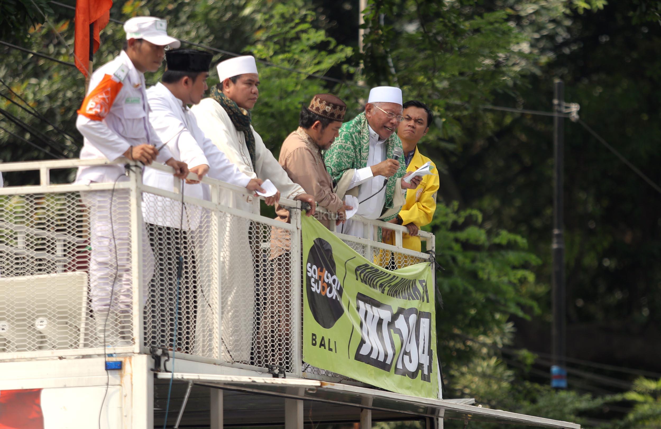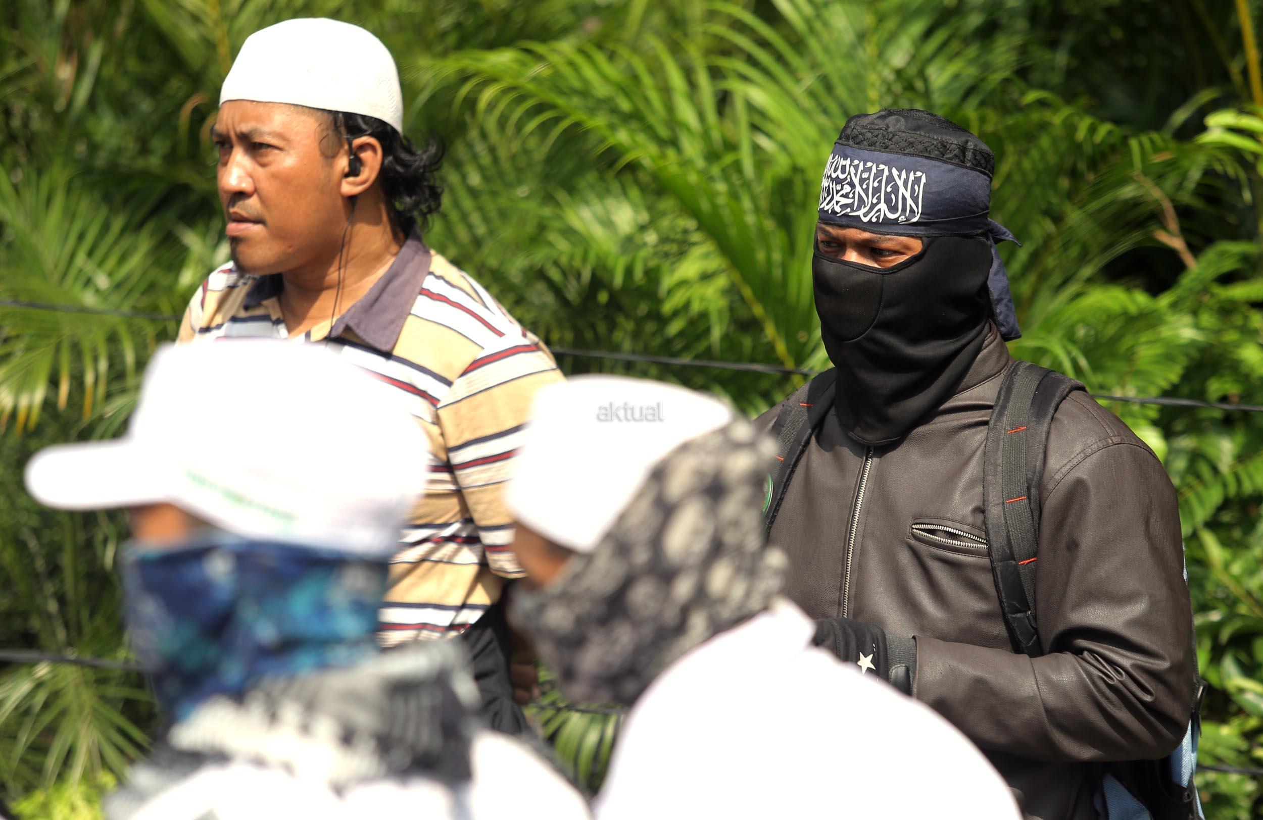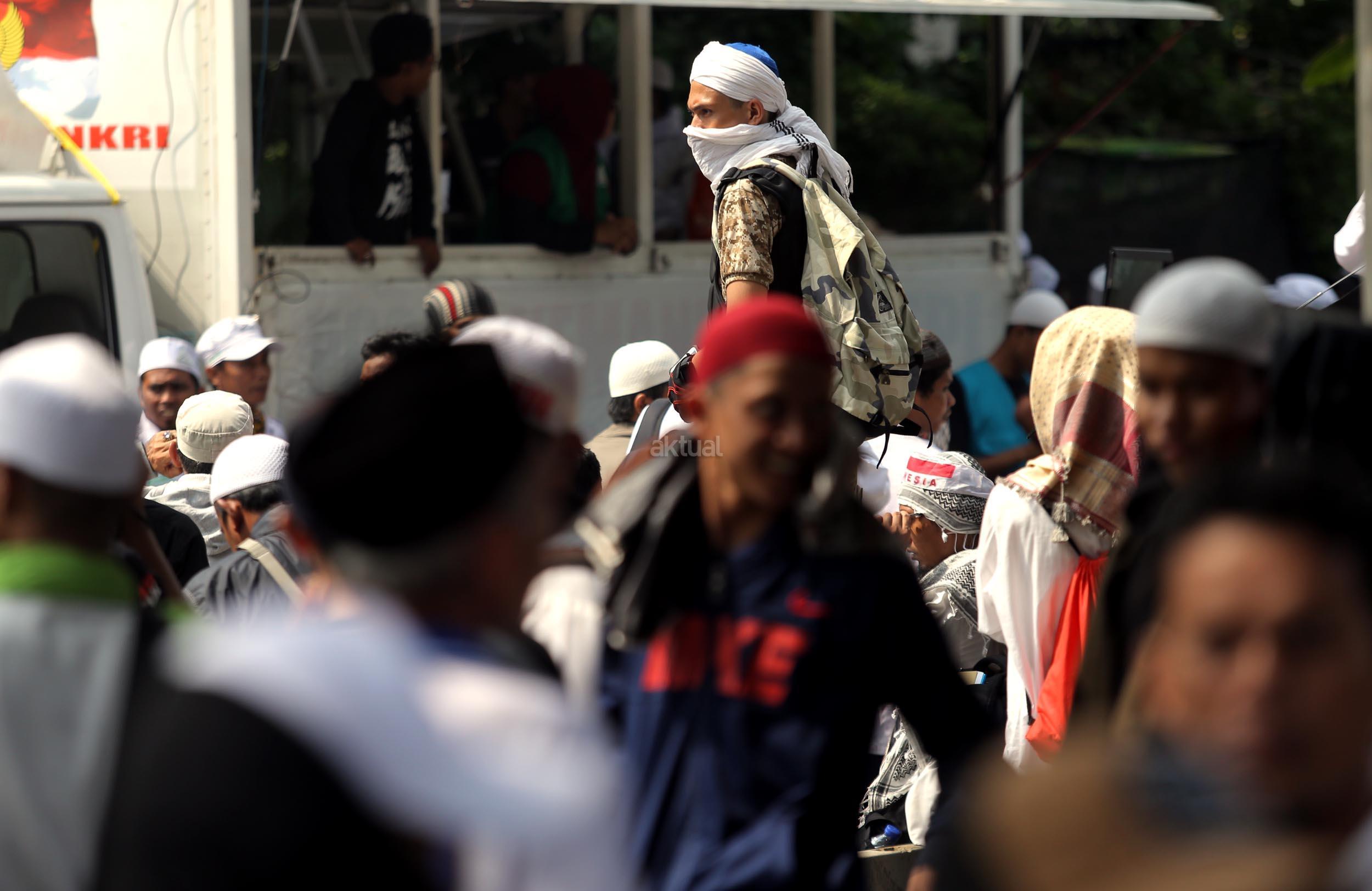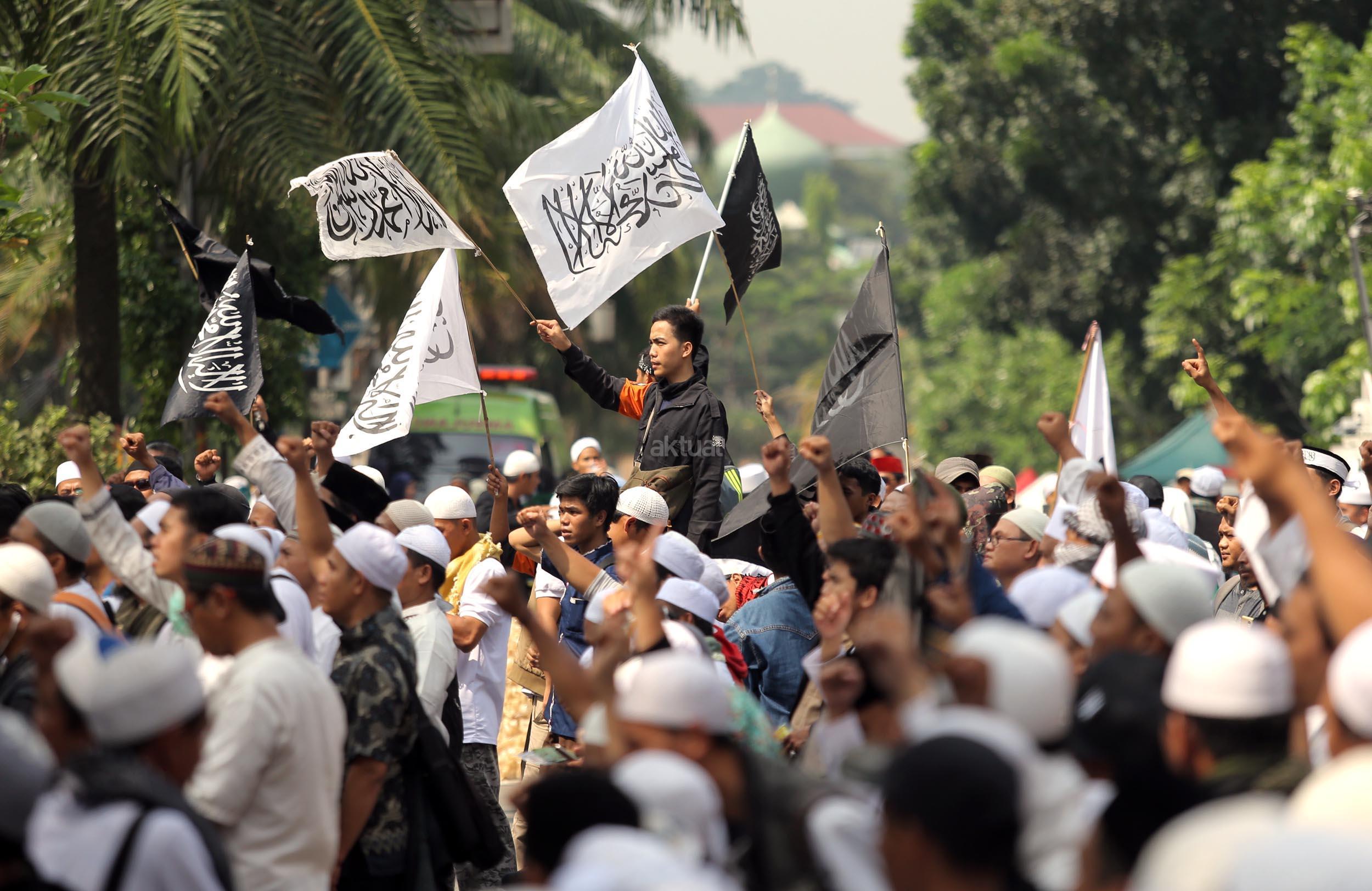 Ribuan umat Islam dari berbagai organisasi kembali melakukan aksi kawal sidang Gubernur Penista Agama di depan Kementan, Jakarta, Selasa (25/4/2017). Aksi kawal sidang Gubernur Penista Agama ini terkait pembacaan pledoi atau pembelaan Basuki Tjahja Purnama (Ahok). AKTUAL/Munzir